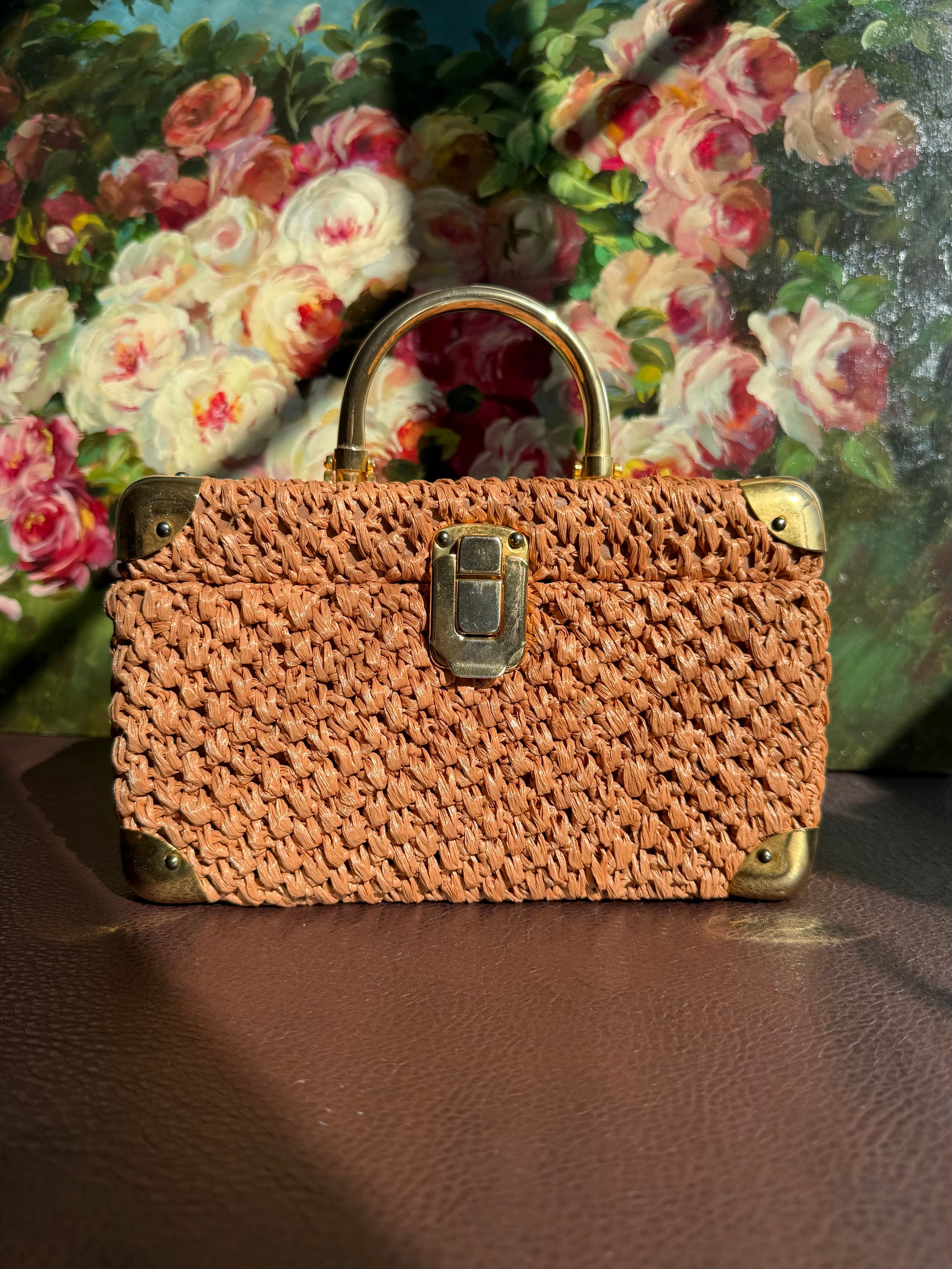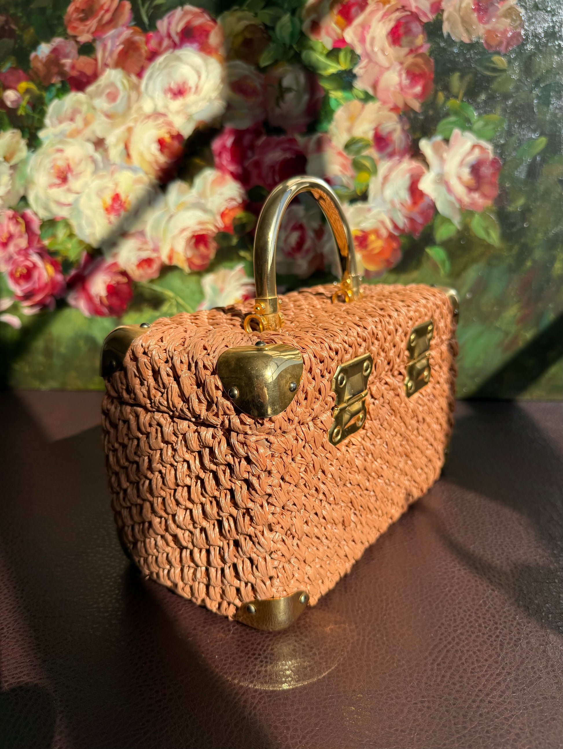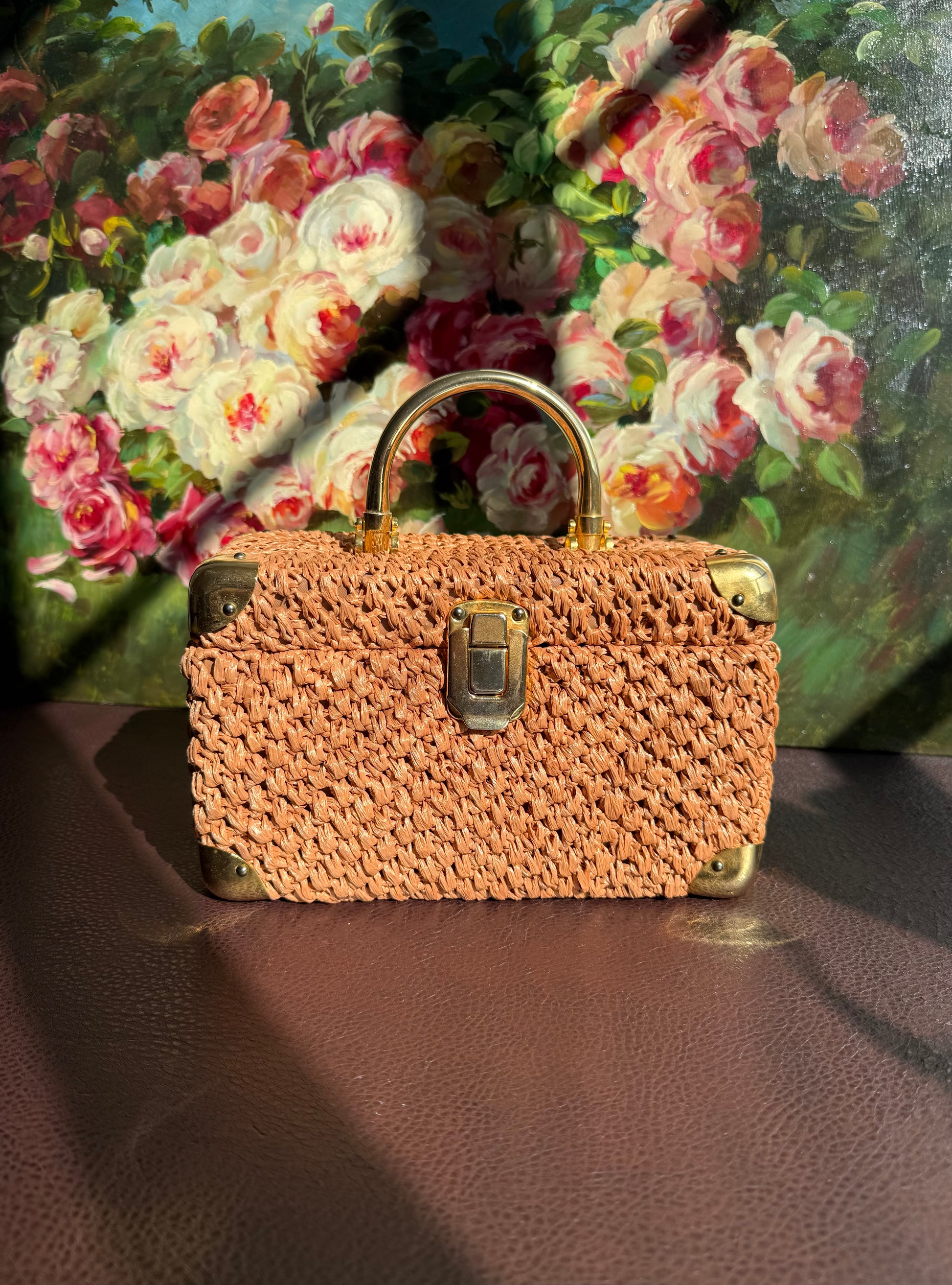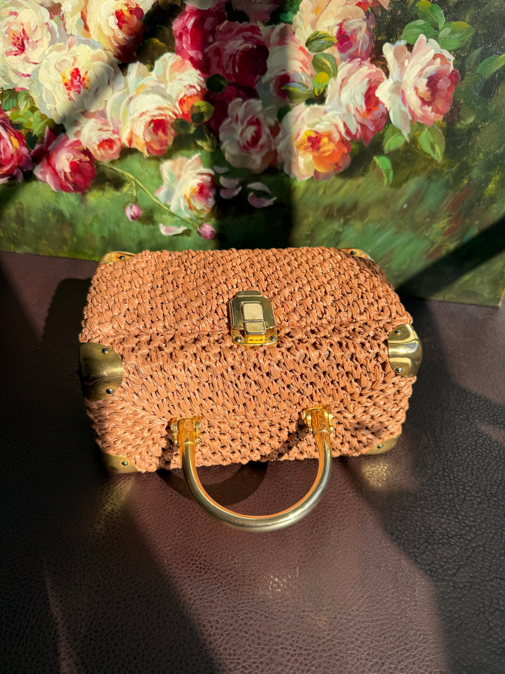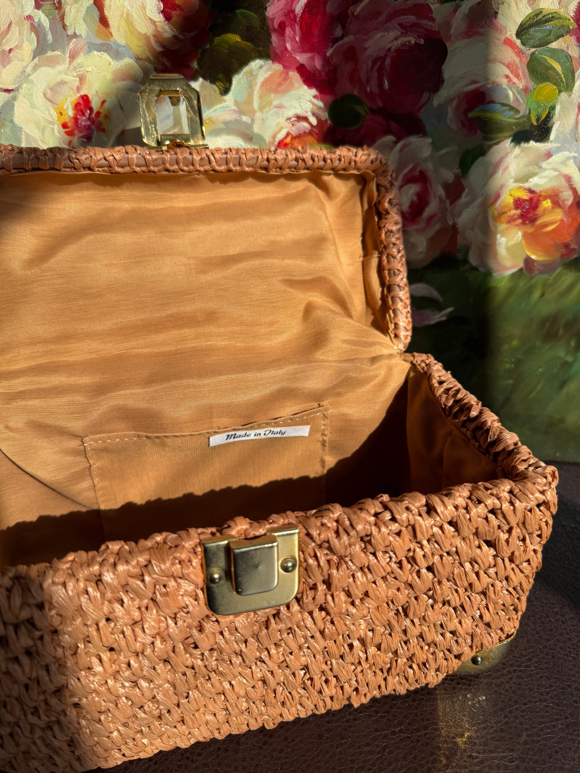 Italian Luxury Vintage Box Purse Mod Woven Raffia Brown Handbag, from the 50s or 60s