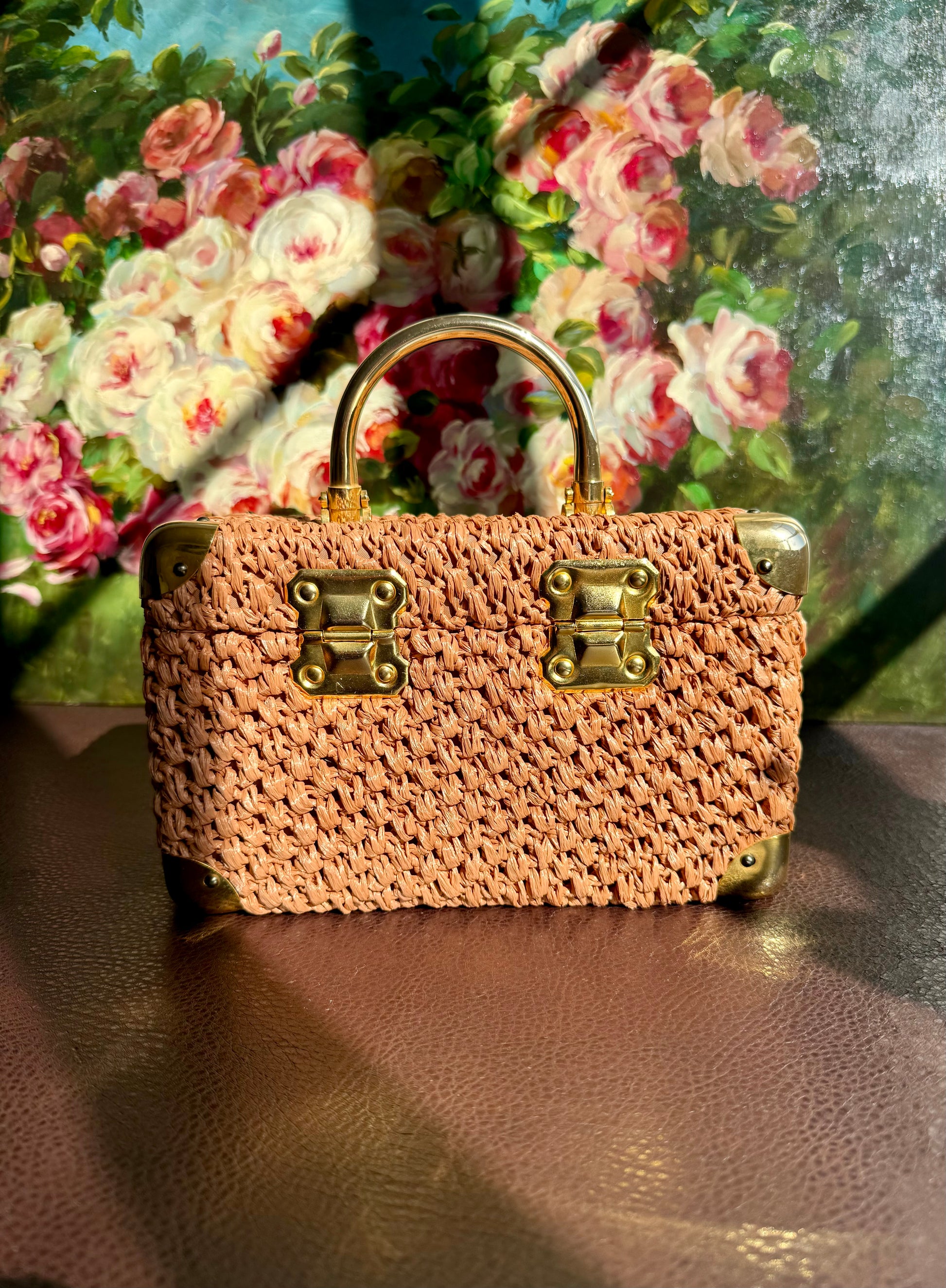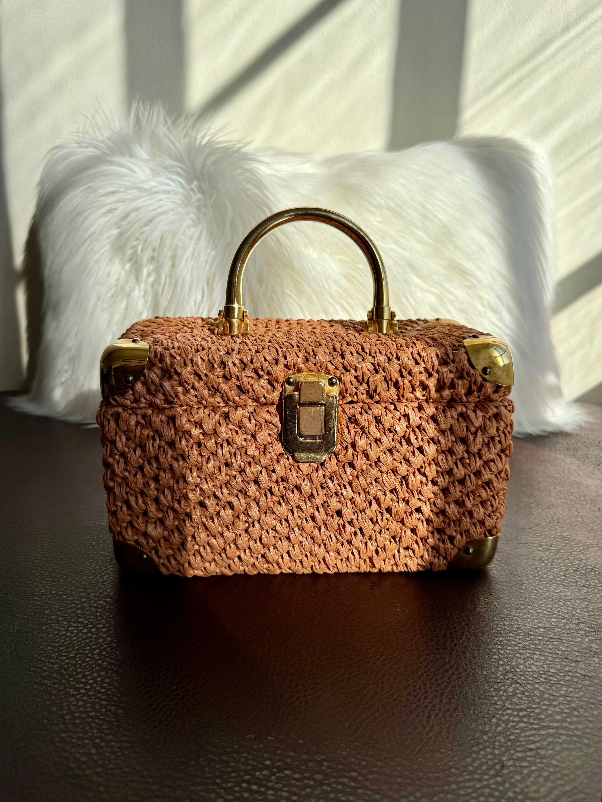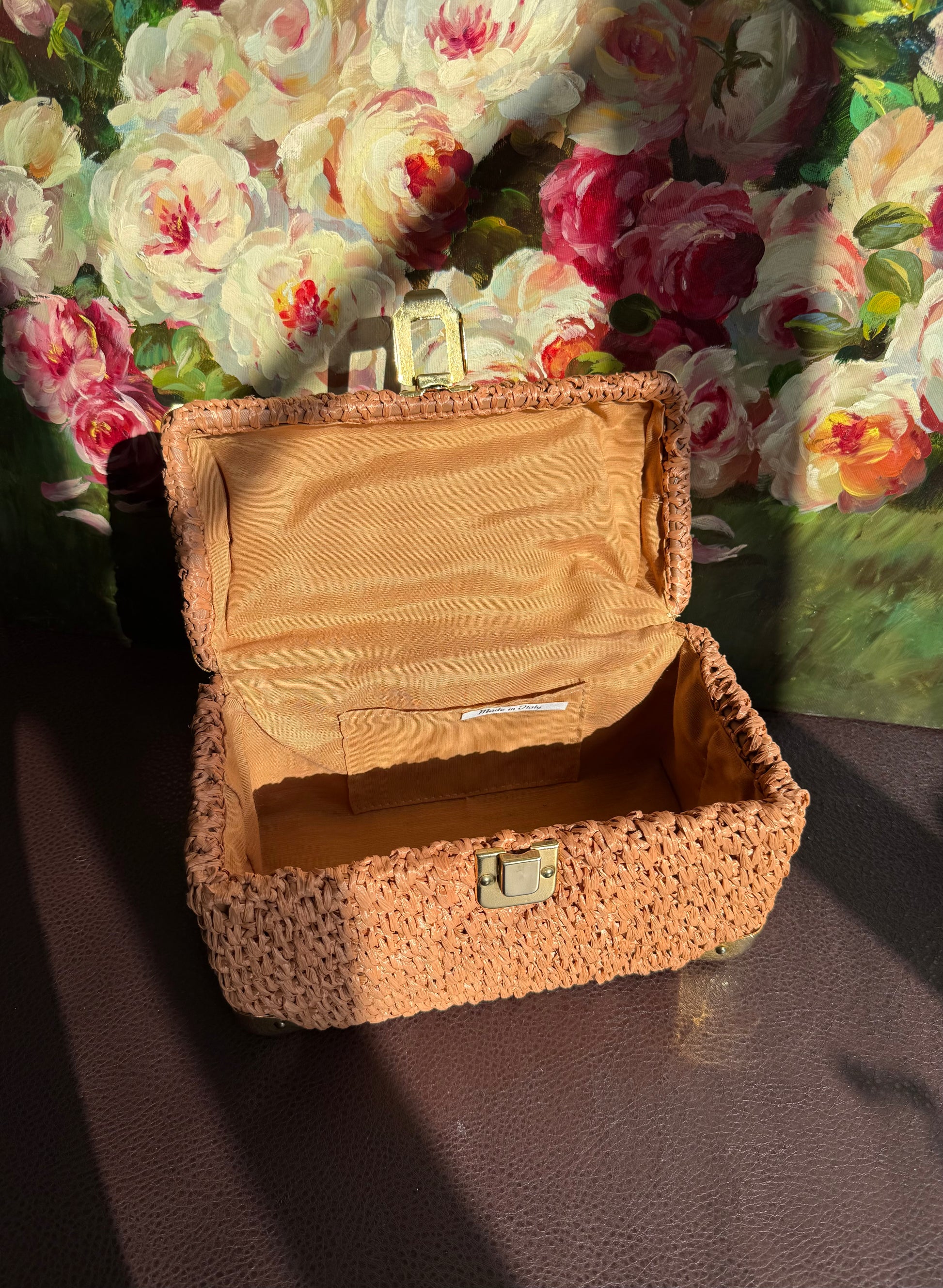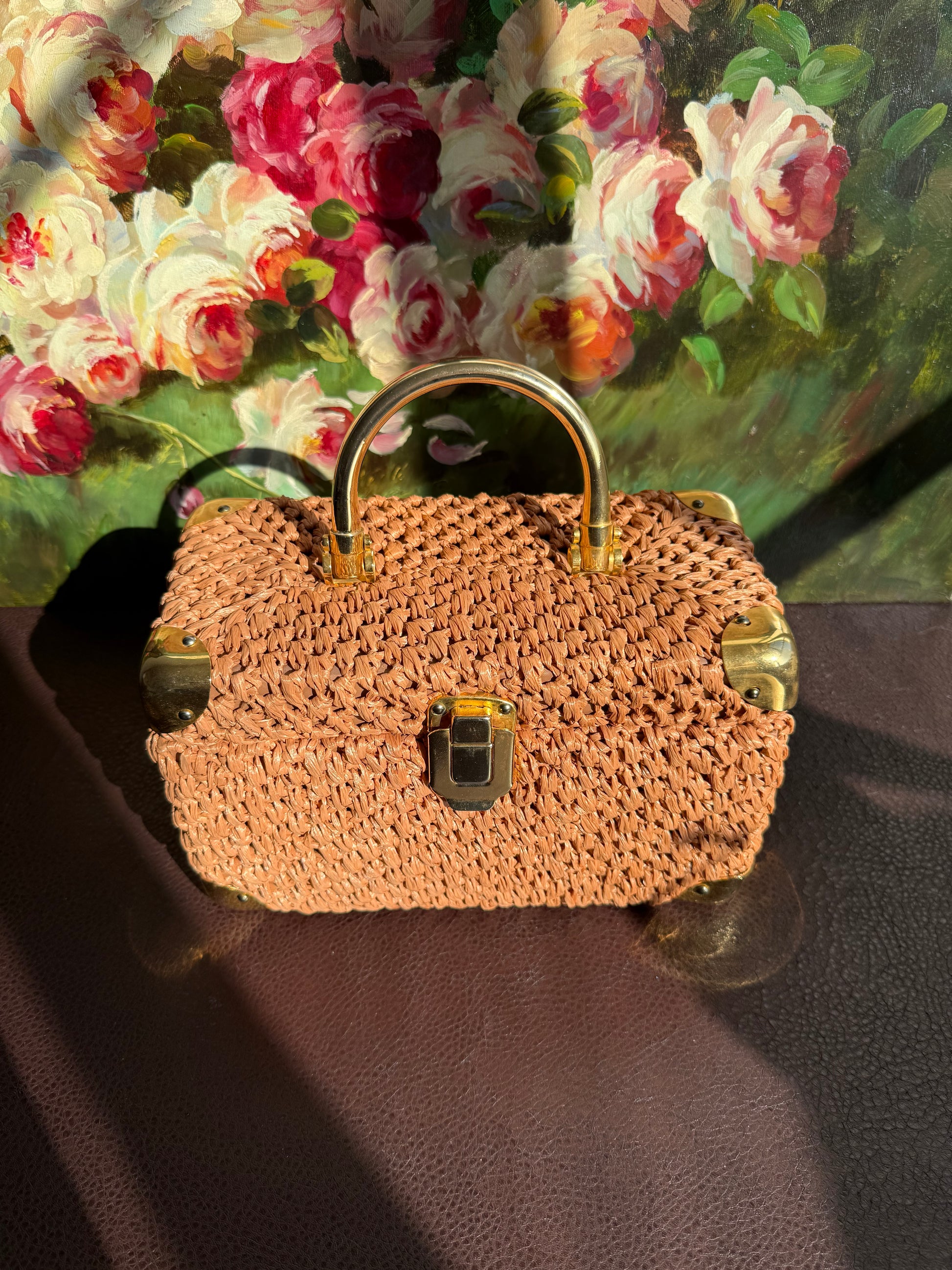 Italian Luxury Vintage Box Purse Mod Woven Raffia Brown Handbag, from the 50s or 60s