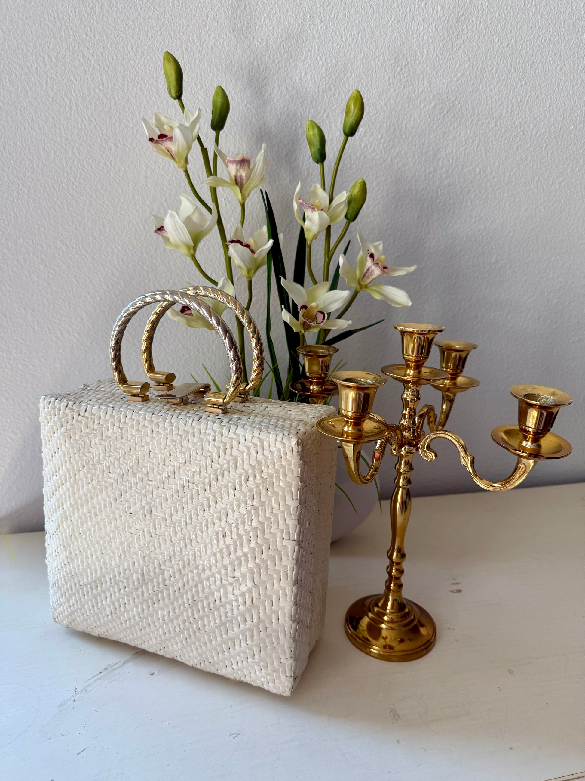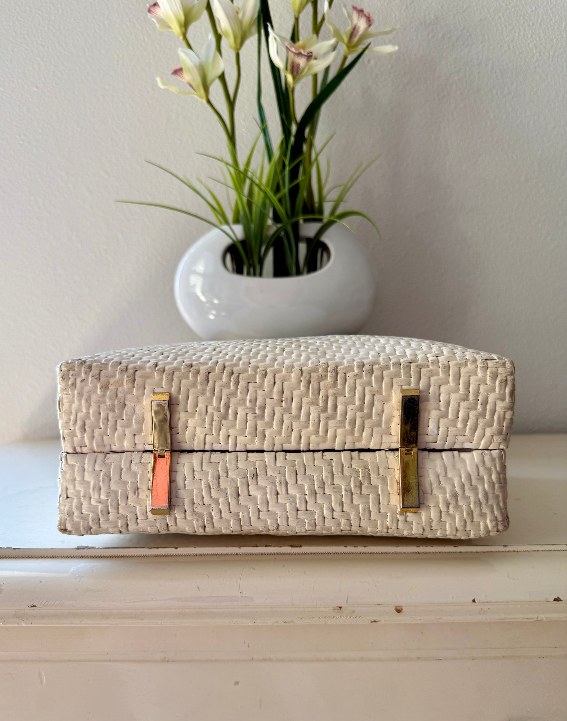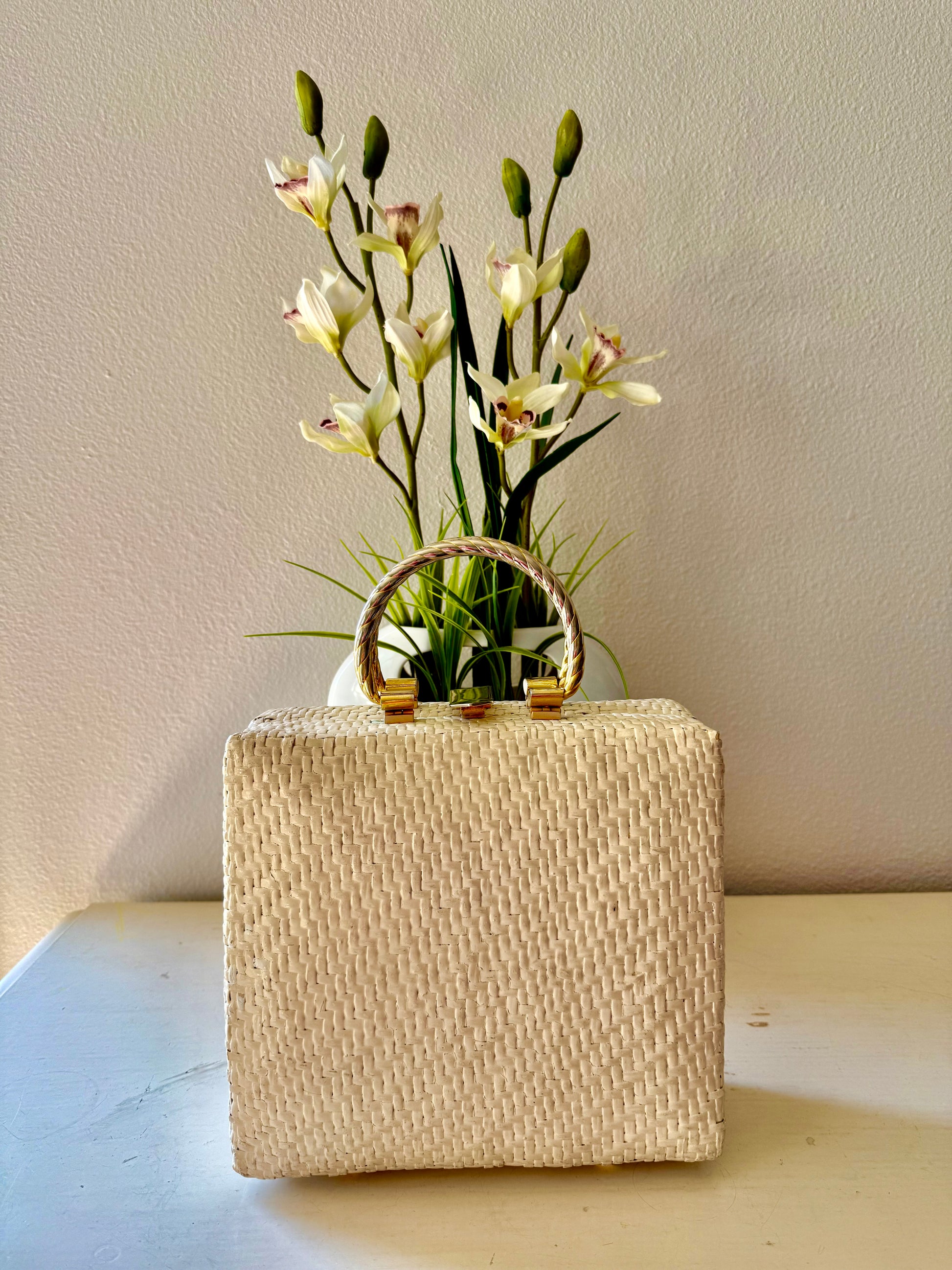 Beautiful vintage KORET white wicker Italian stylish purse/ handbag from the ‘50s or ‘60s. The white wicker is not plastic coated, it has a white original paint. This purse is made in Italy, stamped logo with gold foil. The interior is made of beautiful leather and has a signature oval slip style pocket. The gold-colored metal handles show slight wear due to the age of the bag, which is not that noticeable. And there are some minor signs of wear on the outside of the bag. These are almost unnoticeable too. It is in excellent vintage condition, as can be seen in all the photos.