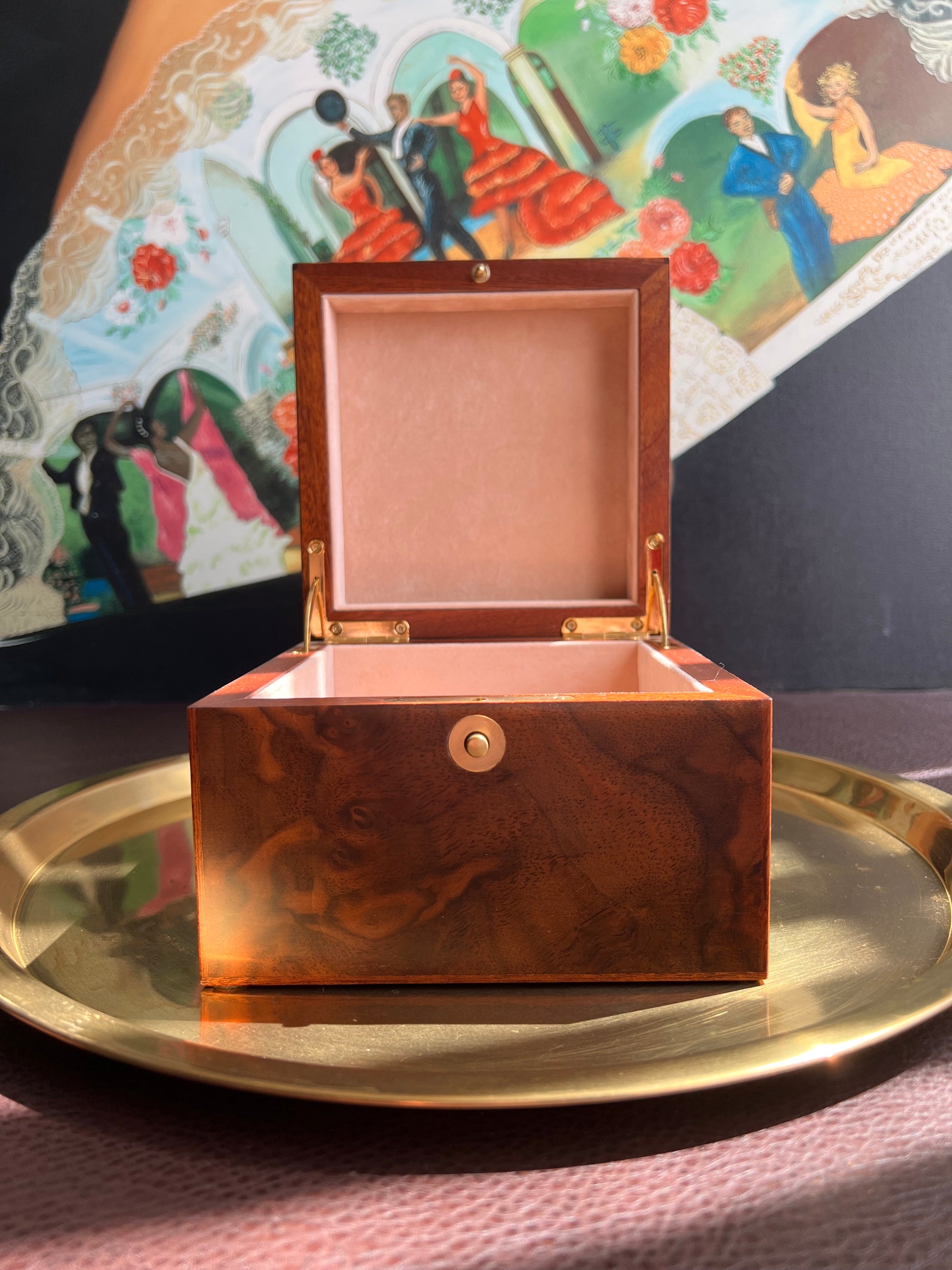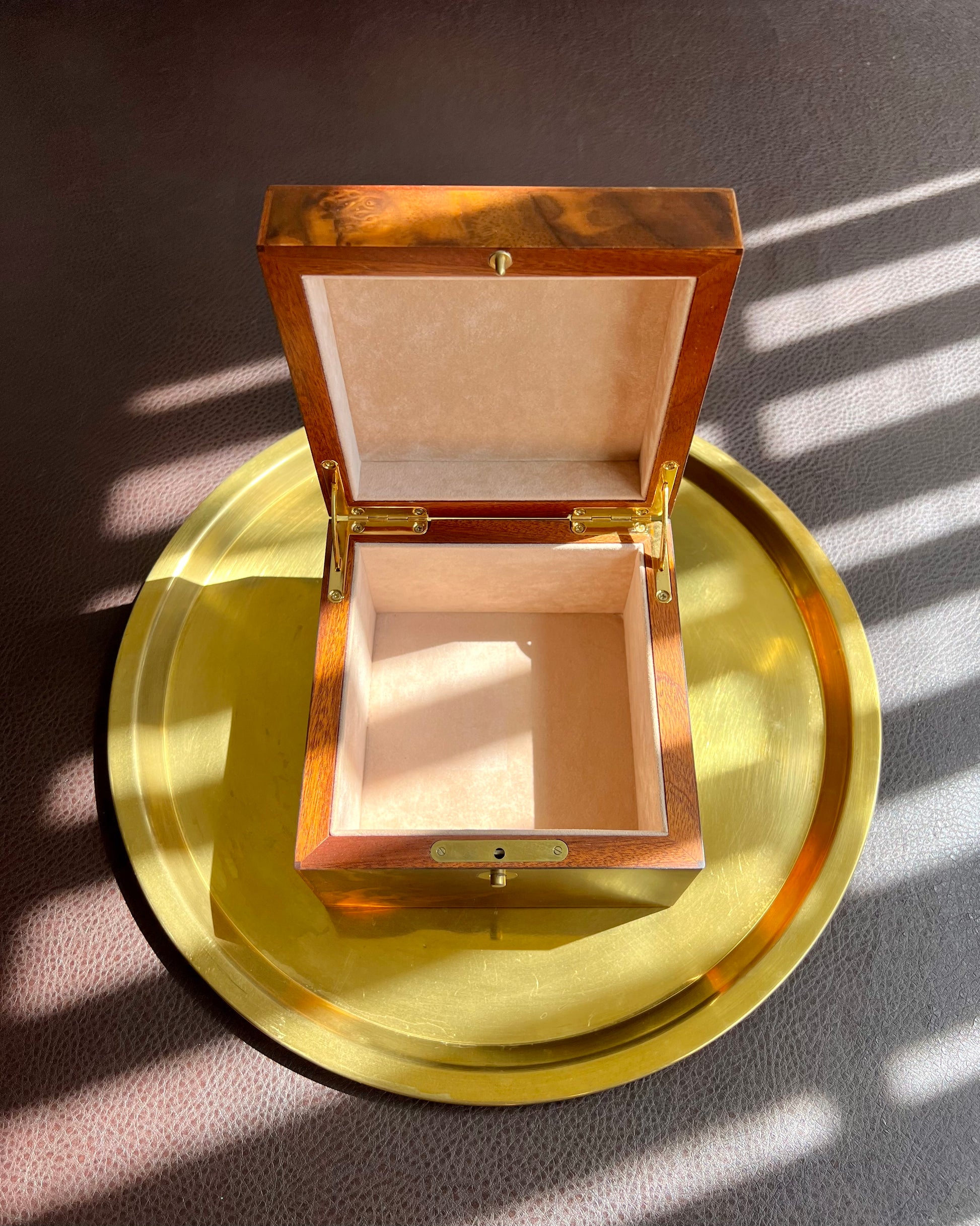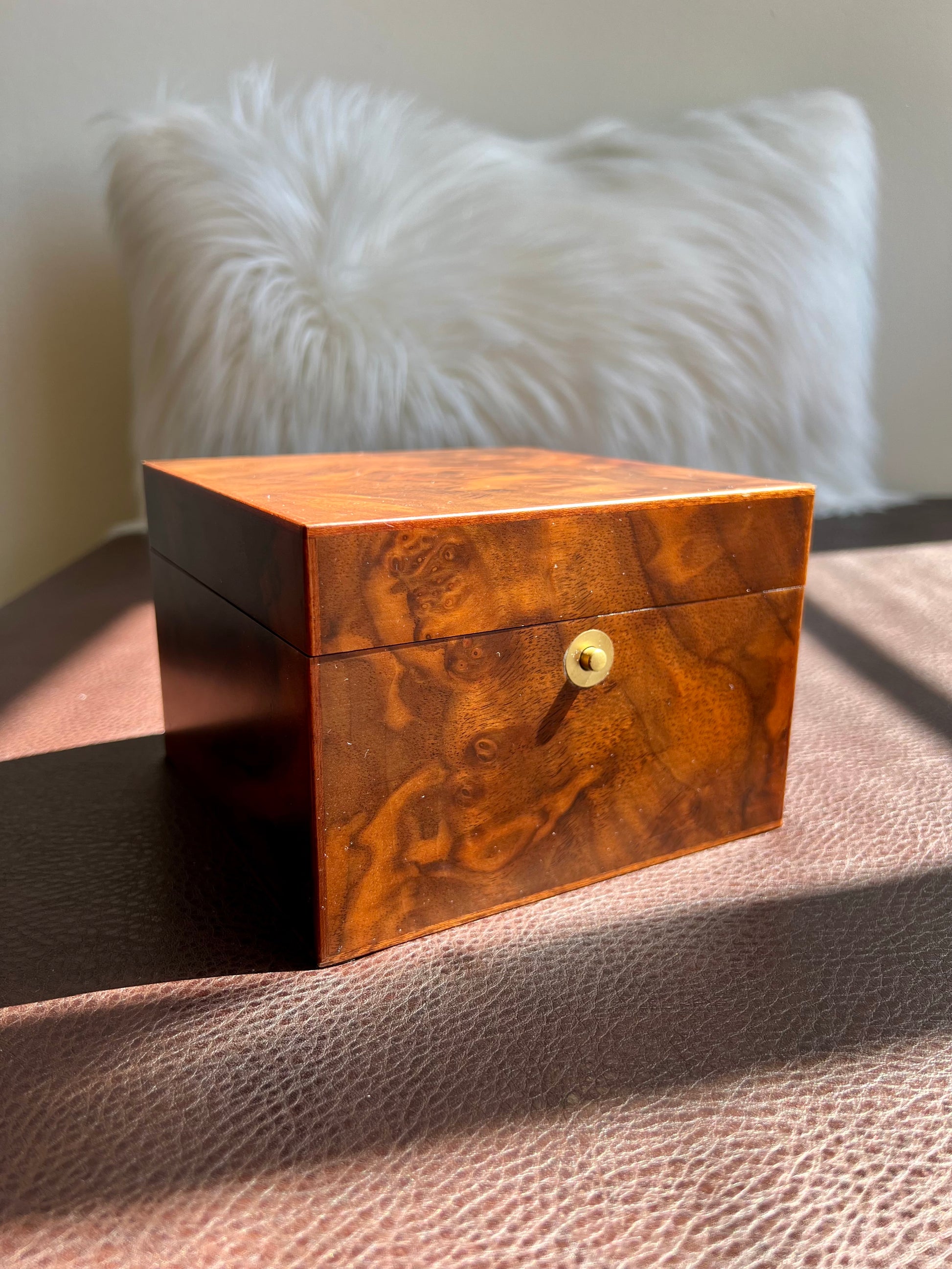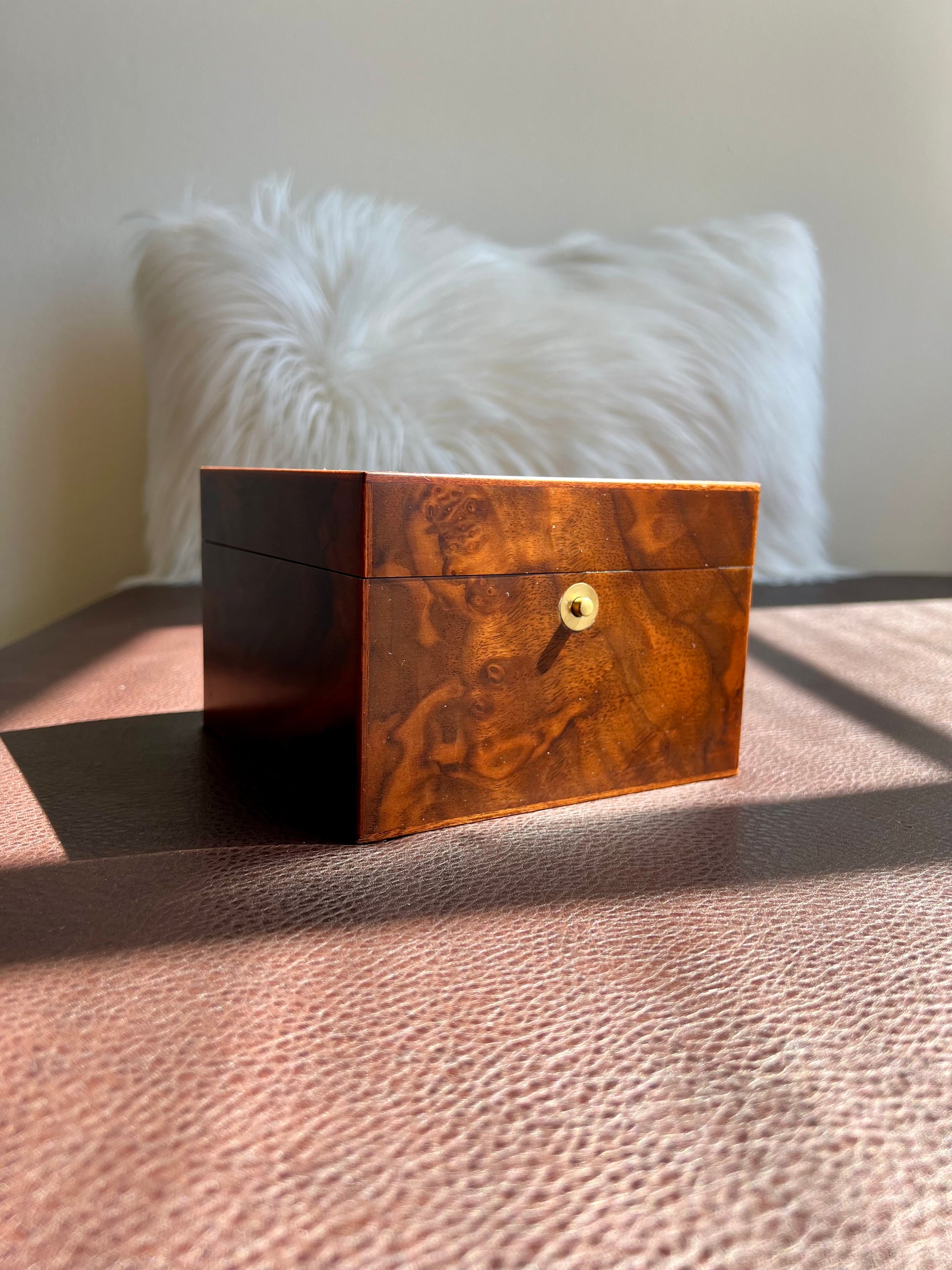 This is an elegant Italian walnut jewelry box or watch holder. Created by Ercolano in Italy. It has a beautiful light beige sueded lining. There is a tiny spot on the top of the box where the varnish is not perfect. It is almost unnoticeable. The box is in very good, beautiful vintage condition.