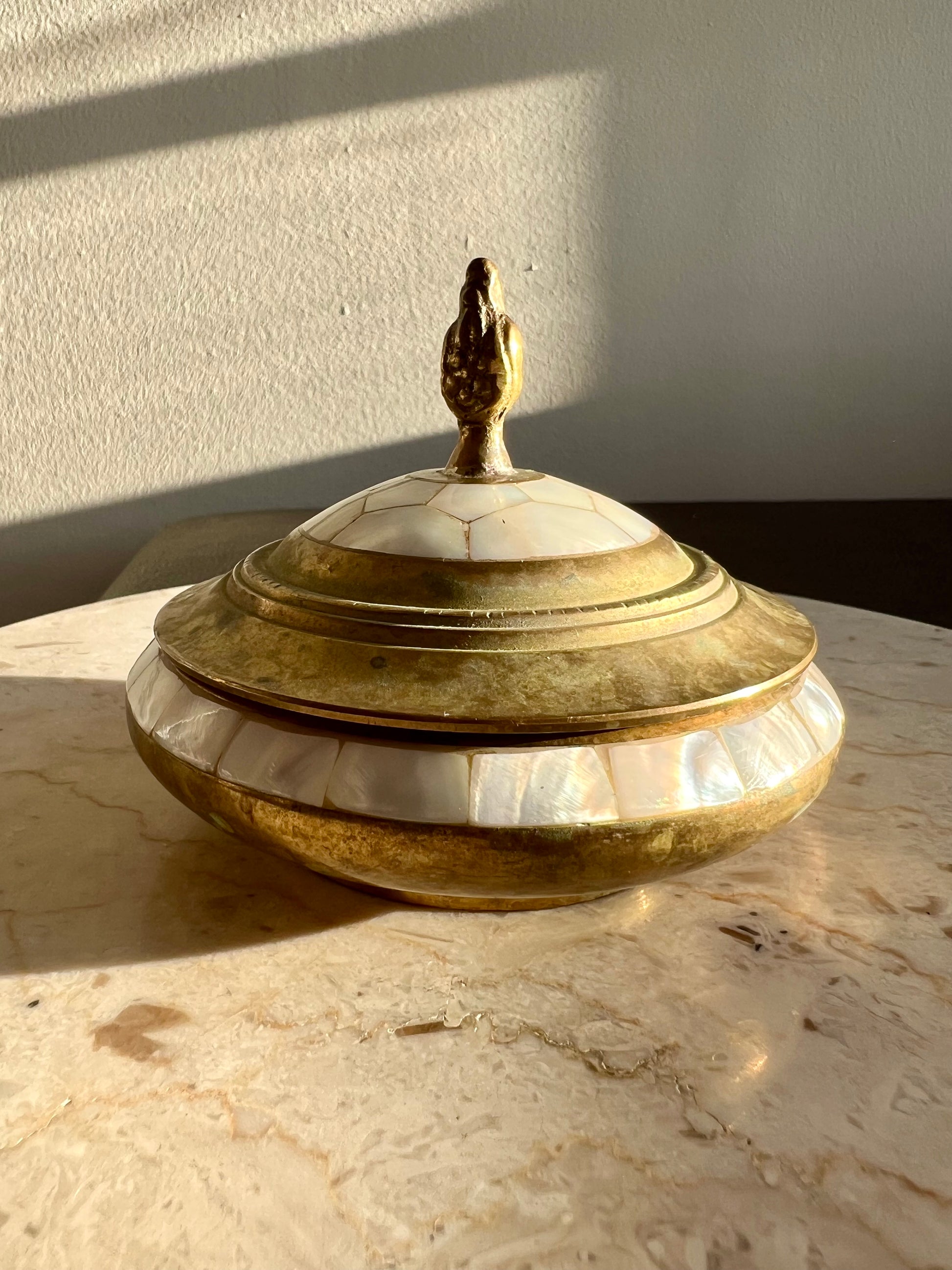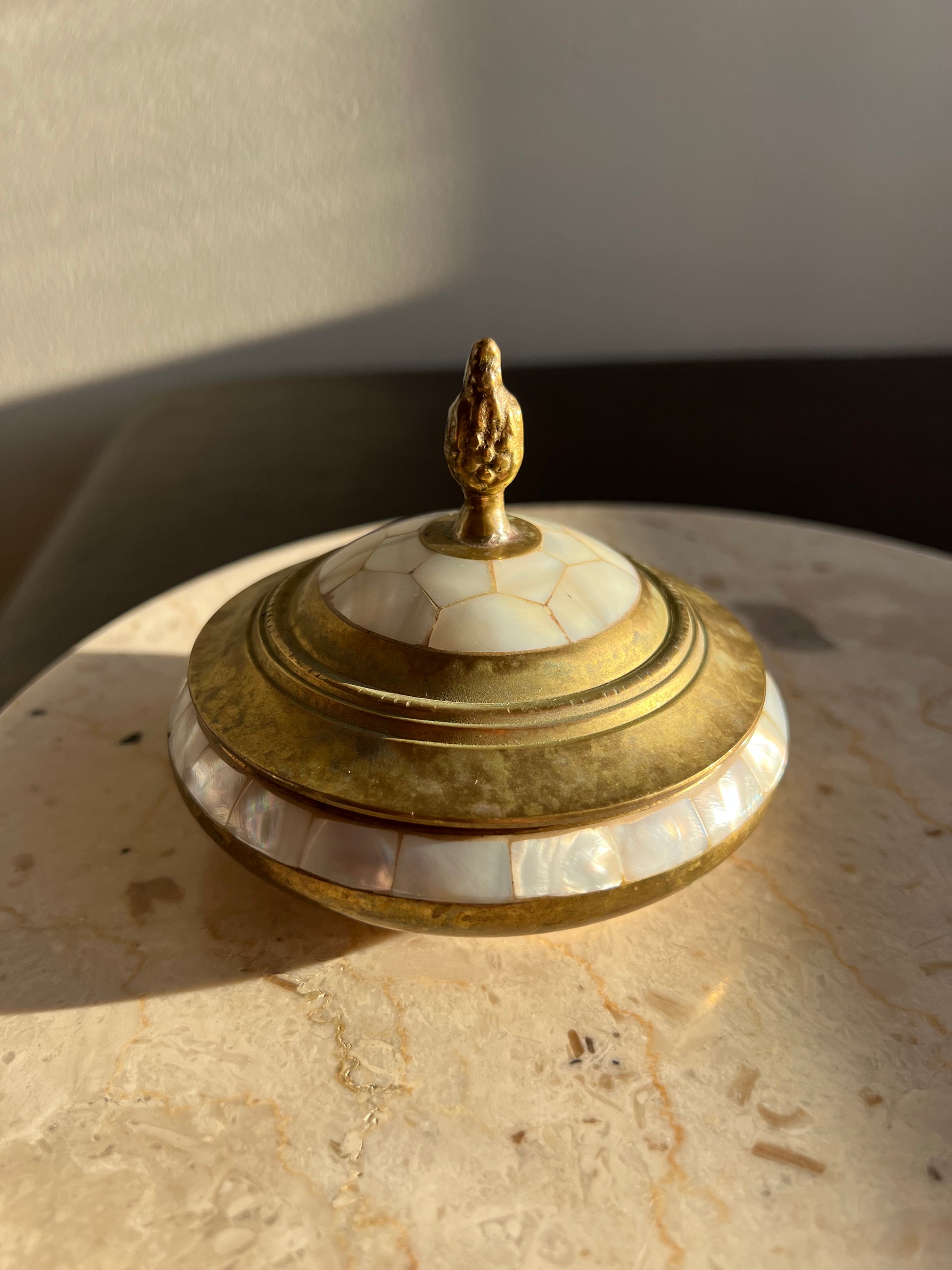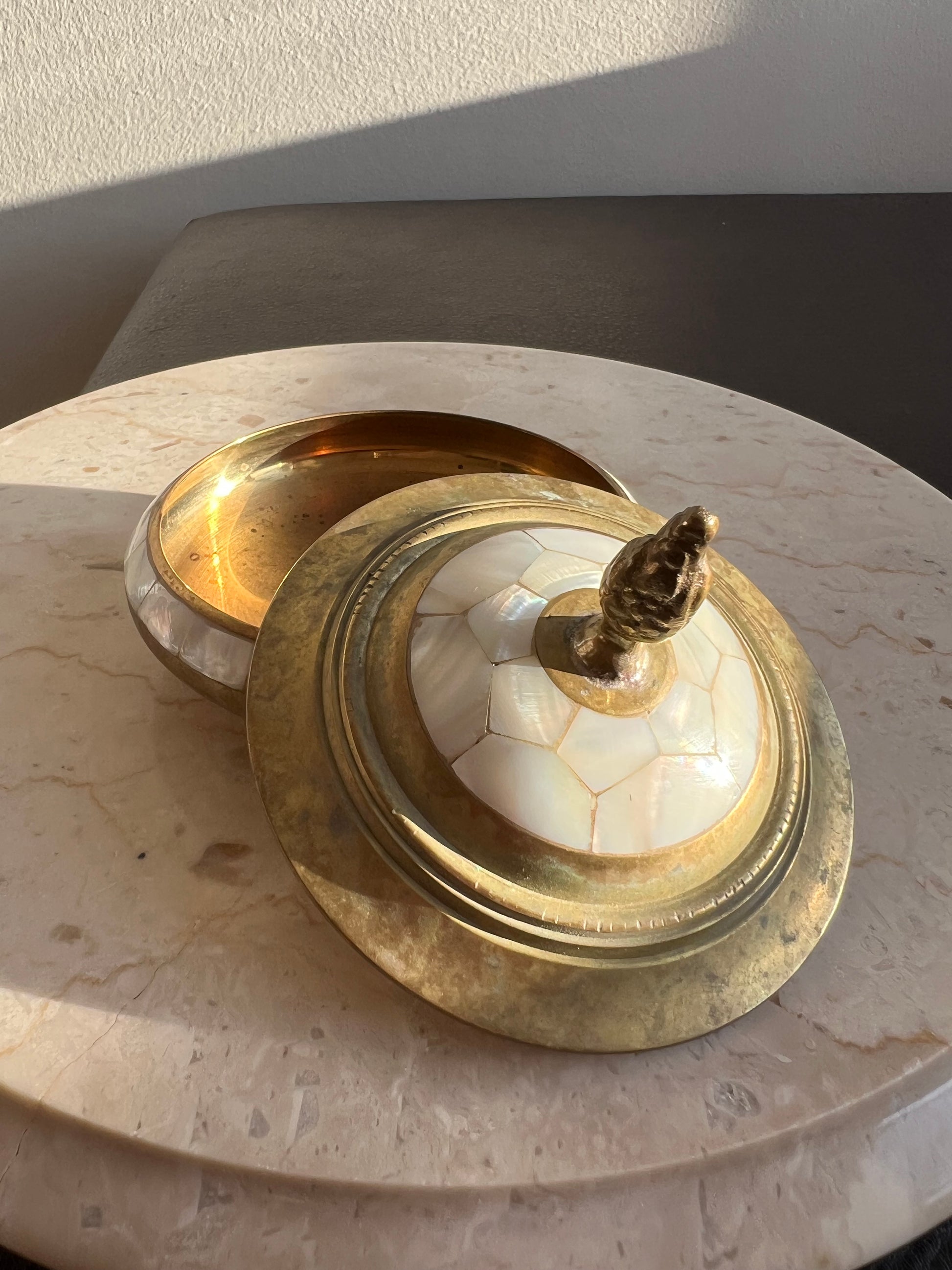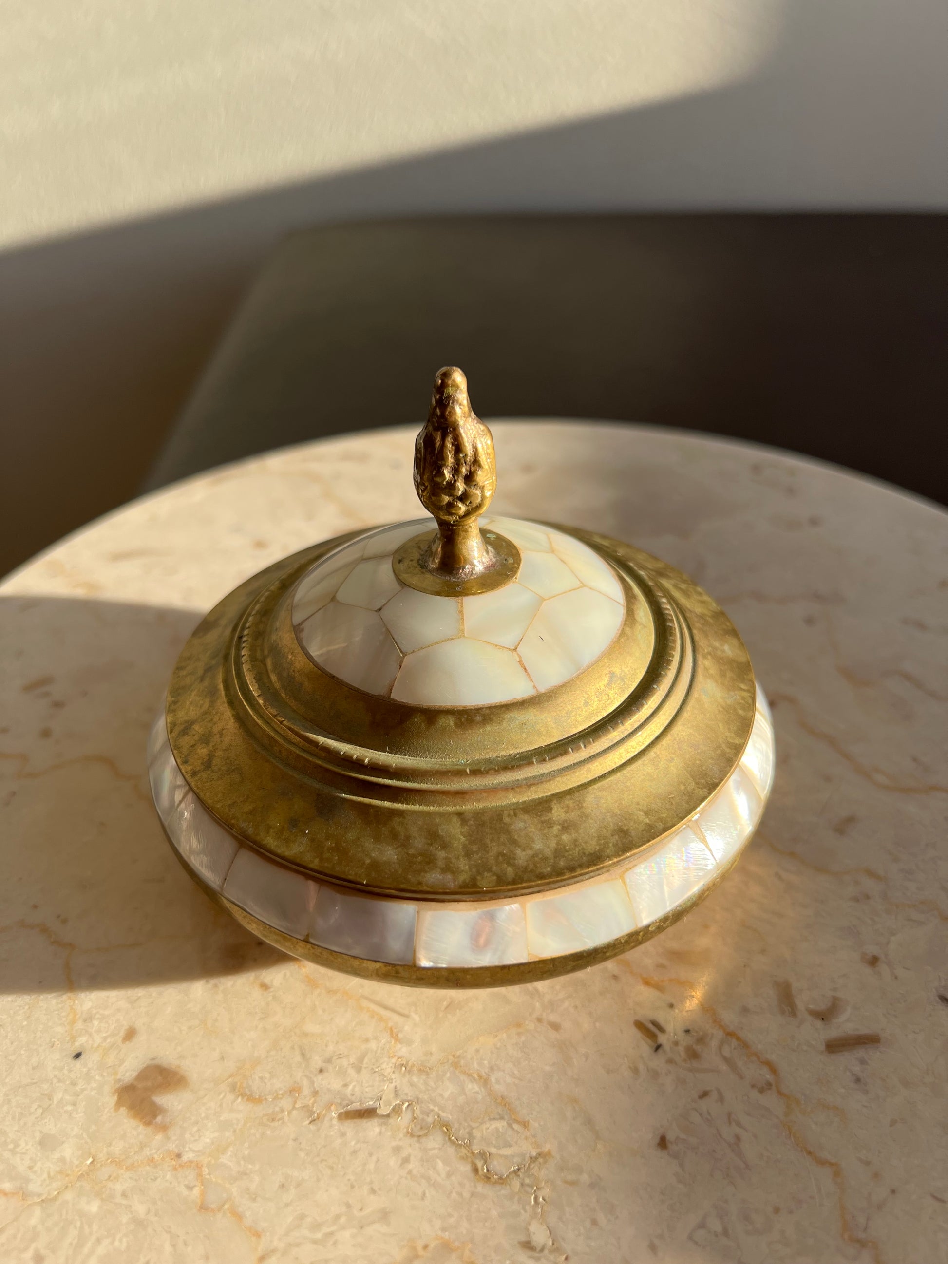 Beautiful vintage brass jewelry and real shell trinket box with elegant pearl decoration on lid. It’s in excellent vintage condition. Minimal wear is visible on the product.