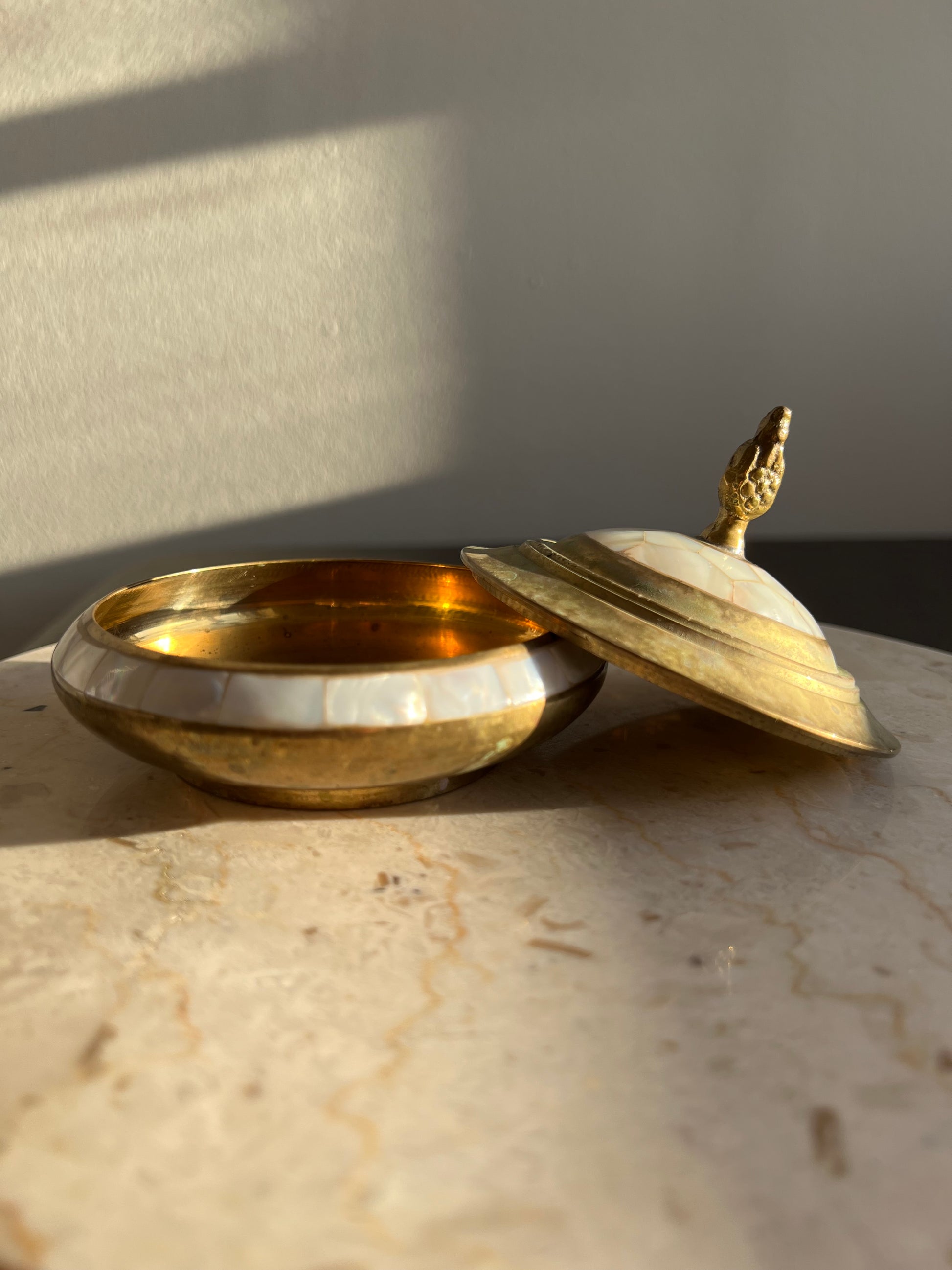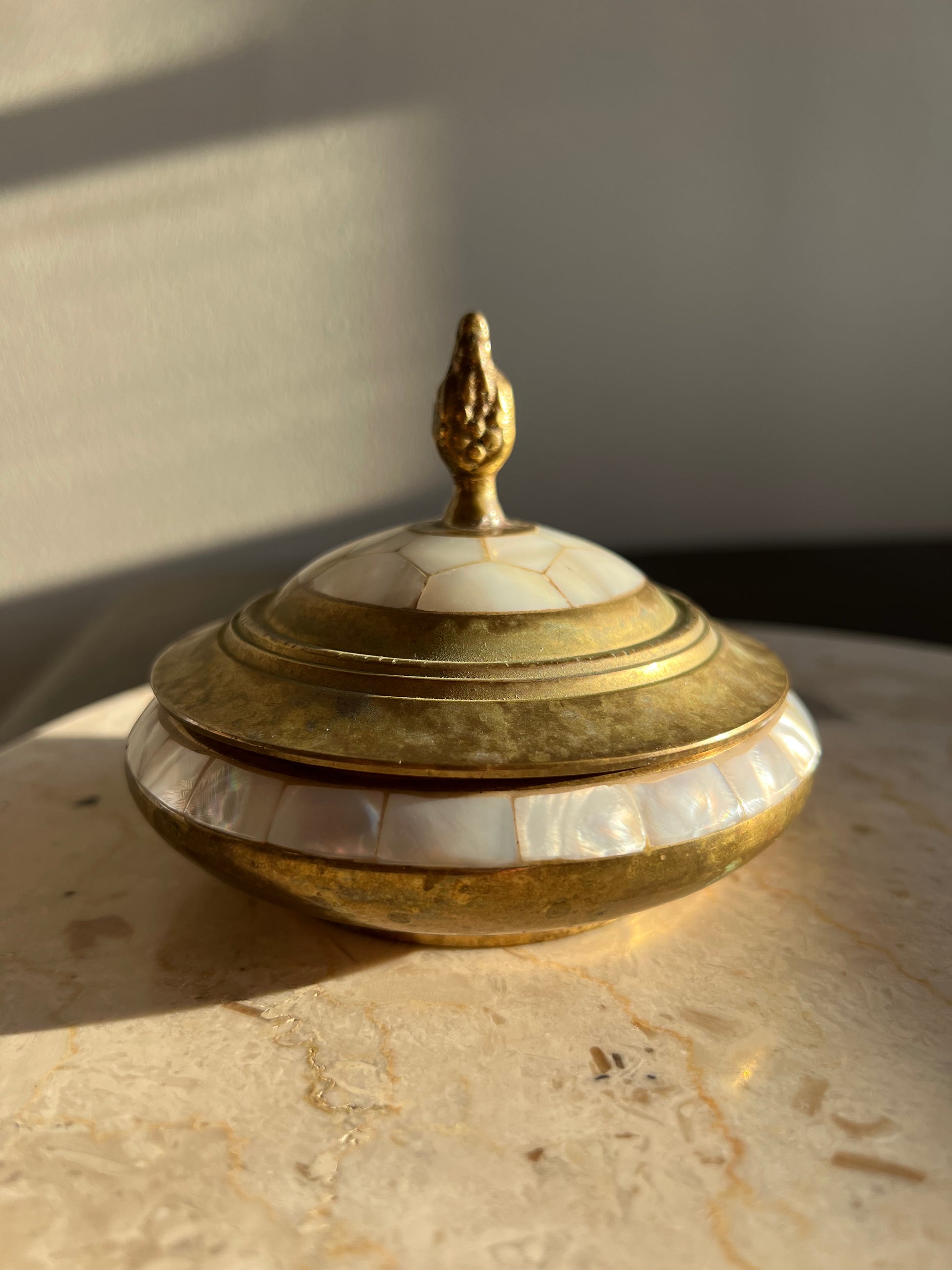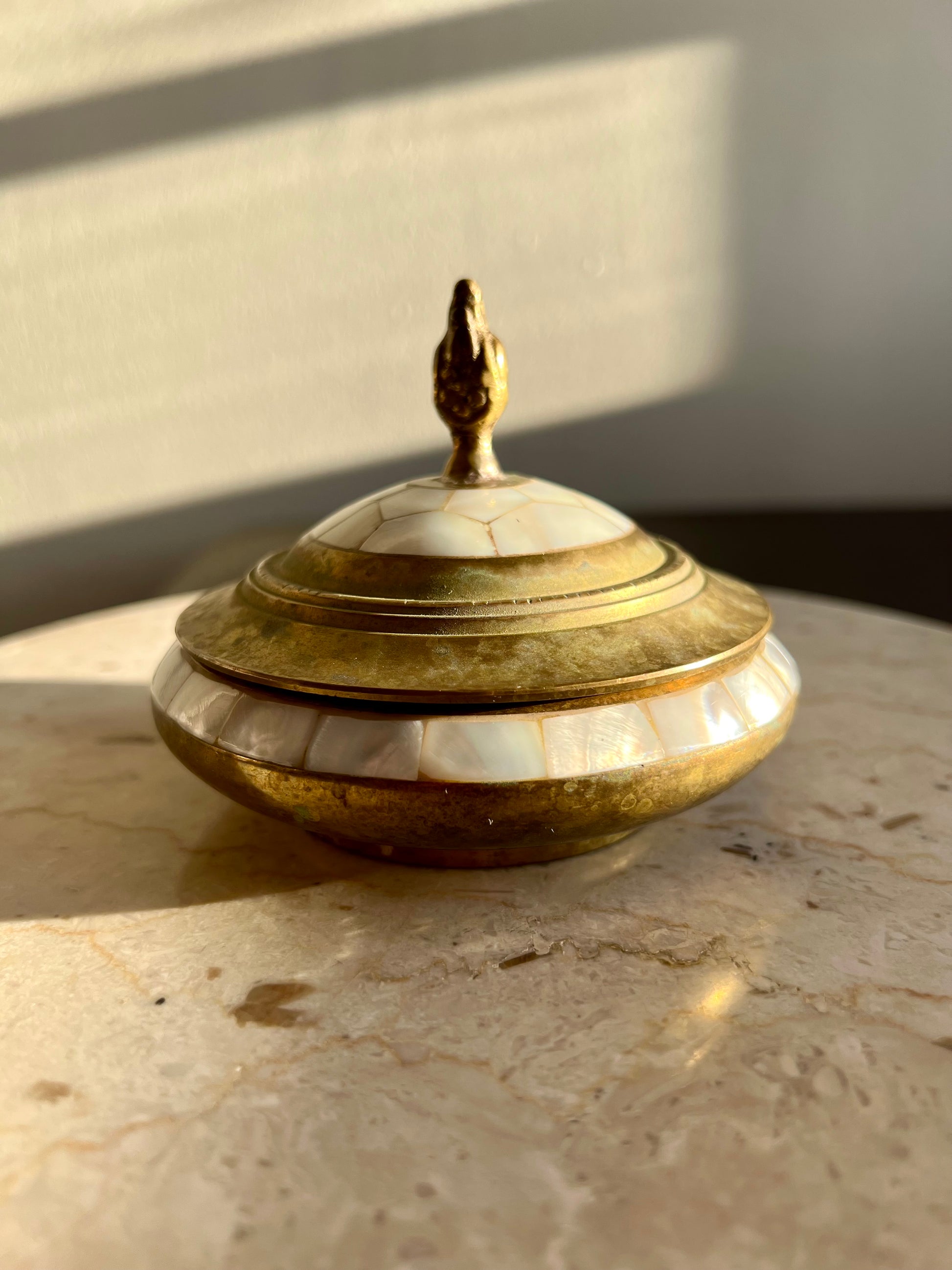Beautiful vintage brass jewelry and real shell trinket box with elegant pearl decoration on lid. It’s in excellent vintage condition. Minimal wear is visible on the product.