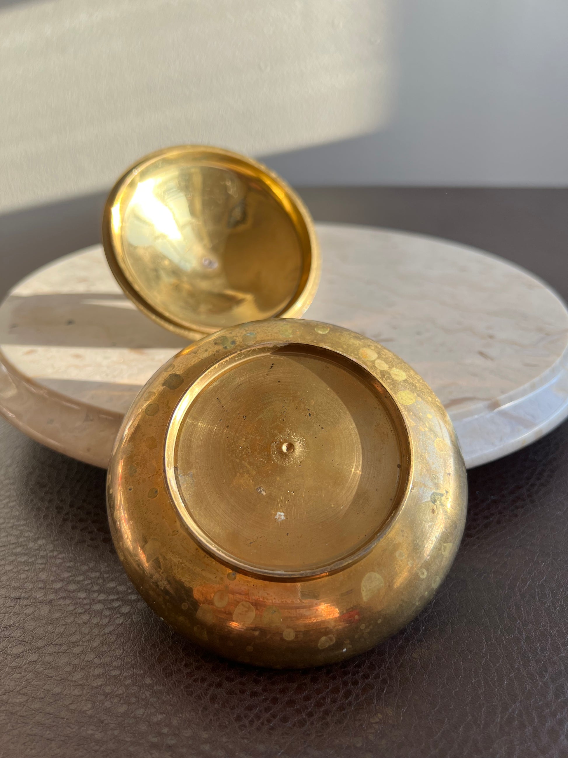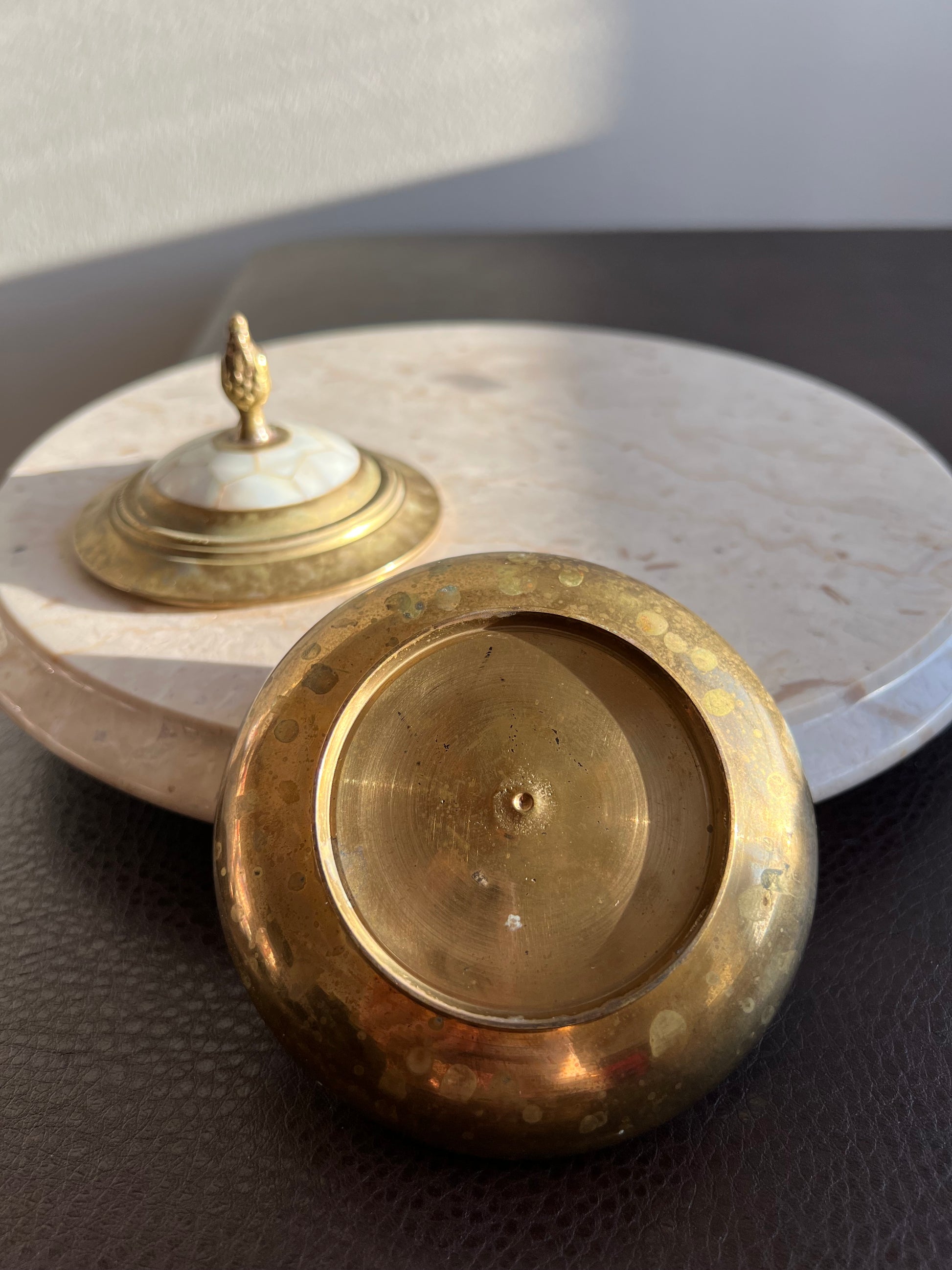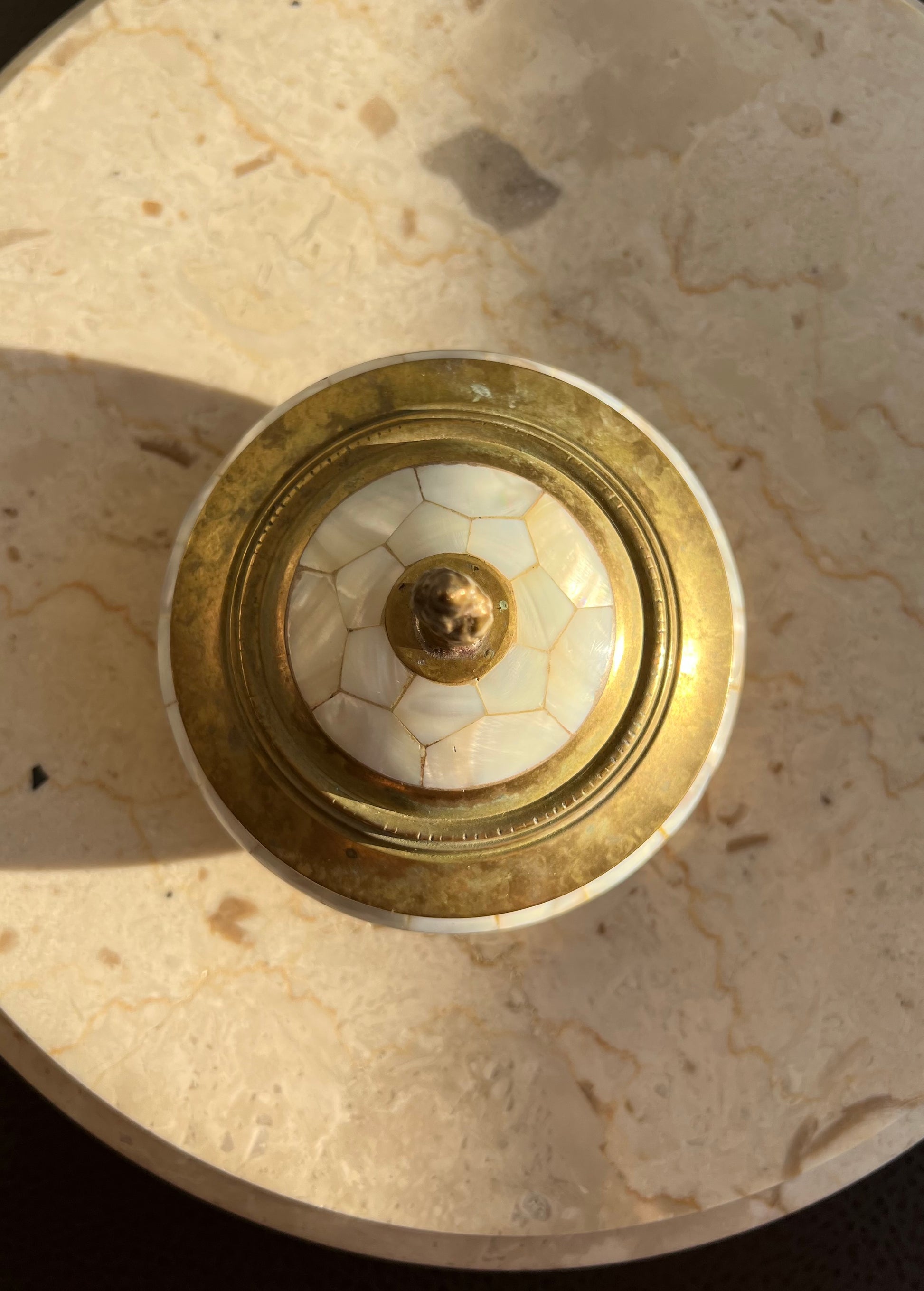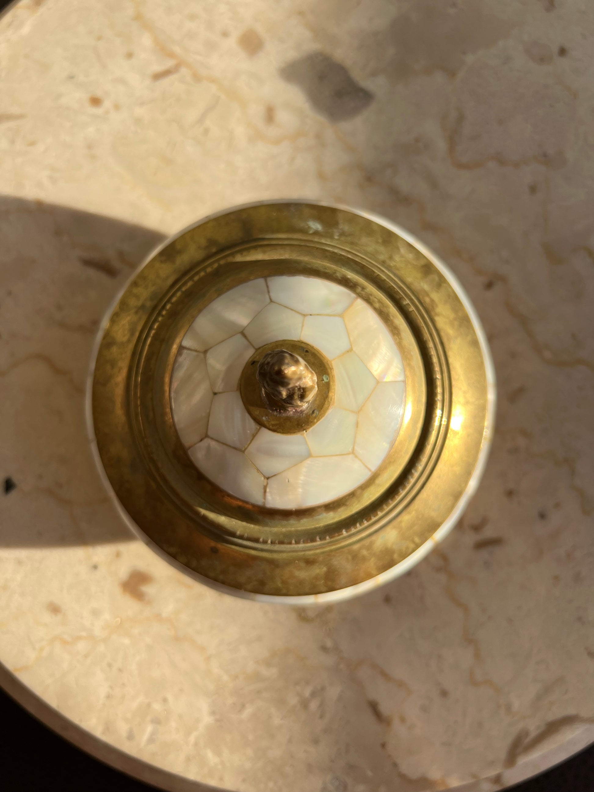 Beautiful vintage brass jewelry and real shell trinket box with elegant pearl decoration on lid. It’s in excellent vintage condition. Minimal wear is visible on the product.