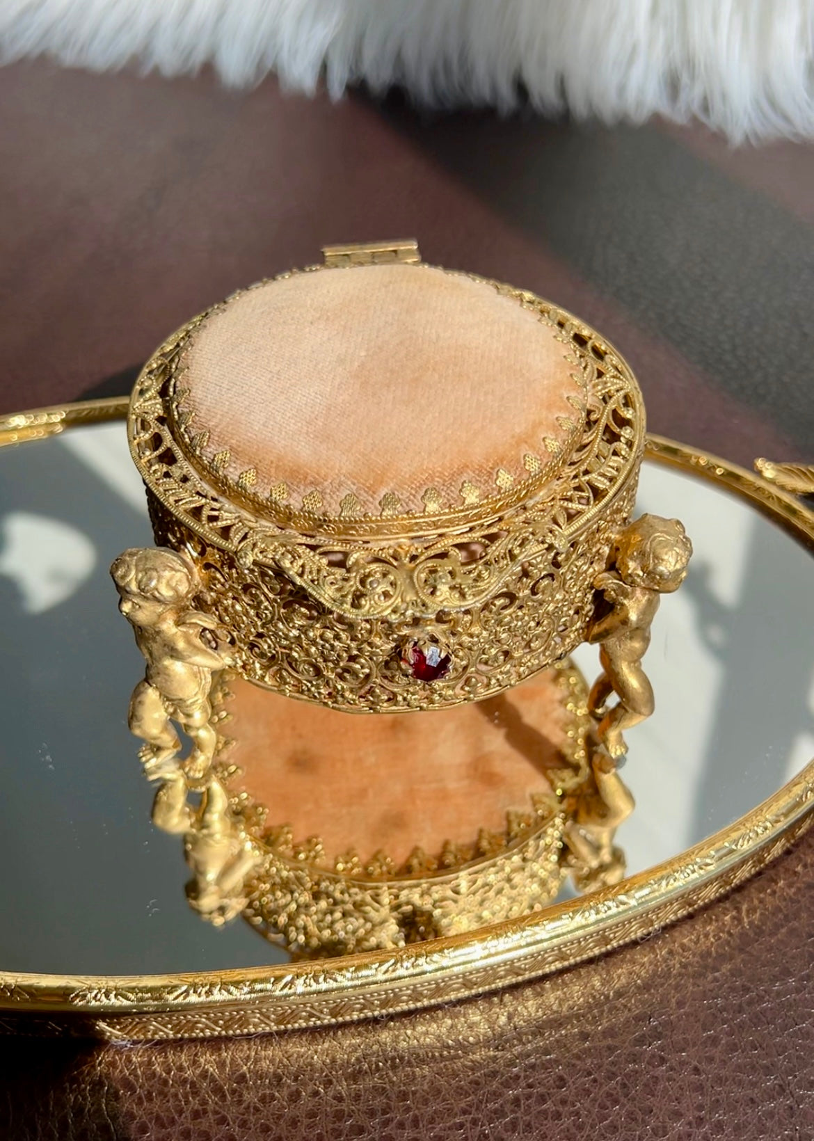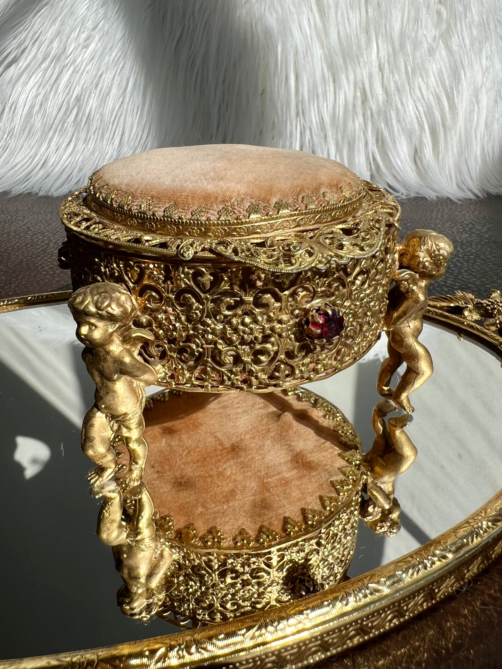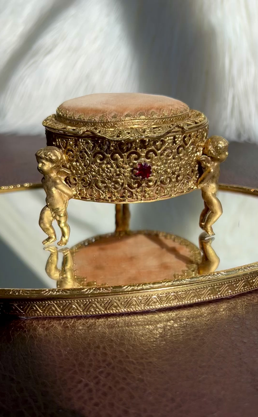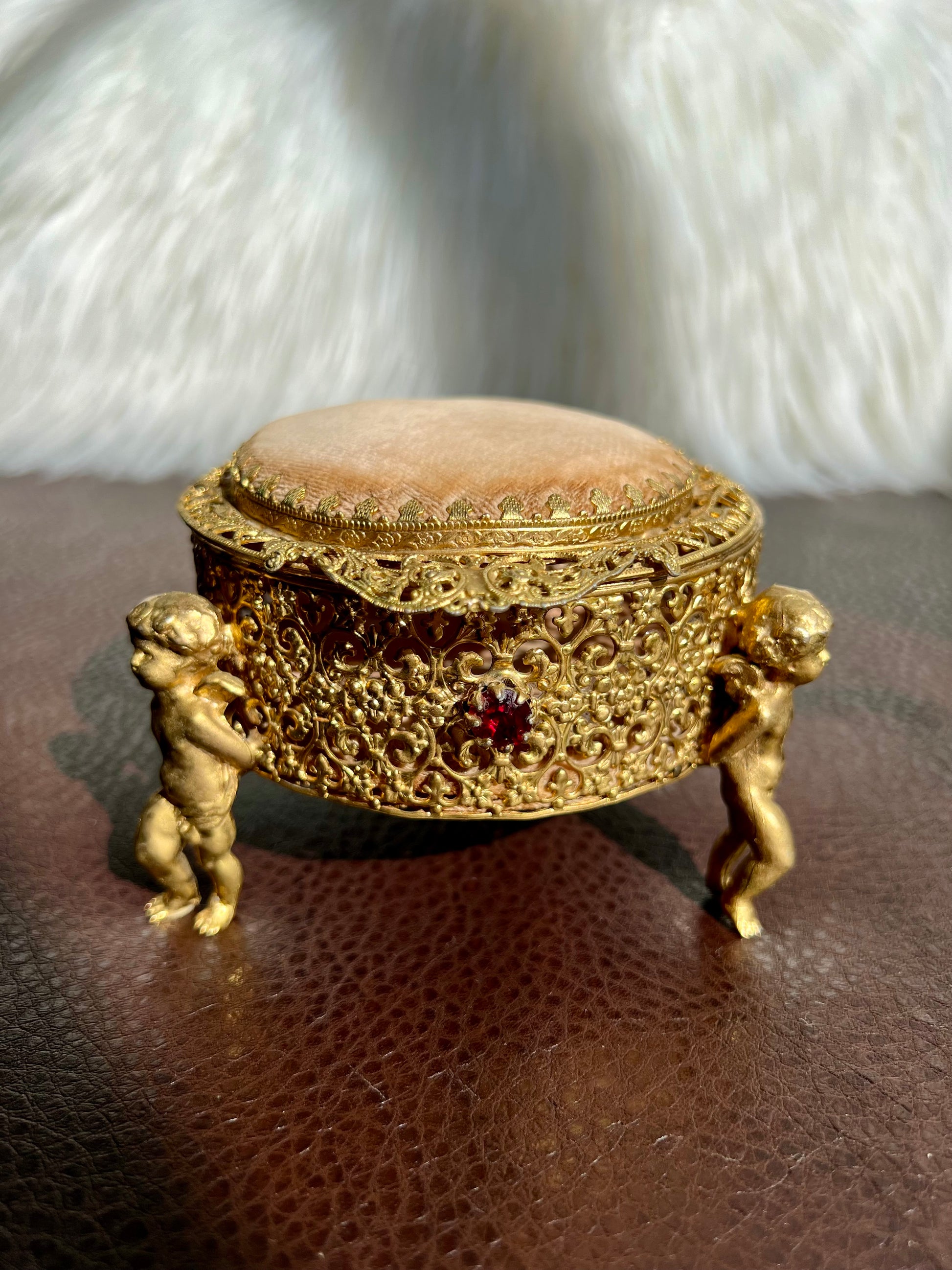 Three Footed Cherub Round StyleBuilt Style Vintage Design Jewelry Casket/ Box with Pink Plush on the Top and Inside & Burgundy Red Stones Decoration