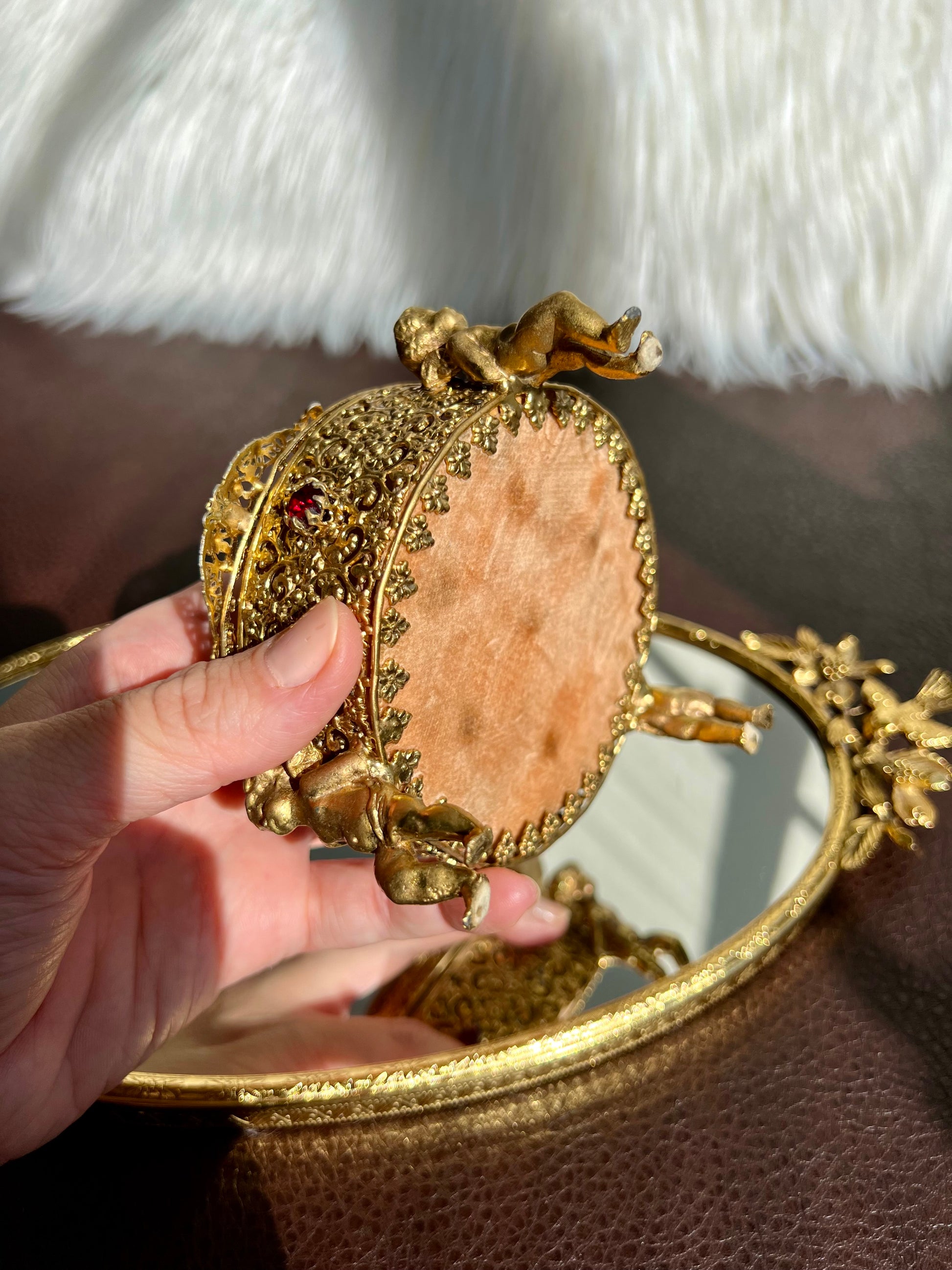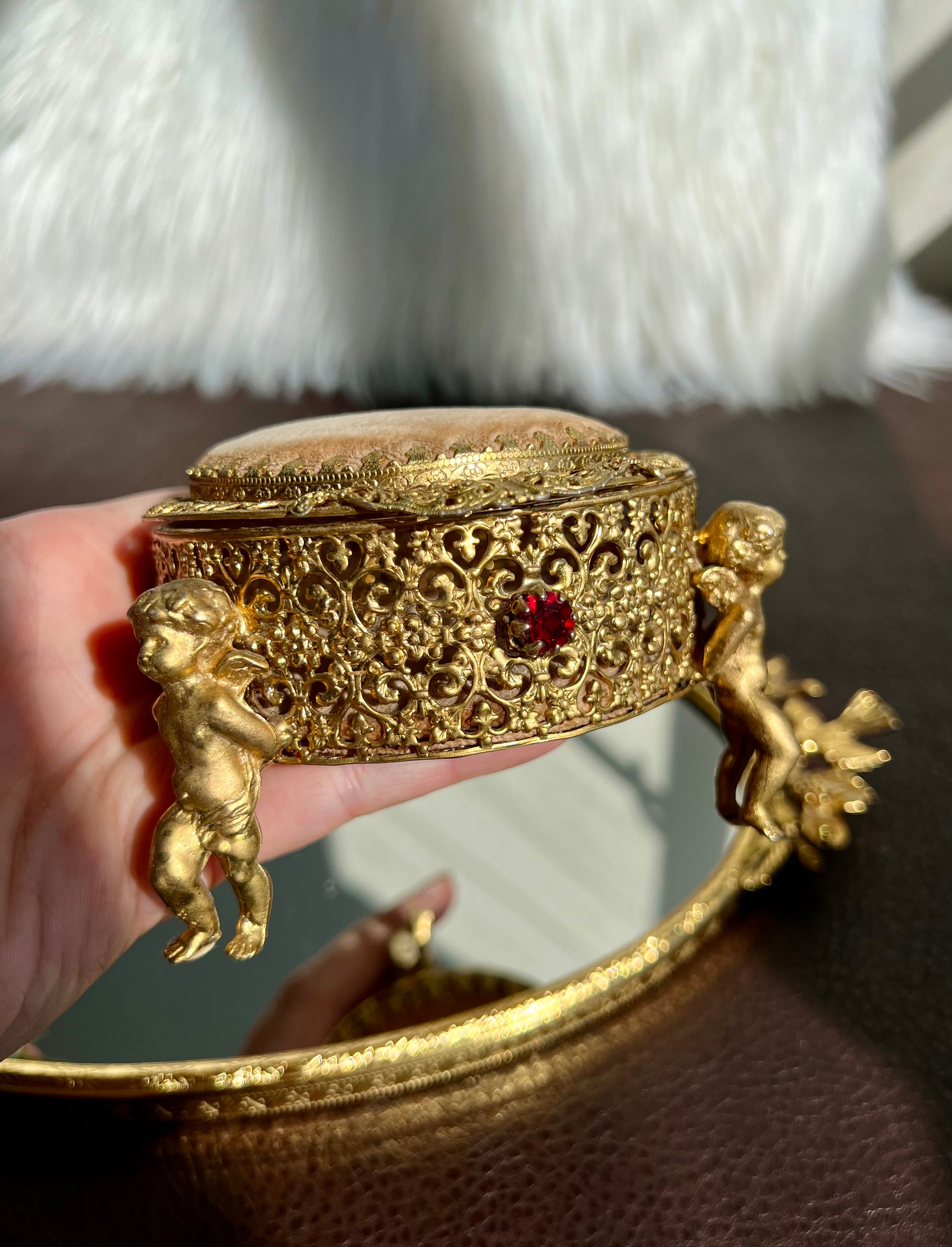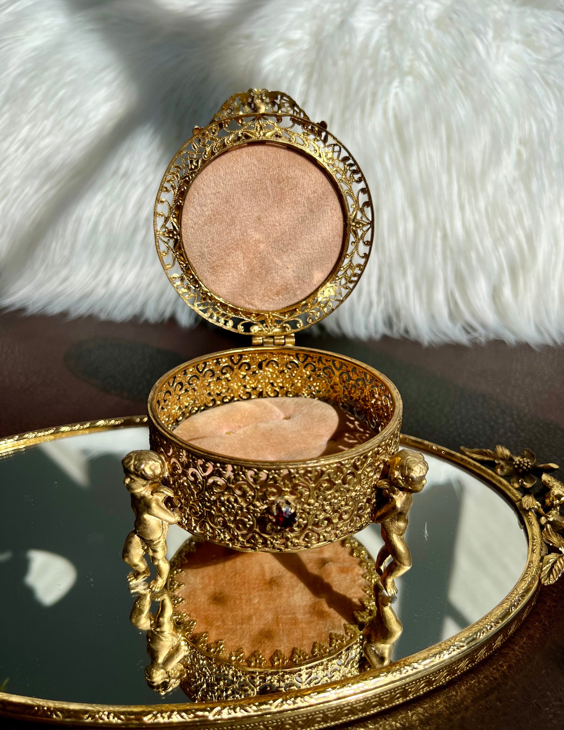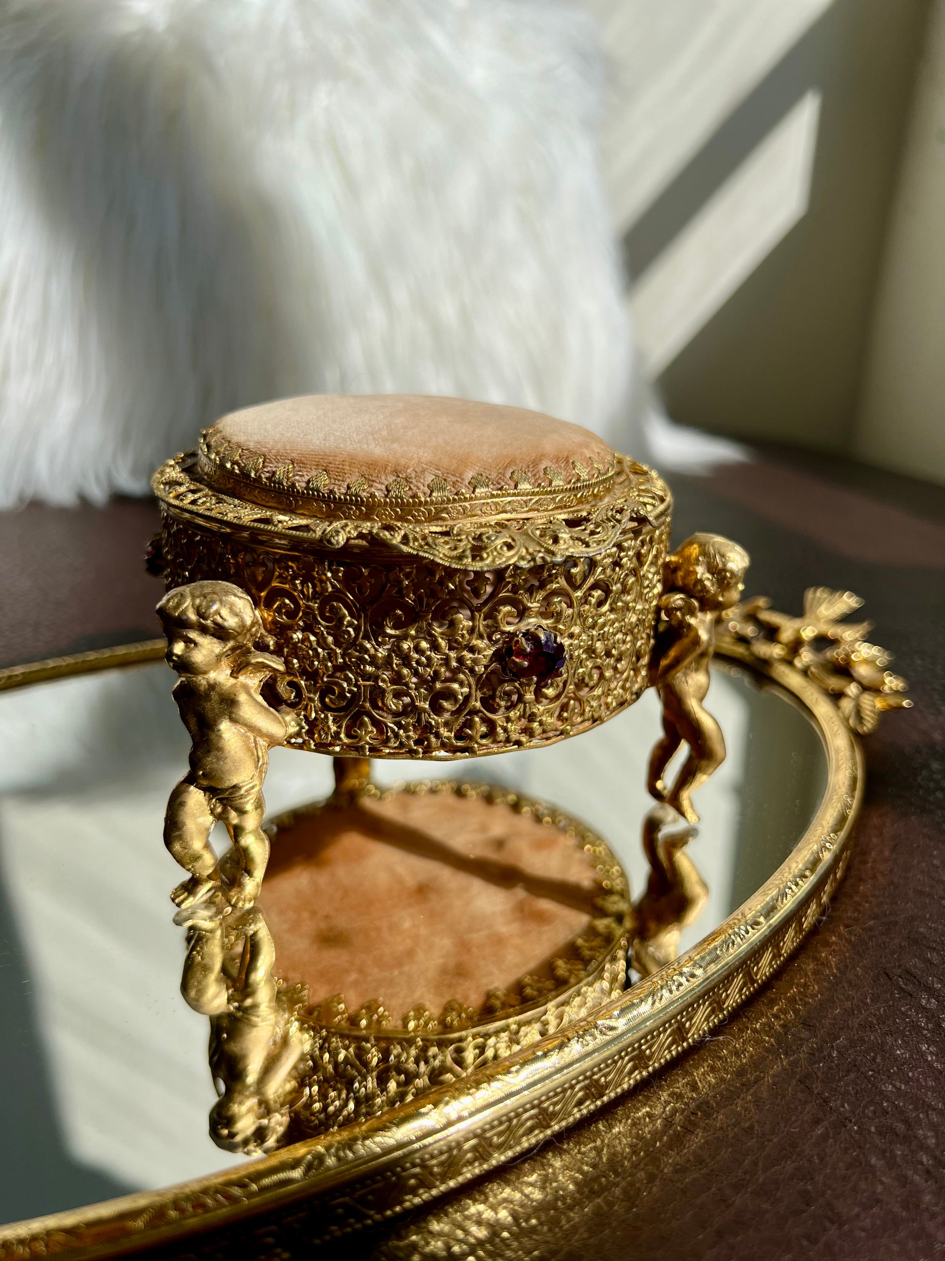 Three Footed Cherub Round StyleBuilt Style Vintage Design Jewelry Casket/ Box with Pink Plush on the Top and Inside & Burgundy Red Stones Decoration