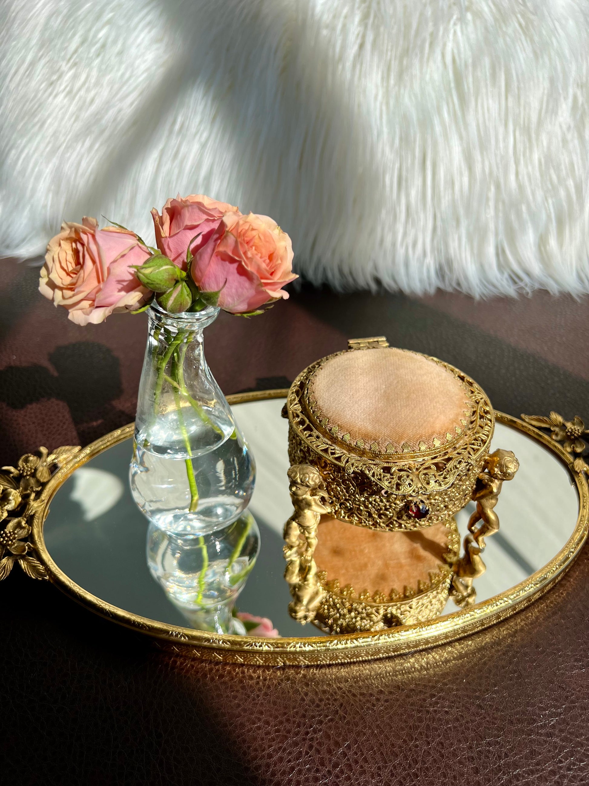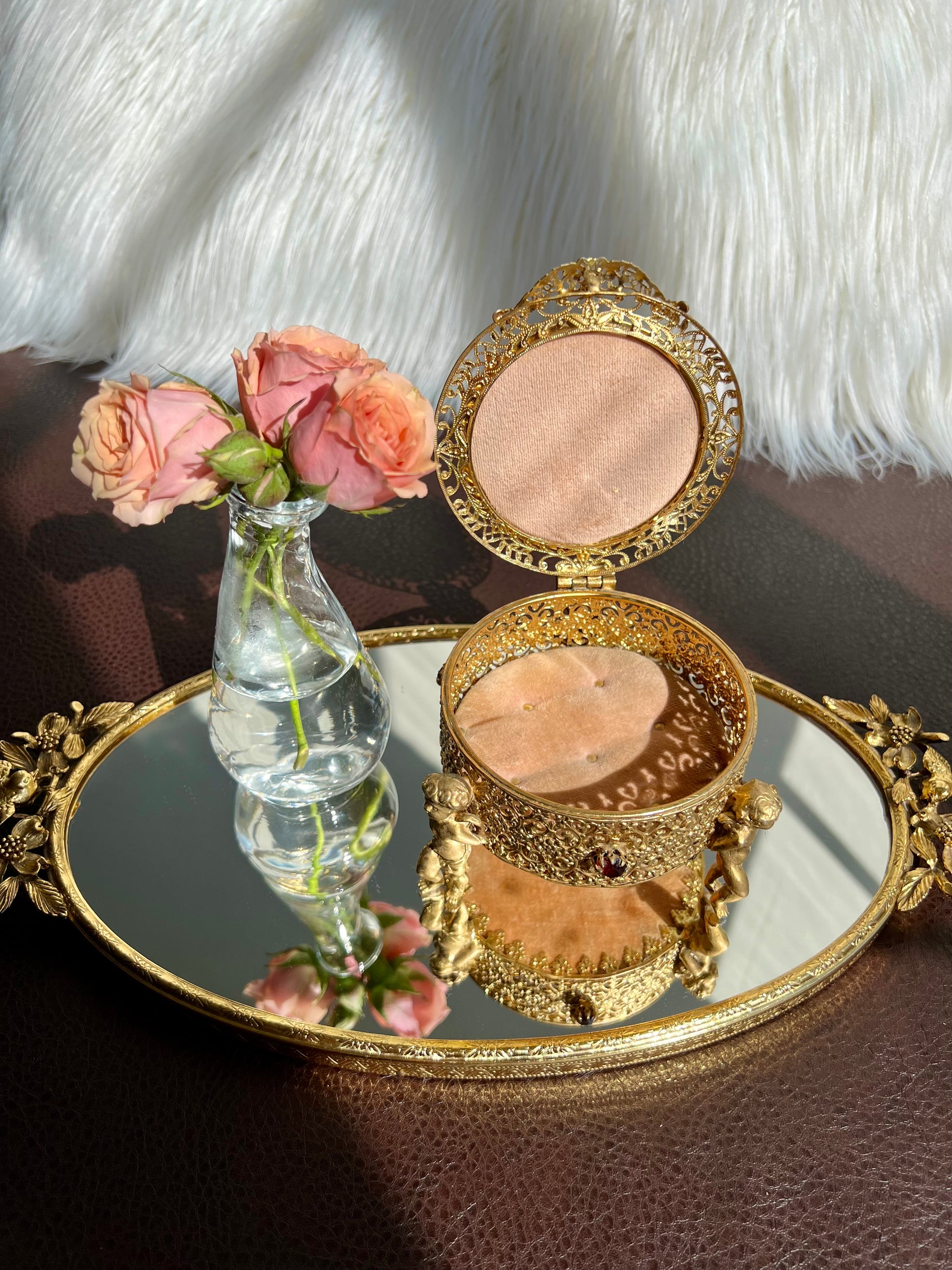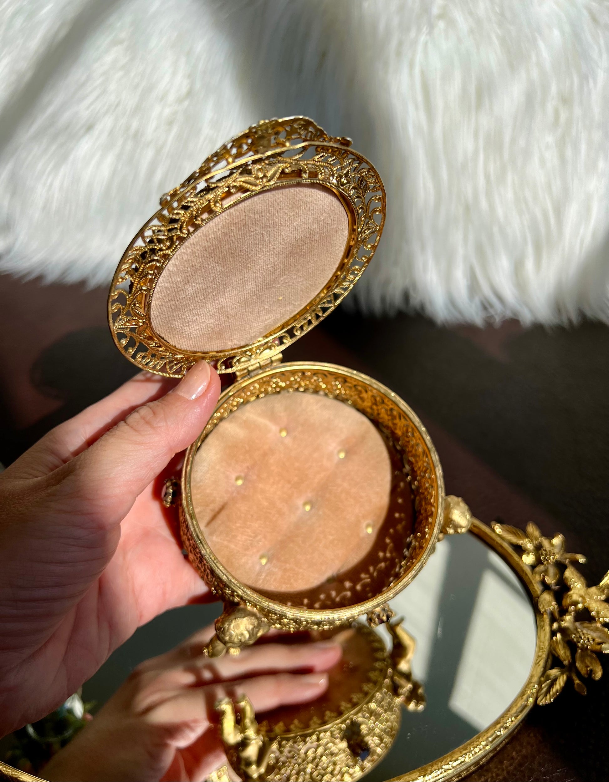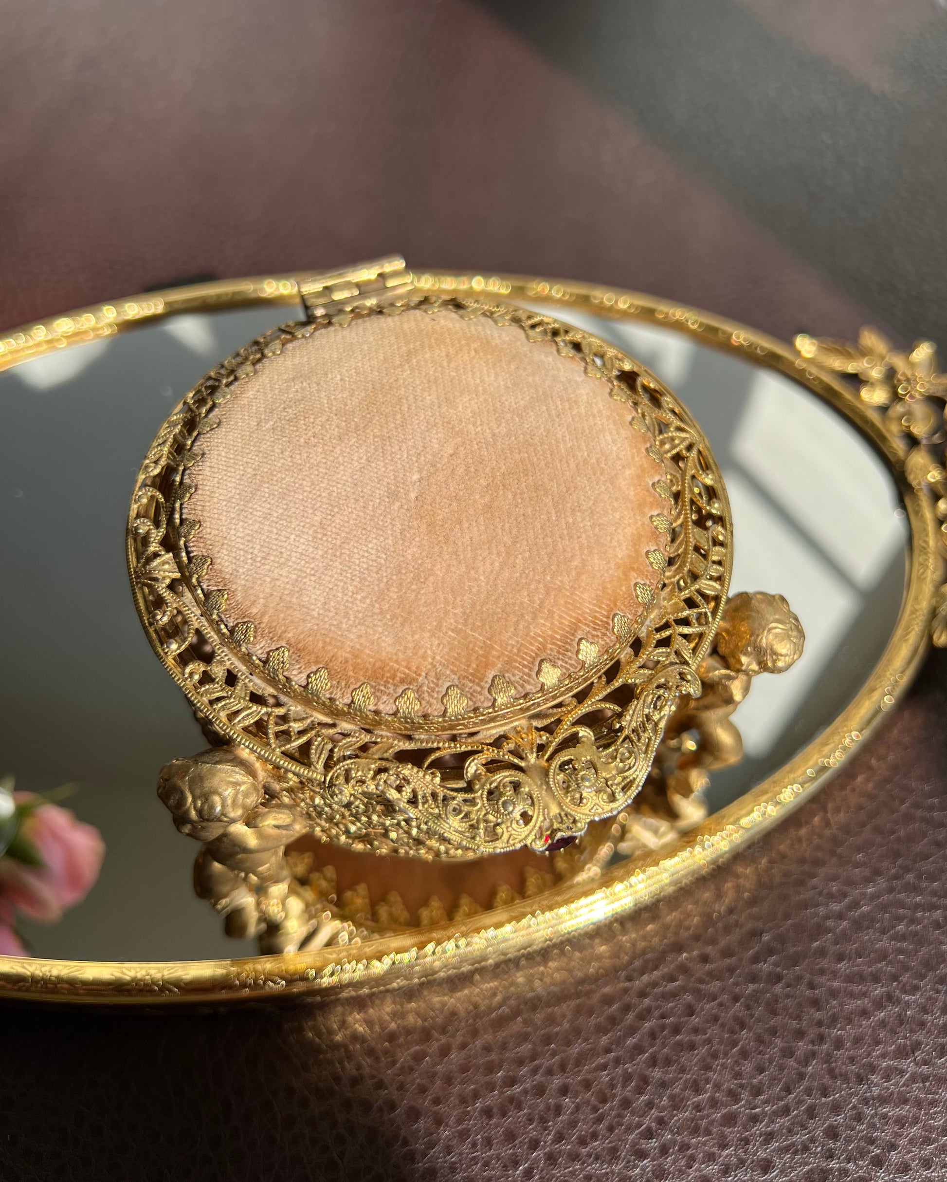 Three Footed Cherub Round StyleBuilt Style Vintage Design Jewelry Casket/ Box with Pink Plush on the Top and Inside & Burgundy Red Stones Decoration