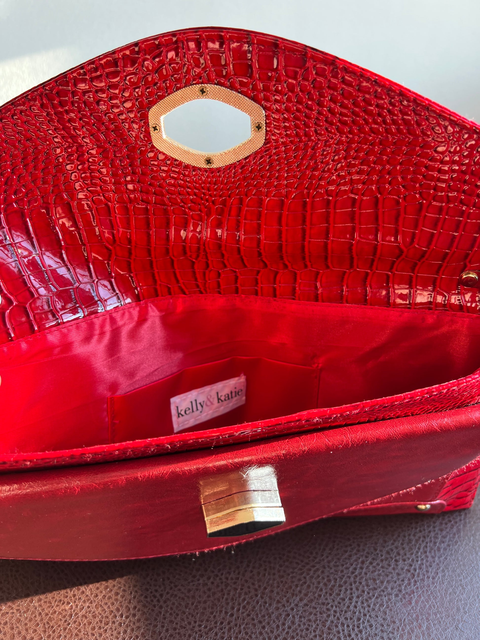 Beautiful Kelly & Katie vintage red snake embossed clutch purse or handbag with chain strap. It’s in very good condition.
