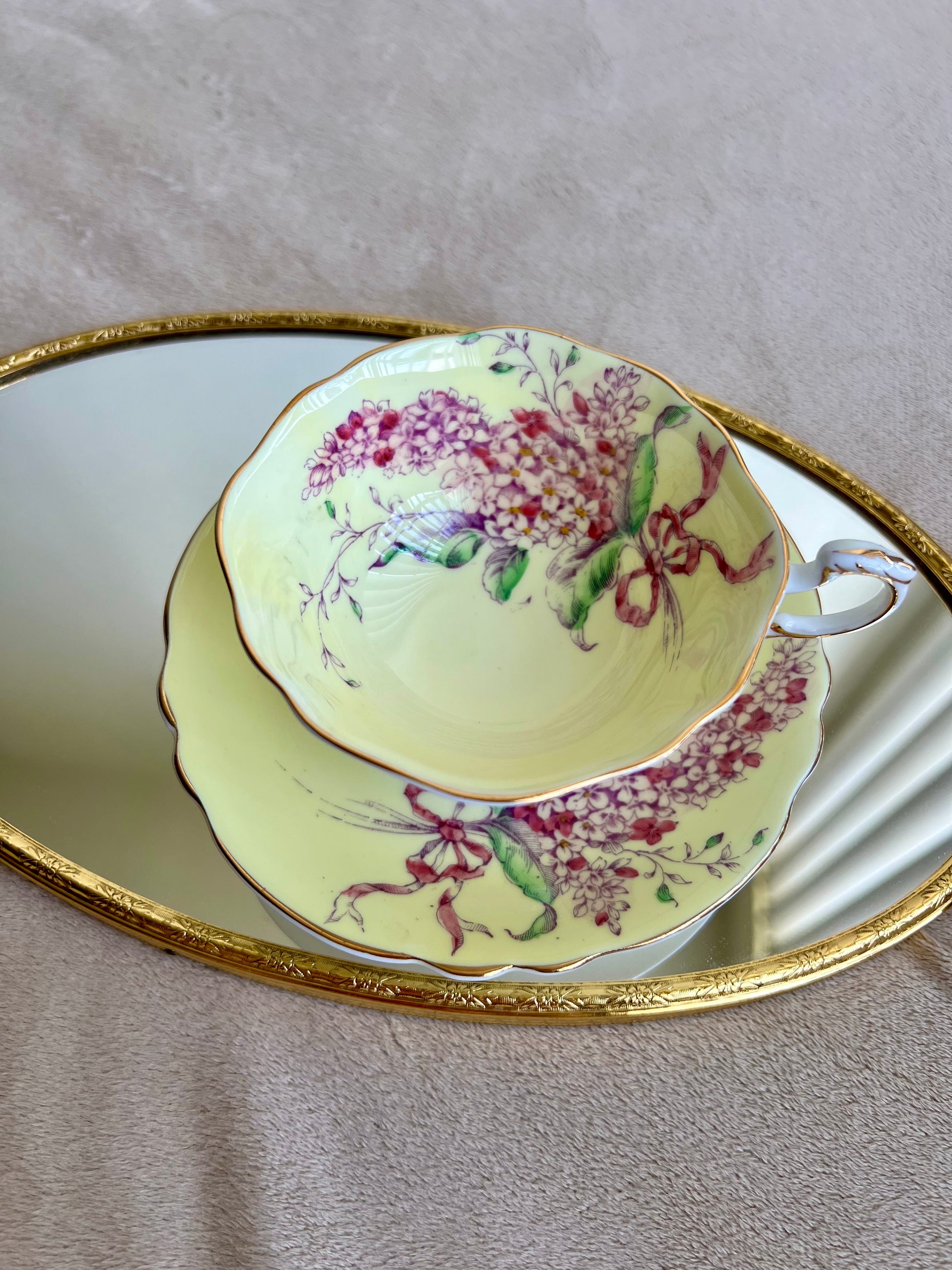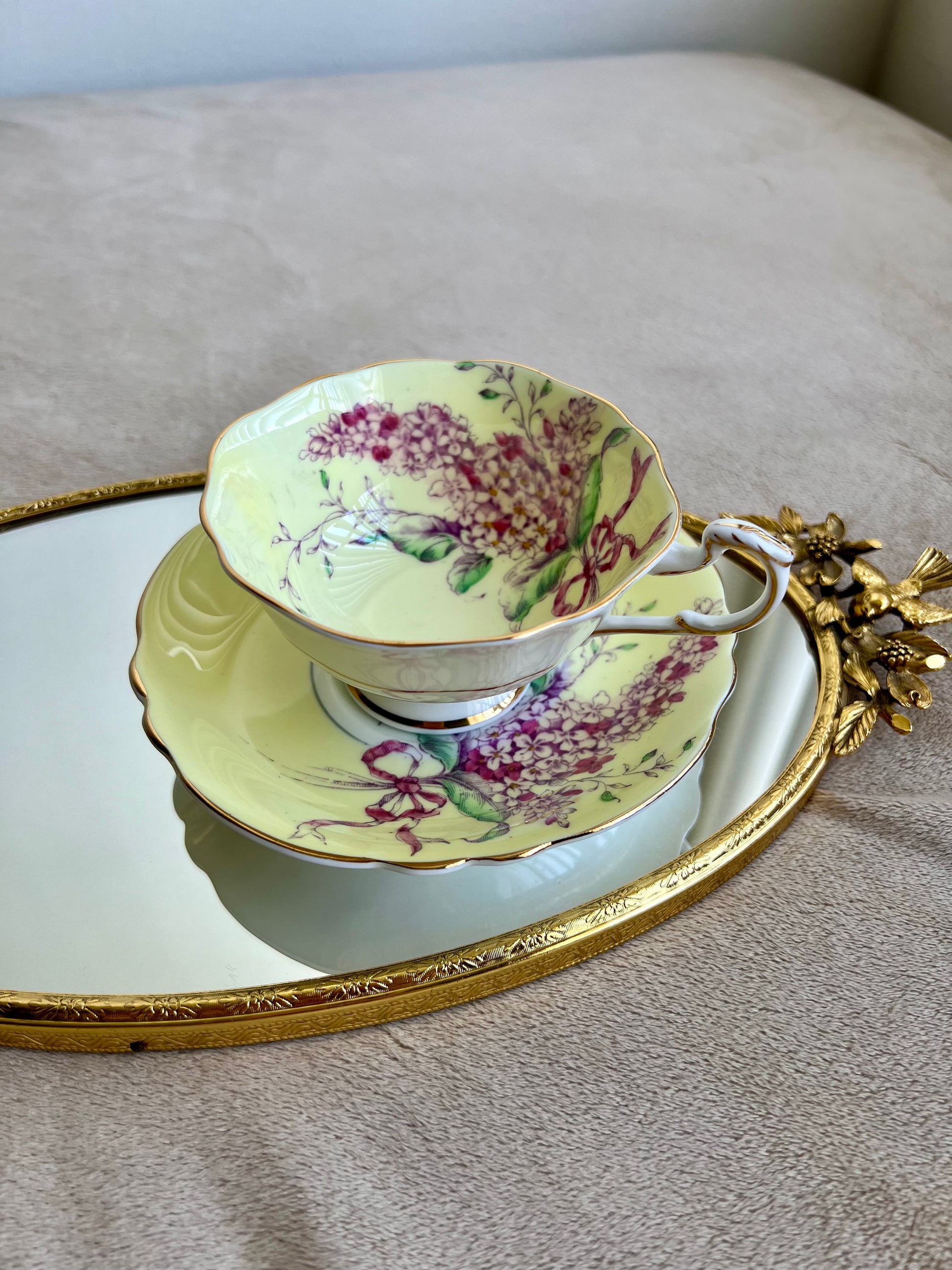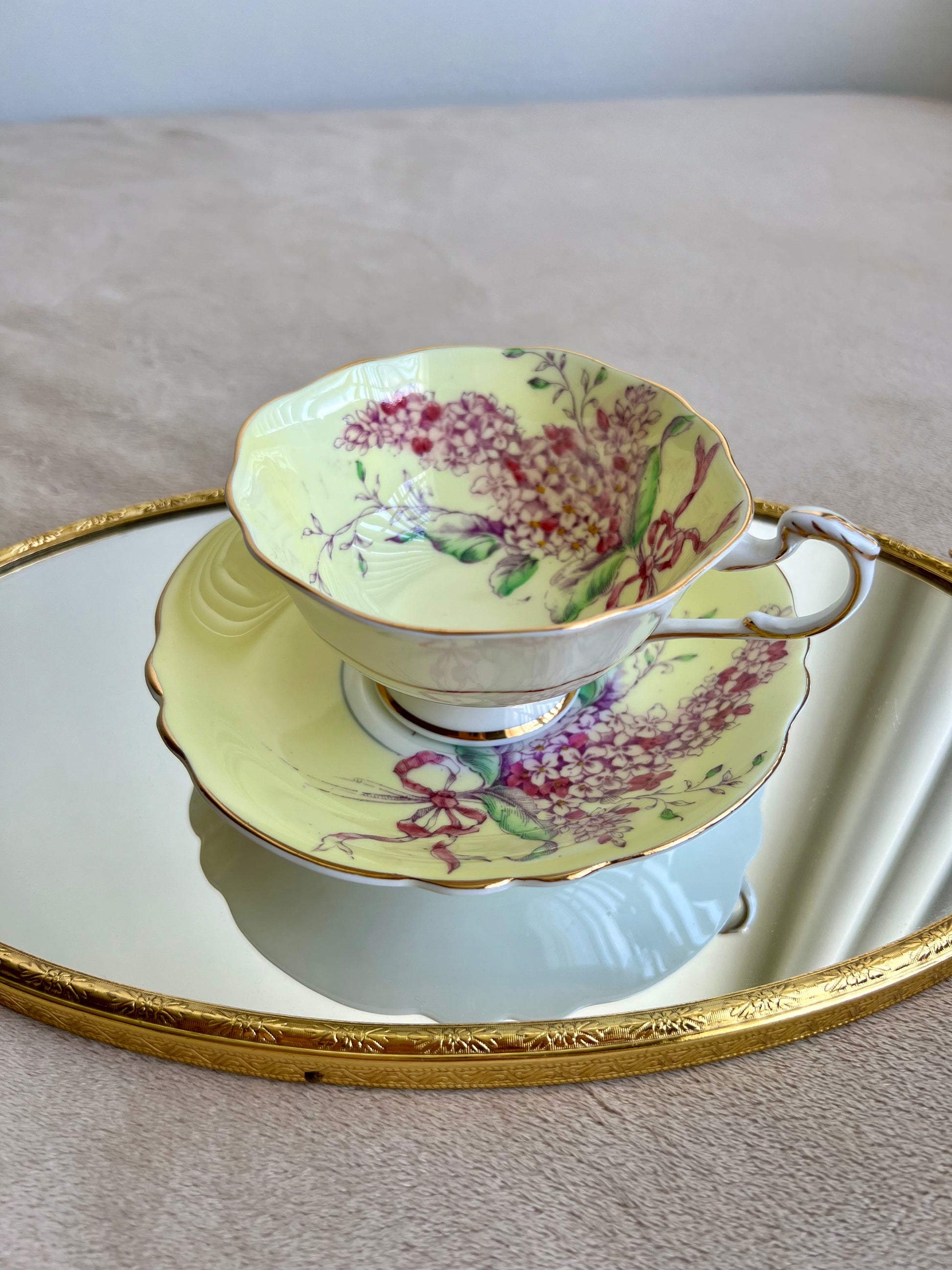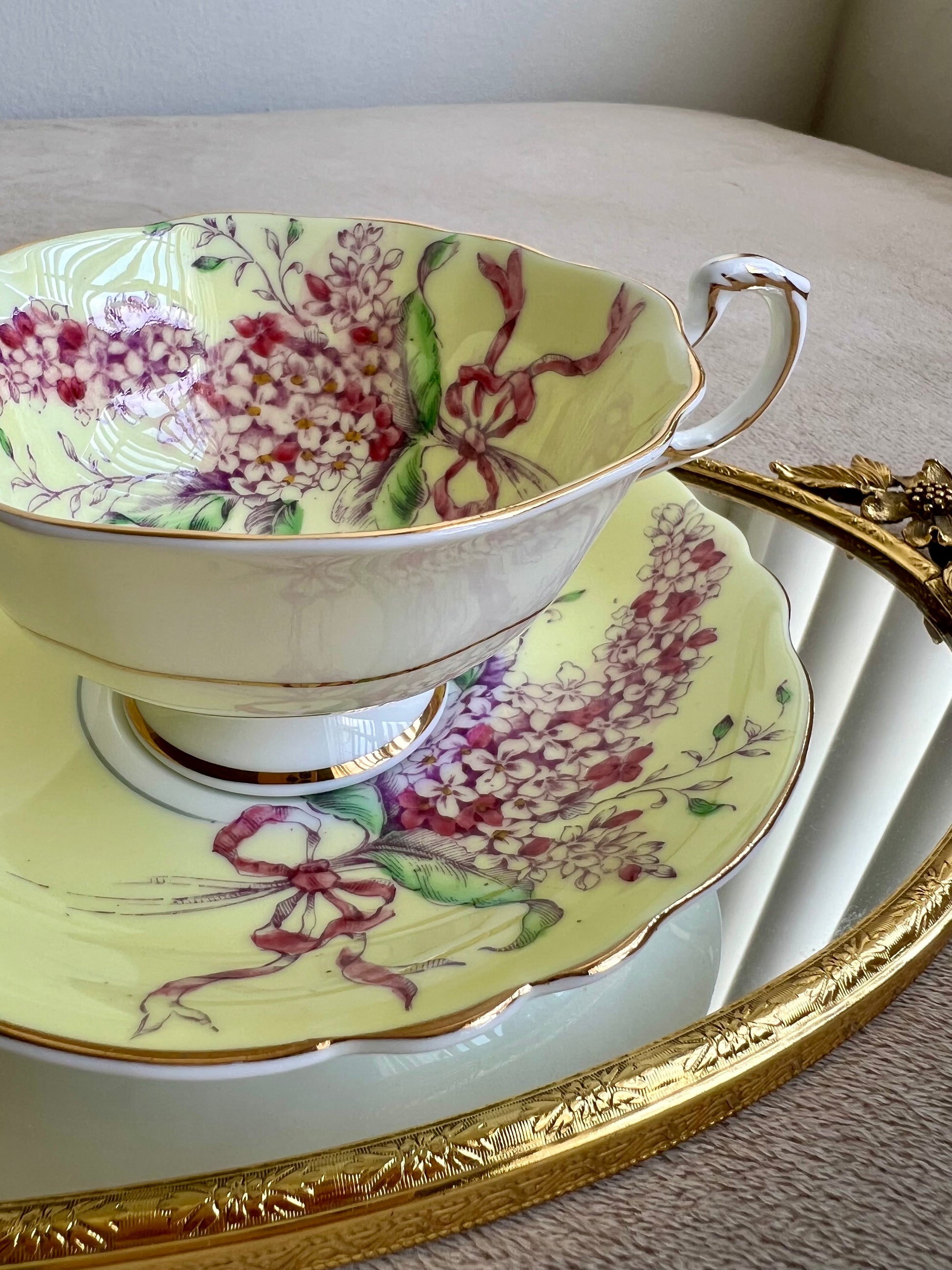 Beautiful English bone china vintage Paragon double warrant Lilac teacup and saucer. Yellow with purple lilacs and pink ribbon. Gold trim. Excellent condition.