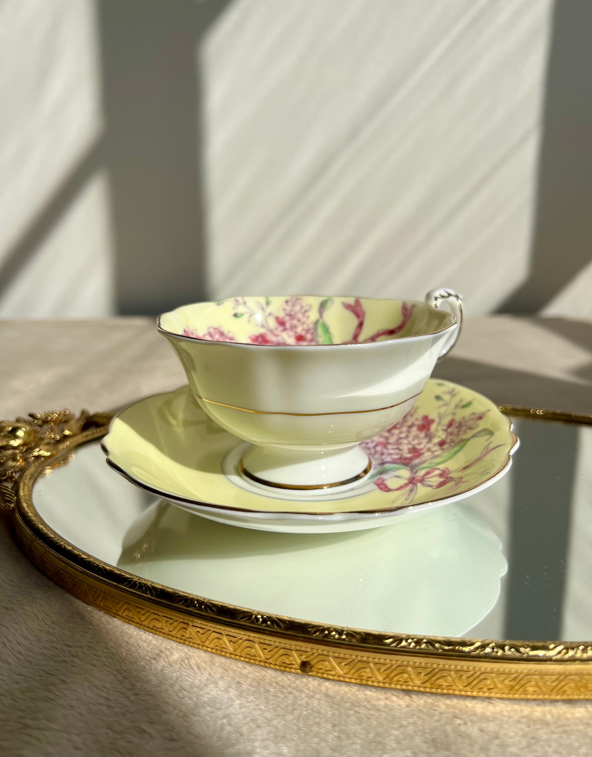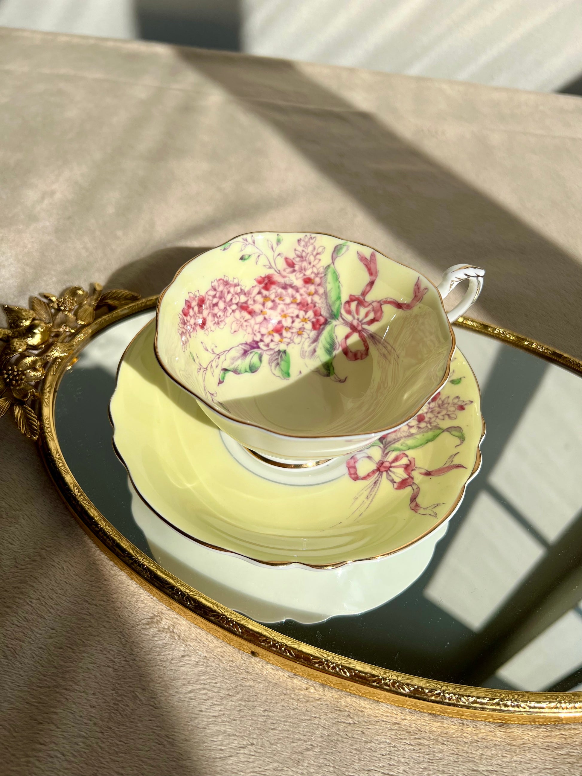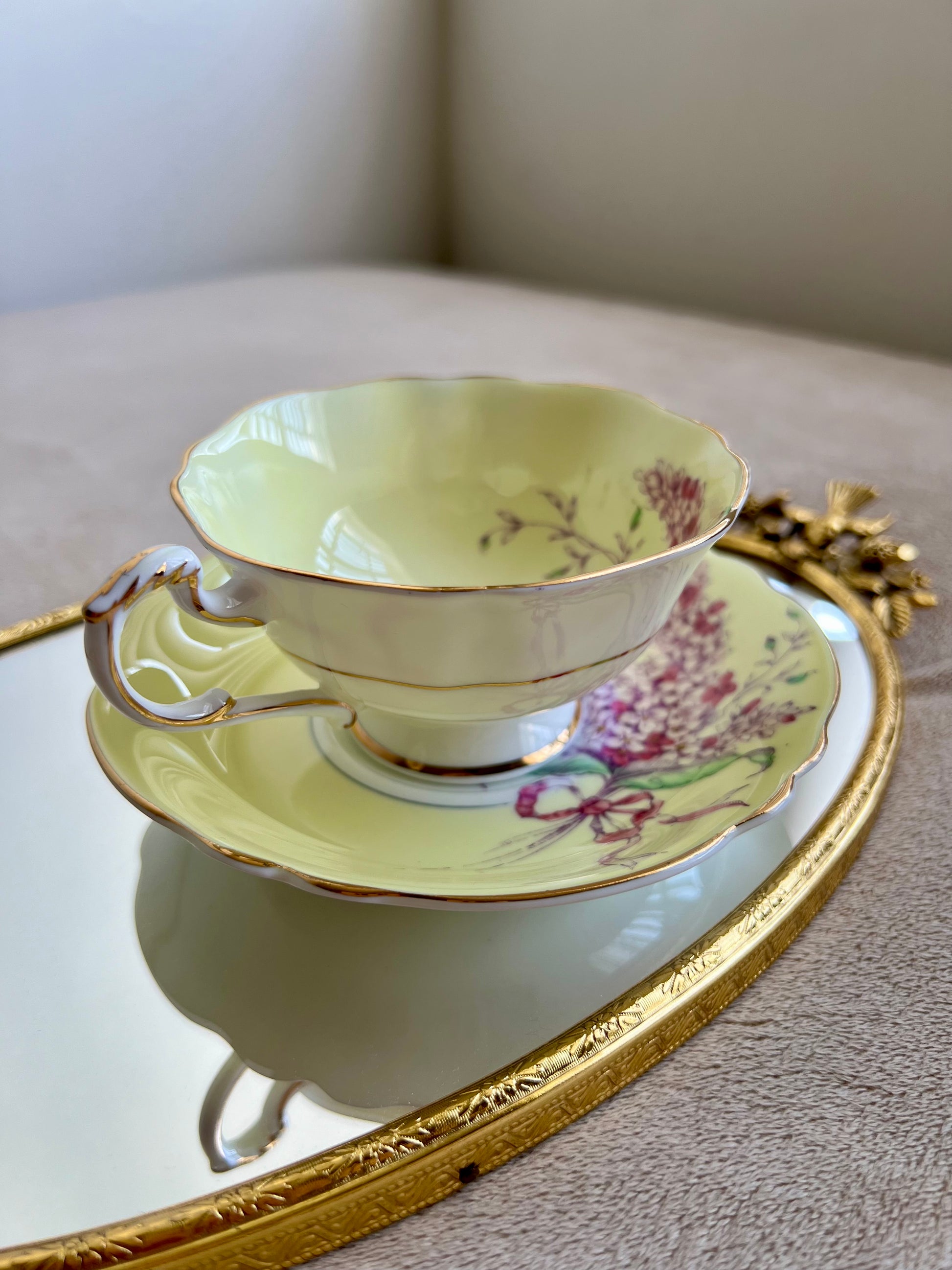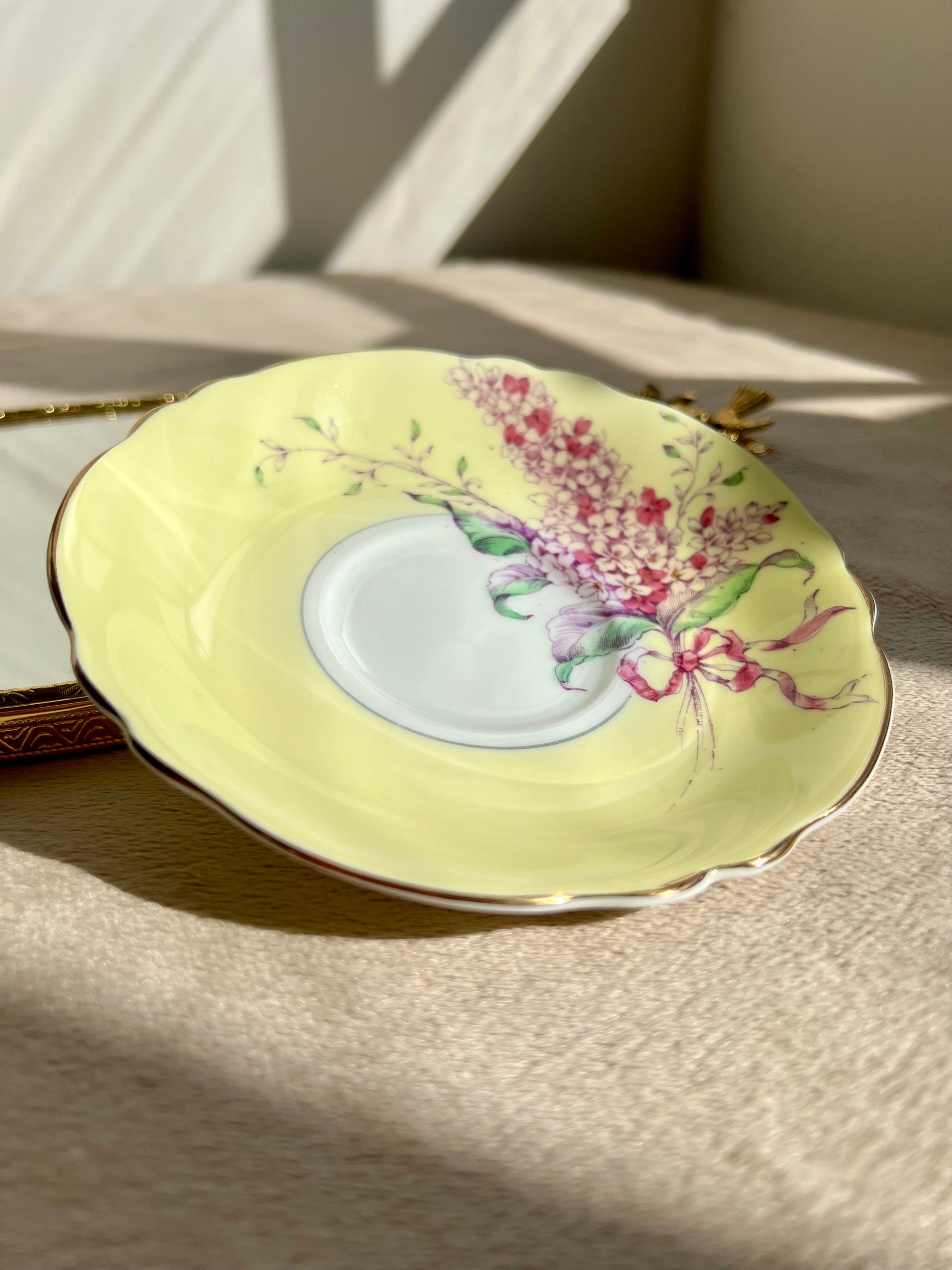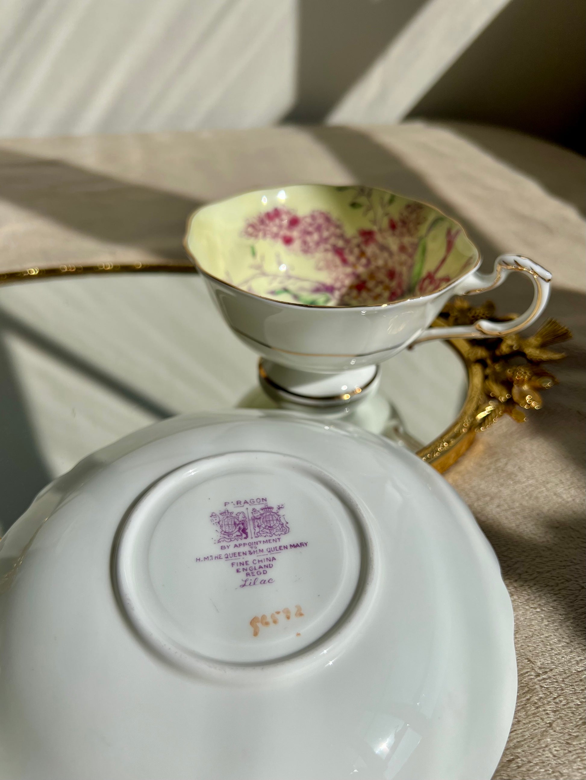 Beautiful English bone china vintage Paragon double warrant Lilac teacup and saucer. Yellow with purple lilacs and pink ribbon. Gold trim. Excellent condition.