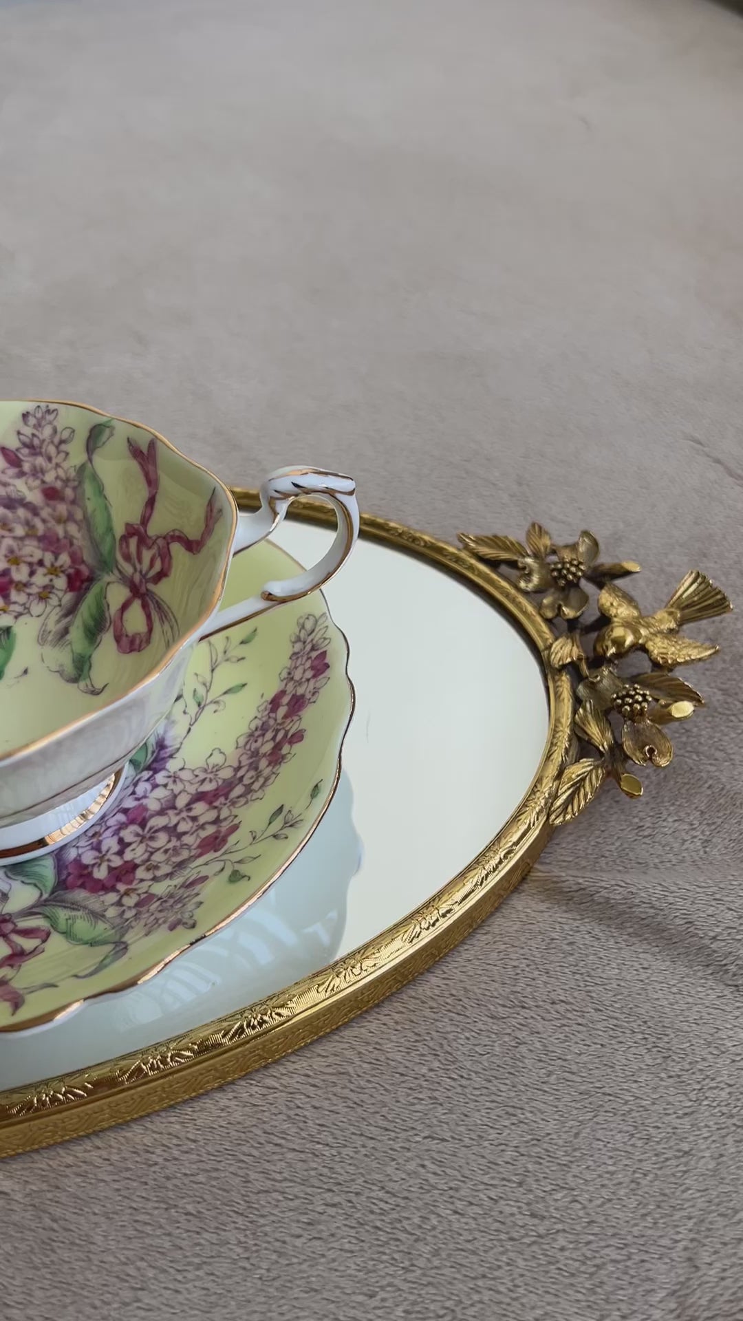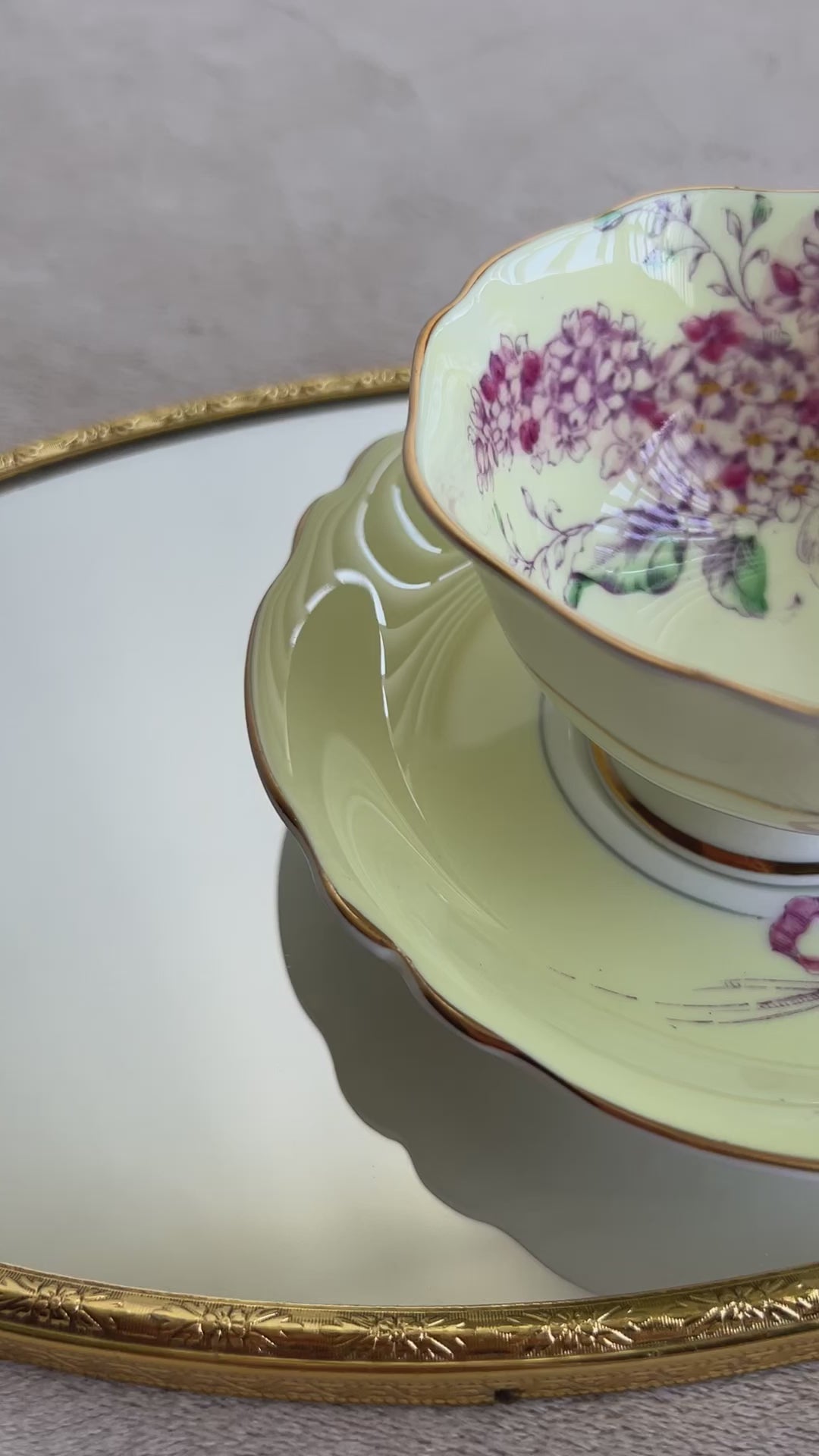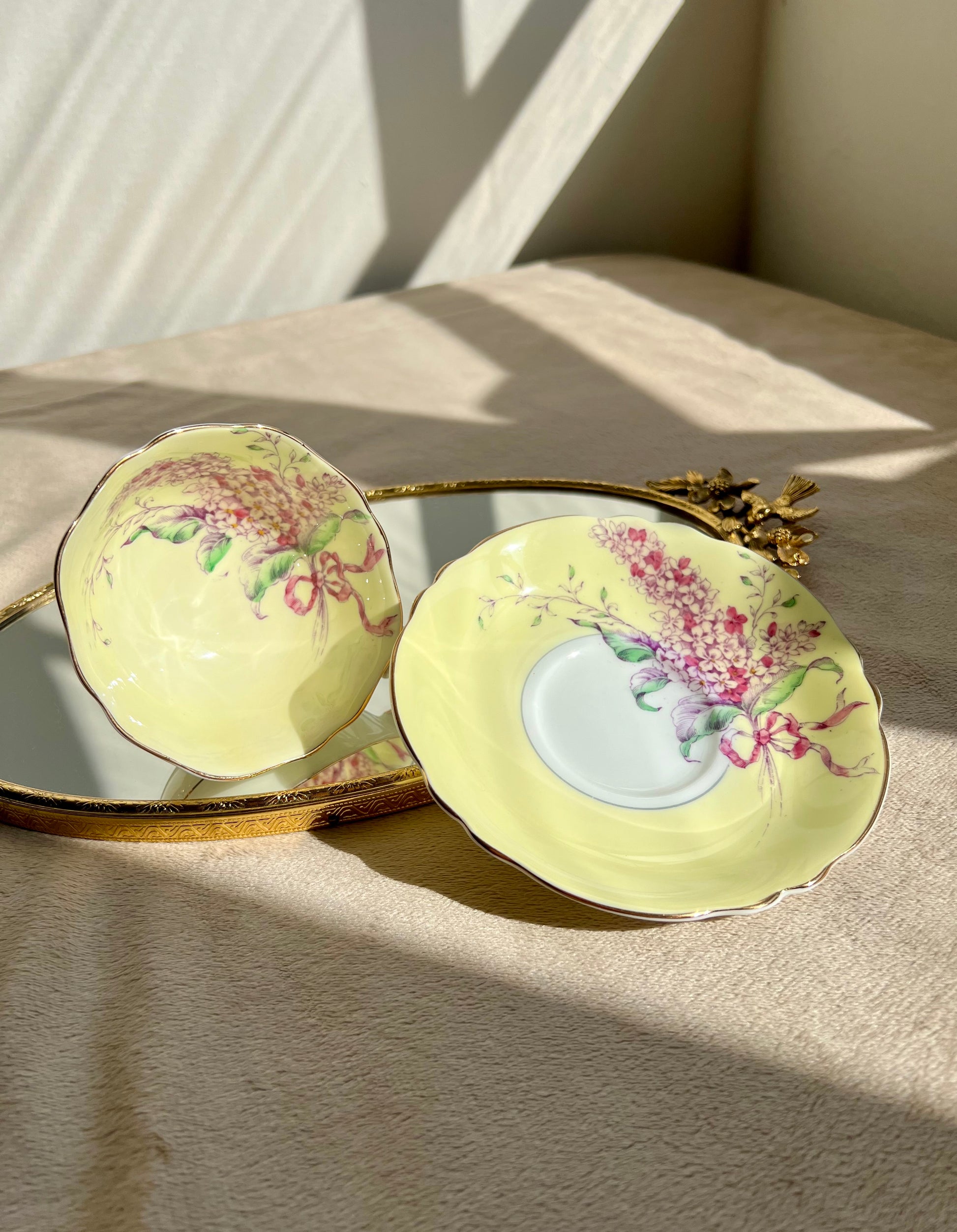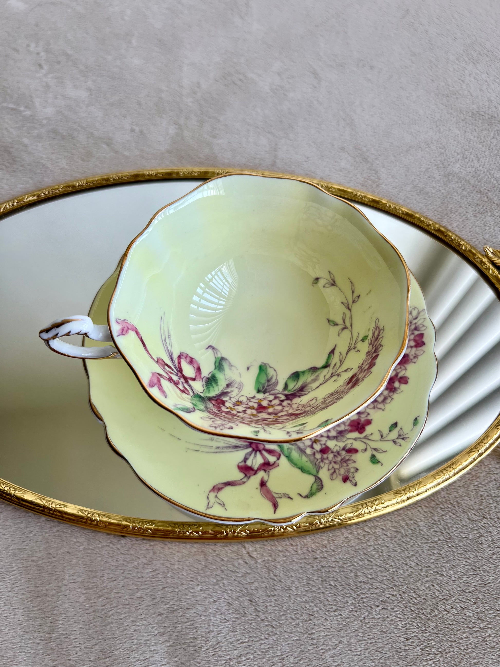 Beautiful English bone china vintage Paragon double warrant Lilac teacup and saucer. Yellow with purple lilacs and pink ribbon. Gold trim. Excellent condition.