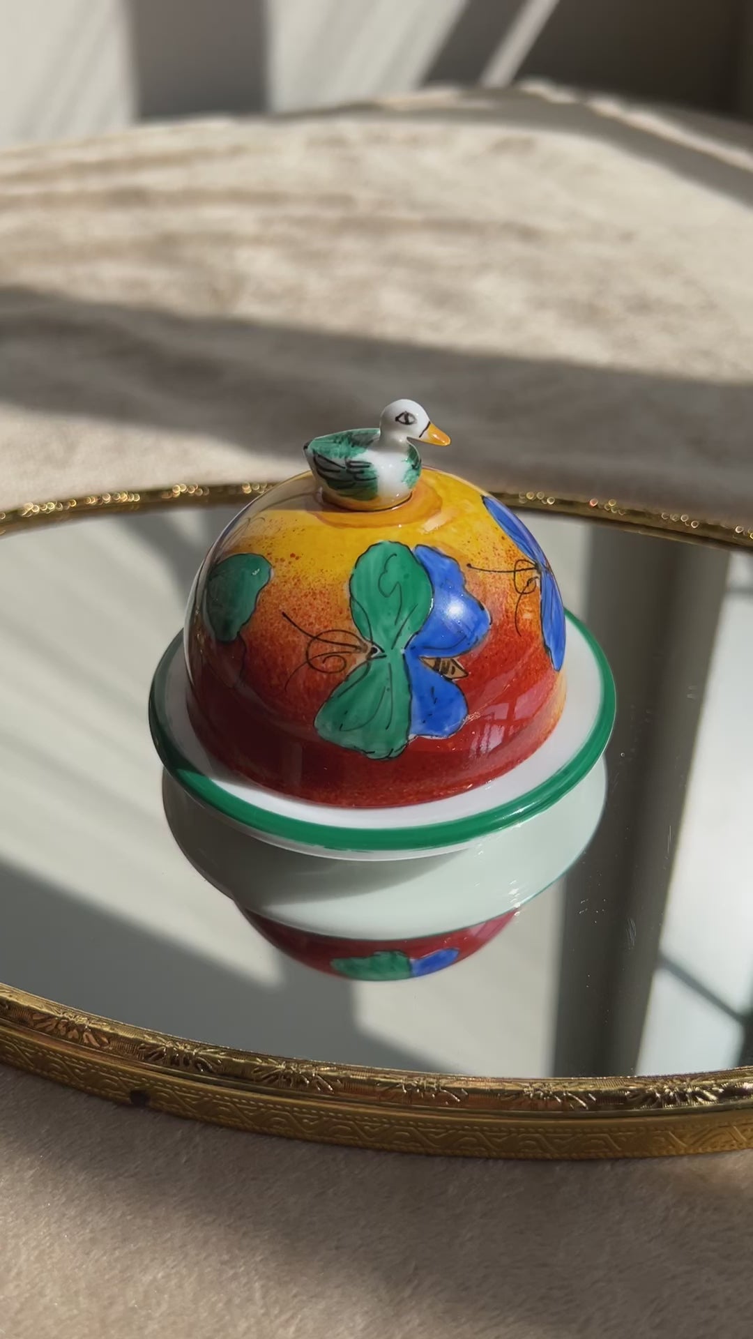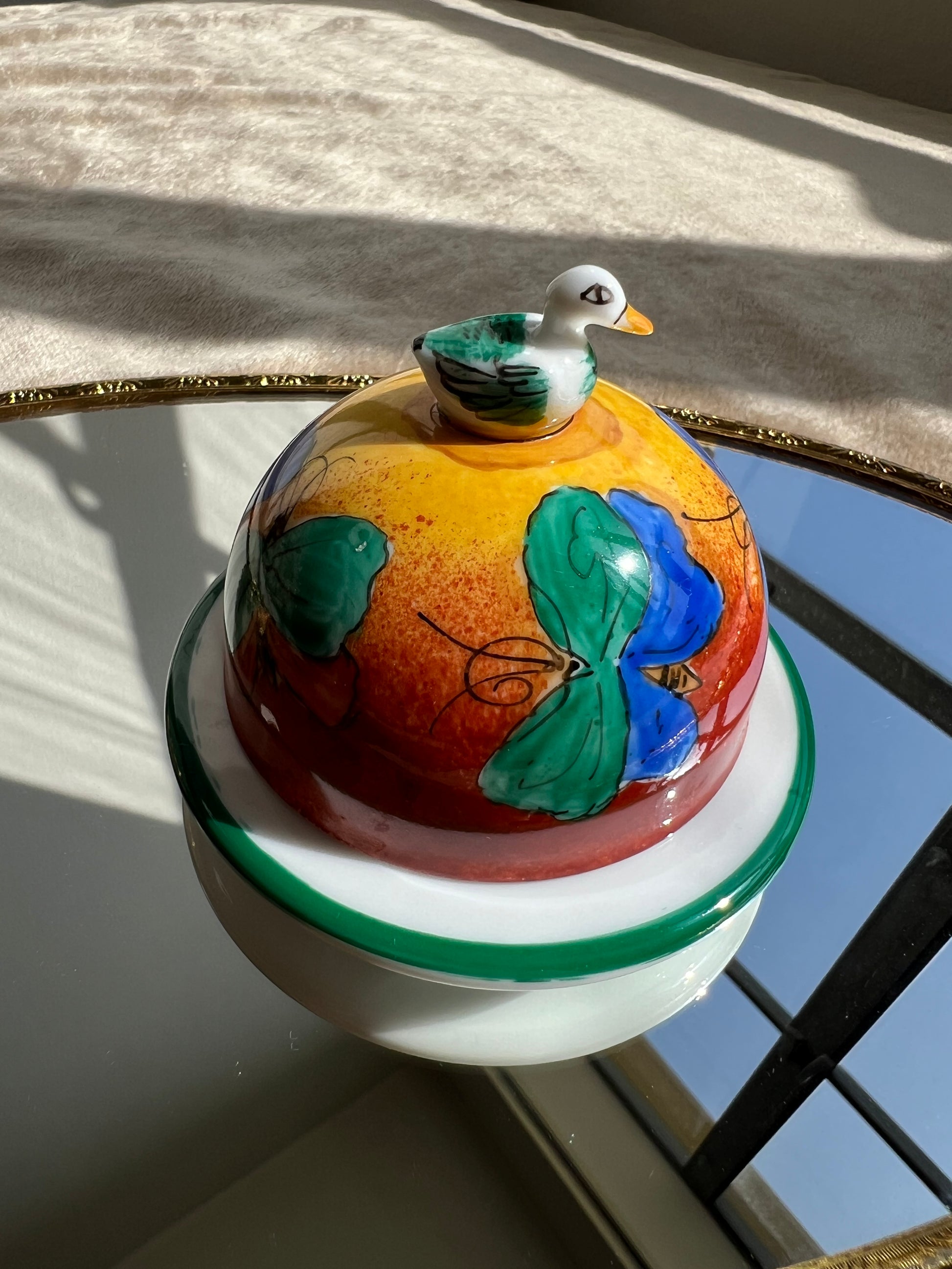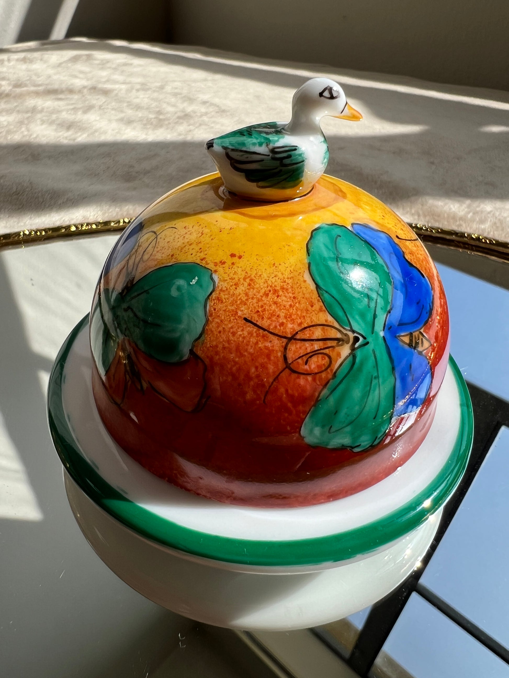Beautiful dome Limoges porcelain butter dish with colorful butterfly decoration. It gives your table a jewel-like look. There is also a hand-decorated duck on top of the lid. The butter dish is in excellent condition. No cracks, or damage on it. Hand wash recommended. Made in France.