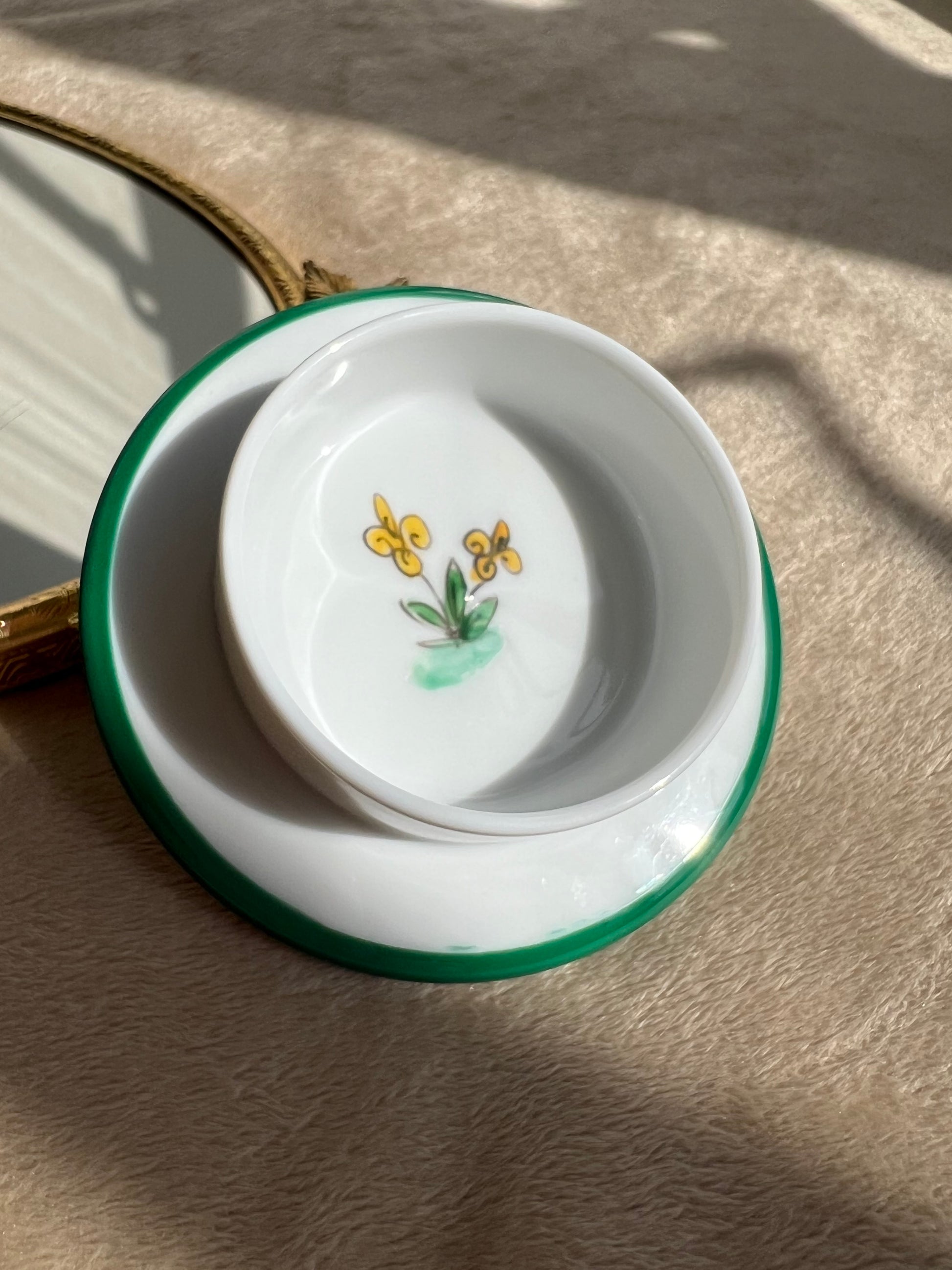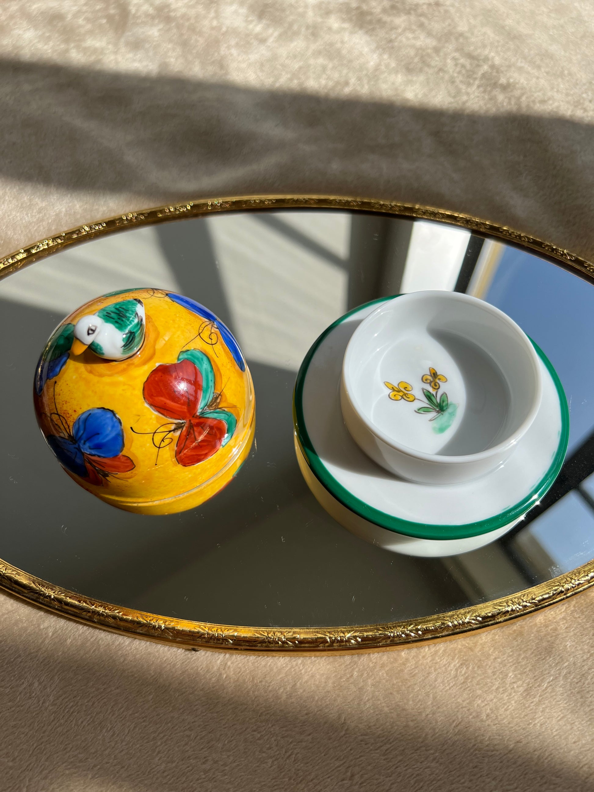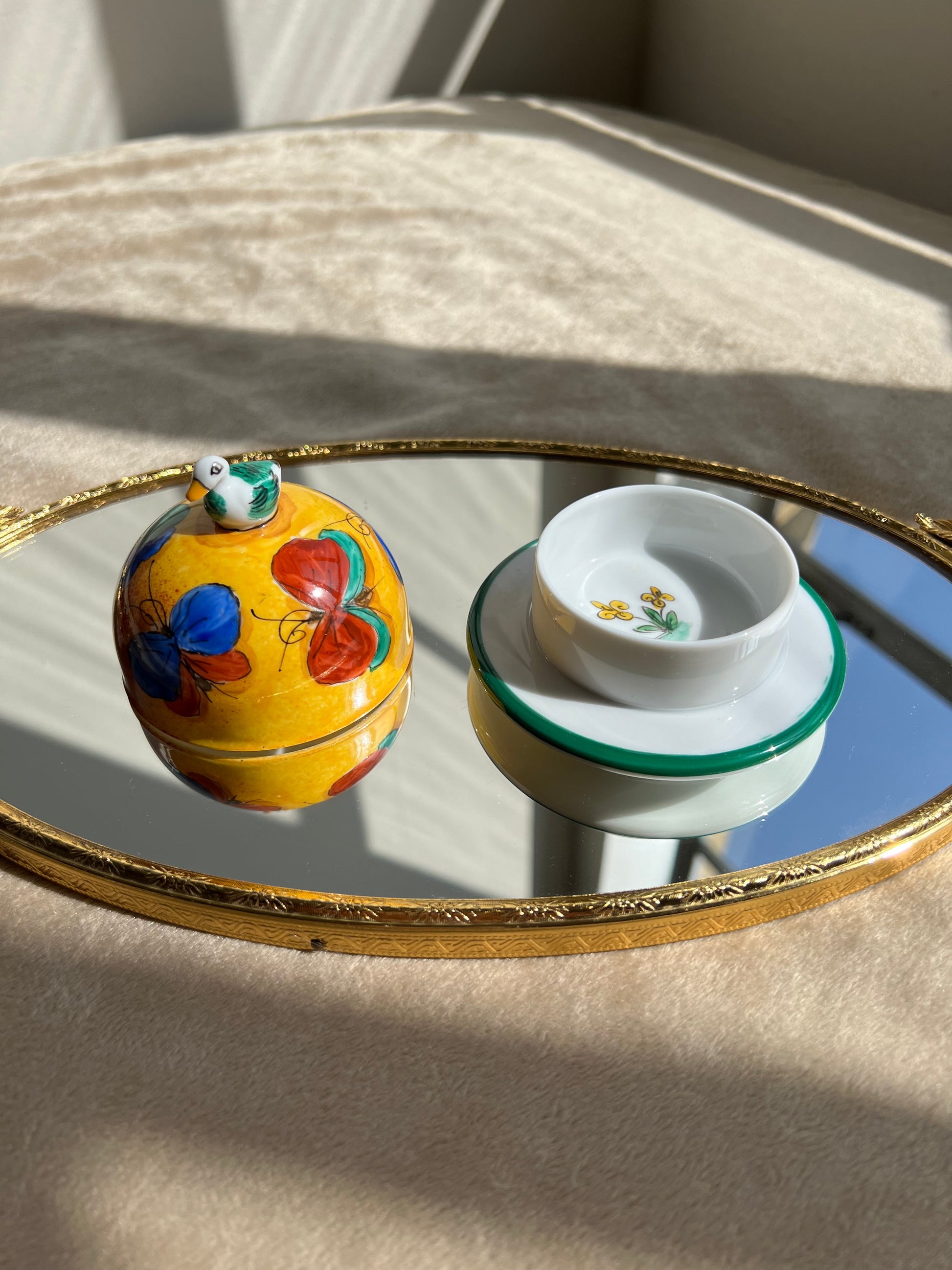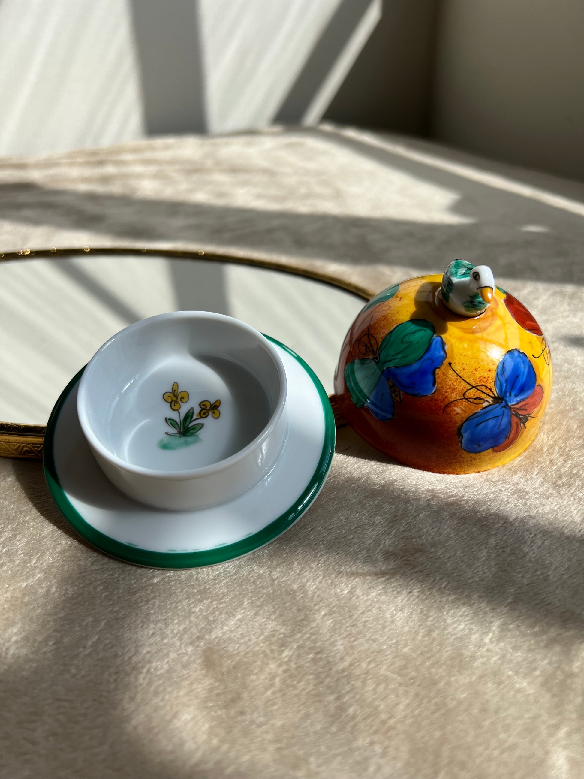 Beautiful dome Limoges porcelain butter dish with colorful butterfly decoration. It gives your table a jewel-like look. There is also a hand-decorated duck on top of the lid. The butter dish is in excellent condition. No cracks, or damage on it. Hand wash recommended. Made in France.