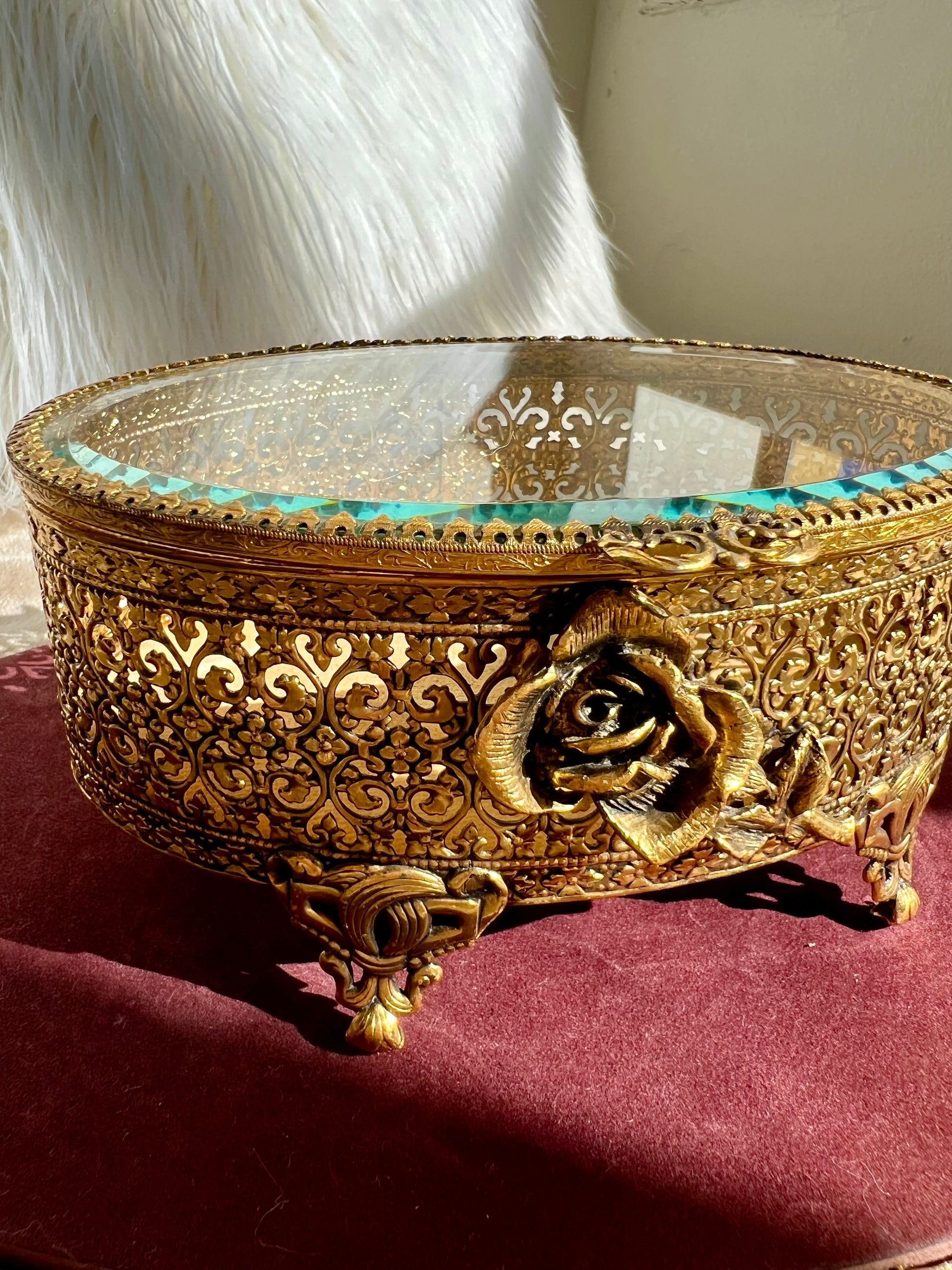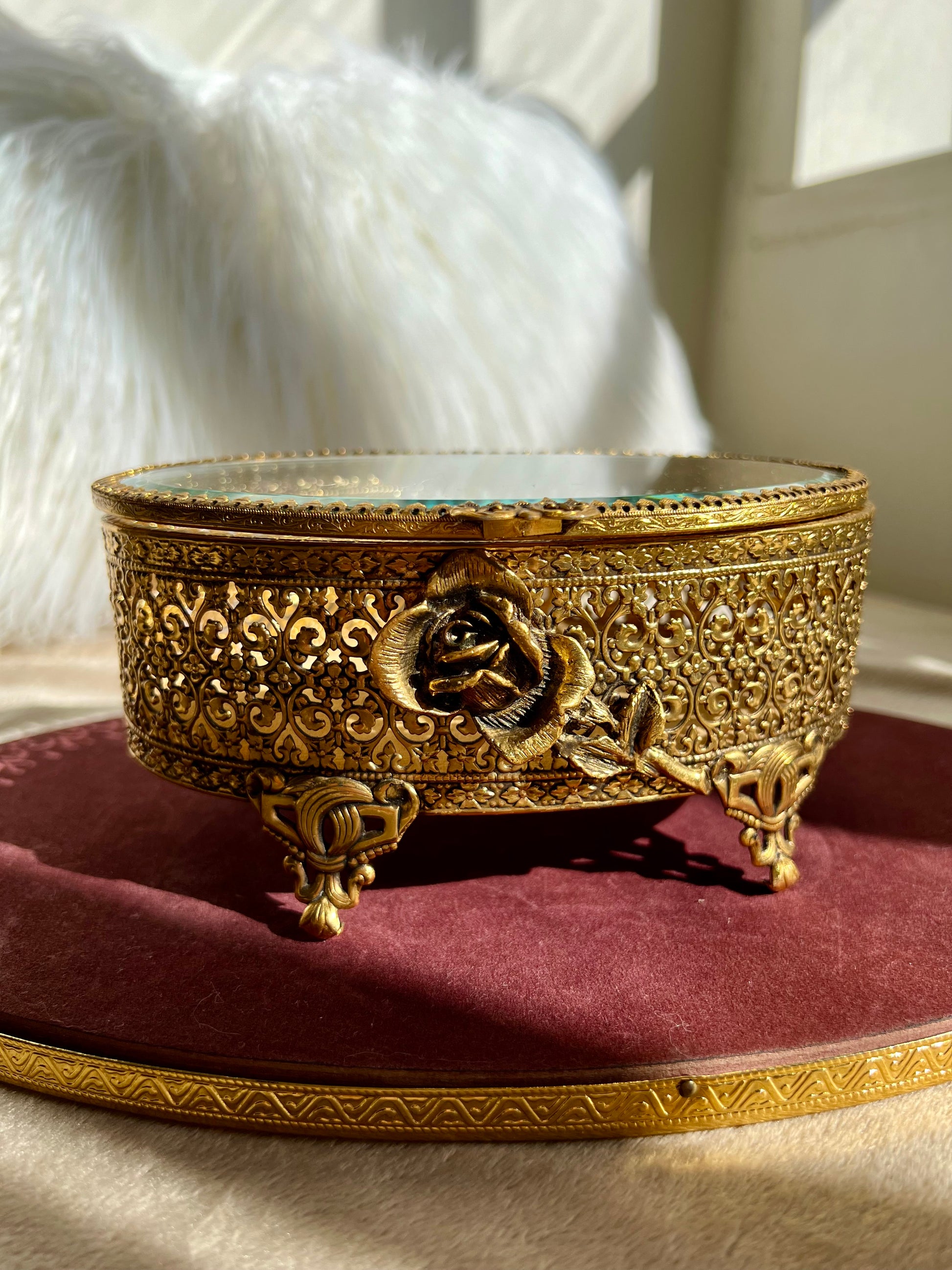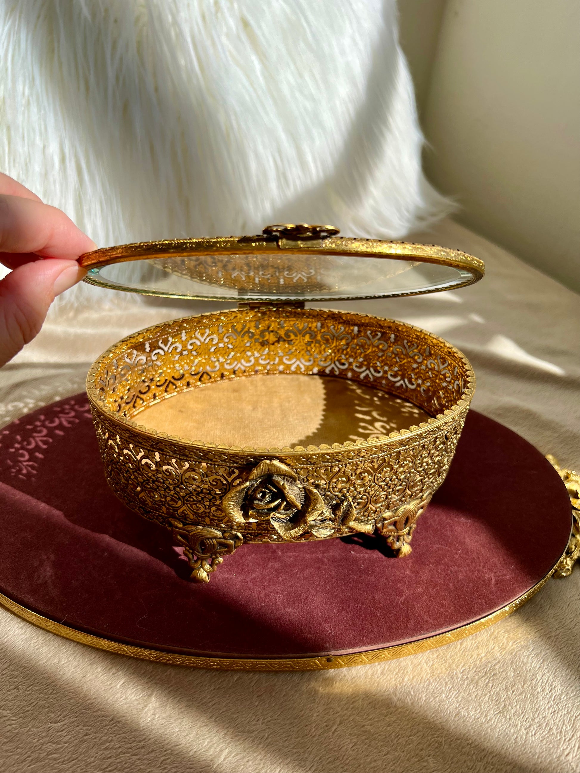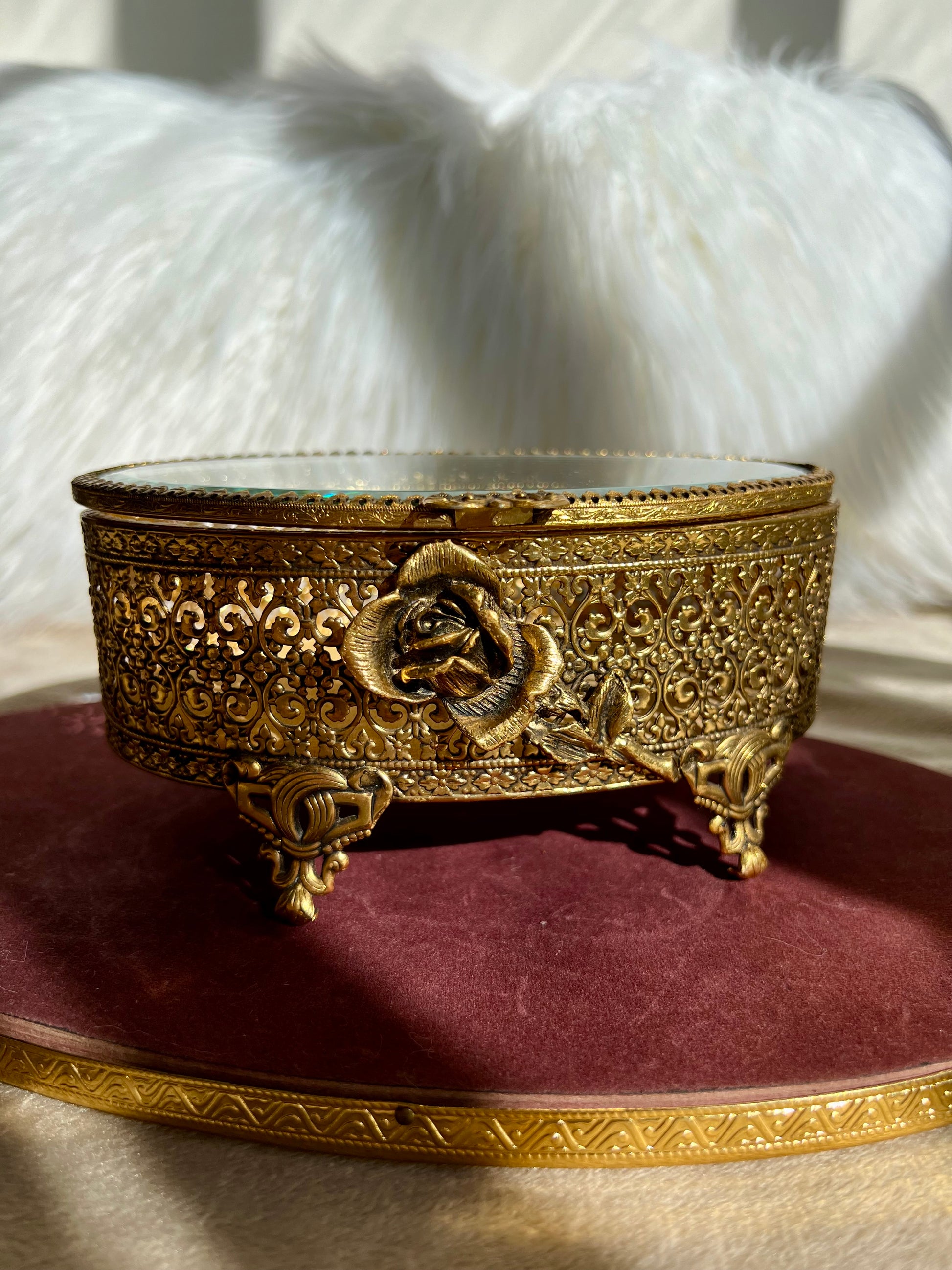 New York StyleBuilt Vintage Jewelry or Trinket Box, Oval Shaped Glass Lid with Ornate Gold Rose