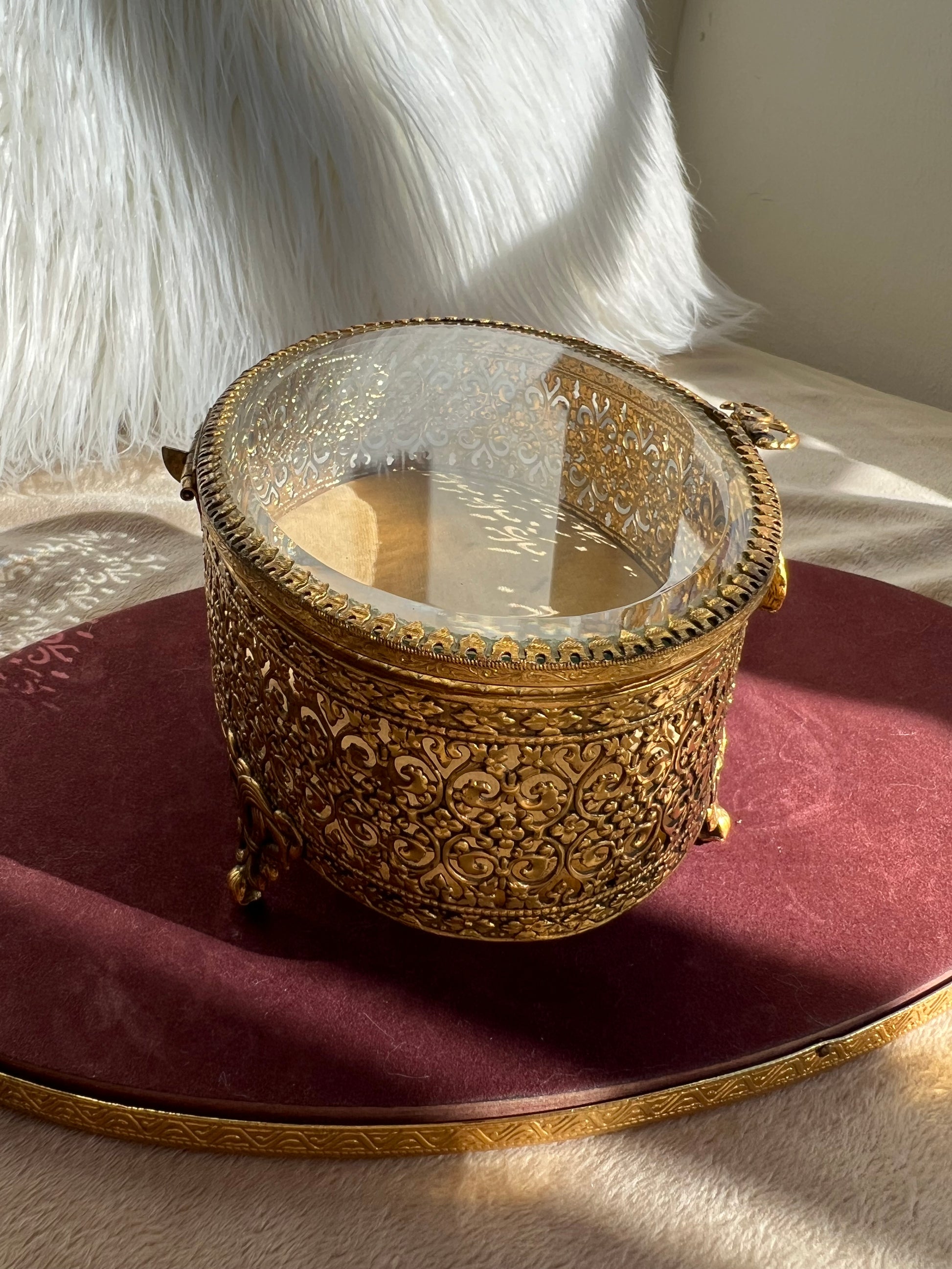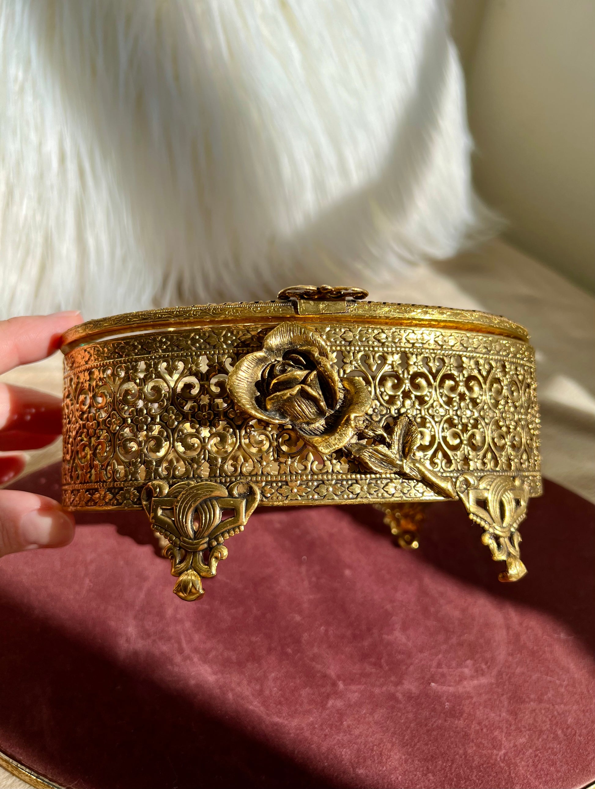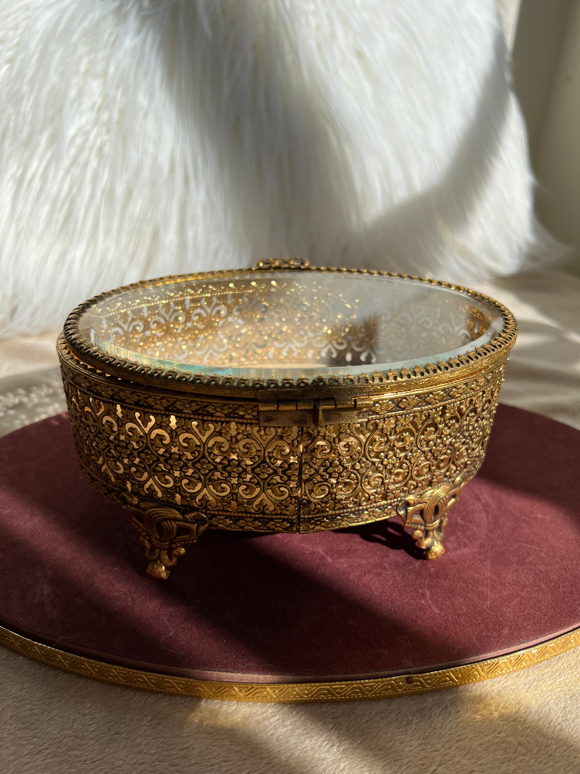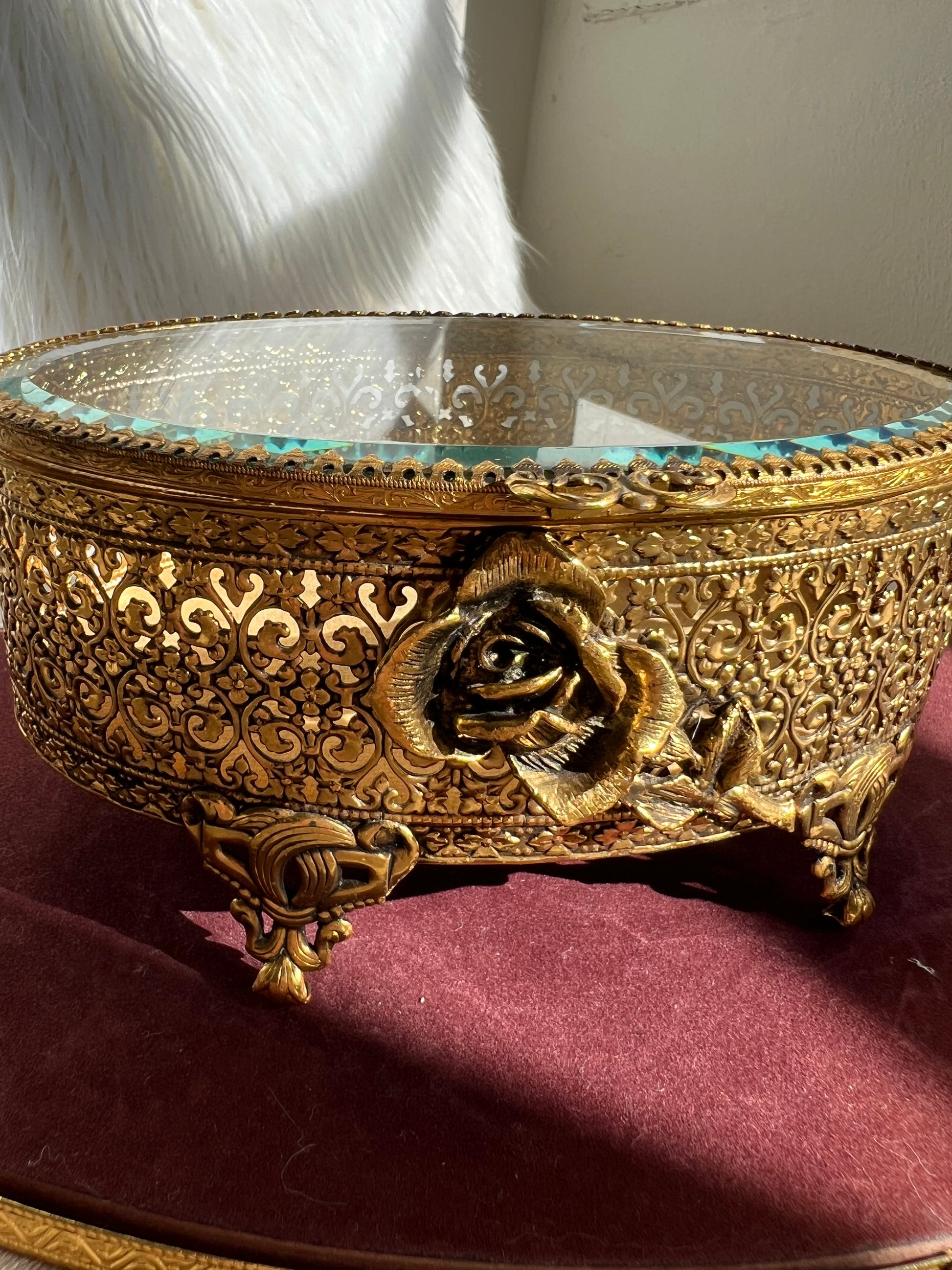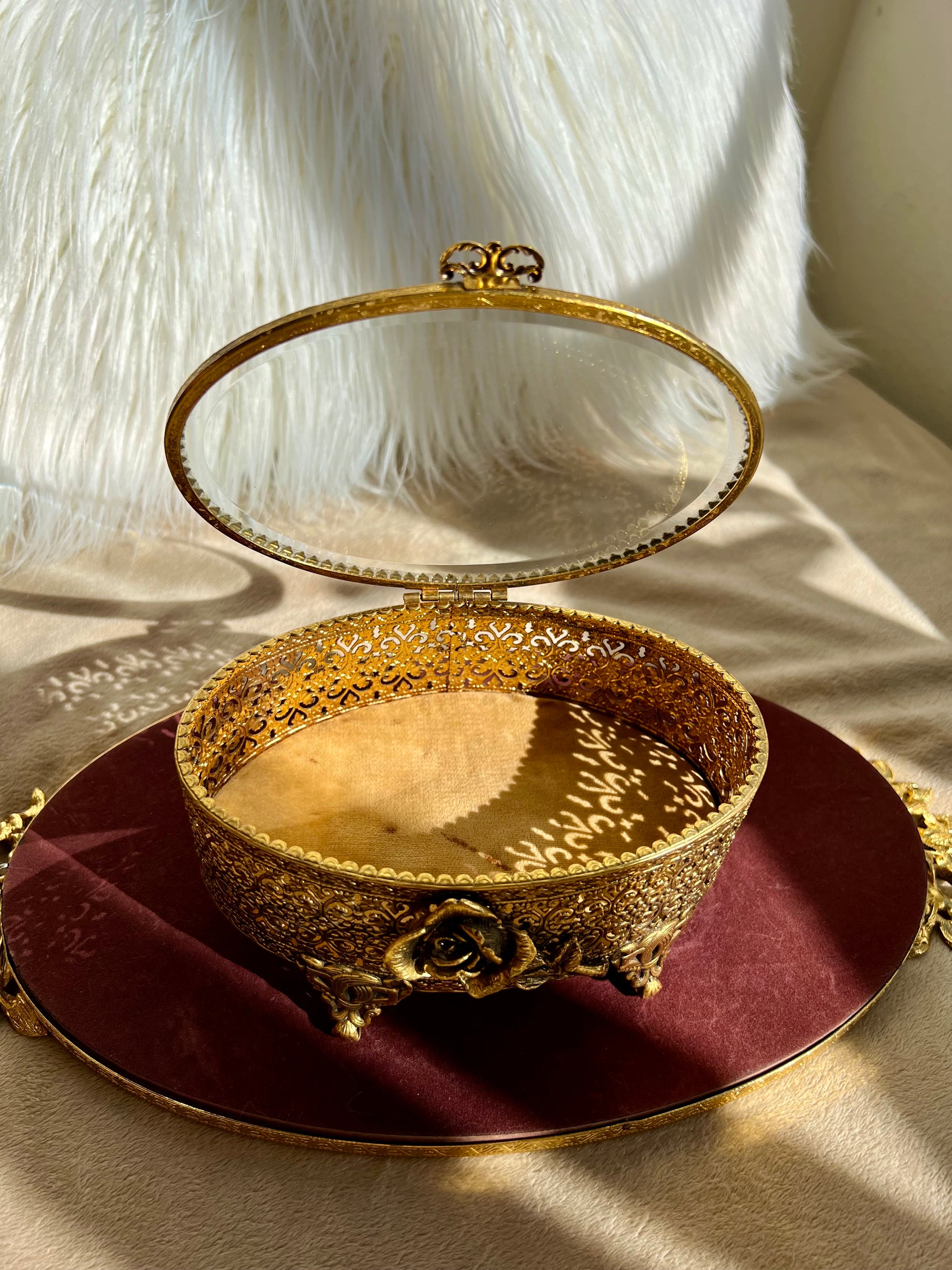 New York StyleBuilt Vintage Jewelry or Trinket Box, Oval Shaped Glass Lid with Ornate Gold Rose