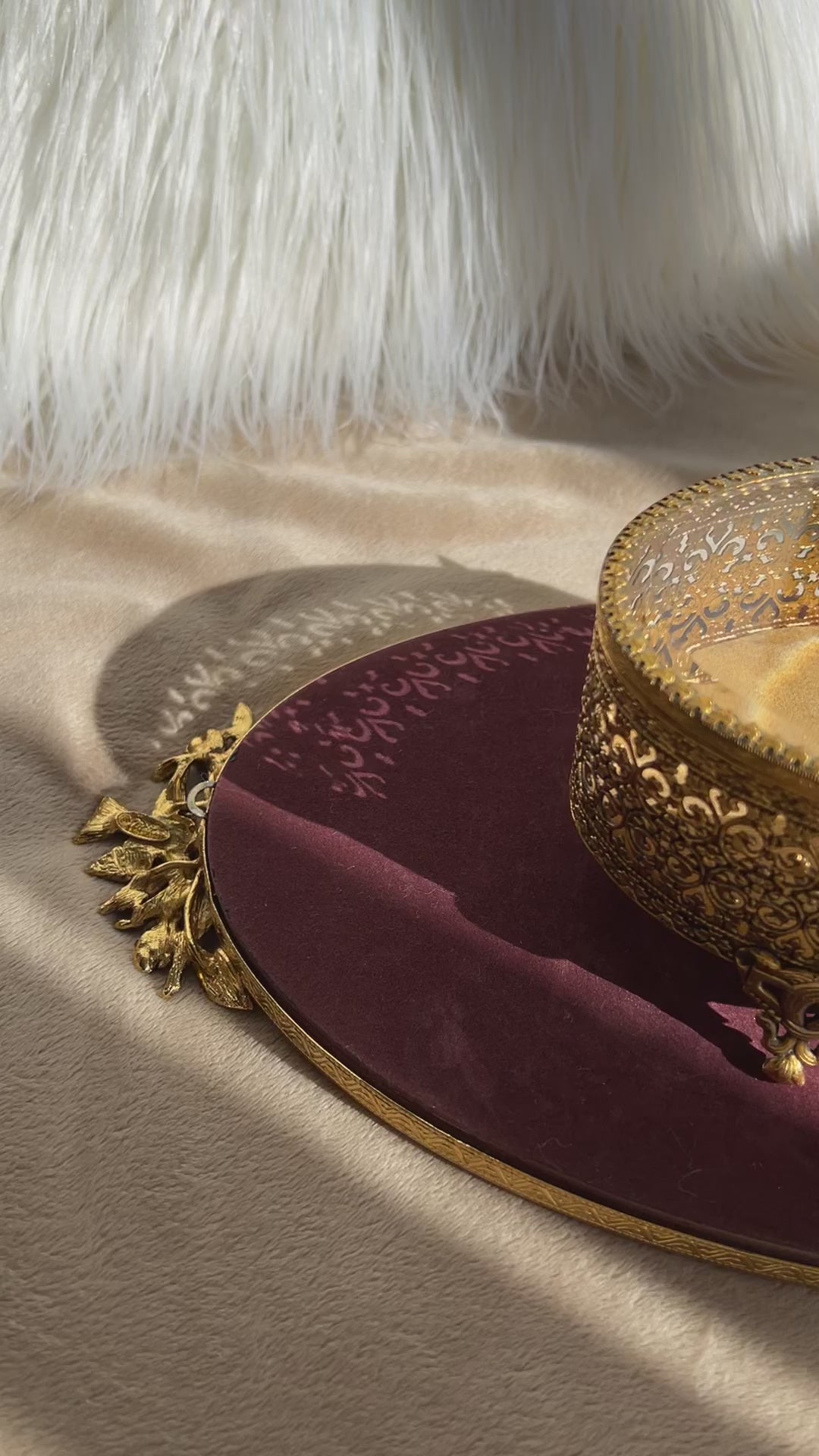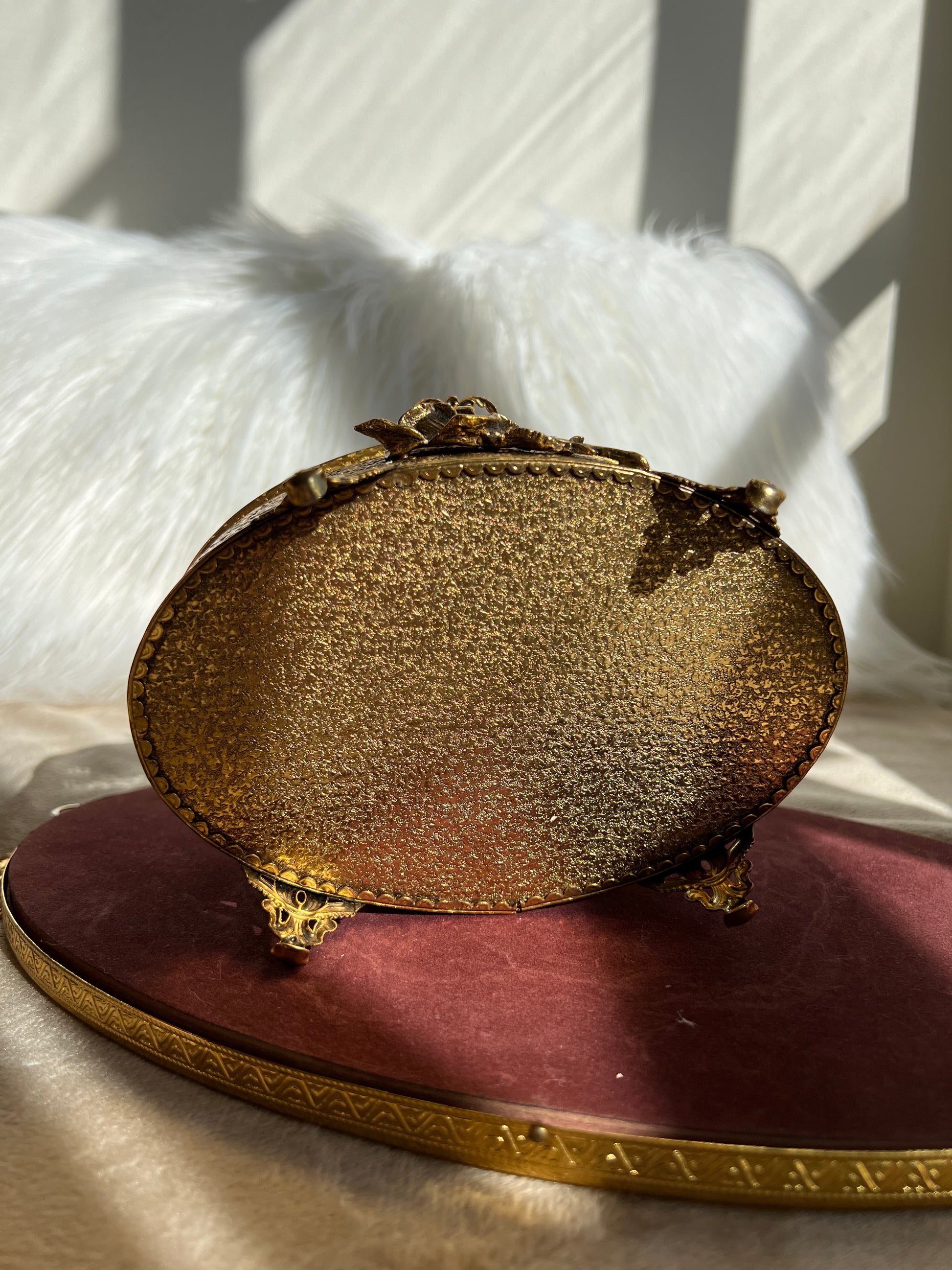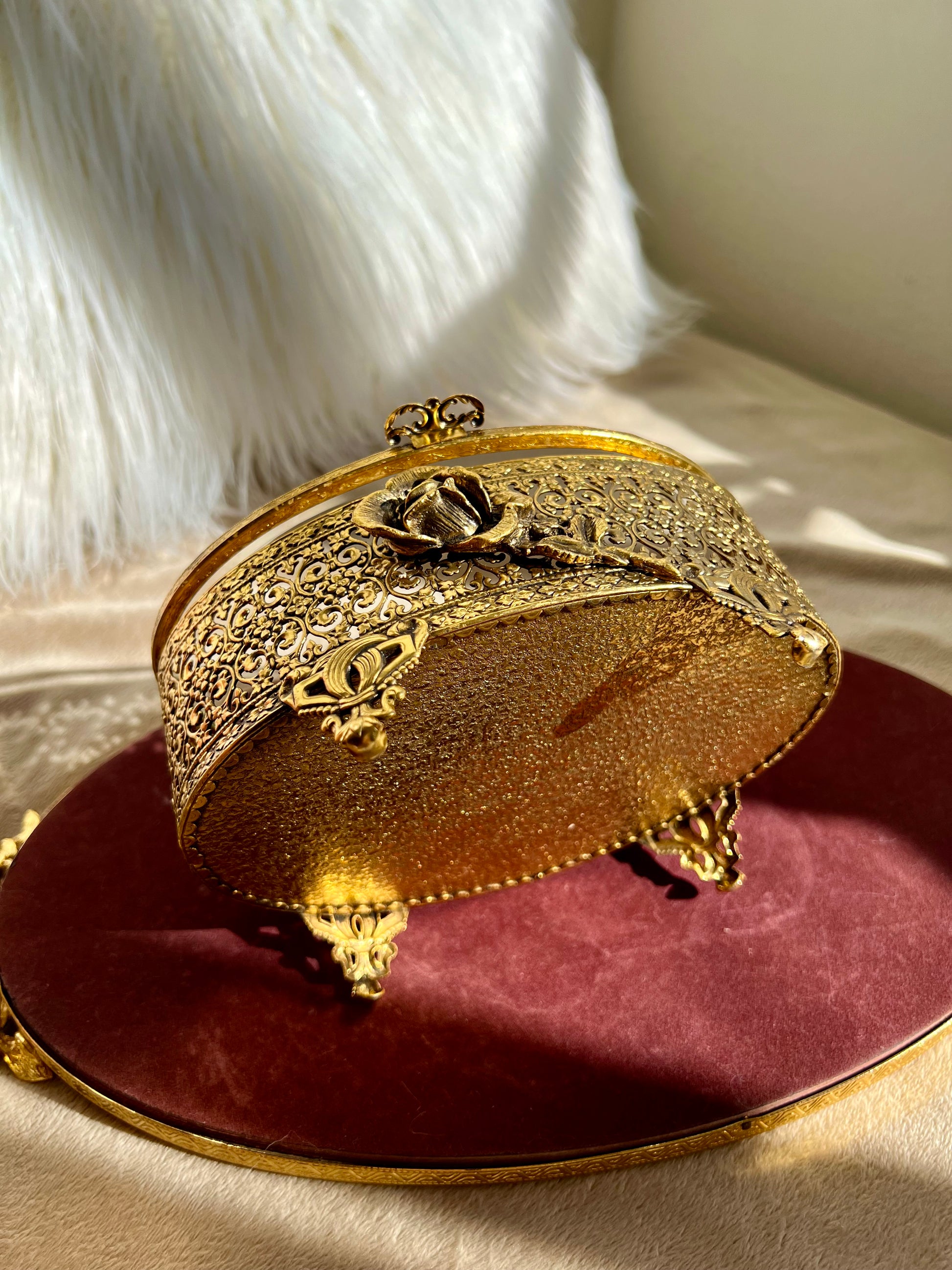 Beautiful Stylebuilt Accessories (from New York) vintage oval casket jewelry box with a gold toned rose decoration outside. No cracks or chips to the glass. The trinket box is in very good condition. This is perfect for your living room, guest room or bathroom decor. There are only some stains on the inner plush cover.
