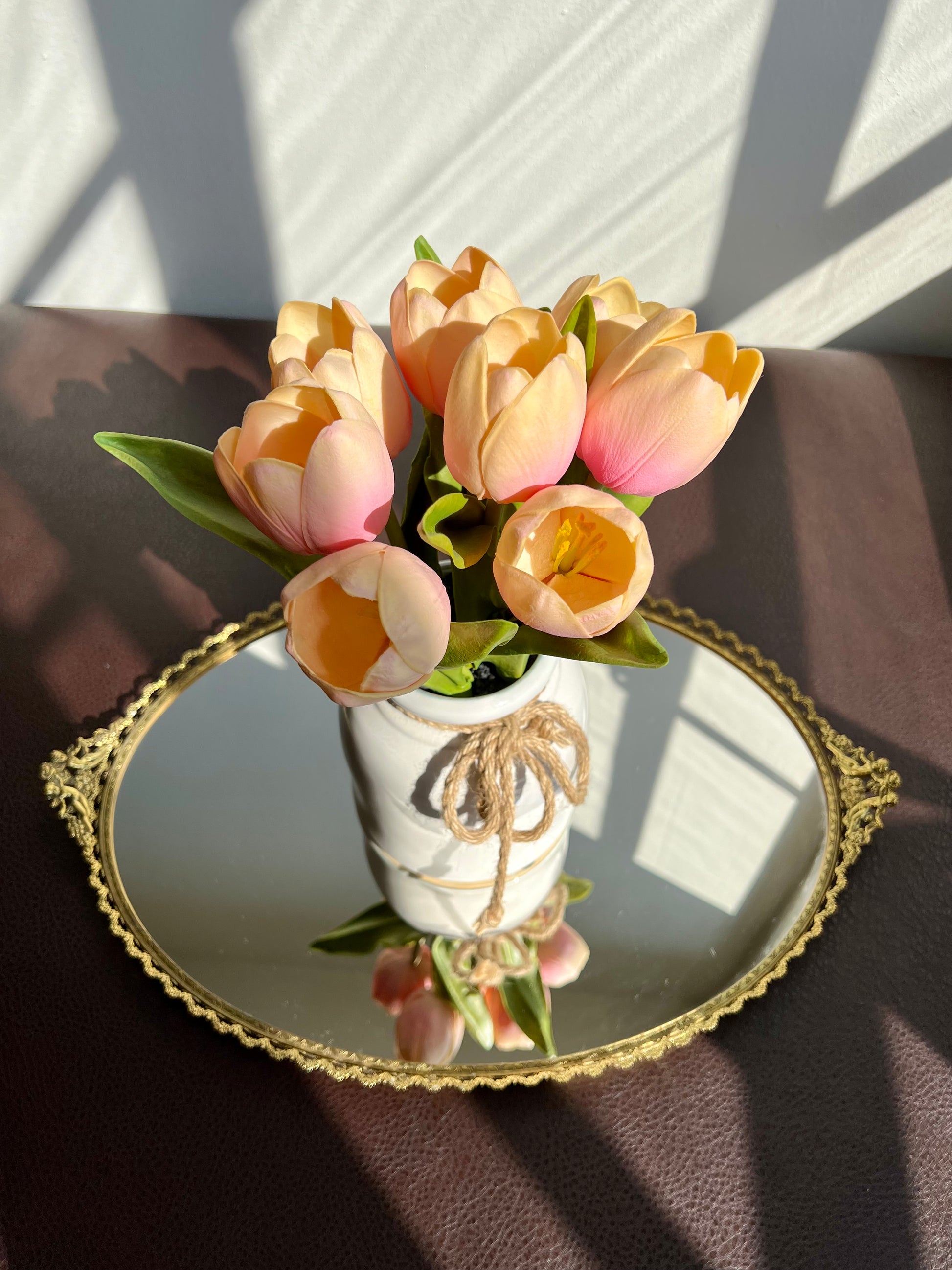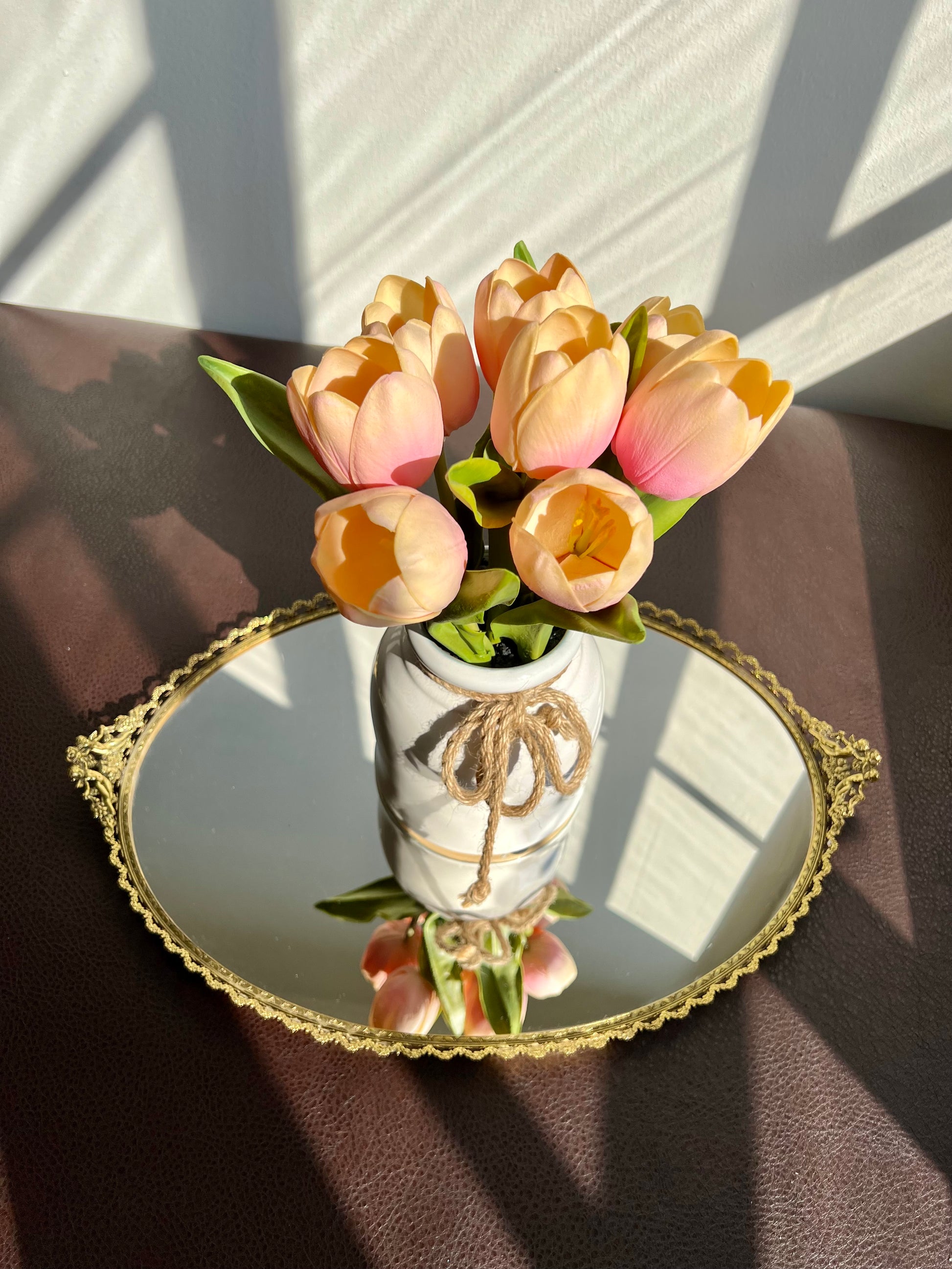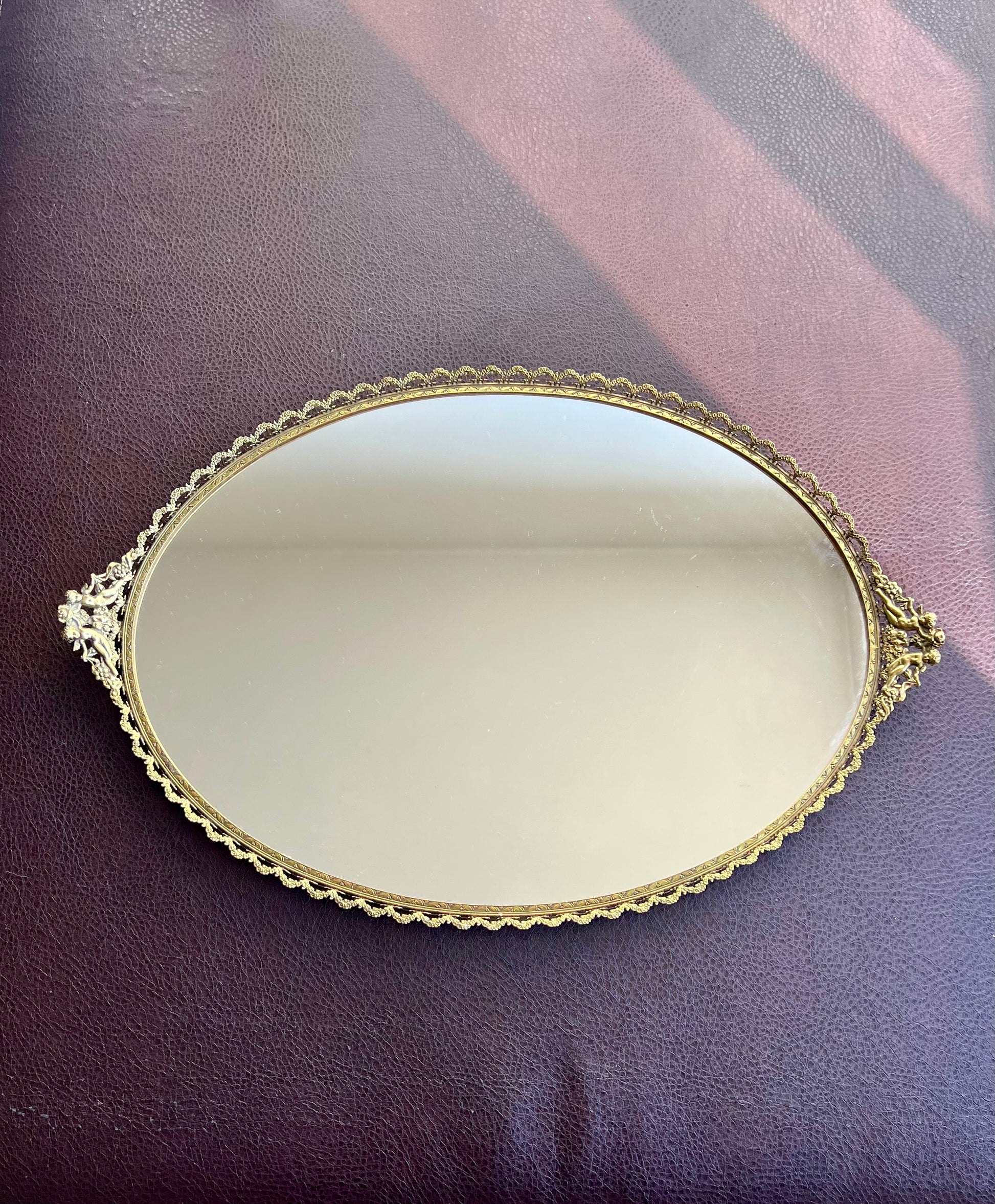 Beautiful gilded oval shaped metal framed mirror tray with 2 cherubs on the handles of both sides. The tray is in excellent condicion. The back of the mirror is covered with black plush-like material, which is also in very good condition. There are a few small, almost invisible scratches on the mirror, but otherwise the product is very nice.