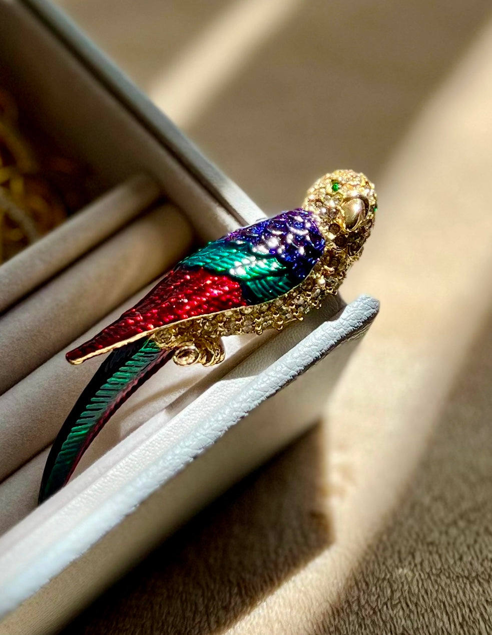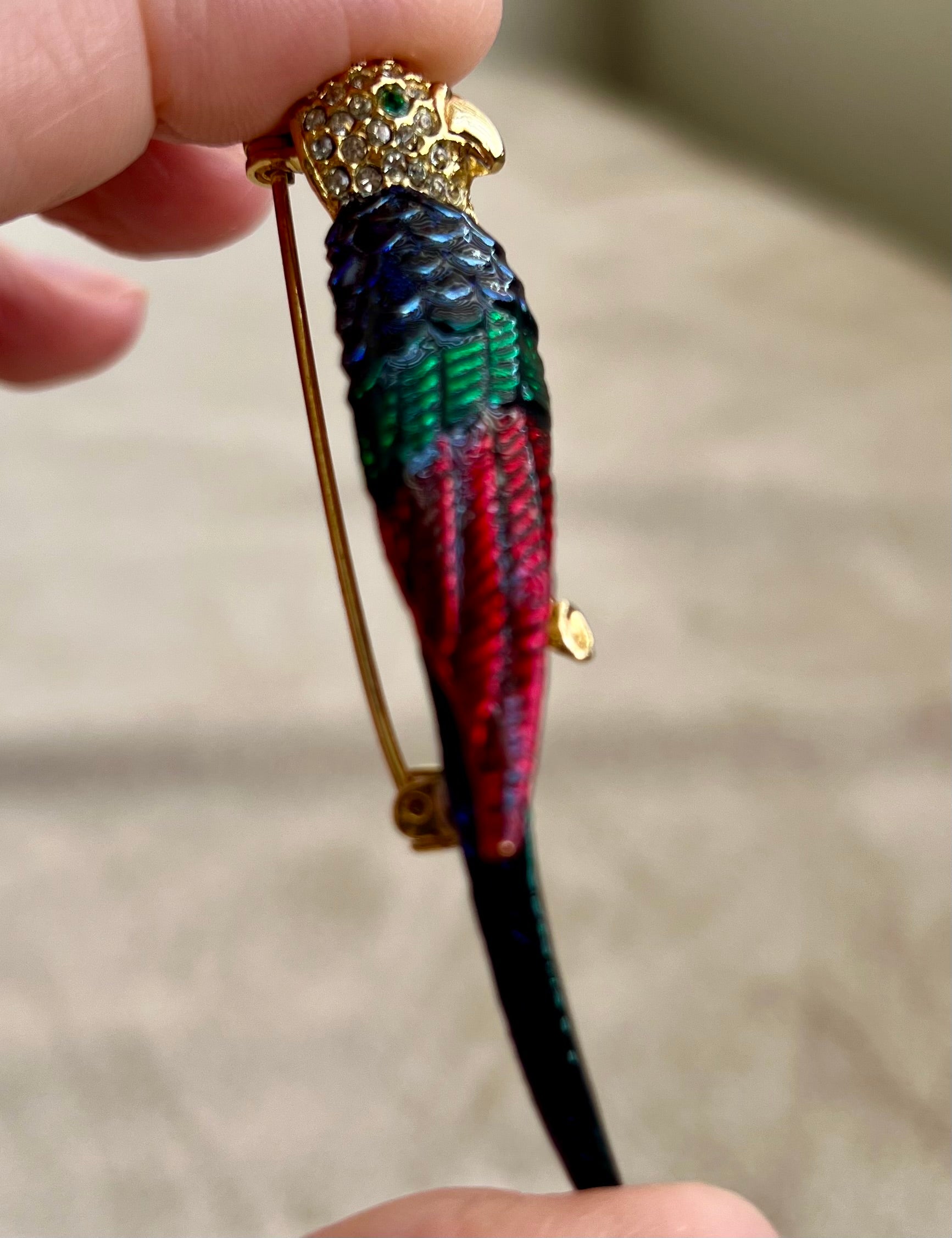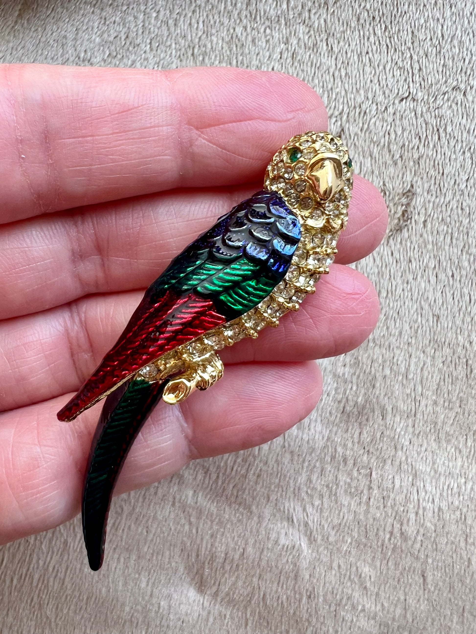 Fashion jewelry, beautiful parrot pin. Gold tone with rhinestones crystals on the head and body. Excellent condition.