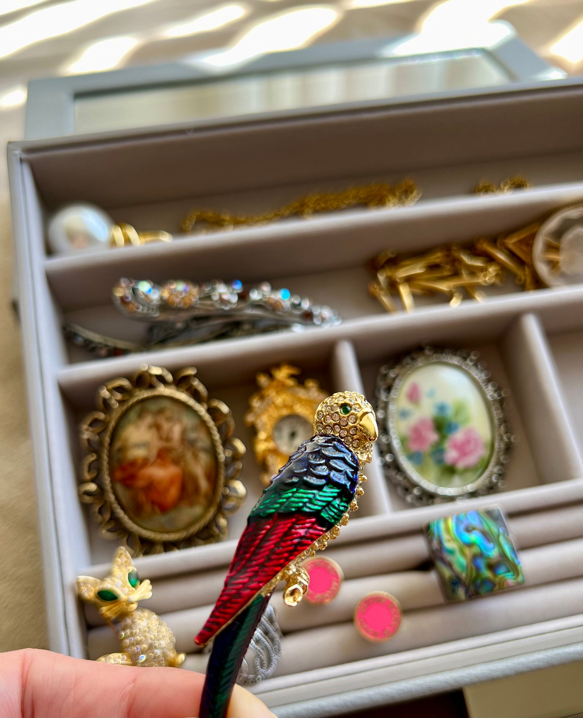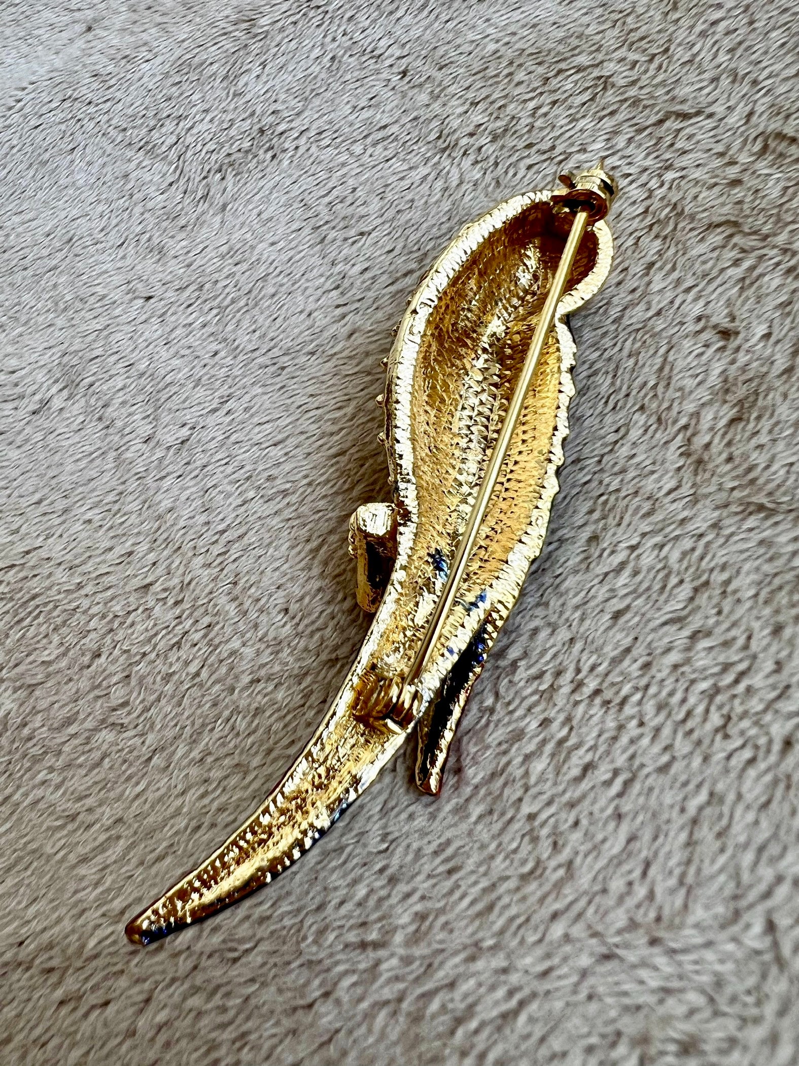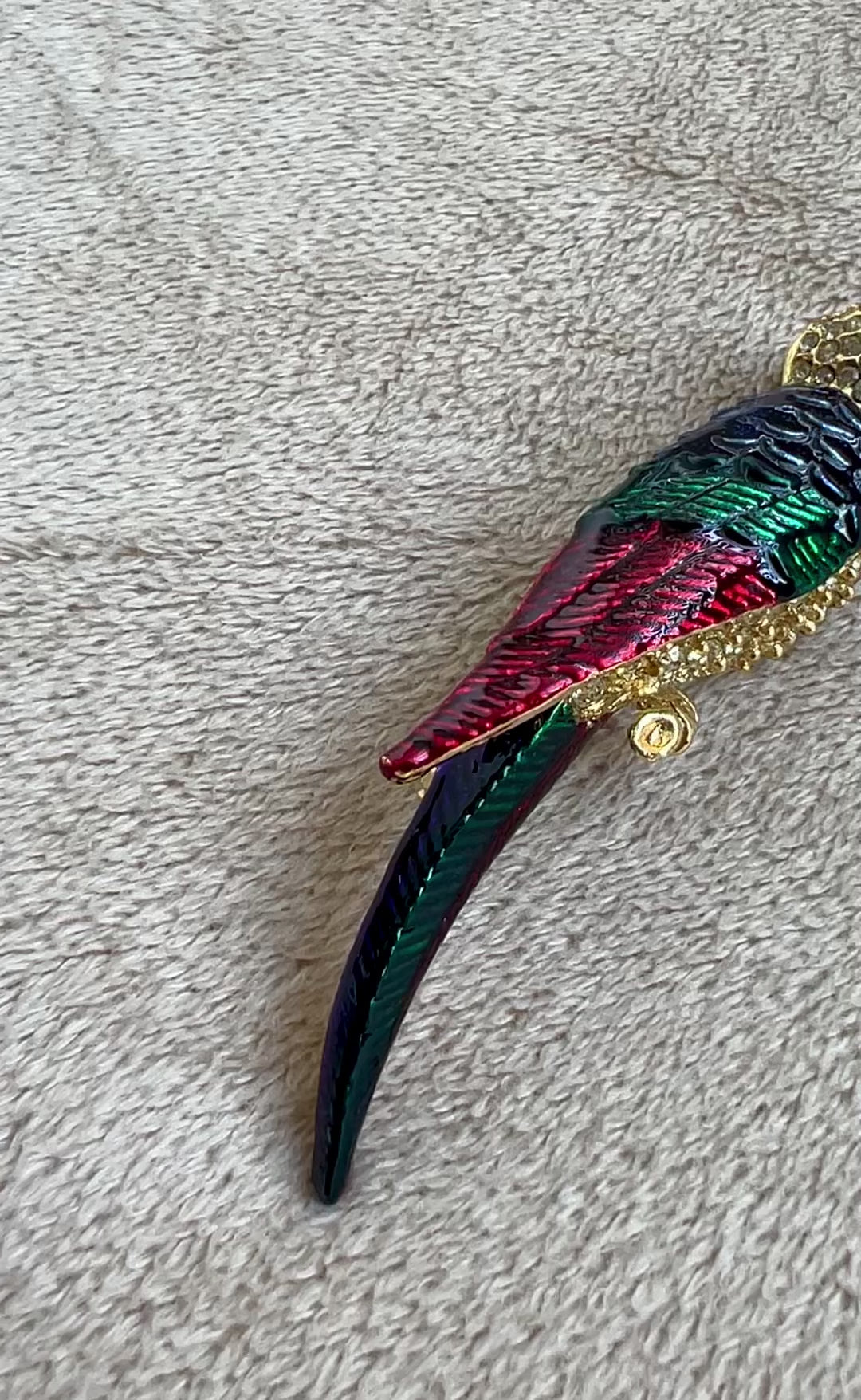 Fashion jewelry, beautiful parrot pin. Gold tone with rhinestones crystals on the head and body. Excellent condition.