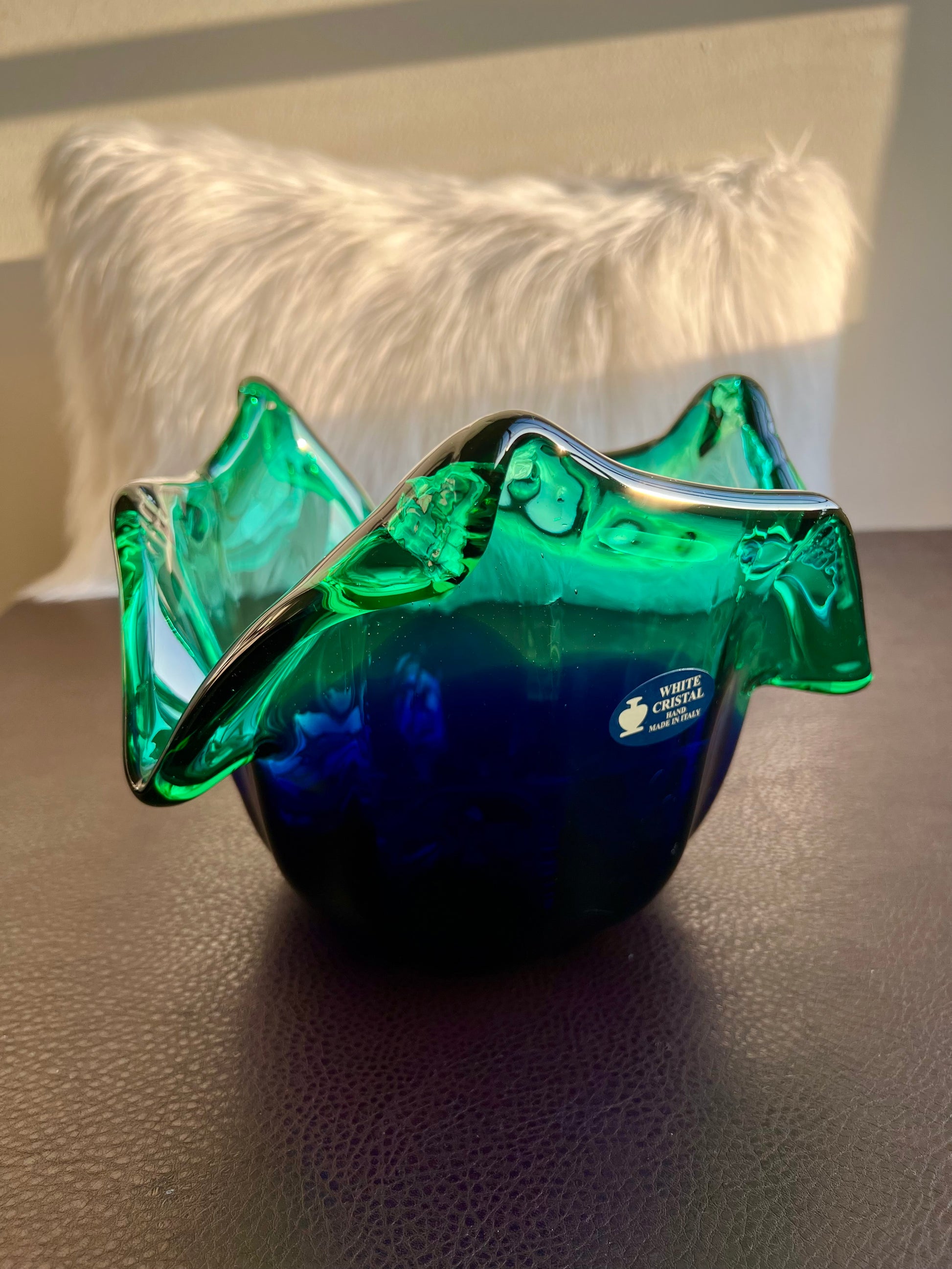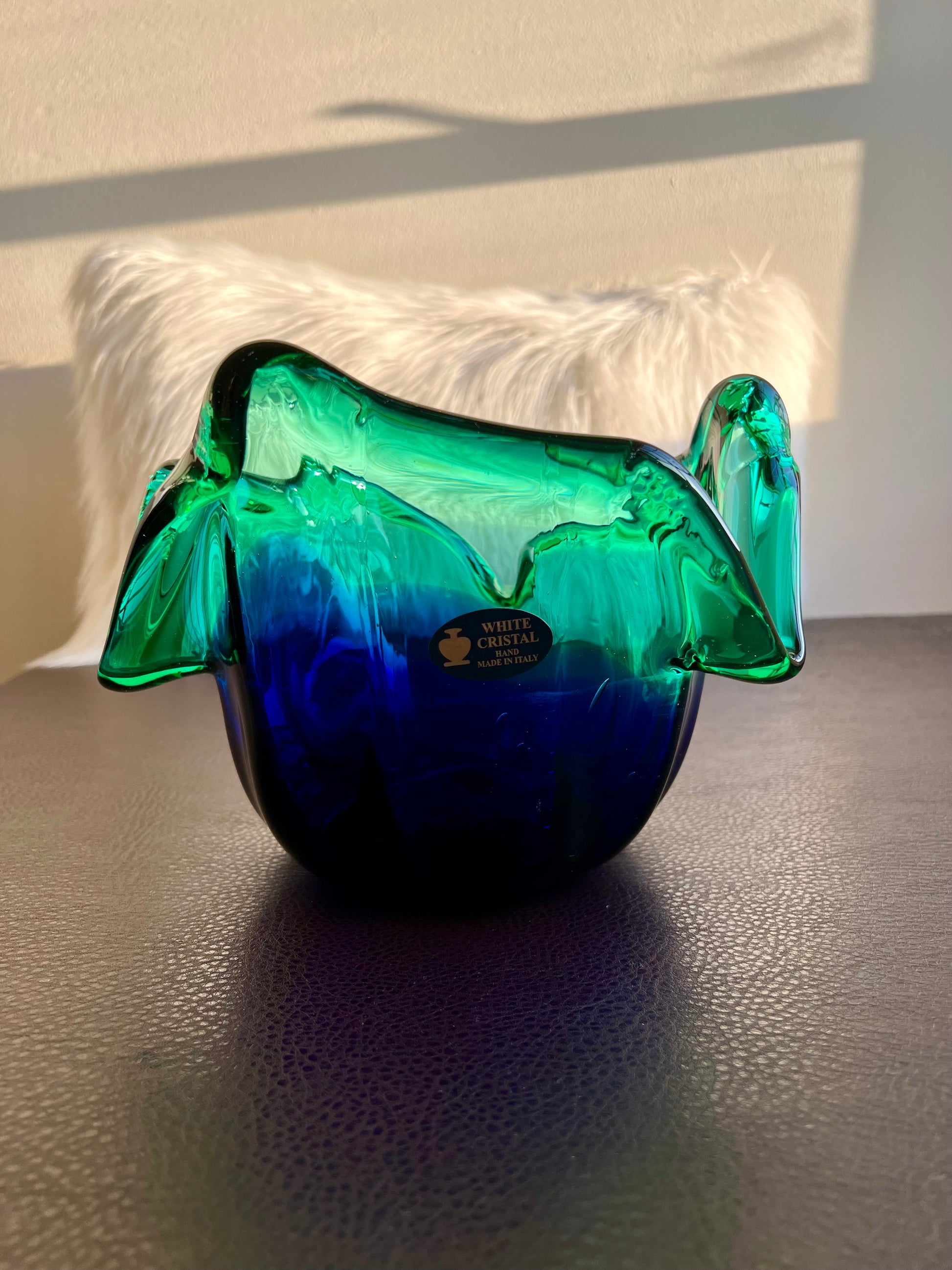 Beautiful MURANO blue and green extra large and heavy vintage classic white crystal glass bowl, decorative dish or vase. It’s in very good vintage condition. This would be a great table display in your home. Made in Italy.