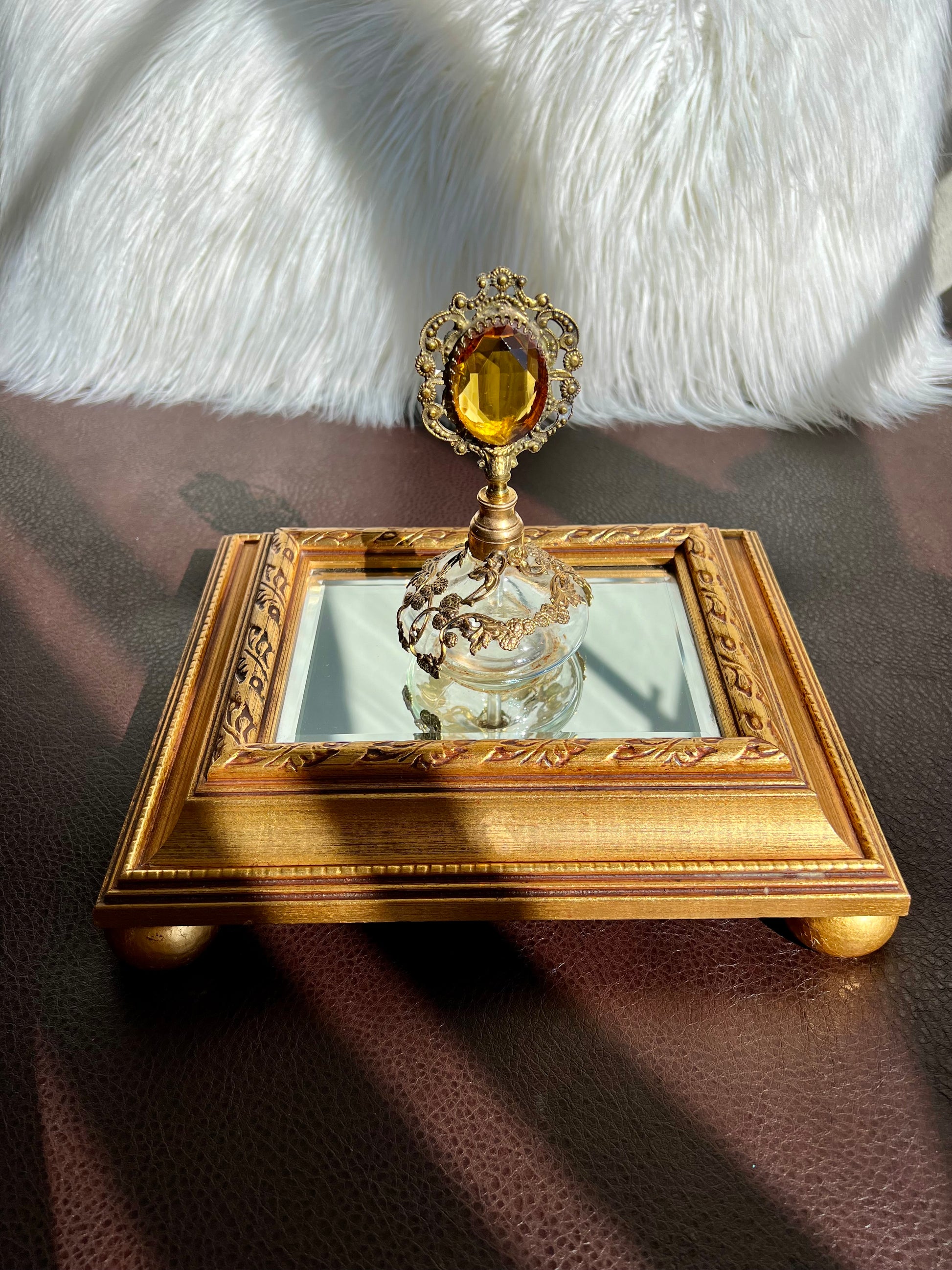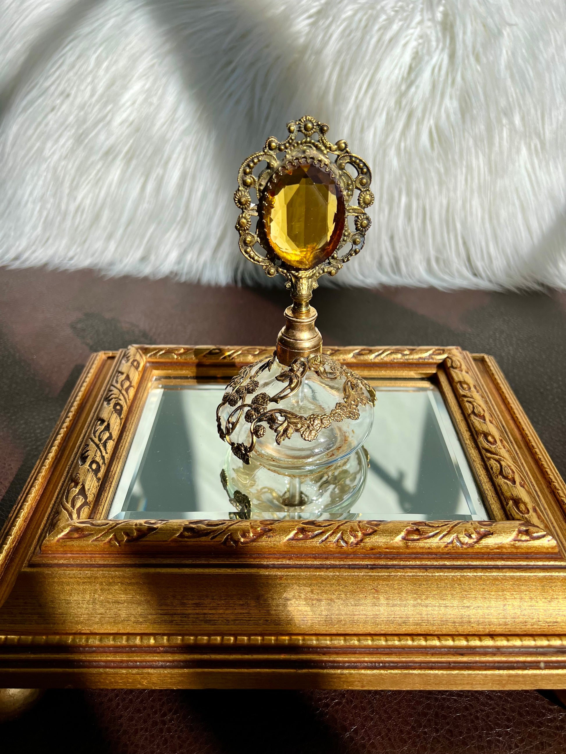 Beautiful vintage gold plated perfume bottle with Topaz color stone and dauber. It’s in excellent vintage condition.