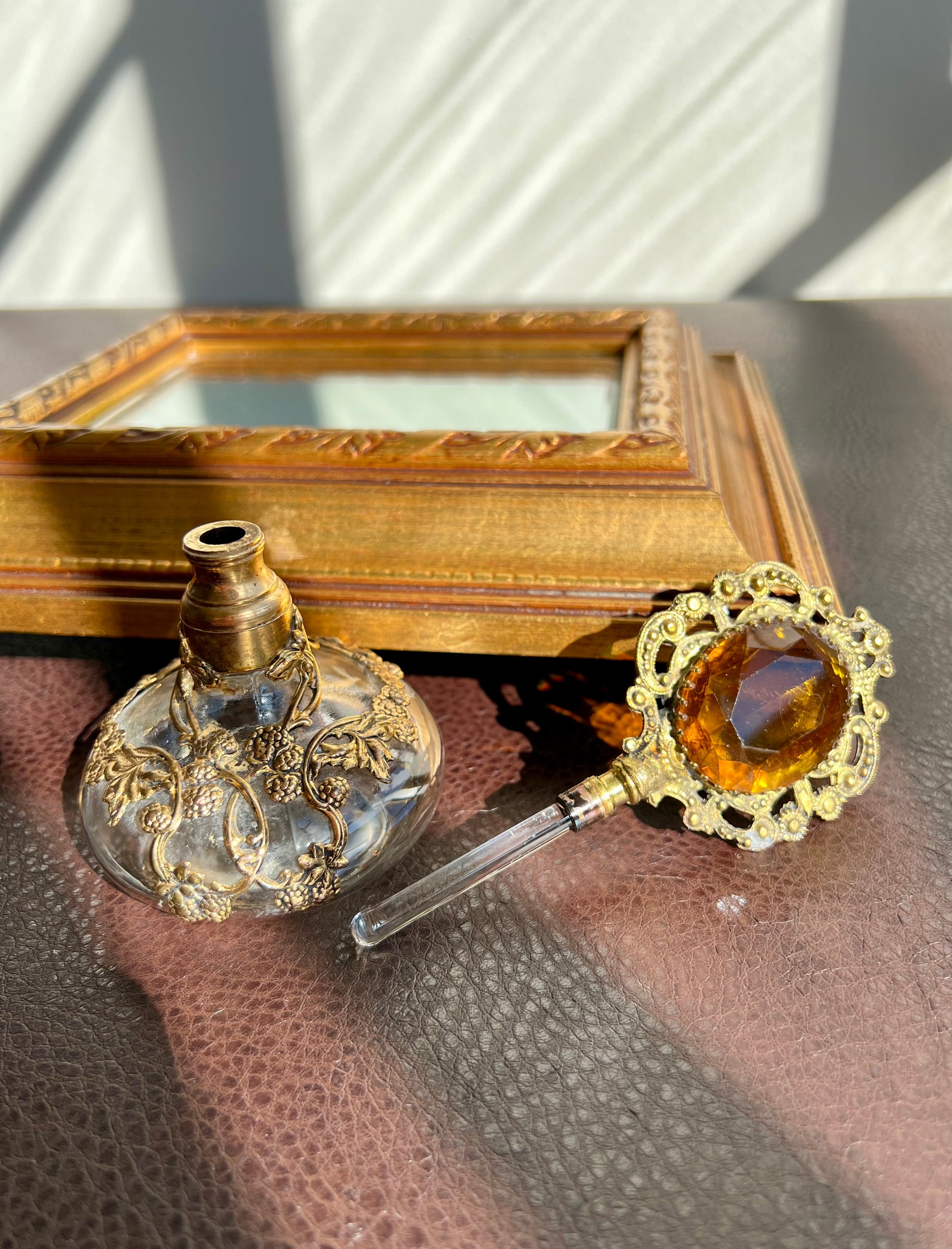 Gold Plated Ornate Perfume Bottle with Topaz Color Stone and Dauber, Ormolu Filigree