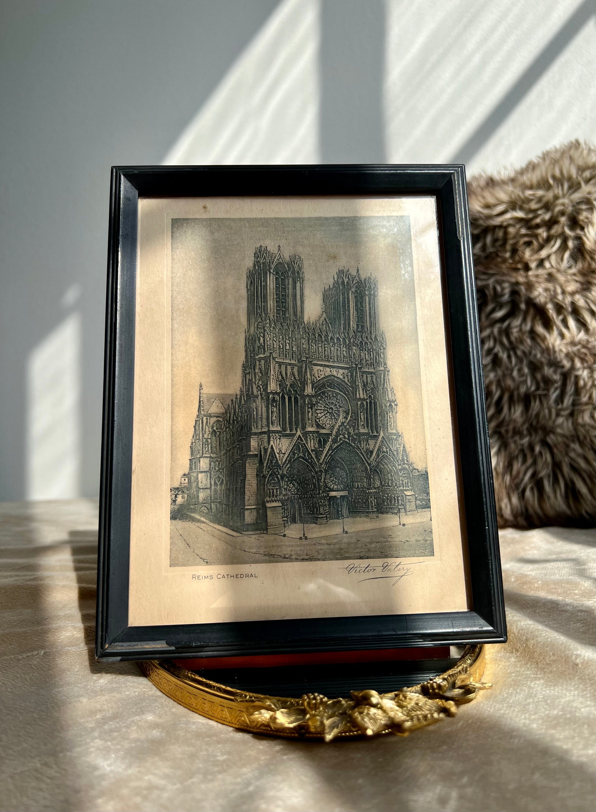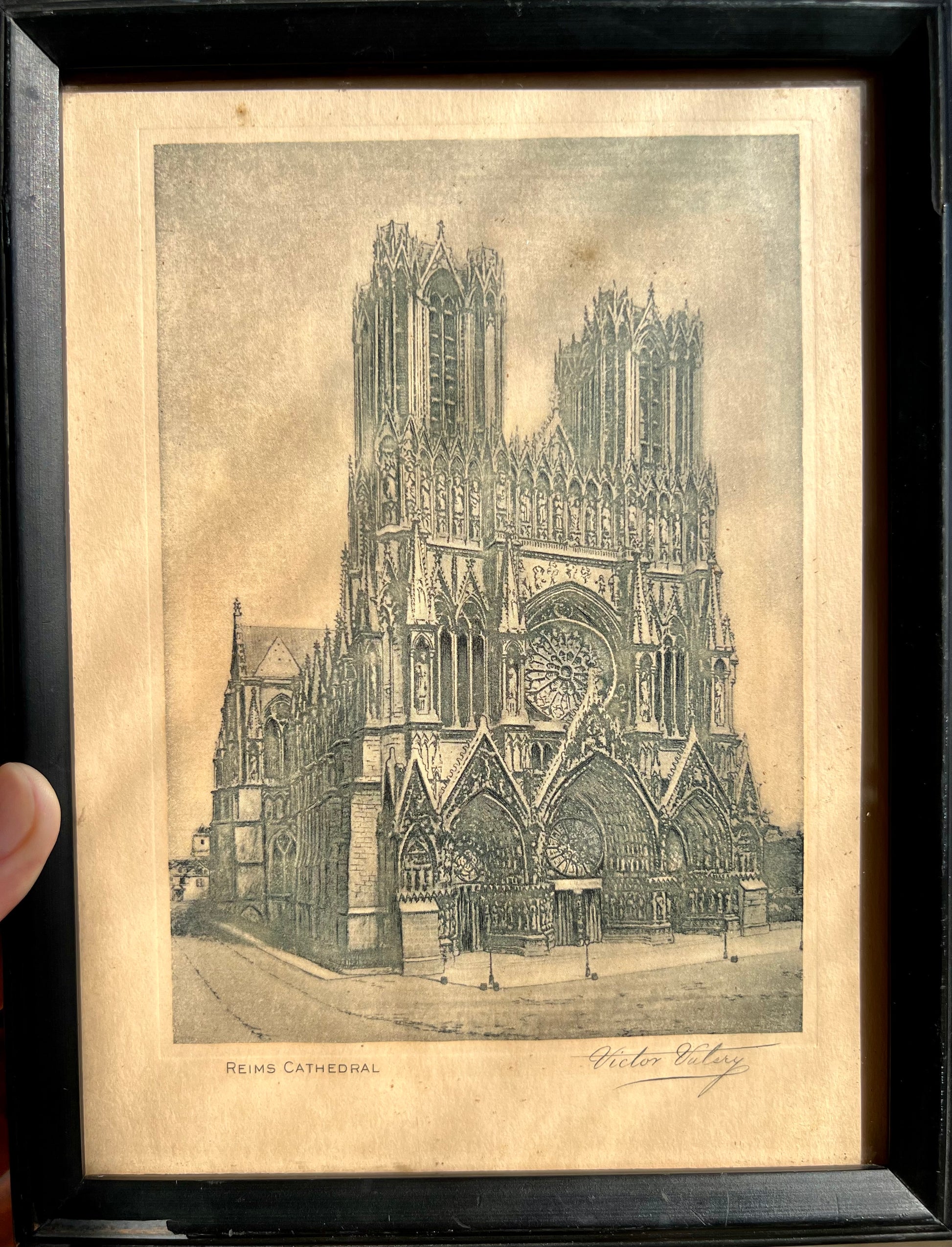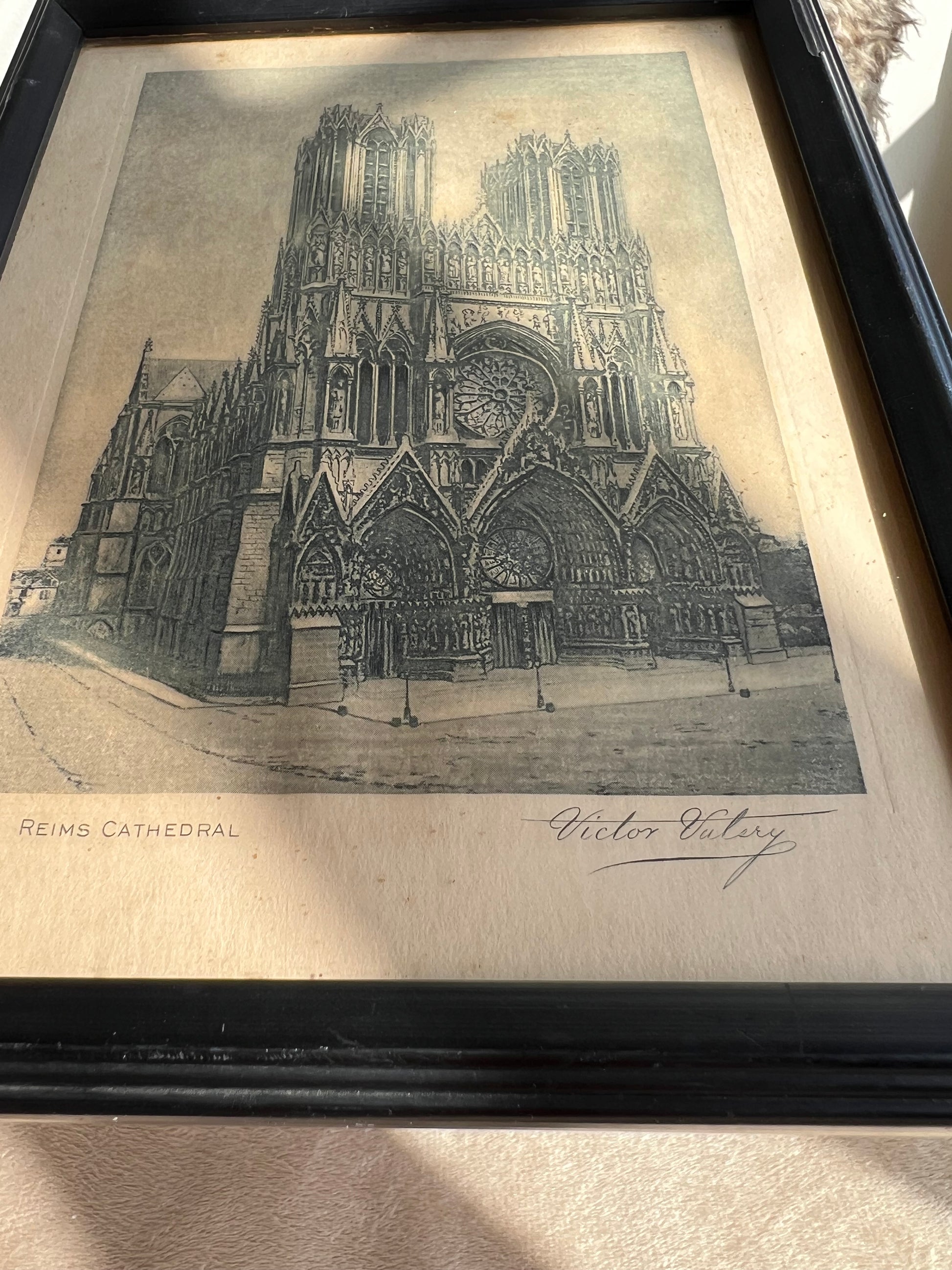 Victor Valery Lochelongue (1870 - 1930) high quality print of Reims Cathedral in France, signed. The vintage picture is in good condition but the frame is very old and has minor damages. You can see them in the photos.