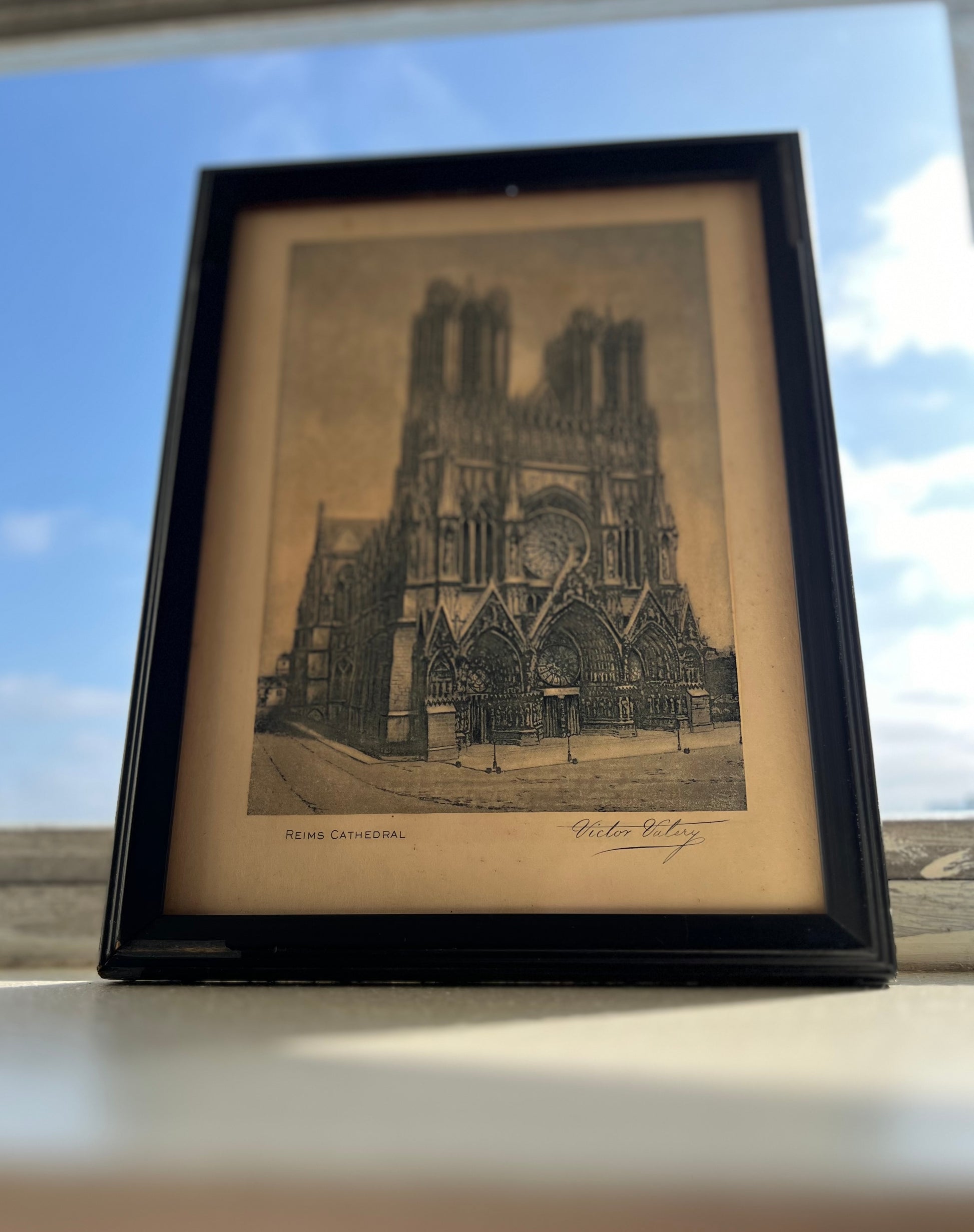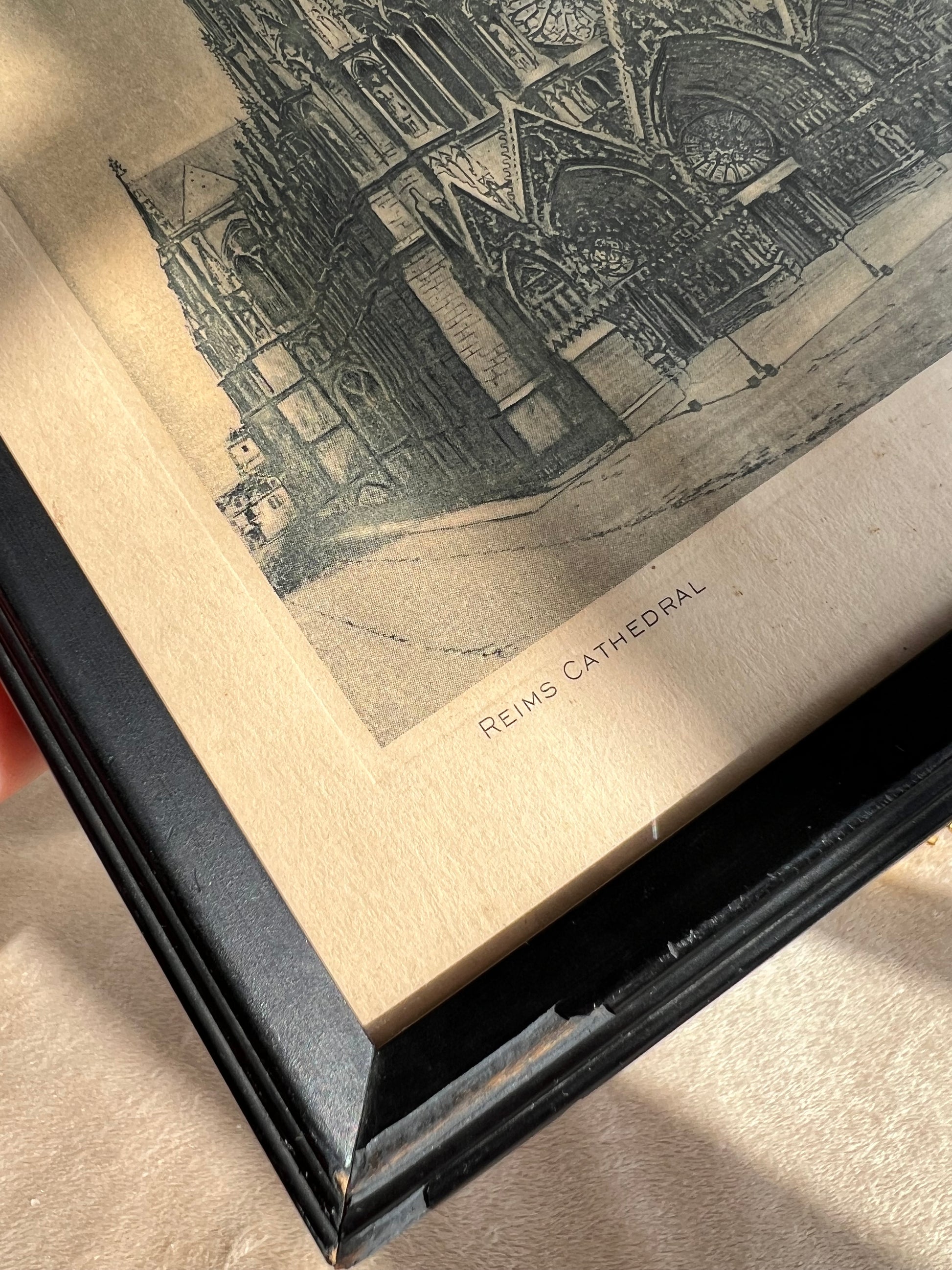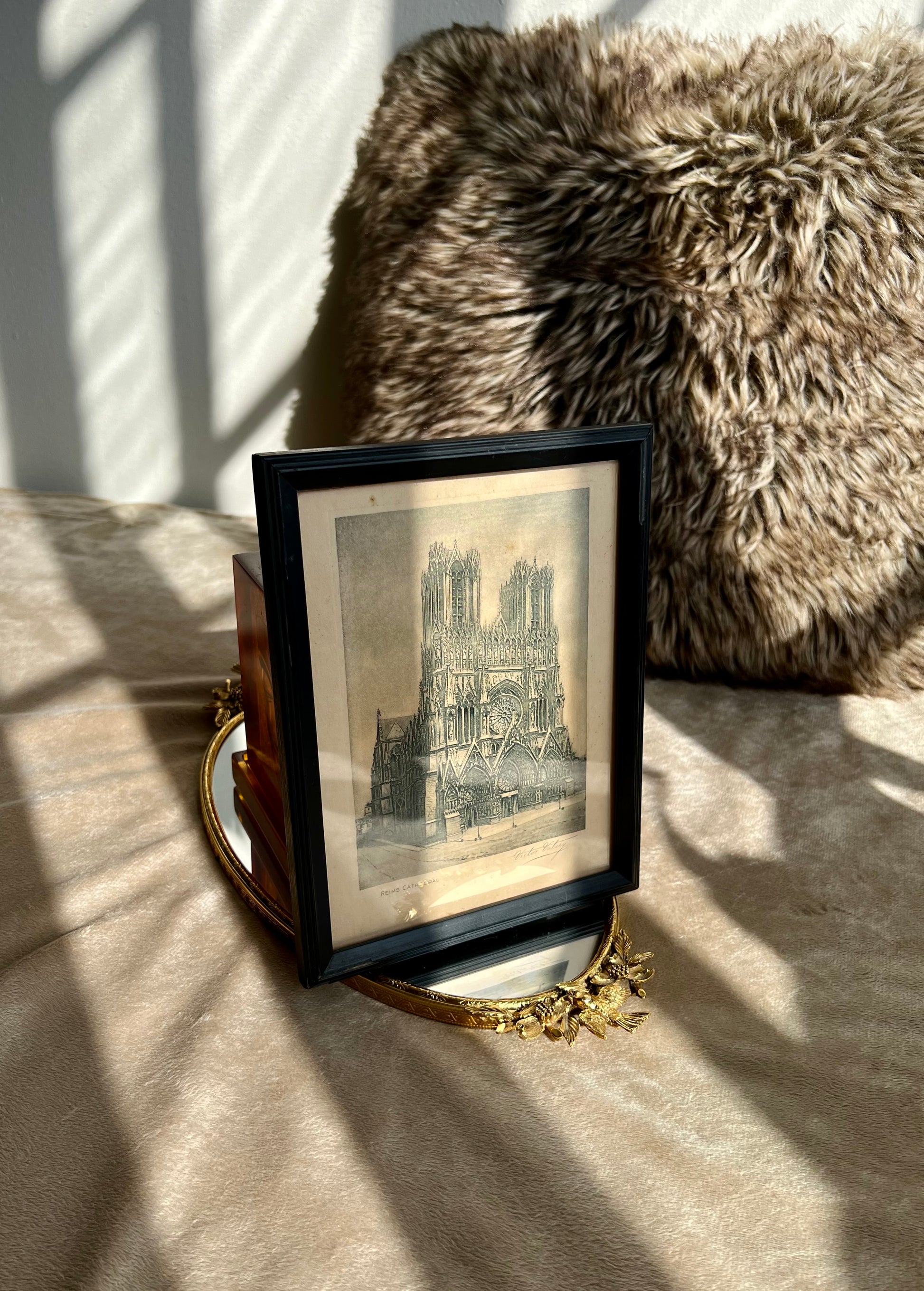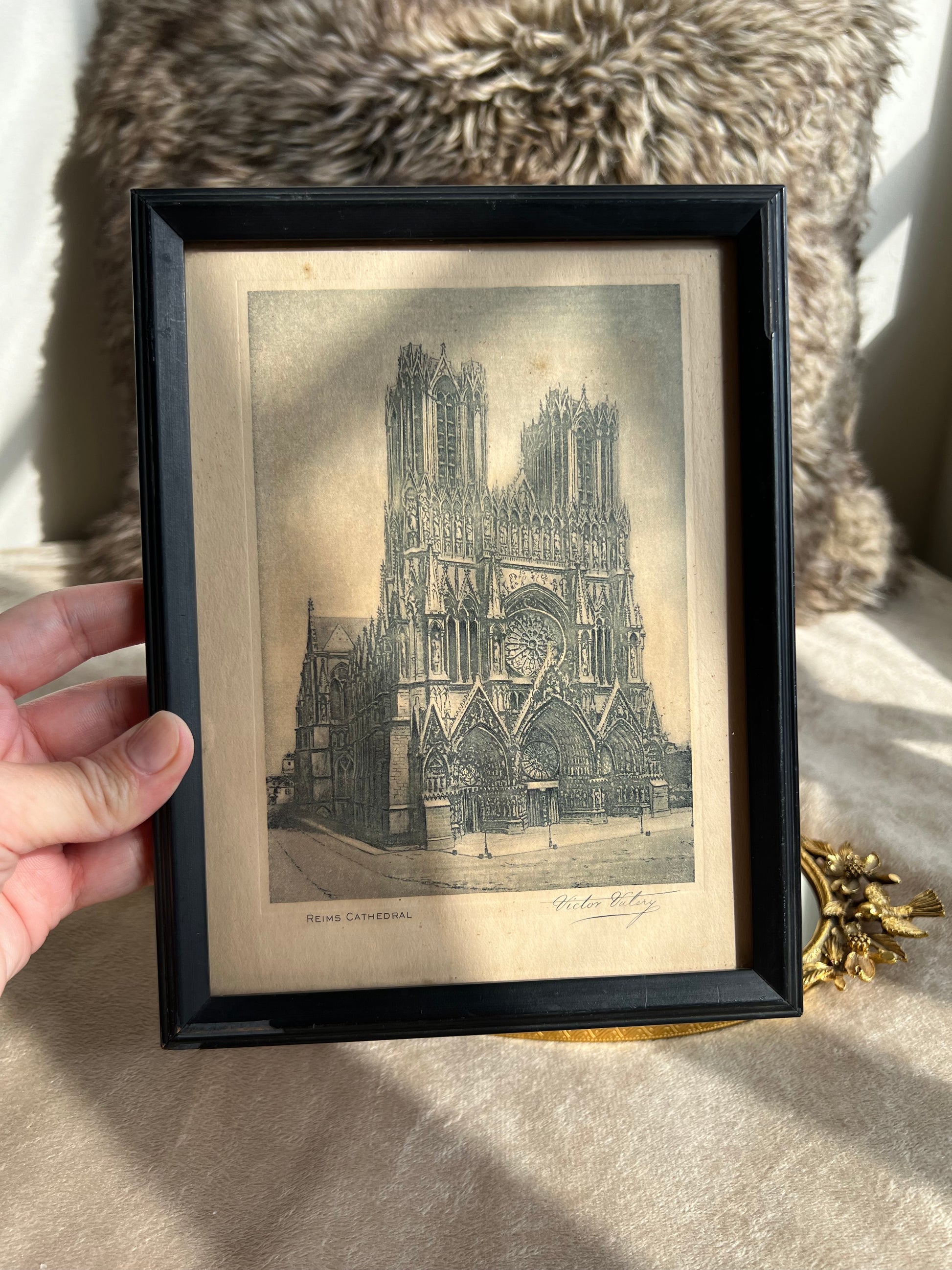Victor Valery Lochelongue (1870 - 1930) high quality print of Reims Cathedral in France, signed. The vintage picture is in good condition but the frame is very old and has minor damages. You can see them in the photos.