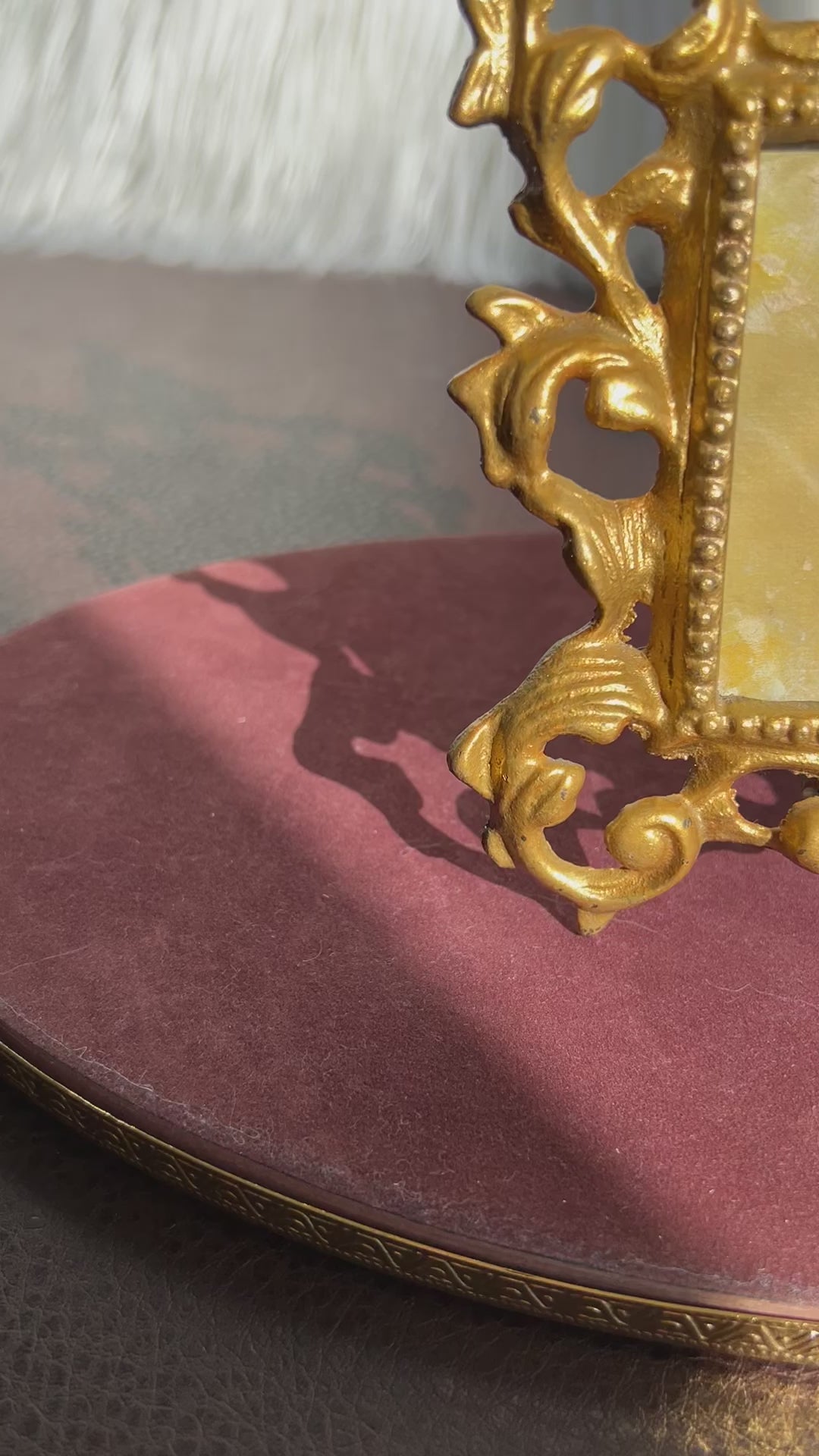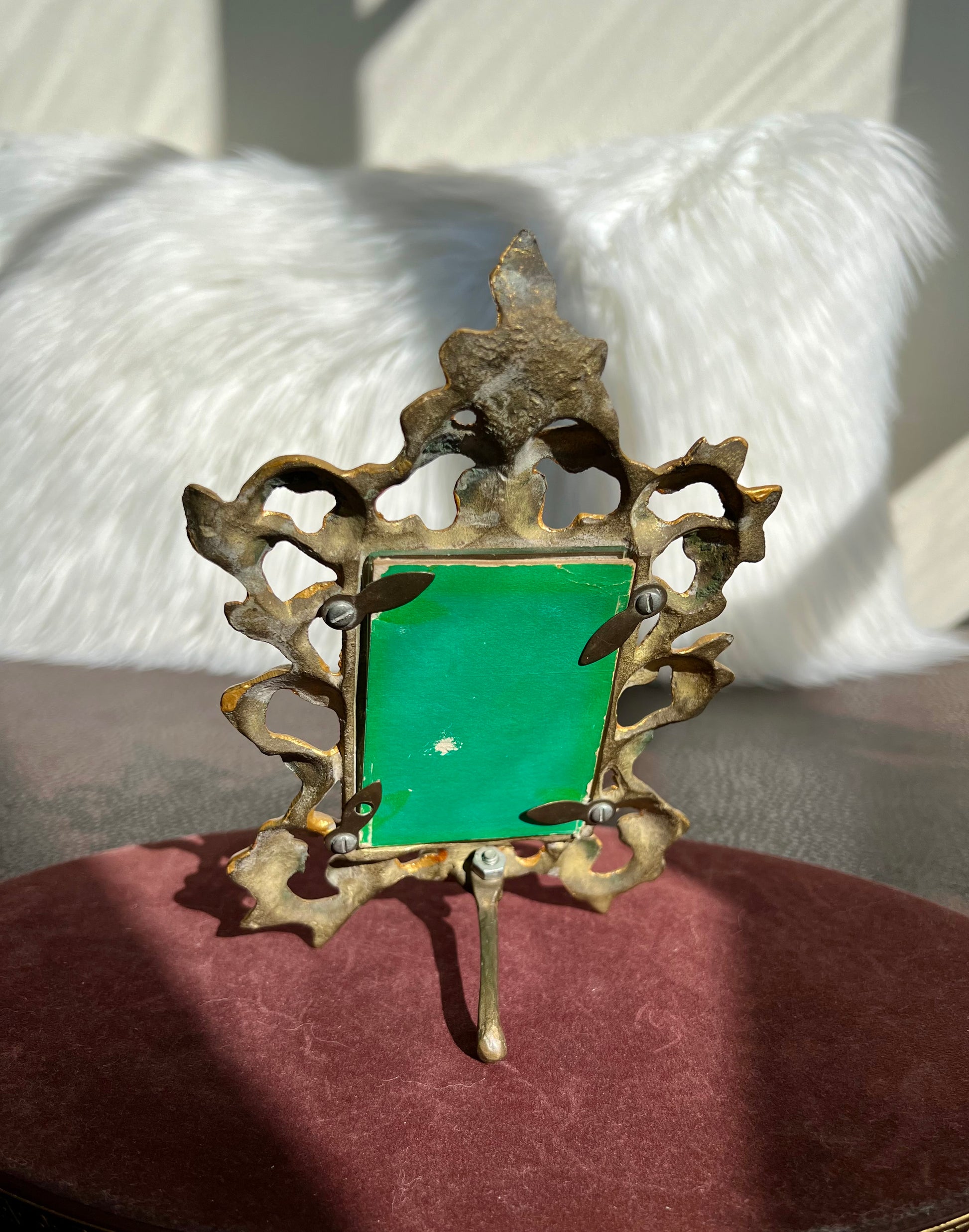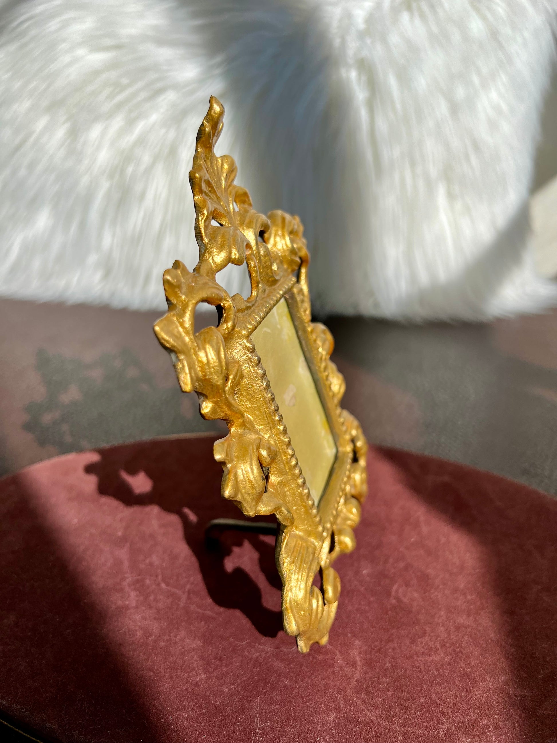 Beautiful French Victorian Rococo style vintage heavy brass mini picture frame with golden gilt finish. This is a wonderful square shape of Art Nouveau picture frame. There is a swinging easel leg held in place by a pin. The frame has glass.