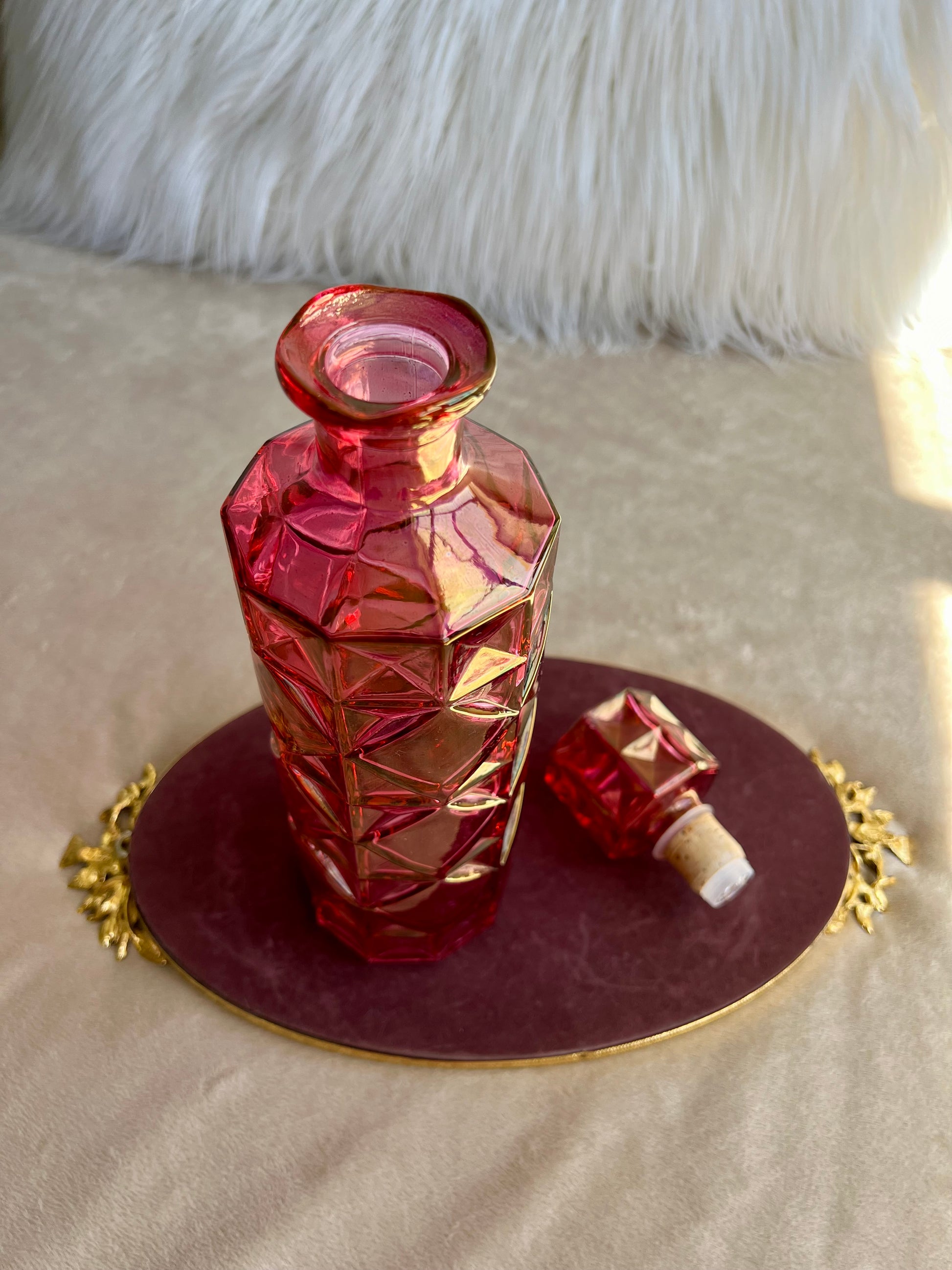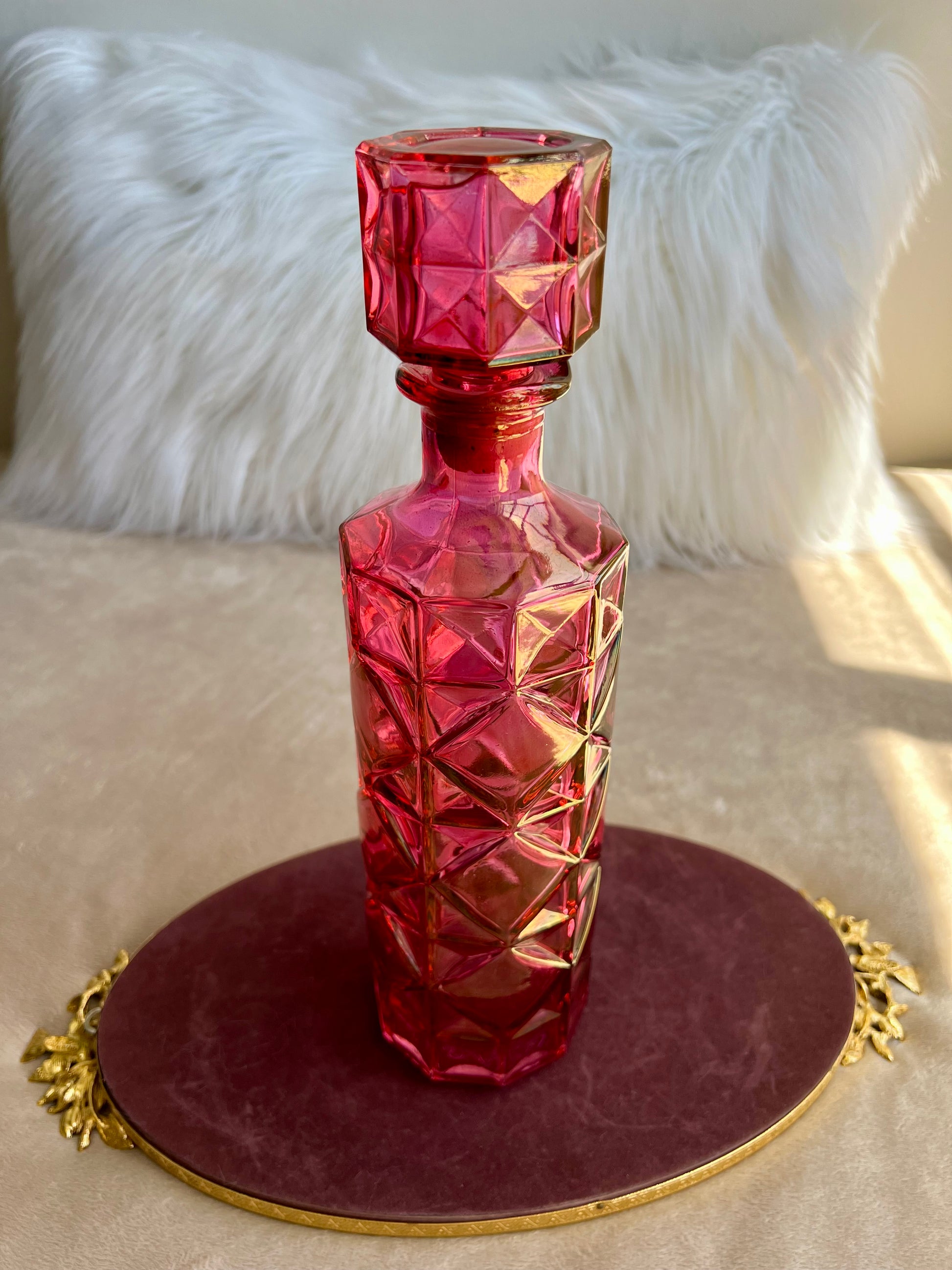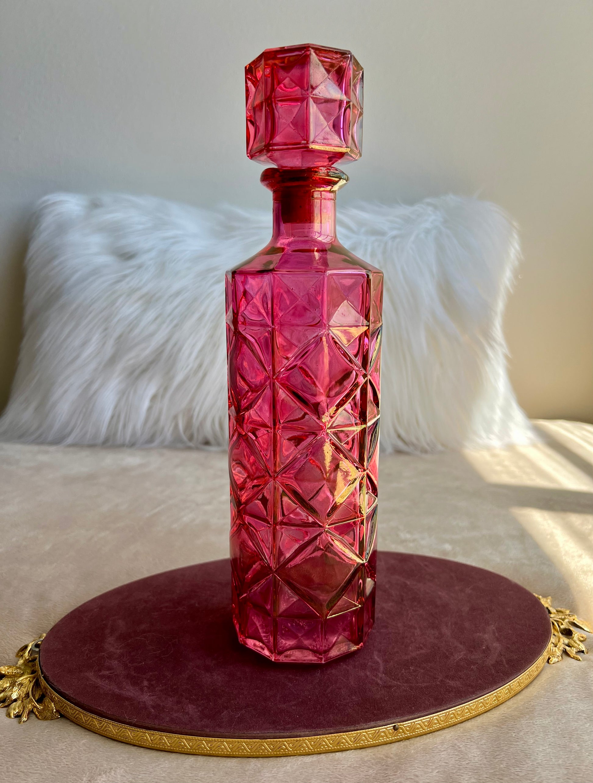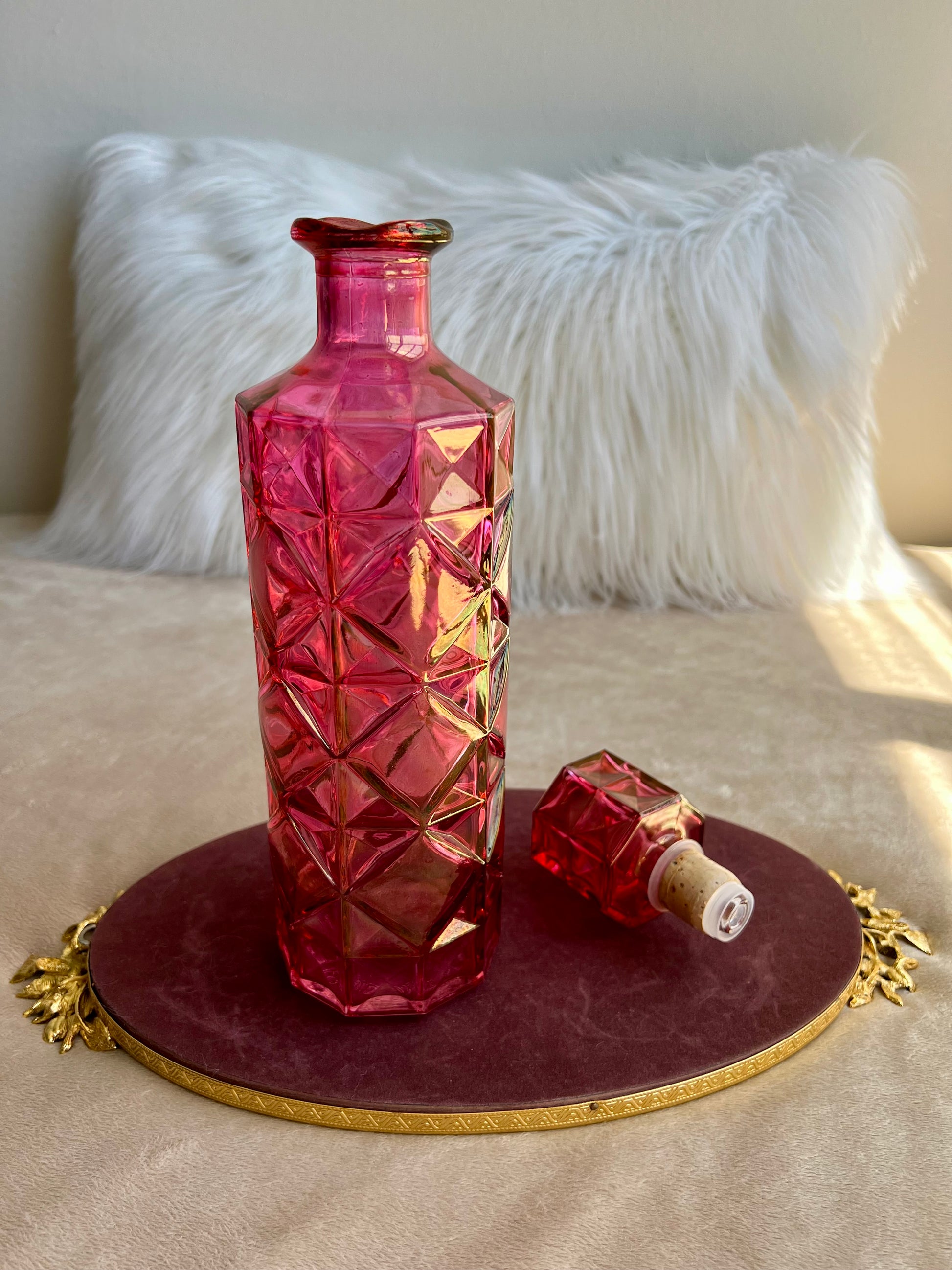 Vintage Pink Diamond Pressed Glass Liquor Bottle Decanter With Stopper