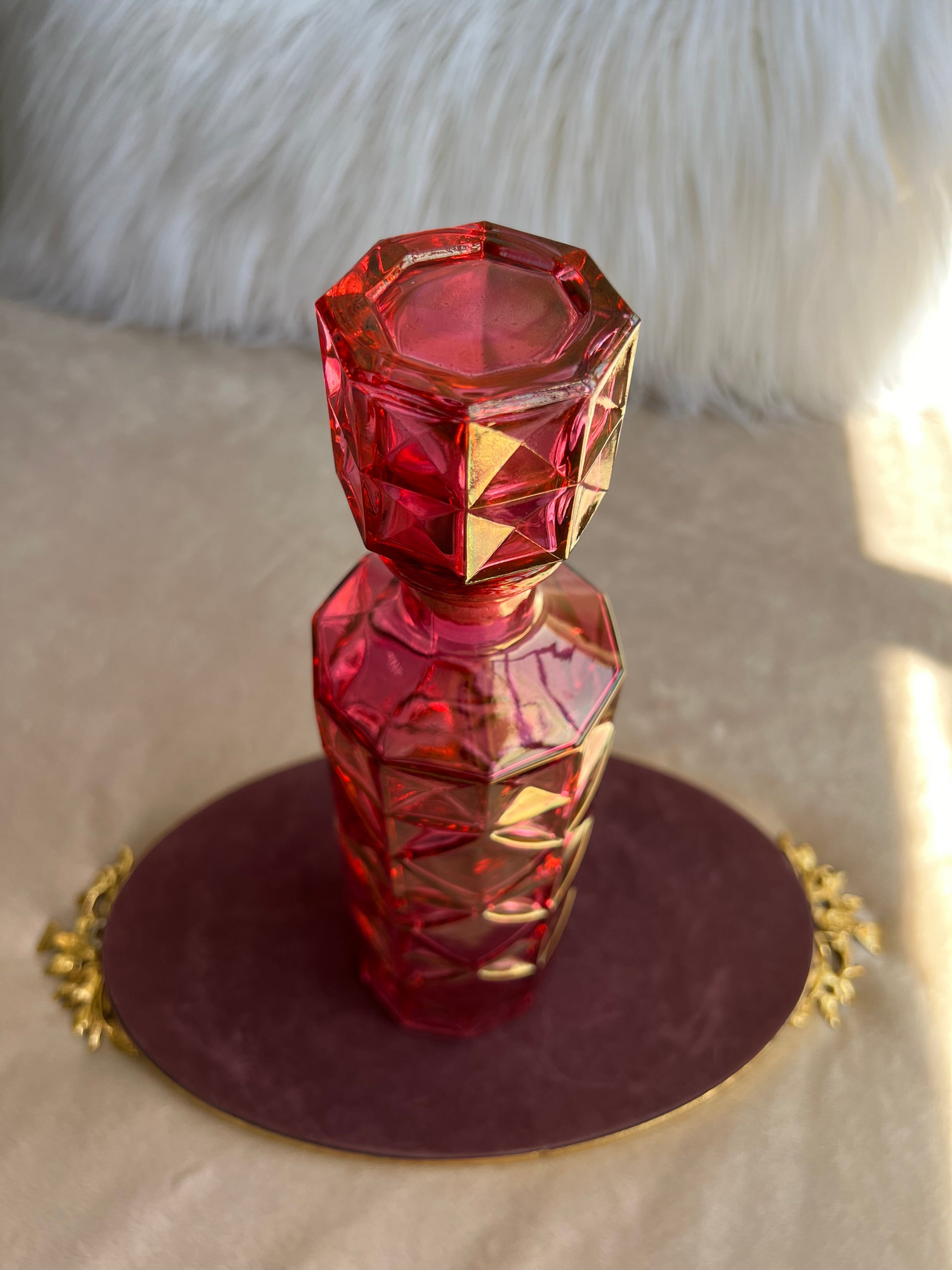 Beautiful pink diamond pressed glass booze Liquor, Bourbon rum, Scotch Whiskey or wine decanter. Condition is used but very good condition with no chips, cracks or repairs. Approximately 9.75 inches tall and 3 inches in diameter, extending to 11.75 inches tall with the top.