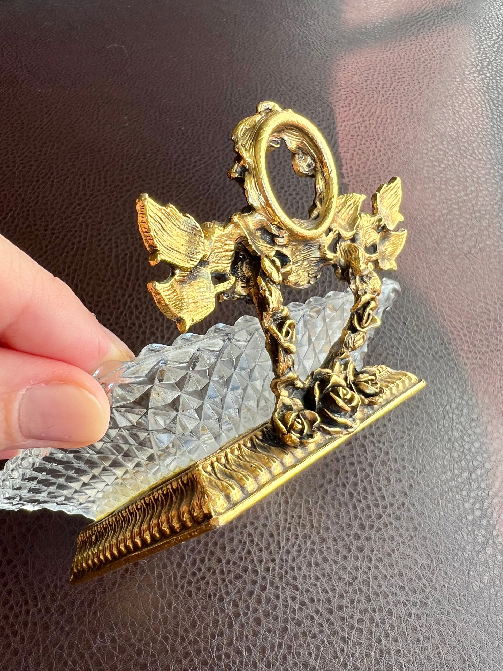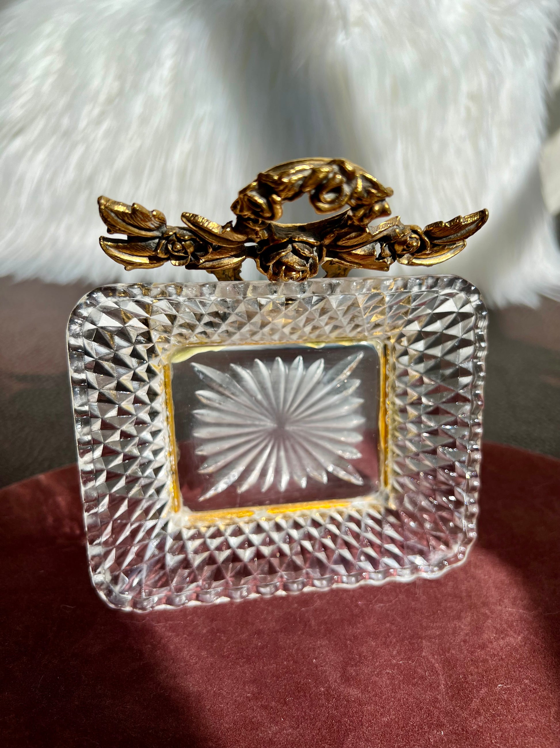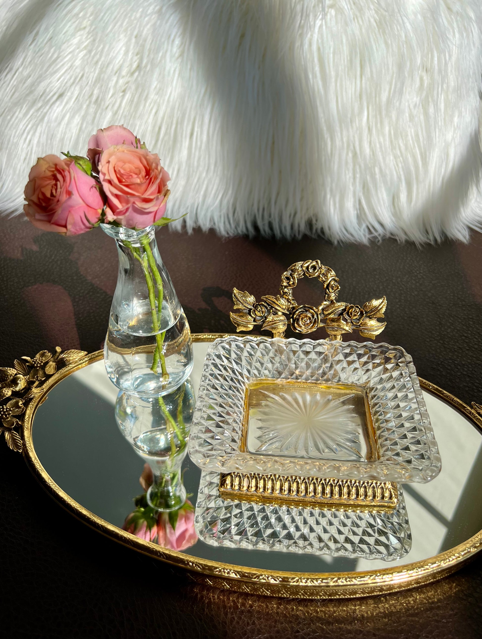 Beautiful vintage Hollywood Regency (MCM) cut glass soap holder dish with gilded rose decoration. It’s in excellent condition.