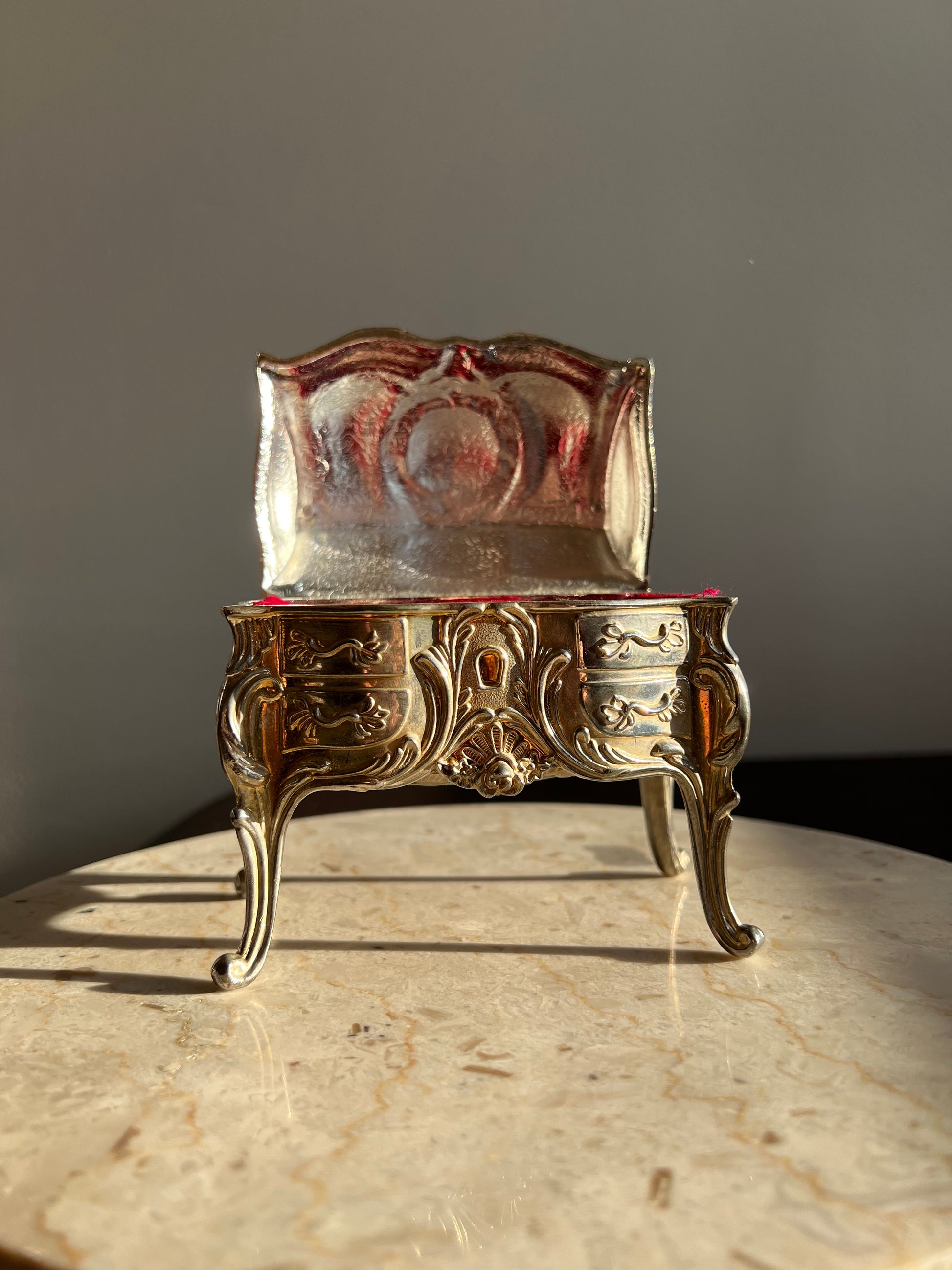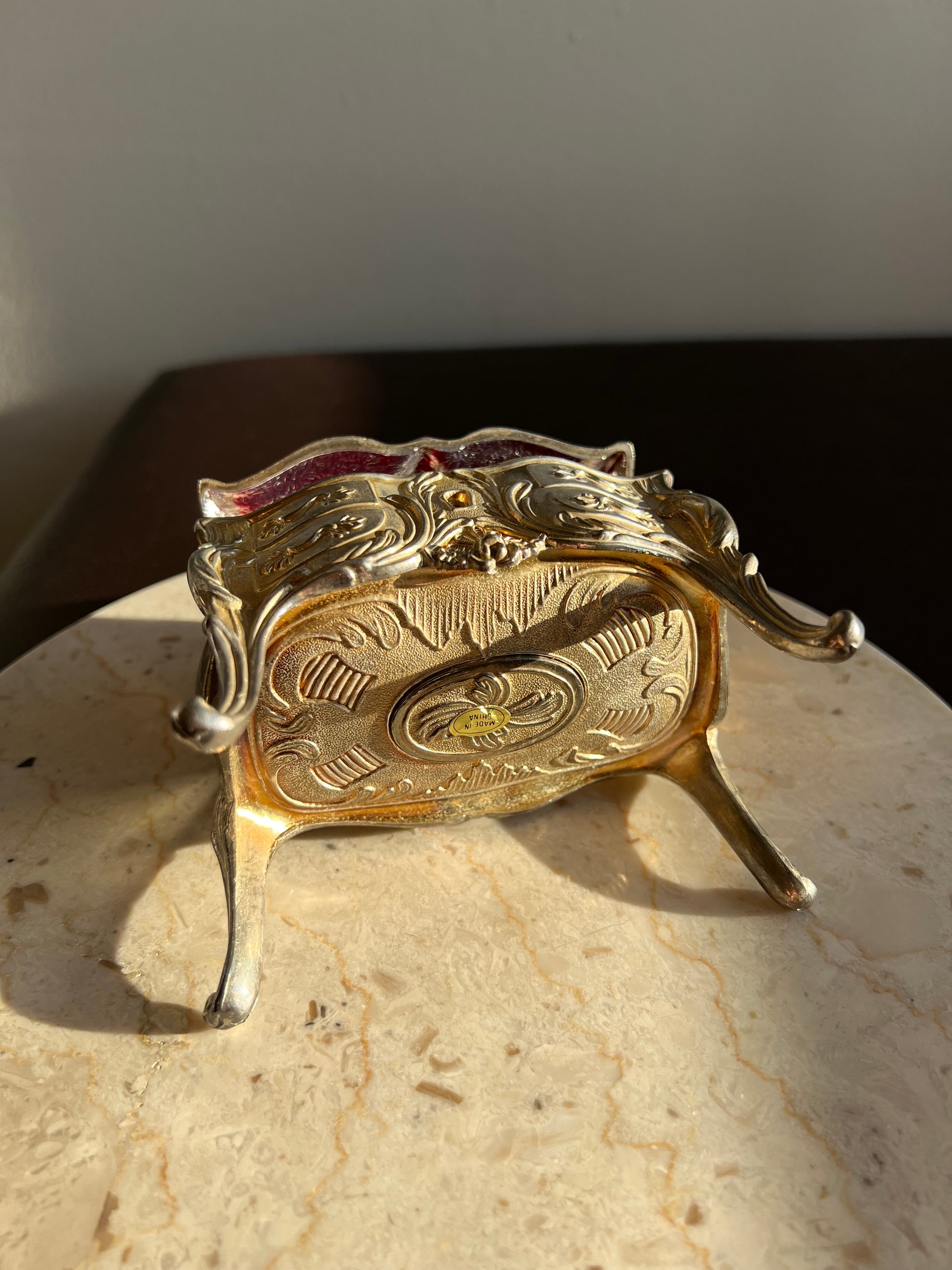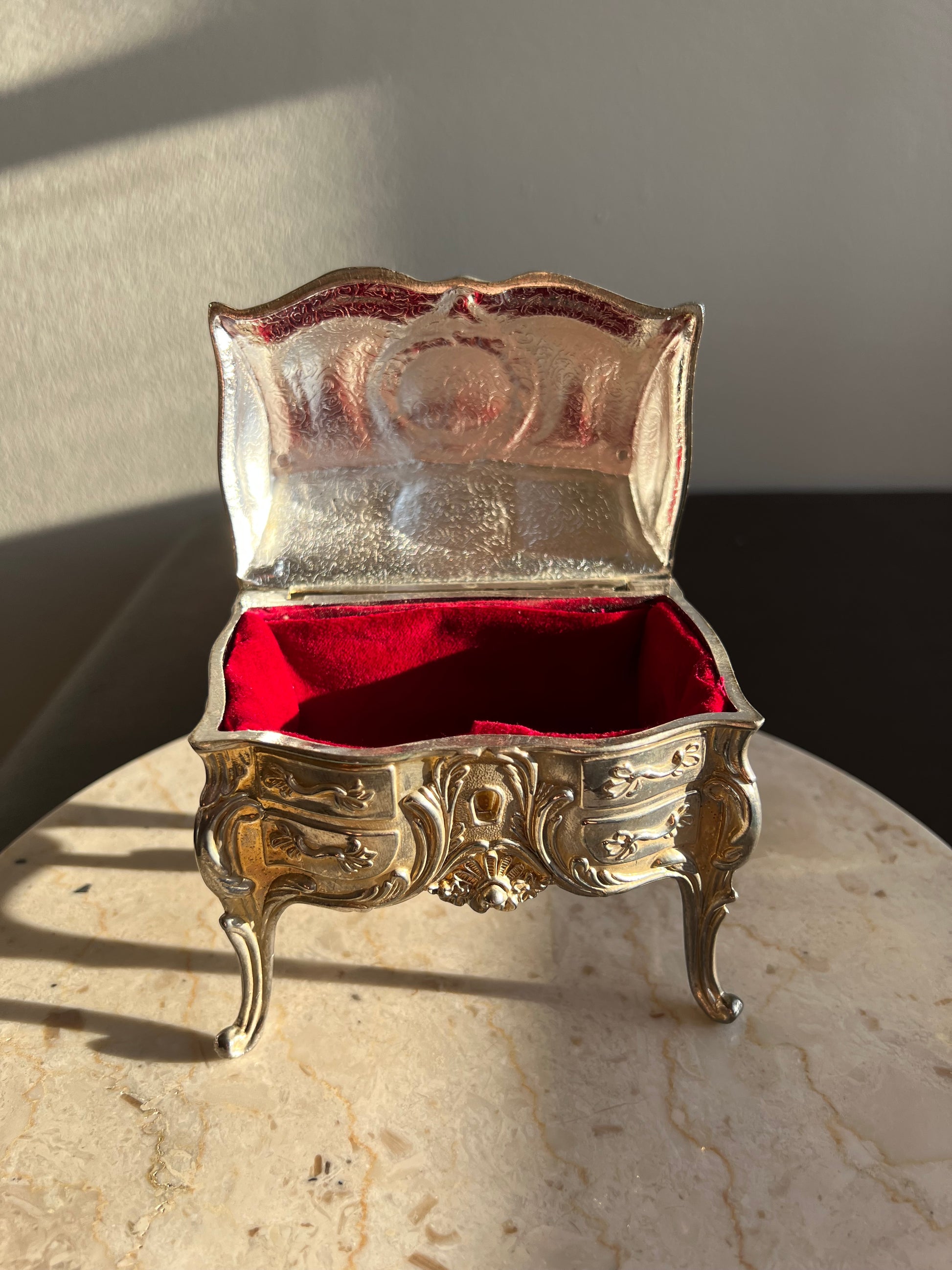 Beautiful silver plated metal French style vintage Art Nouveau jewelry casket, ring holder box. This is an unmarked piece. It’s in very good vintage condition. There is some slight discoloration on the silver surface in some places. It has a red velvet lining and hinged top.