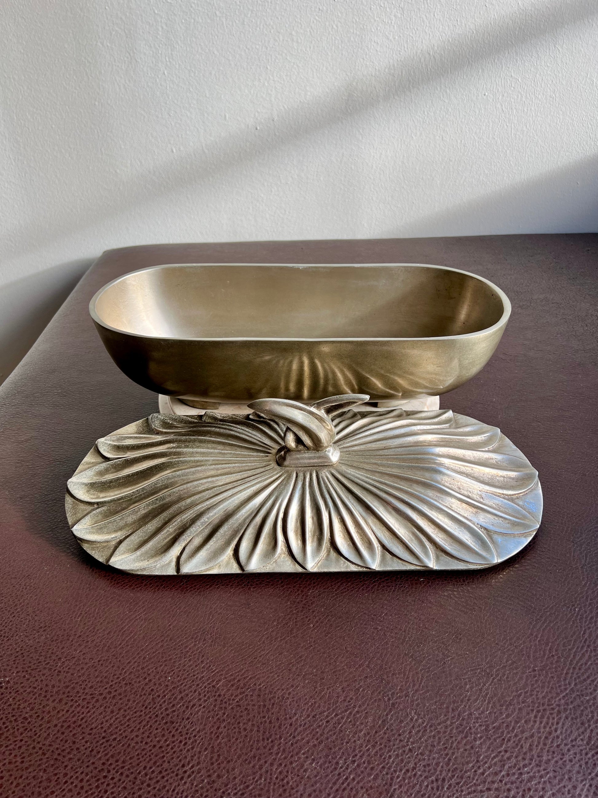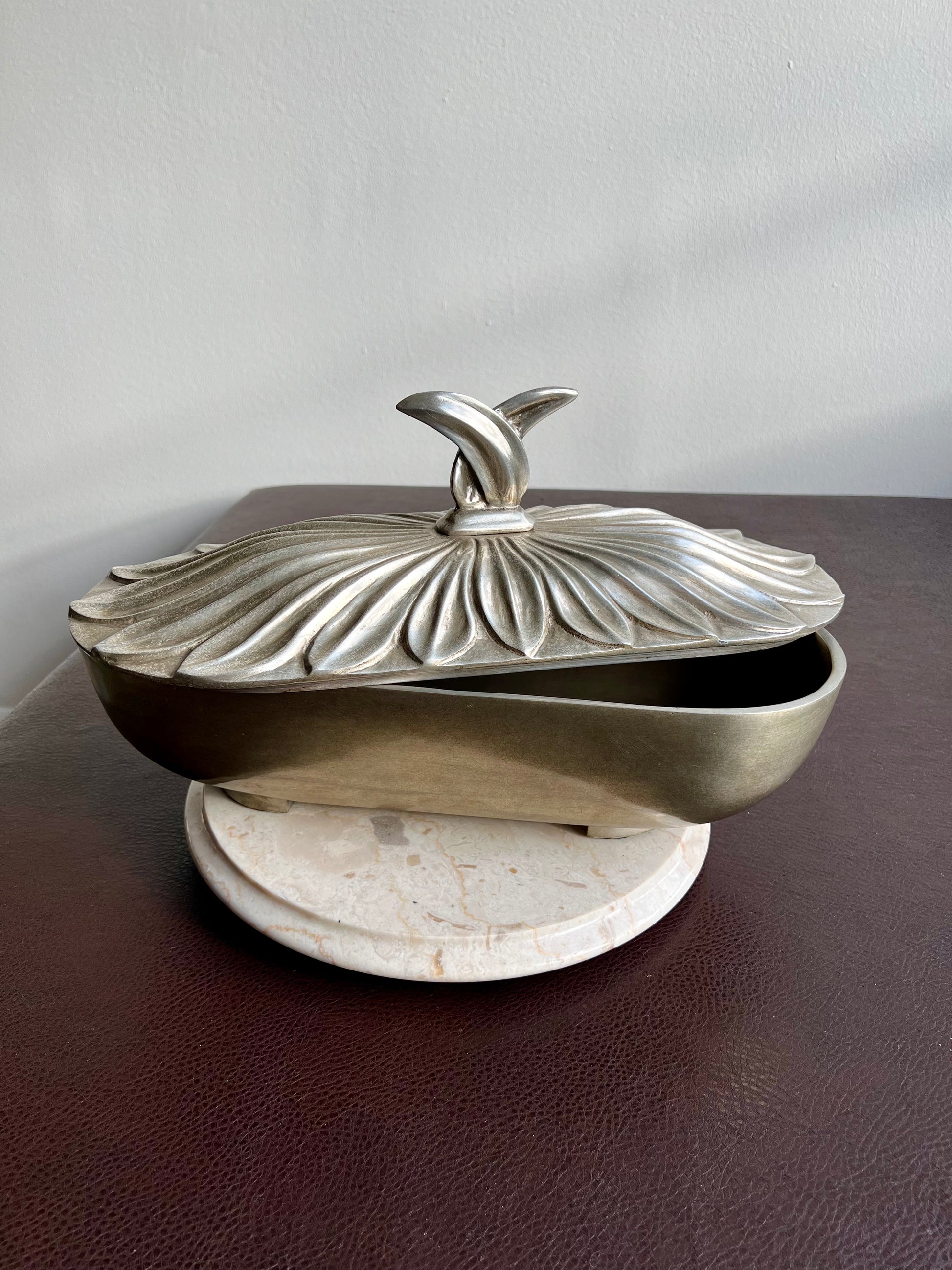 Art Deco Style Big Silver Plated Vintage Oval Metal Bowl with Decorative Flower Petal-shaped Lid, Numbered