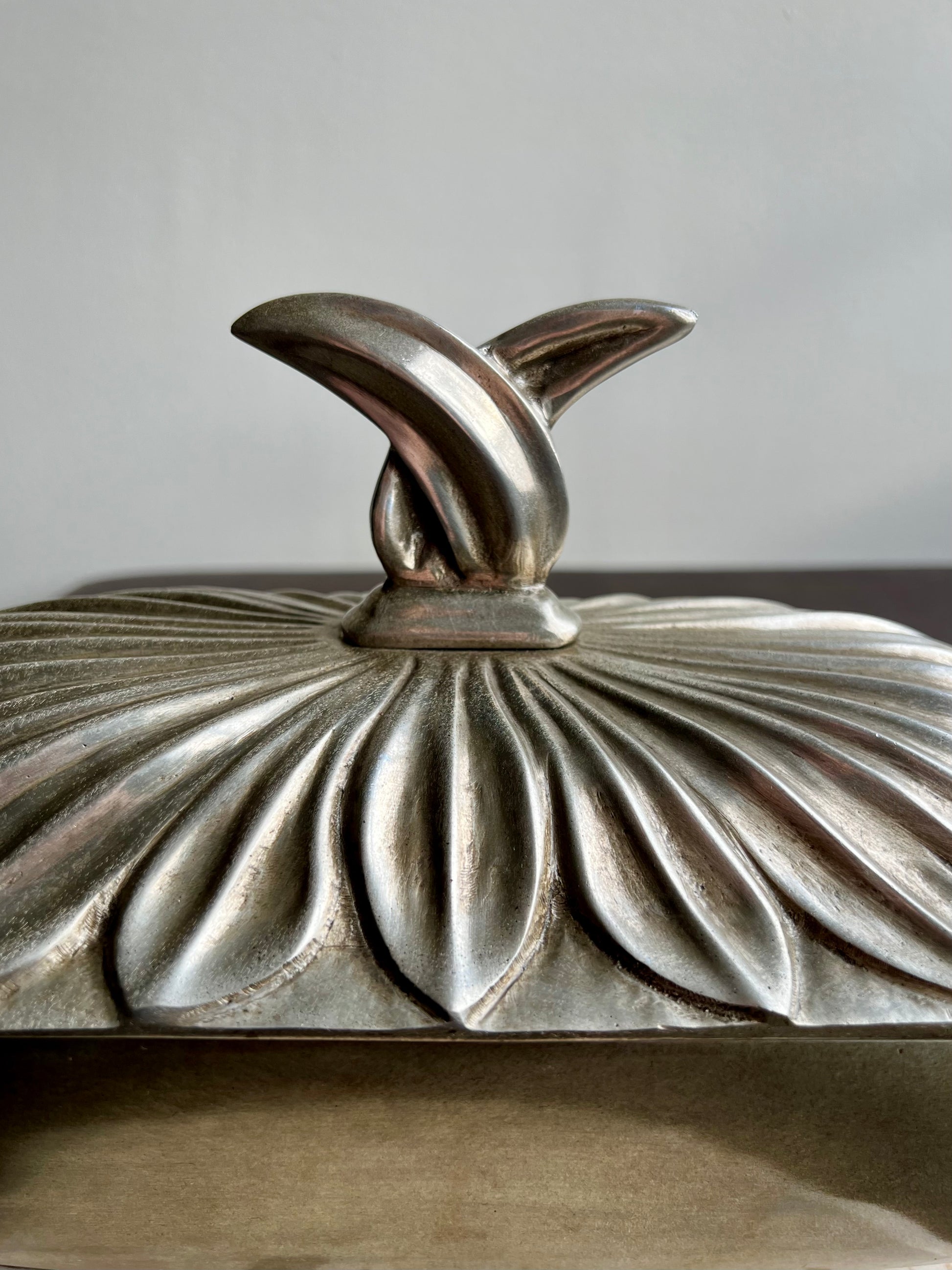 Beautiful Art Deco style big silver plated vintage oval metal bowl with decorative flower petal-shaped lid. There is probably a serial number on the bottom of the product, but I couldn't find any branding on it. It’s in excellent vintage condition.