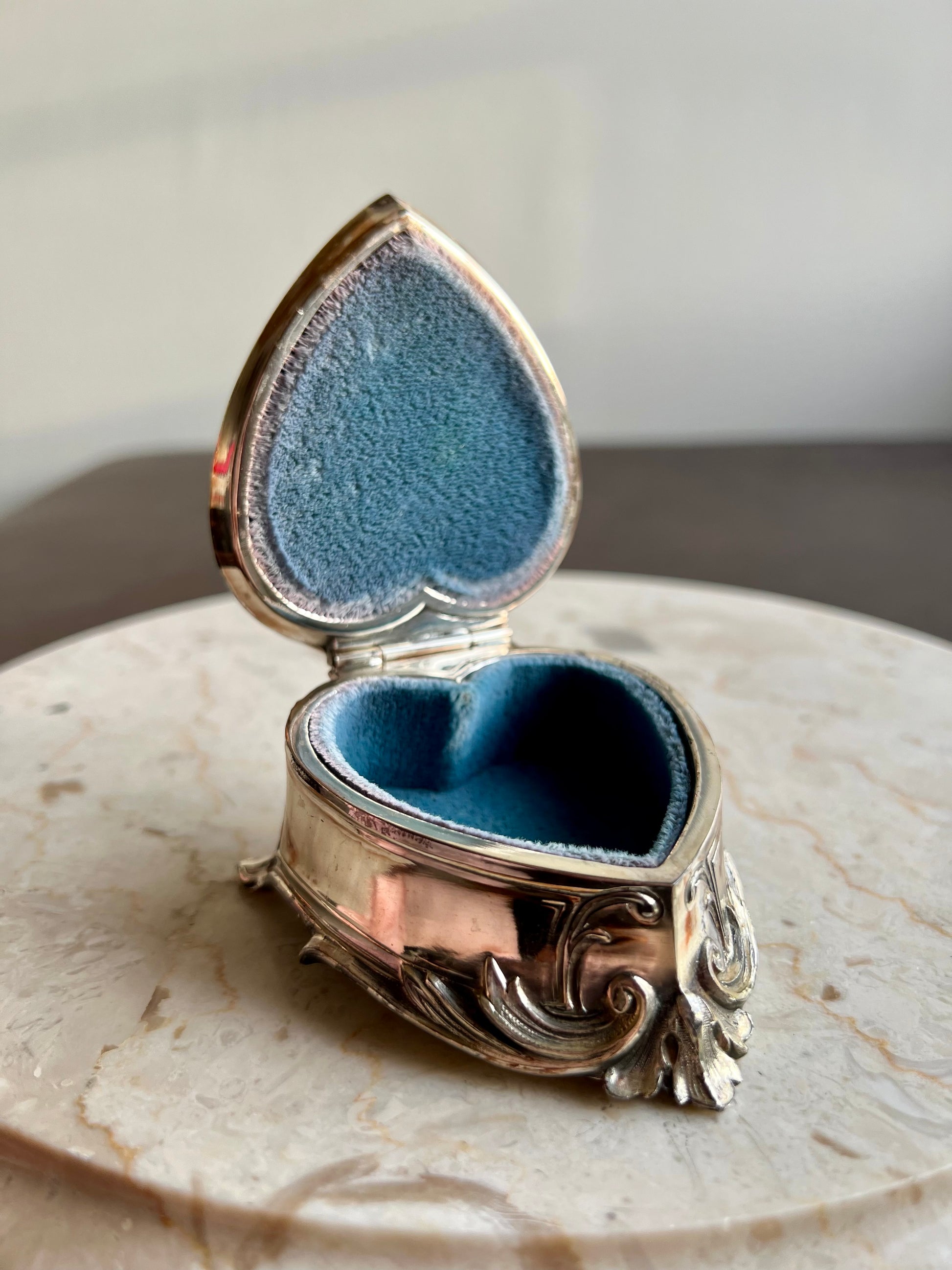 Antique Art Nouveau Silver Plated Heart Shaped Vintage Jewelry Ring Holder, Trinket Box, Blue Velvet Lined Interior