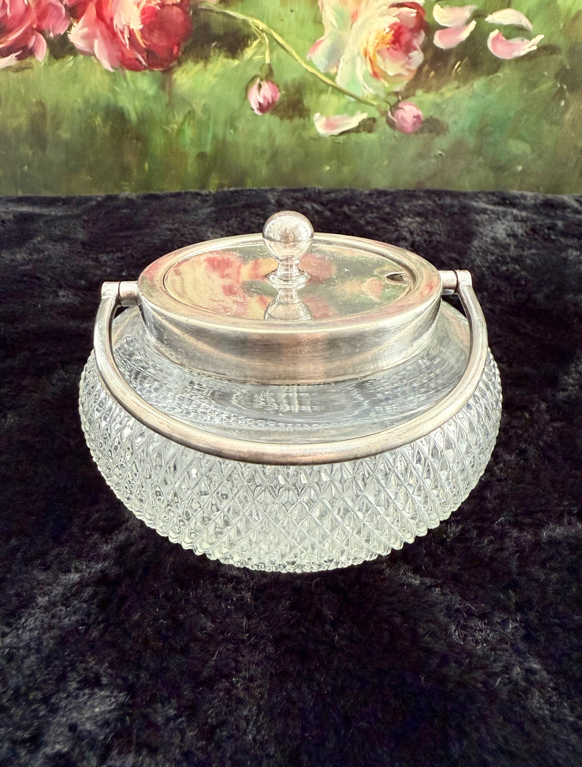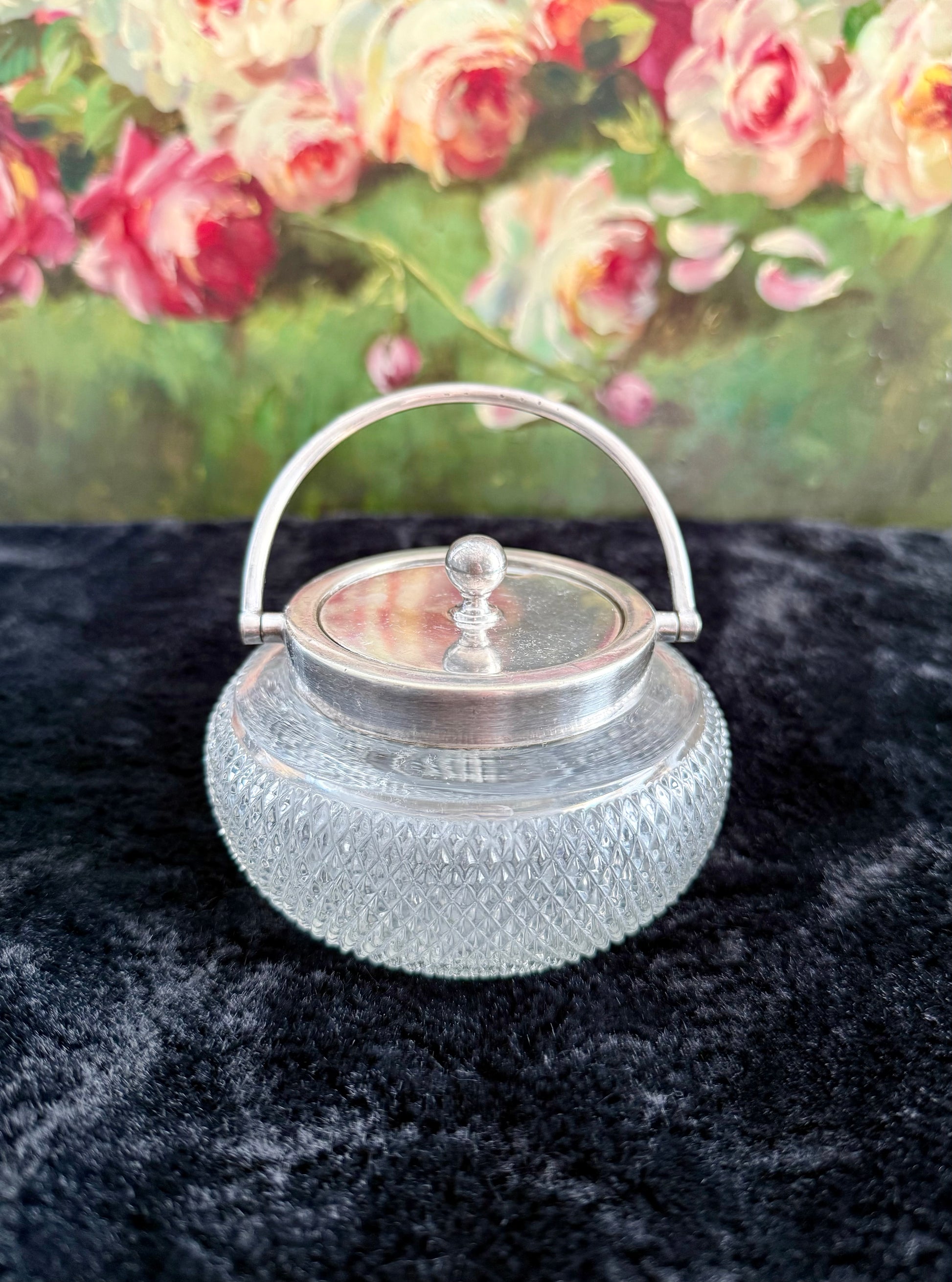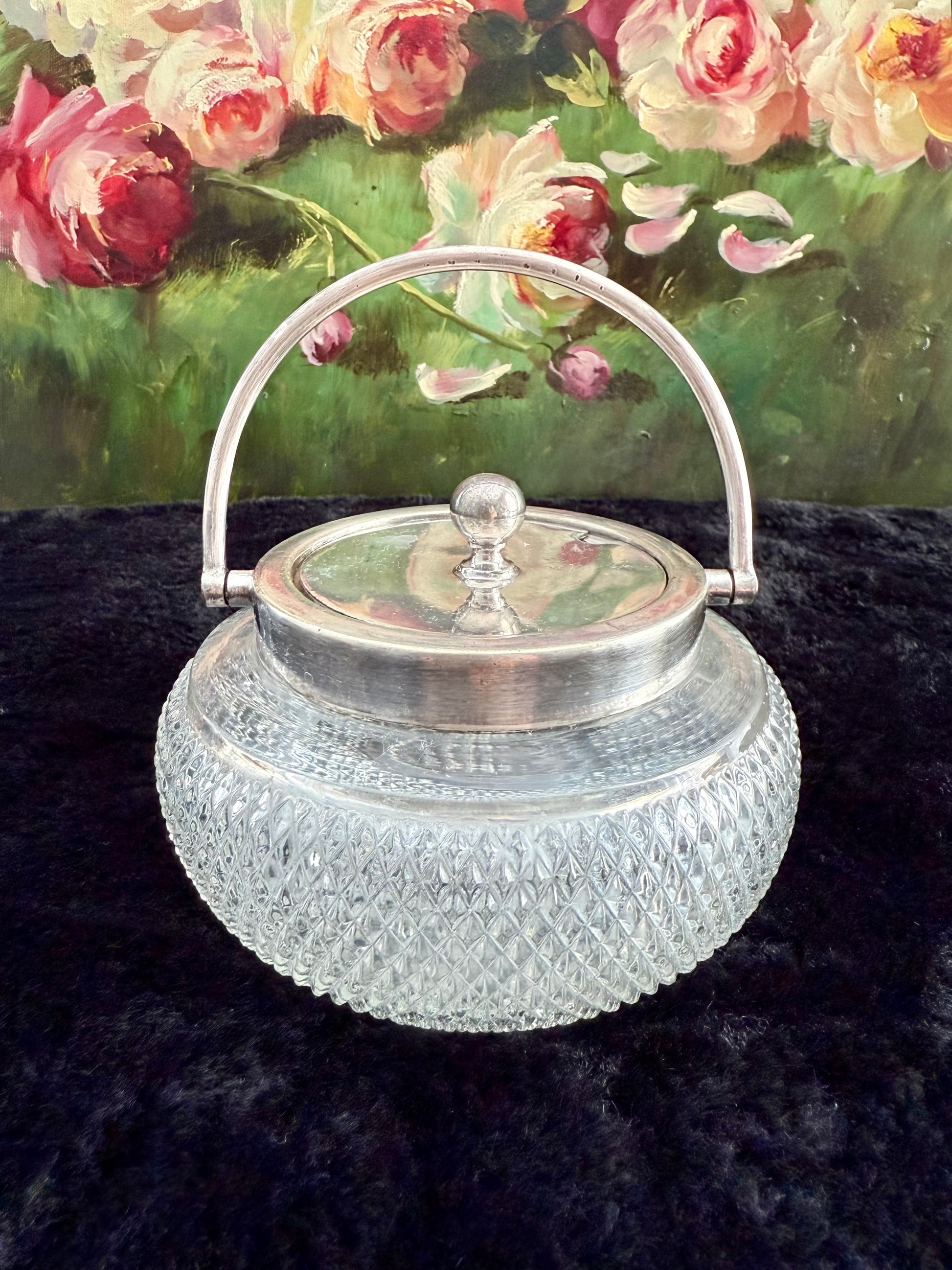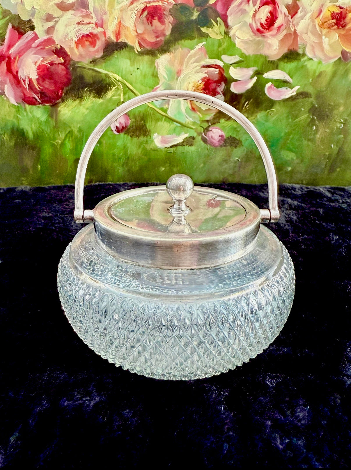 Antique Silver-Plated William Hutton & Sons British Cut Glass Biscuit Jar or Candy Holder with Lid and Handle