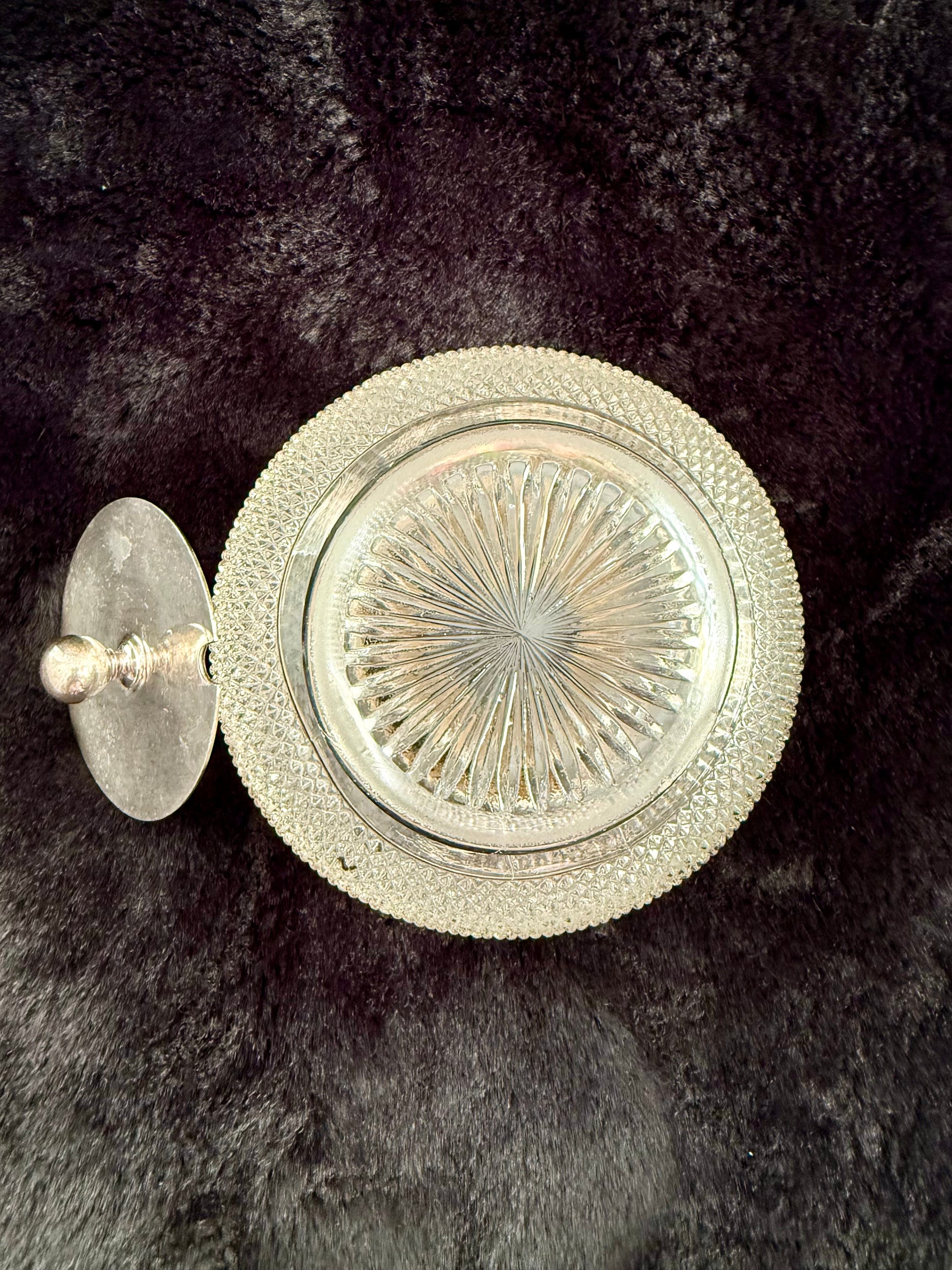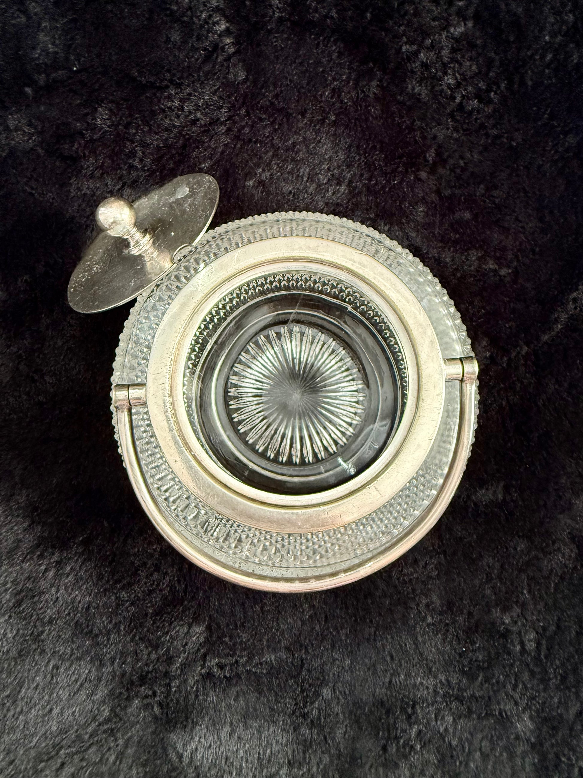 Antique silver-plated William Hutton & Sons cut glass biscuit jar or candy holder with lid and handle. It’s in very good vintage condition. There are two small black dots on the outside of the glass. They are probably paint that can be removed. They are visible, but not really noticeable. Marked. Made in Britain.