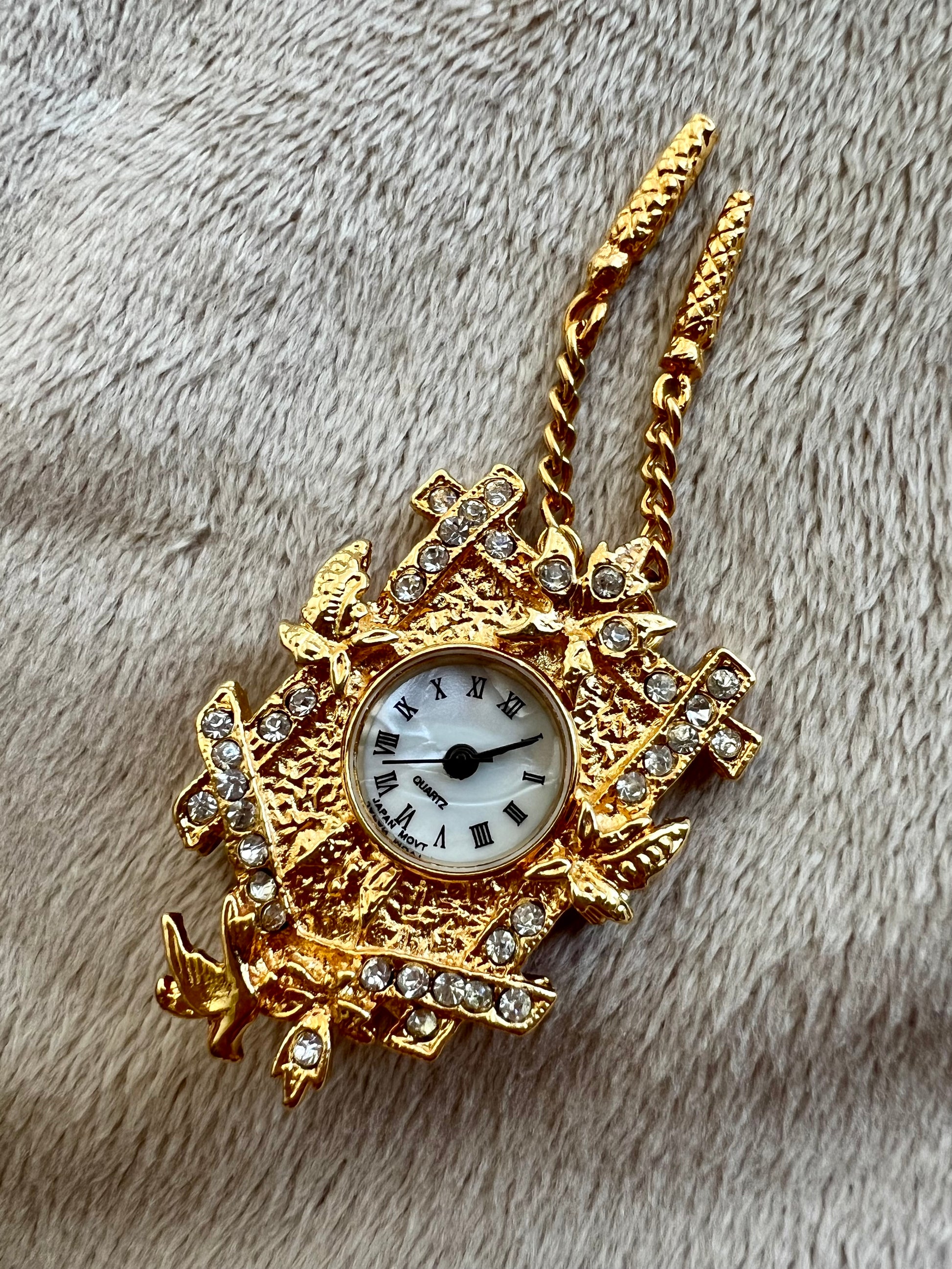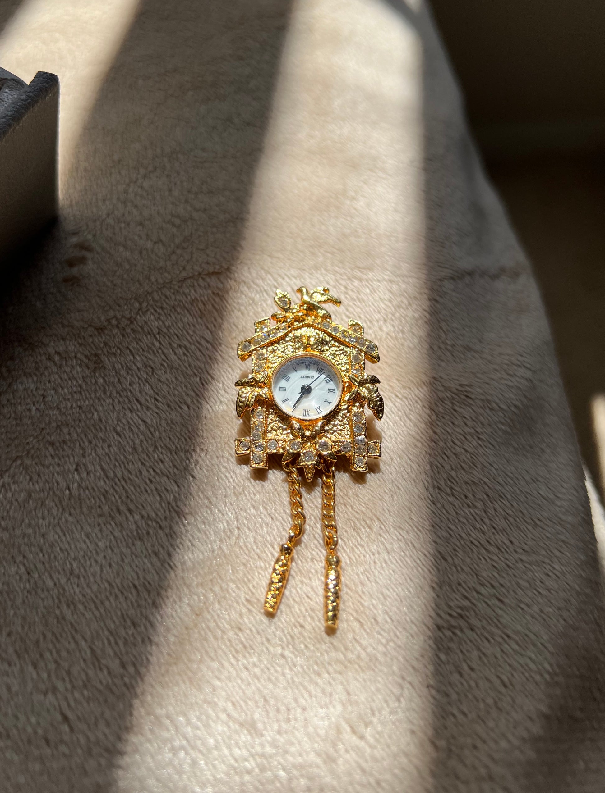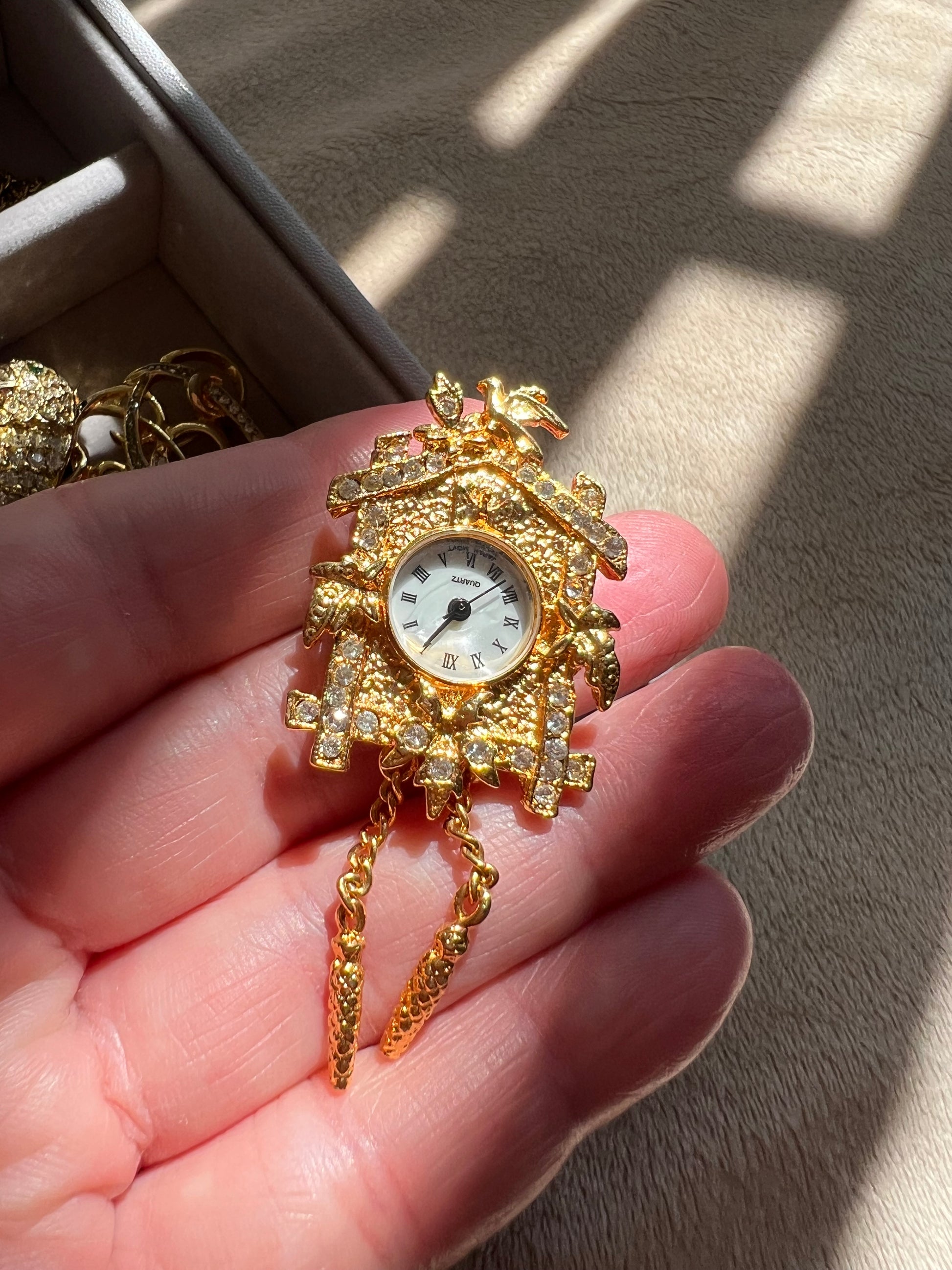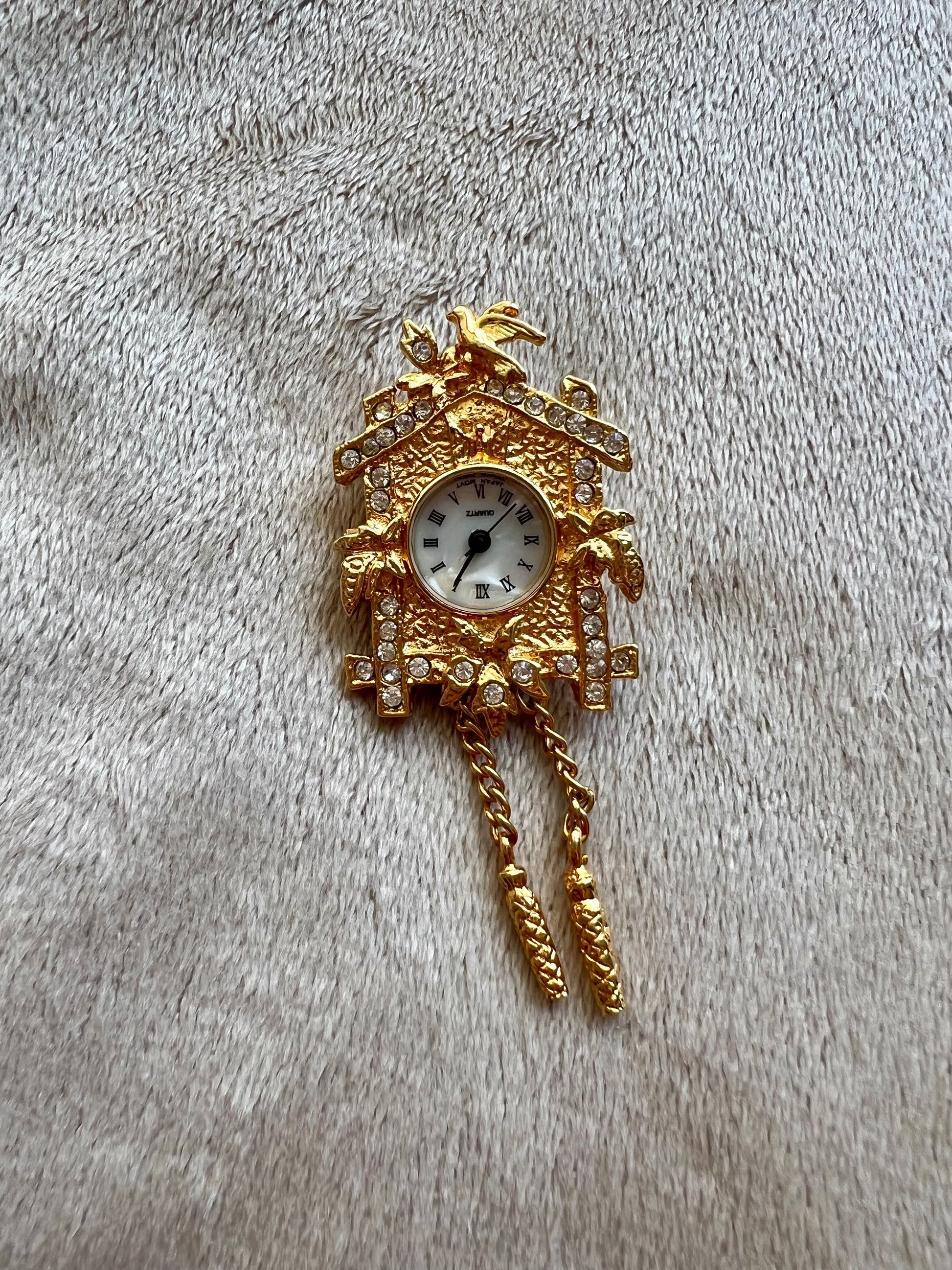 Crystals gold tone cuckoo clock Japan vintage brooch