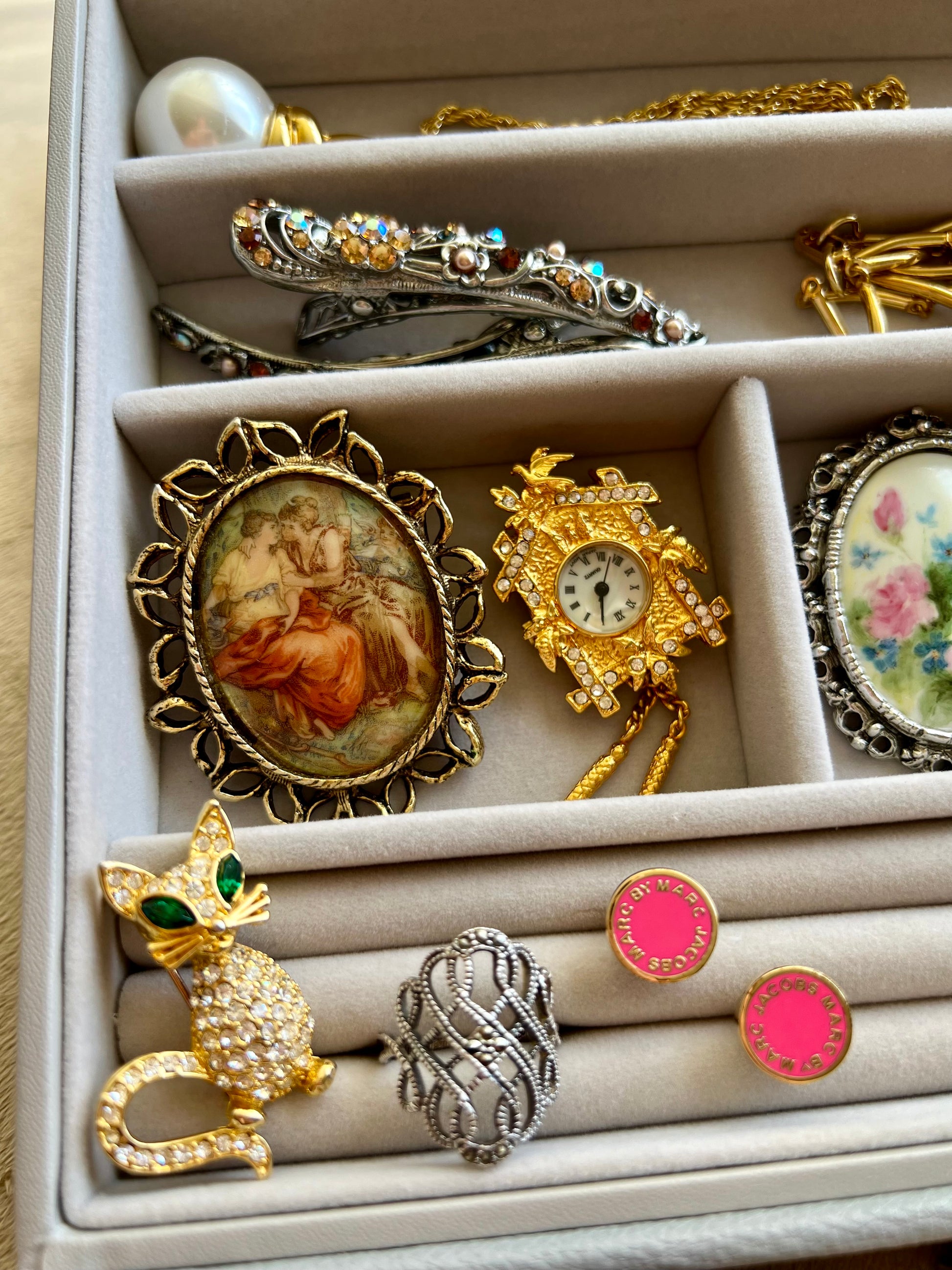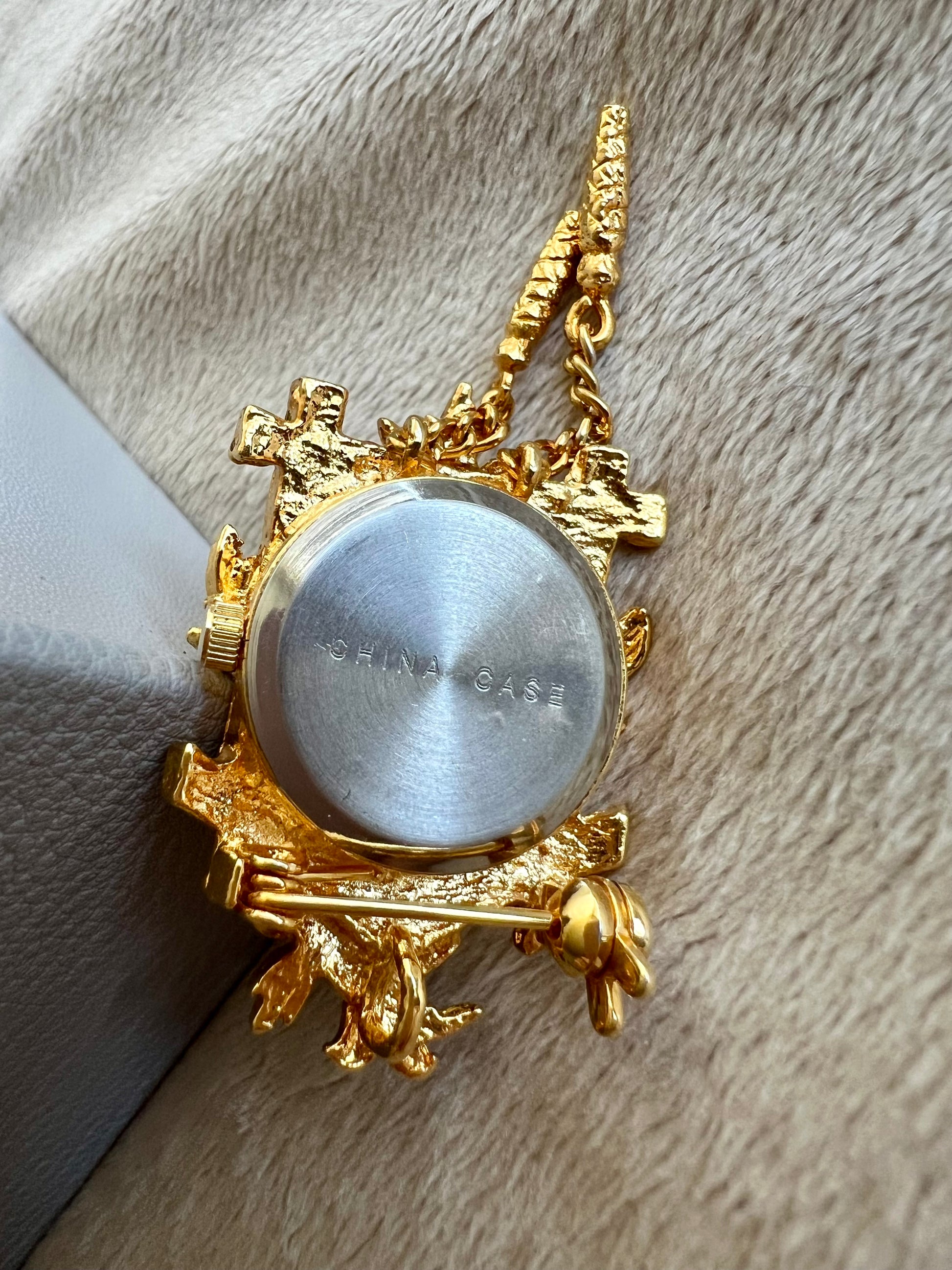 Beautiful vintage brooch or pendant. The clock dial is upside down. Need to be turned manually. In need of change of battery. Excellent condition.