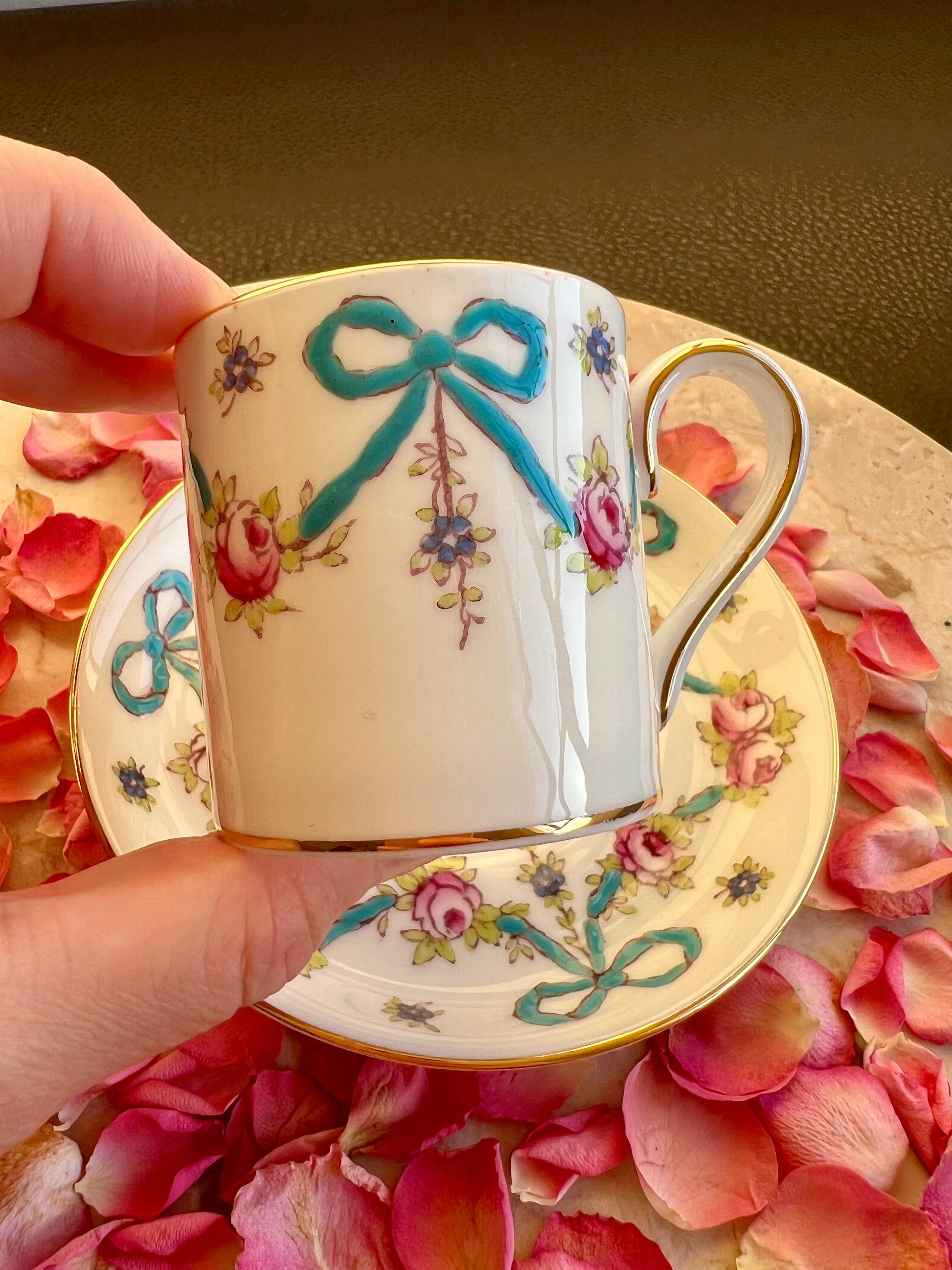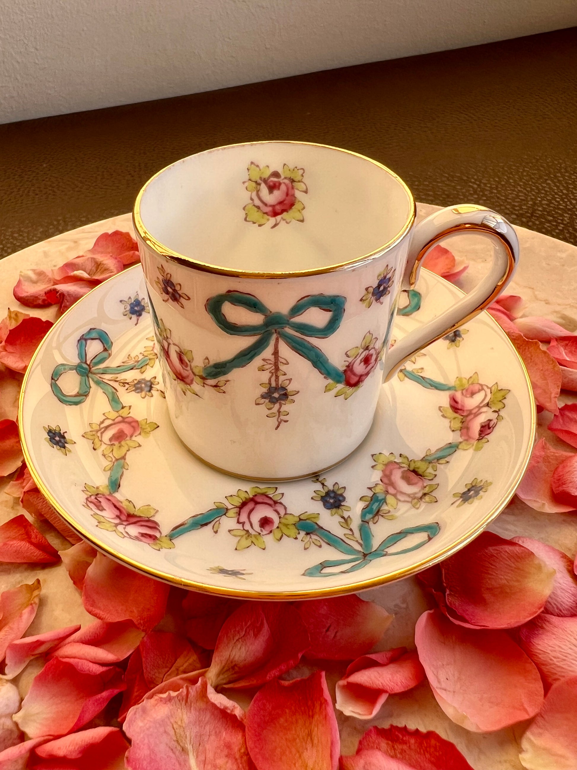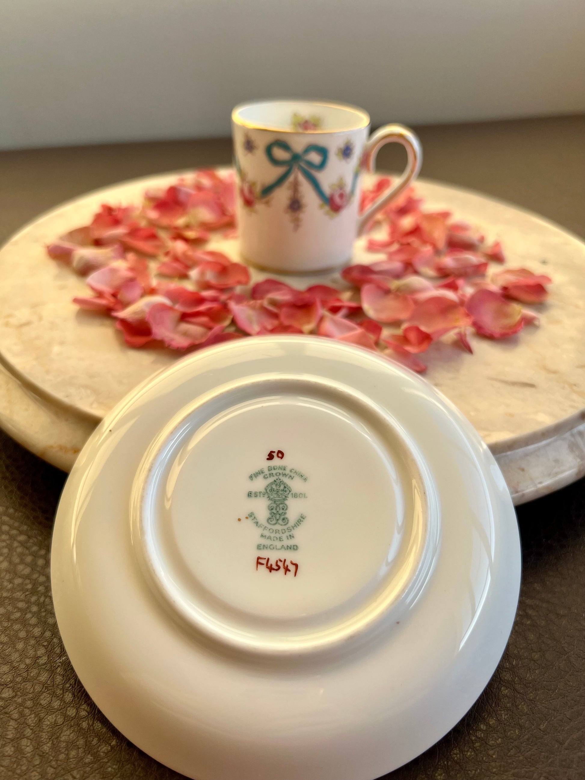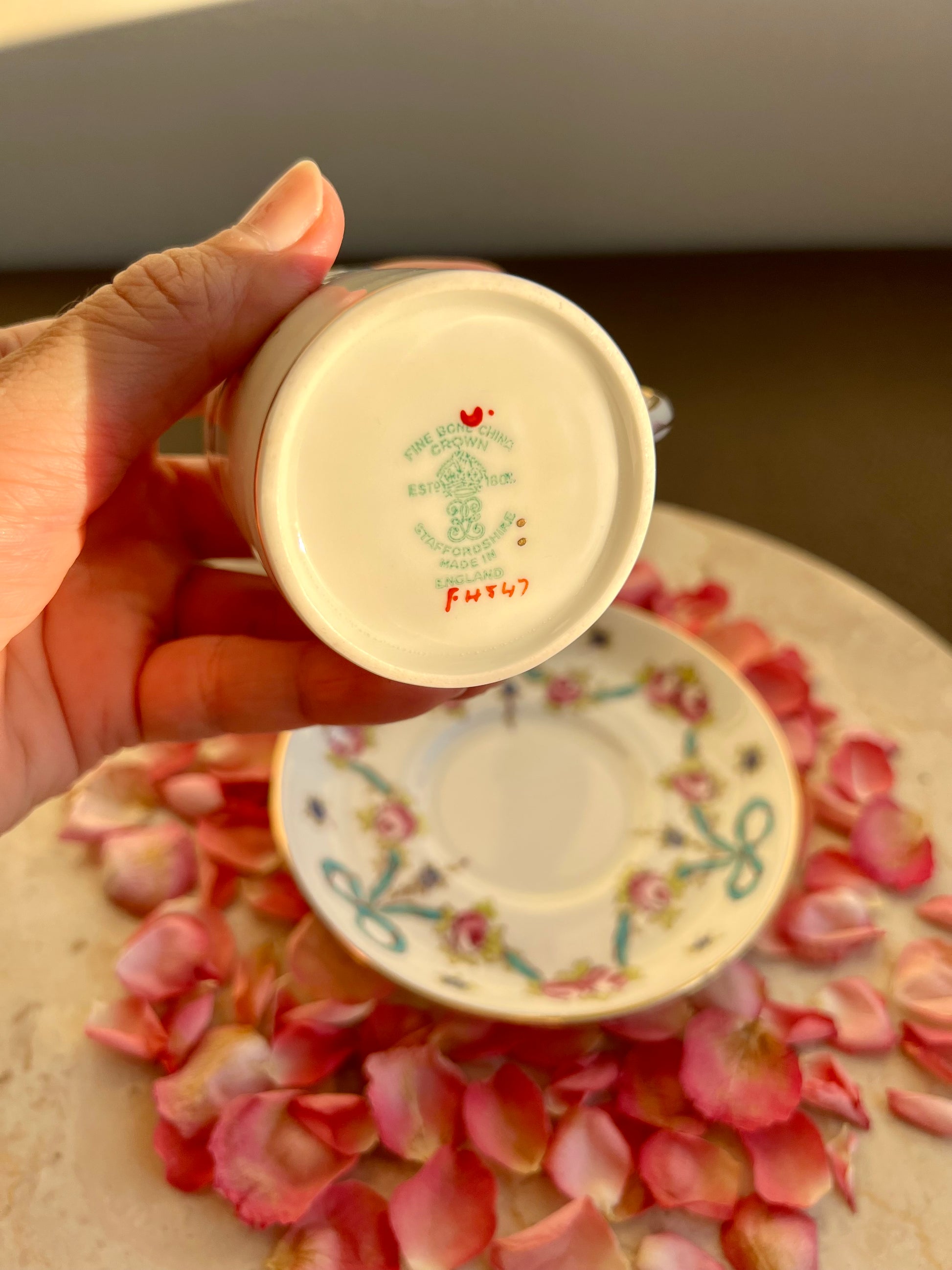 Beautiful Crown Staffordshire demitasse coffee cup and saucer, Blue-Bow pattern from 1940-50's. The cup and saucer hand decorated in enamel and 24k gilding with a pink rose on the interior. It’s in excellent vintage condition.