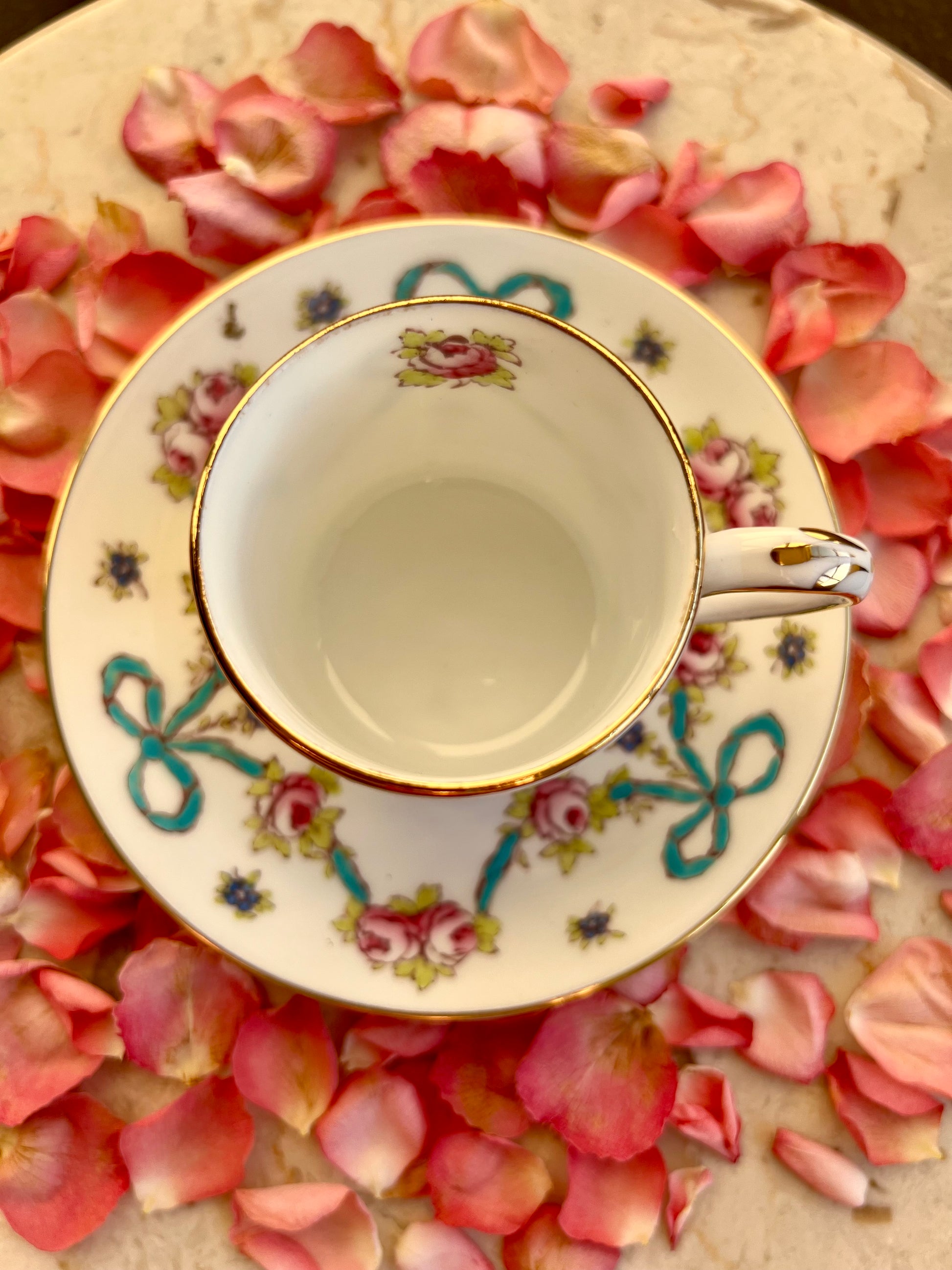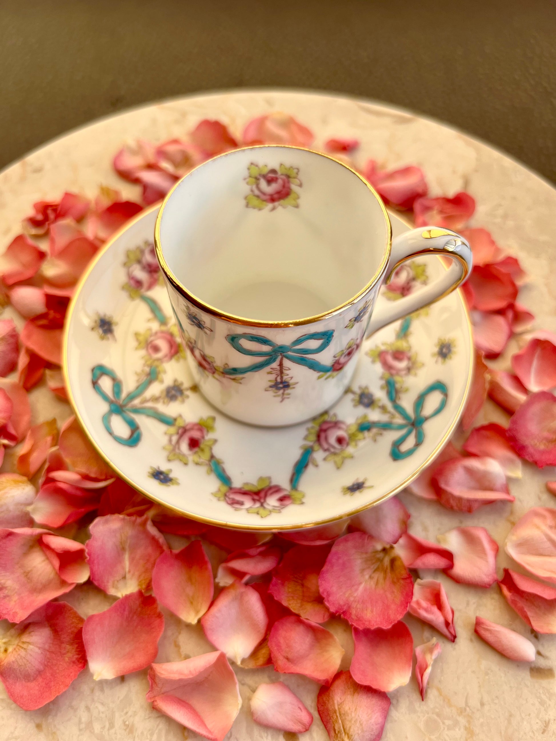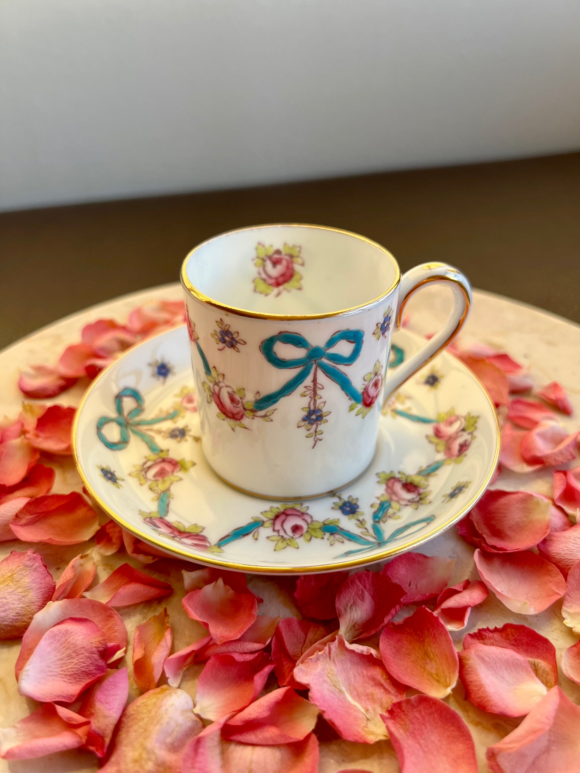 Beautiful Crown Staffordshire demitasse coffee cup and saucer, Blue-Bow pattern from 1940-50's. The cup and saucer hand decorated in enamel and 24k gilding with a pink rose on the interior. It’s in excellent vintage condition.