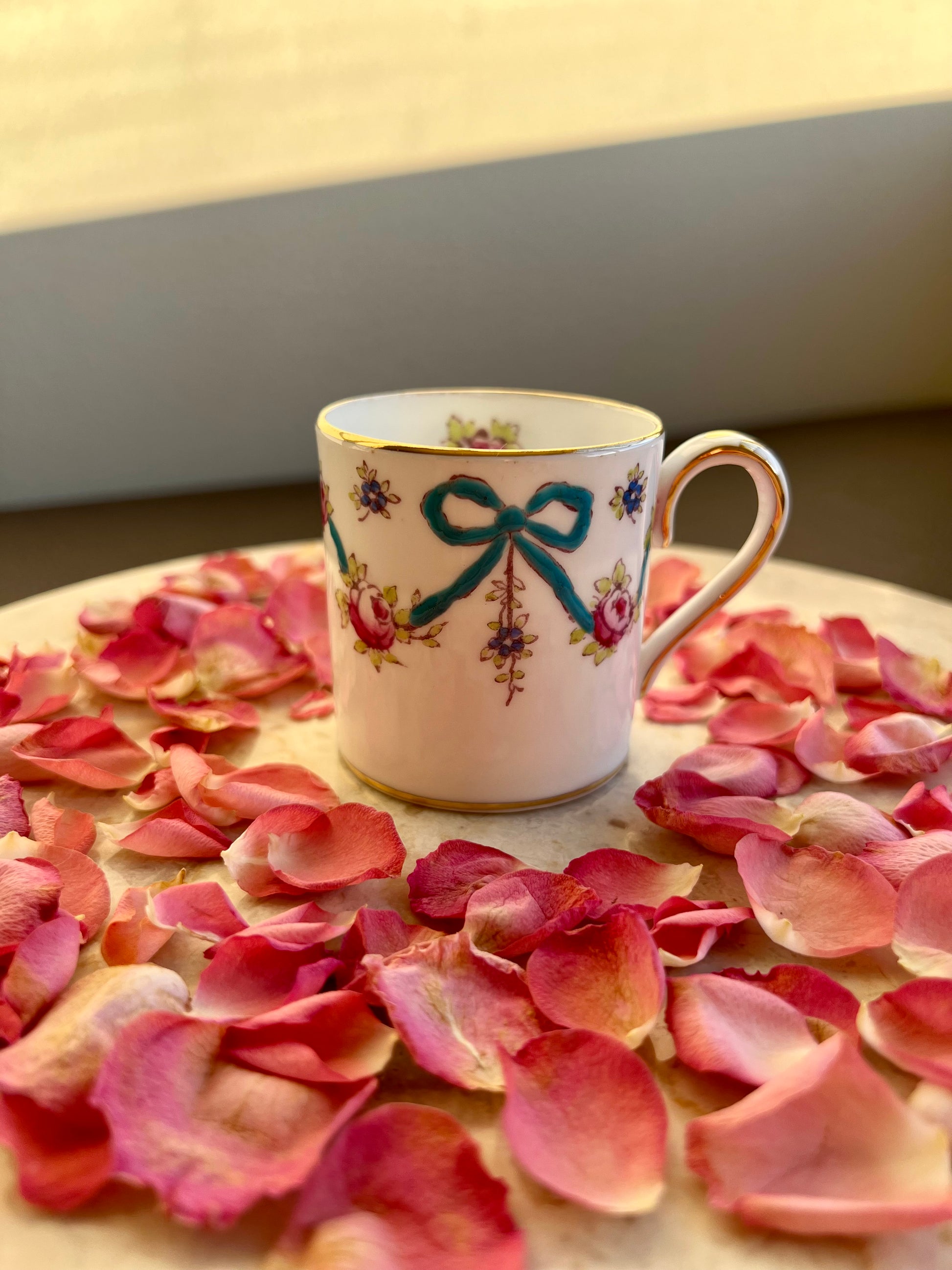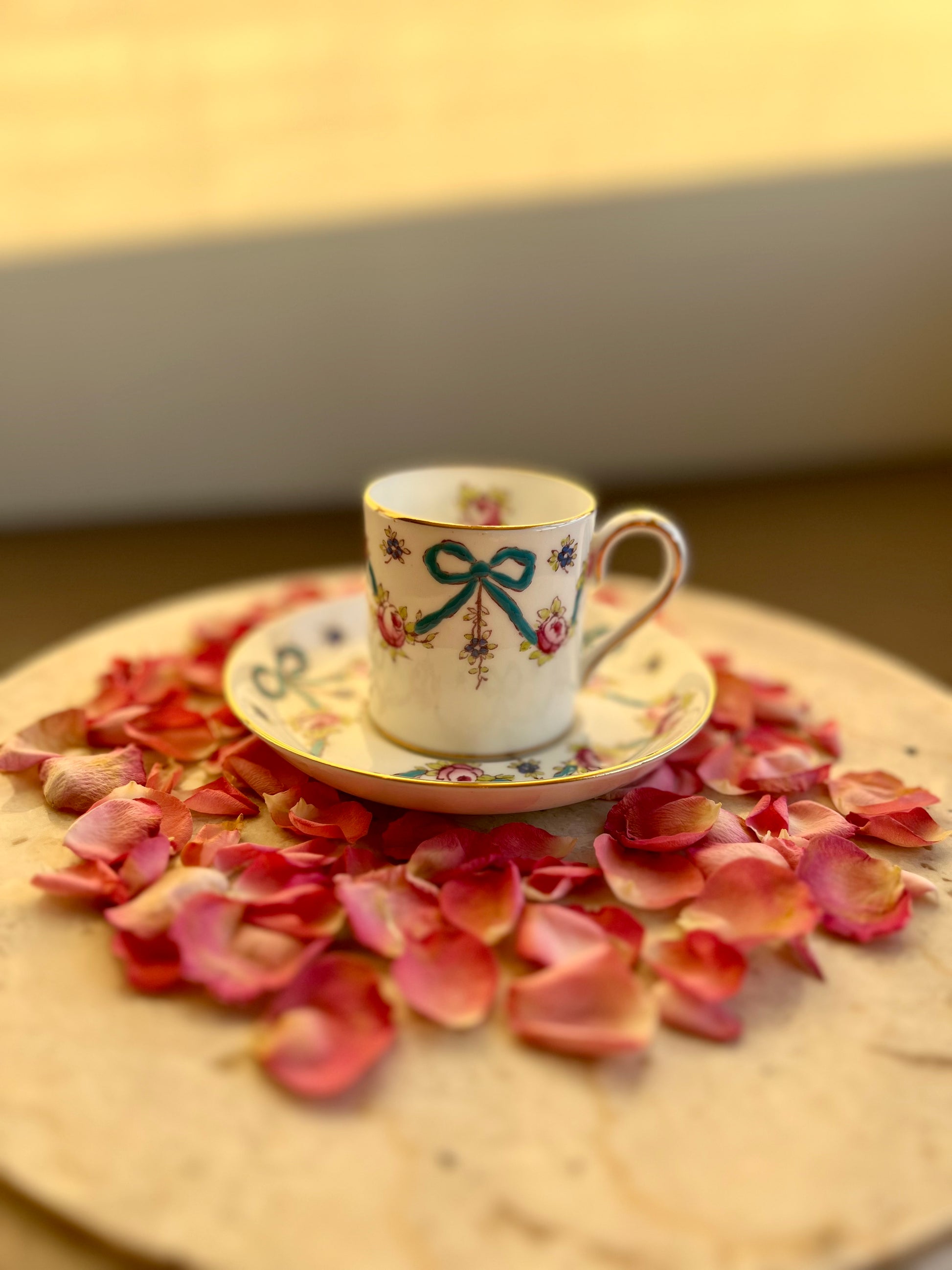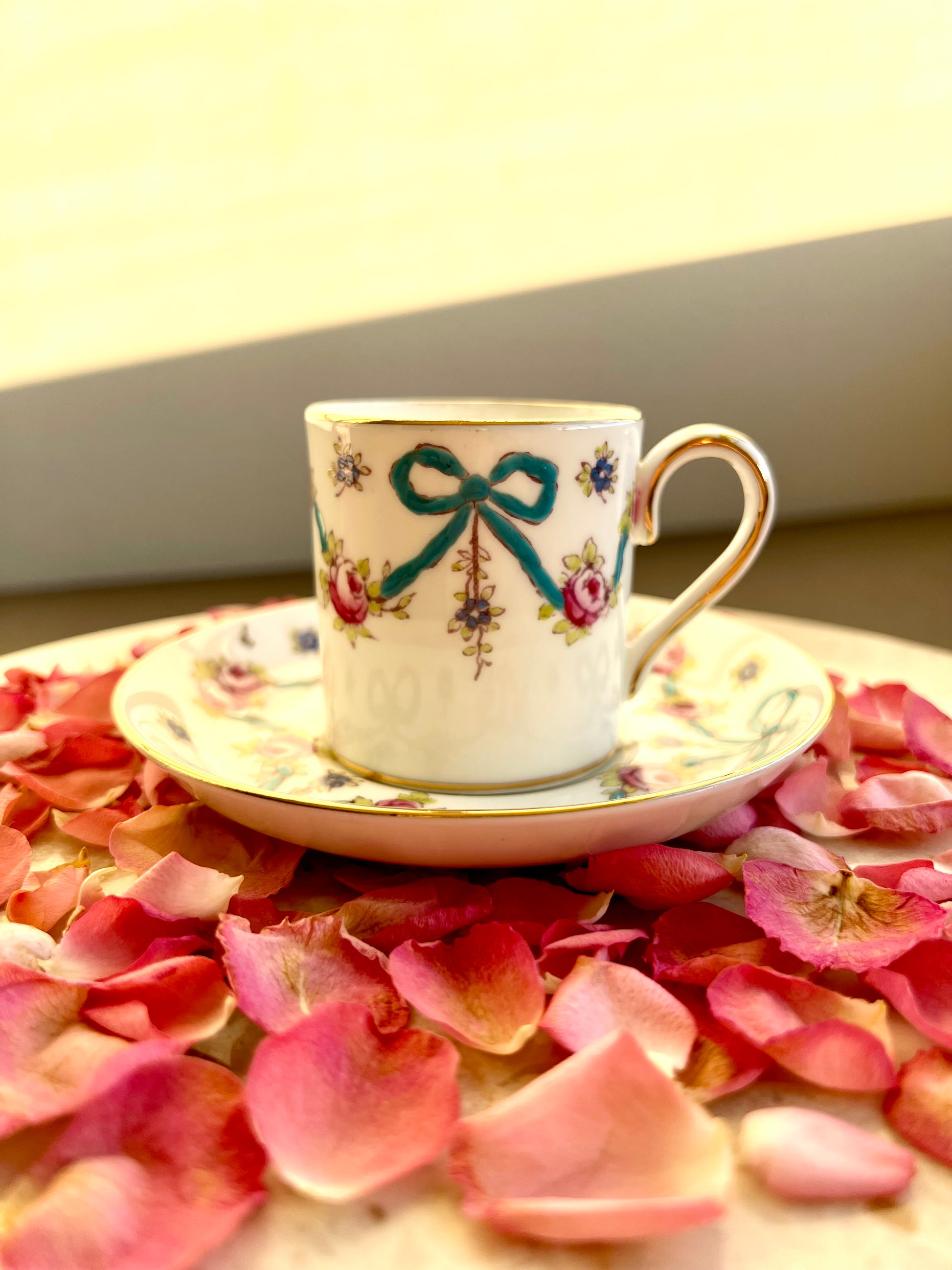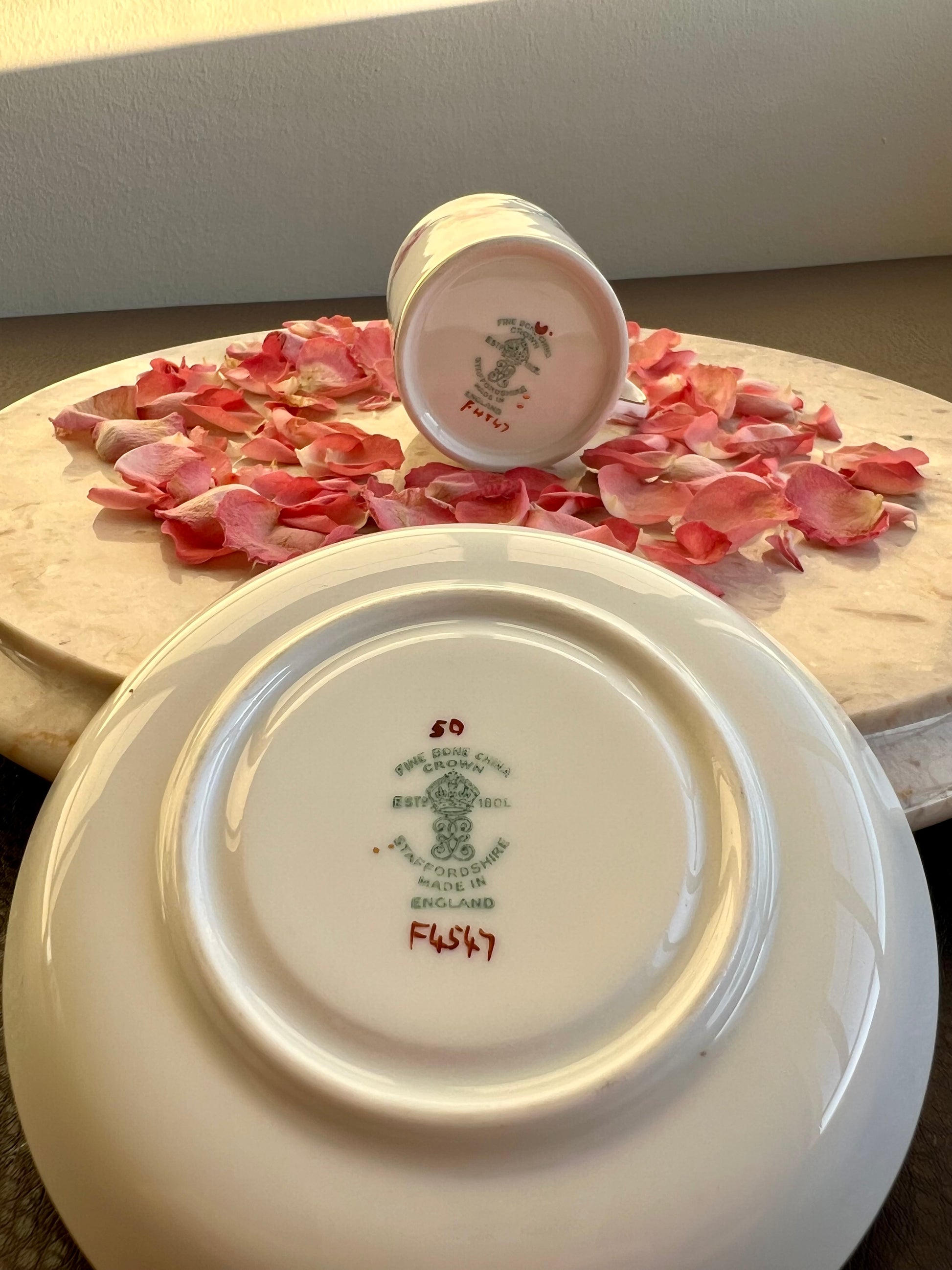 Beautiful Crown Staffordshire demitasse coffee cup and saucer, Blue-Bow pattern from 1940-50's. The cup and saucer hand decorated in enamel and 24k gilding with a pink rose on the interior. It’s in excellent vintage condition.
