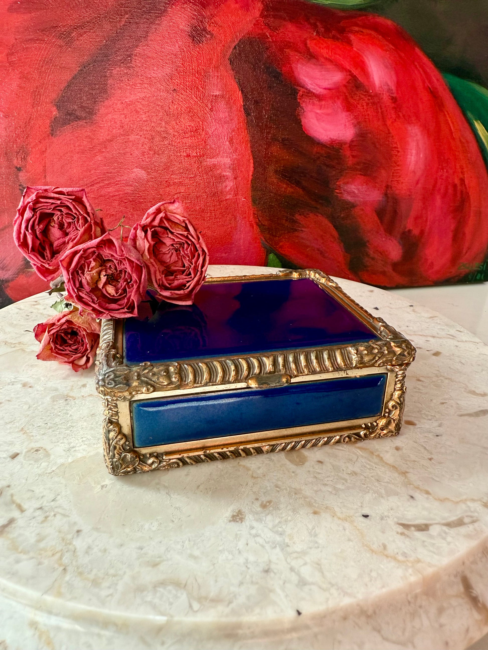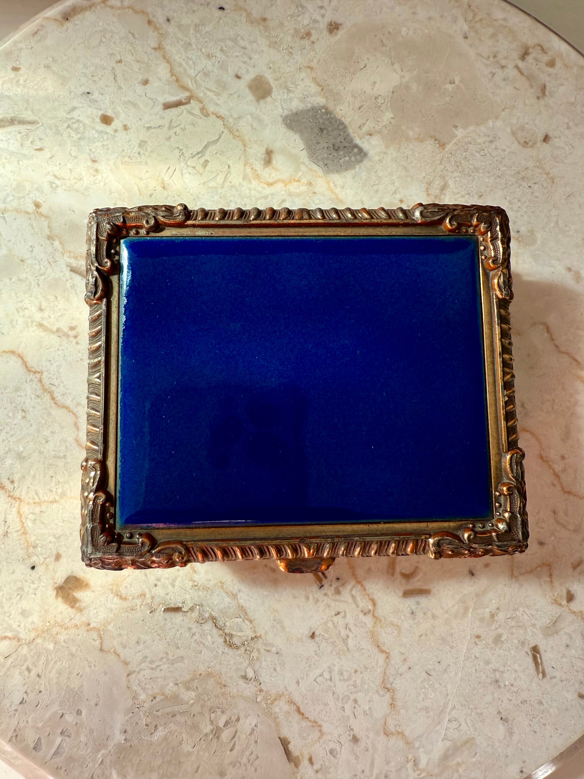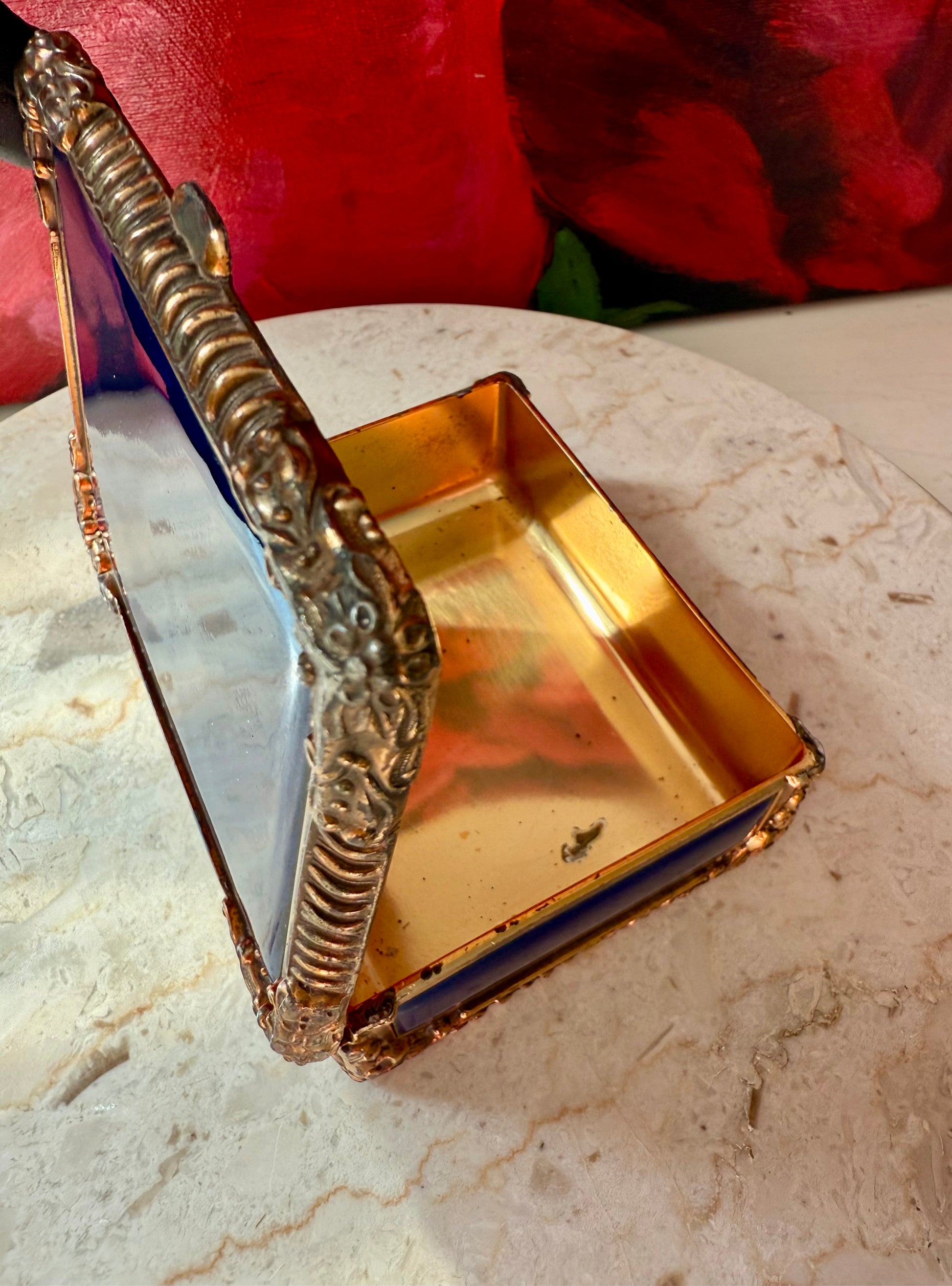 Beautiful very unique Royal Bovano Italian style cobalt blue enamel vintage cigarette case or jewelry box from the 1950s or 1960s. It’s in very good vintage condition. There is slight wear on the metal parts due to the age of the product. The box is very heavy.