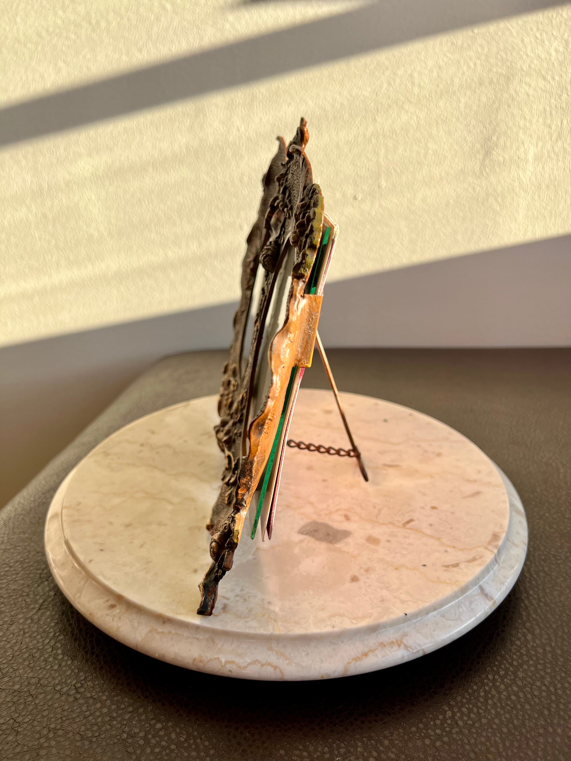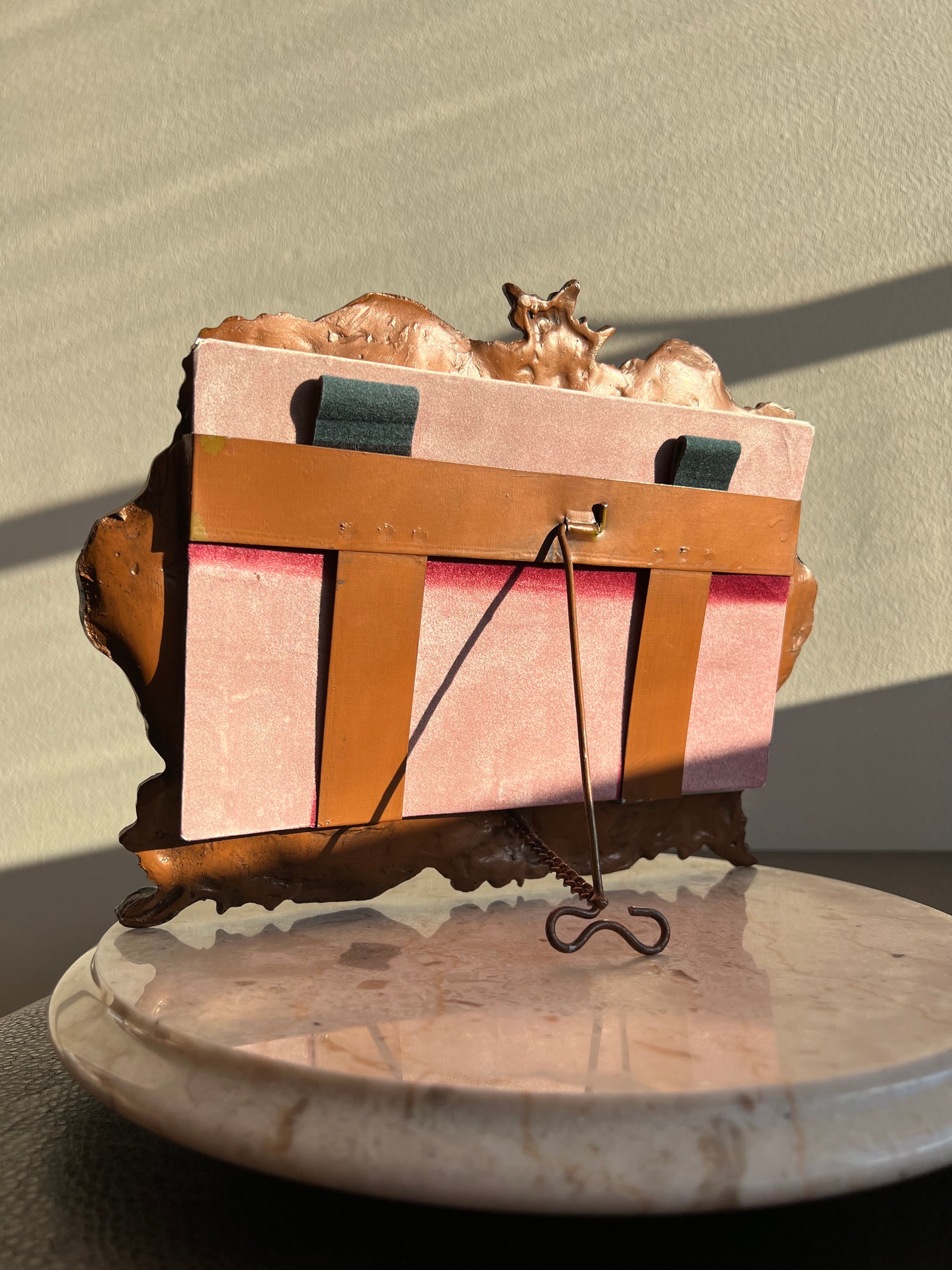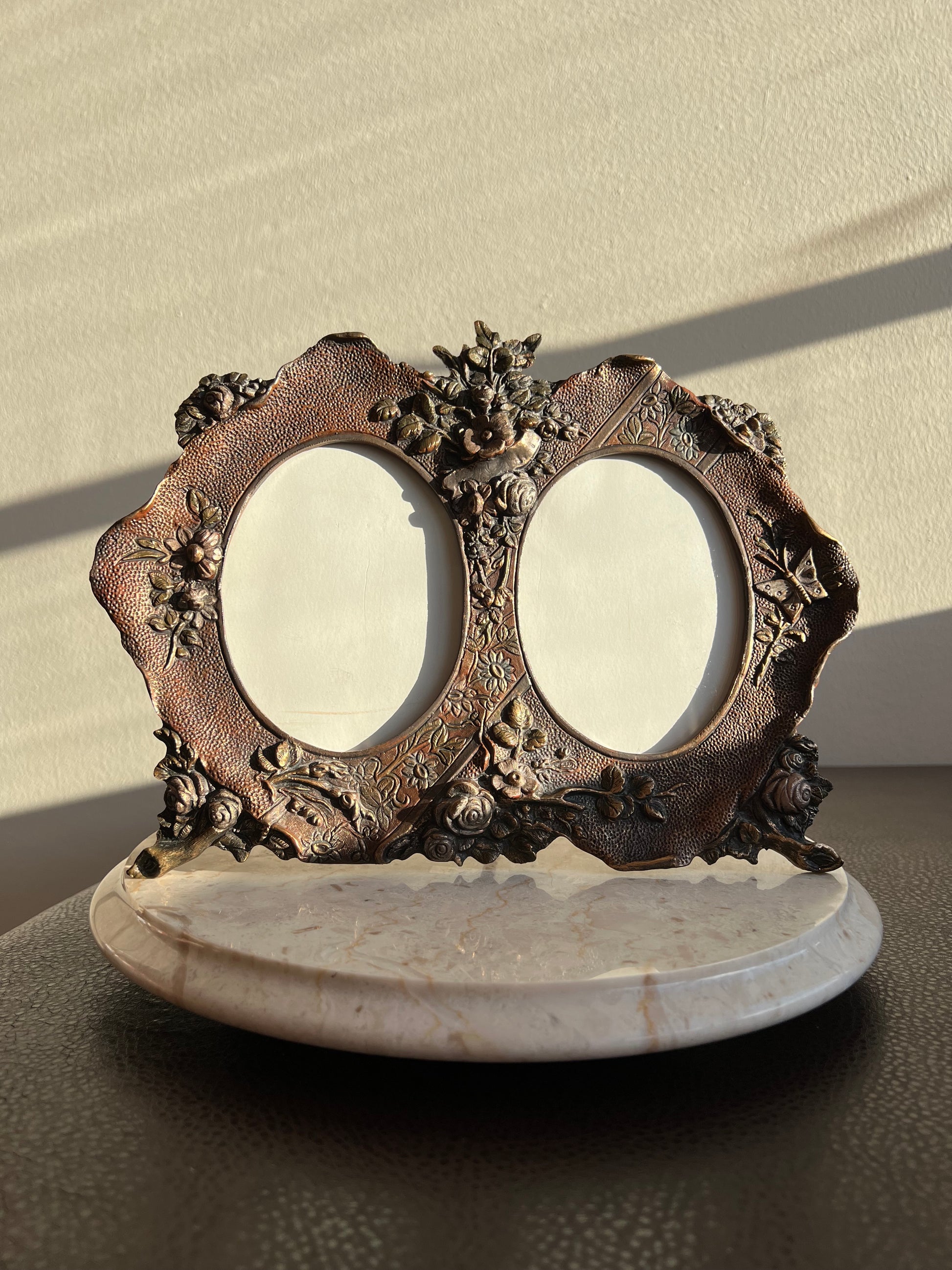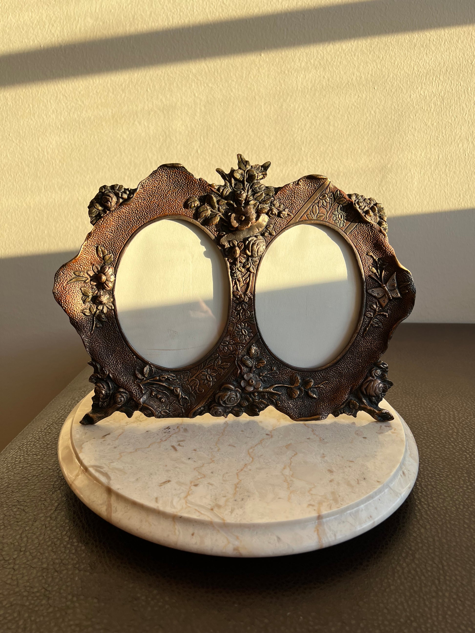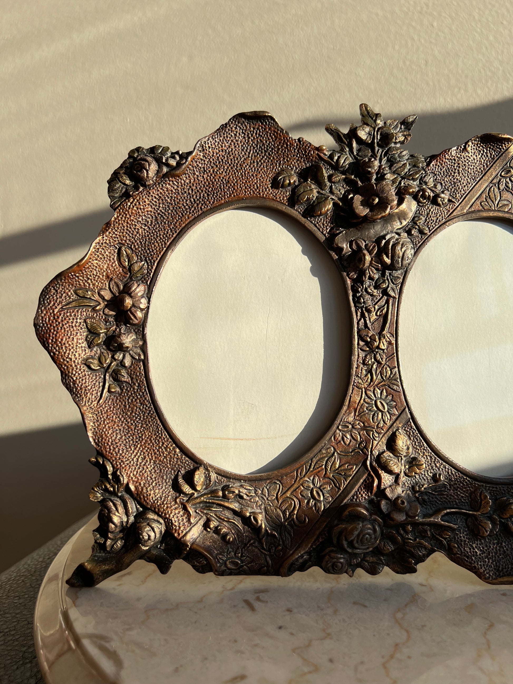 Beautiful antique/ vintage decorative Victorian style double copper oval picture/ photo frame with easel back. It has an embossed pattern of roses and butterfly. It’s in excellent vintage condition.(and very heavy:)