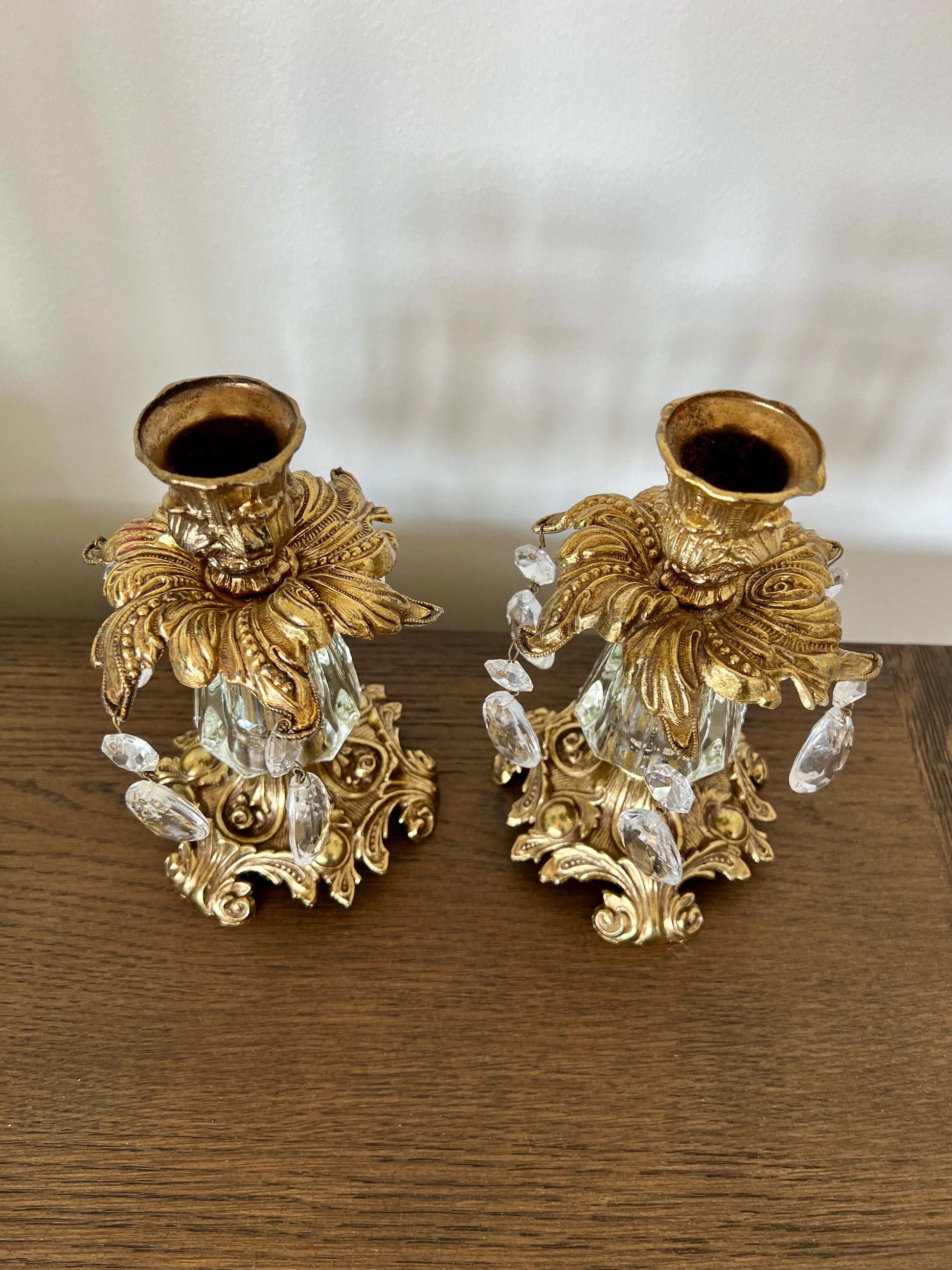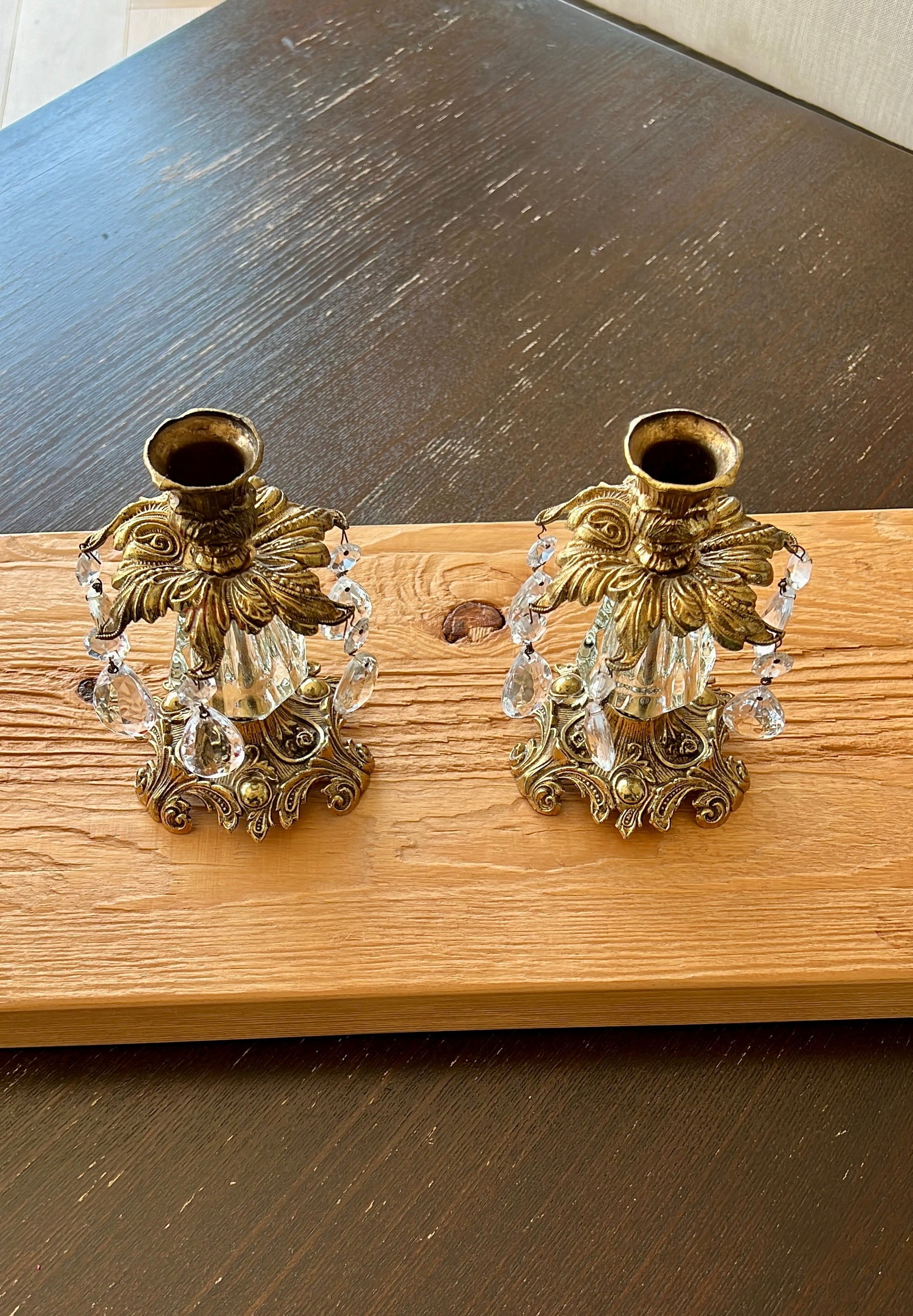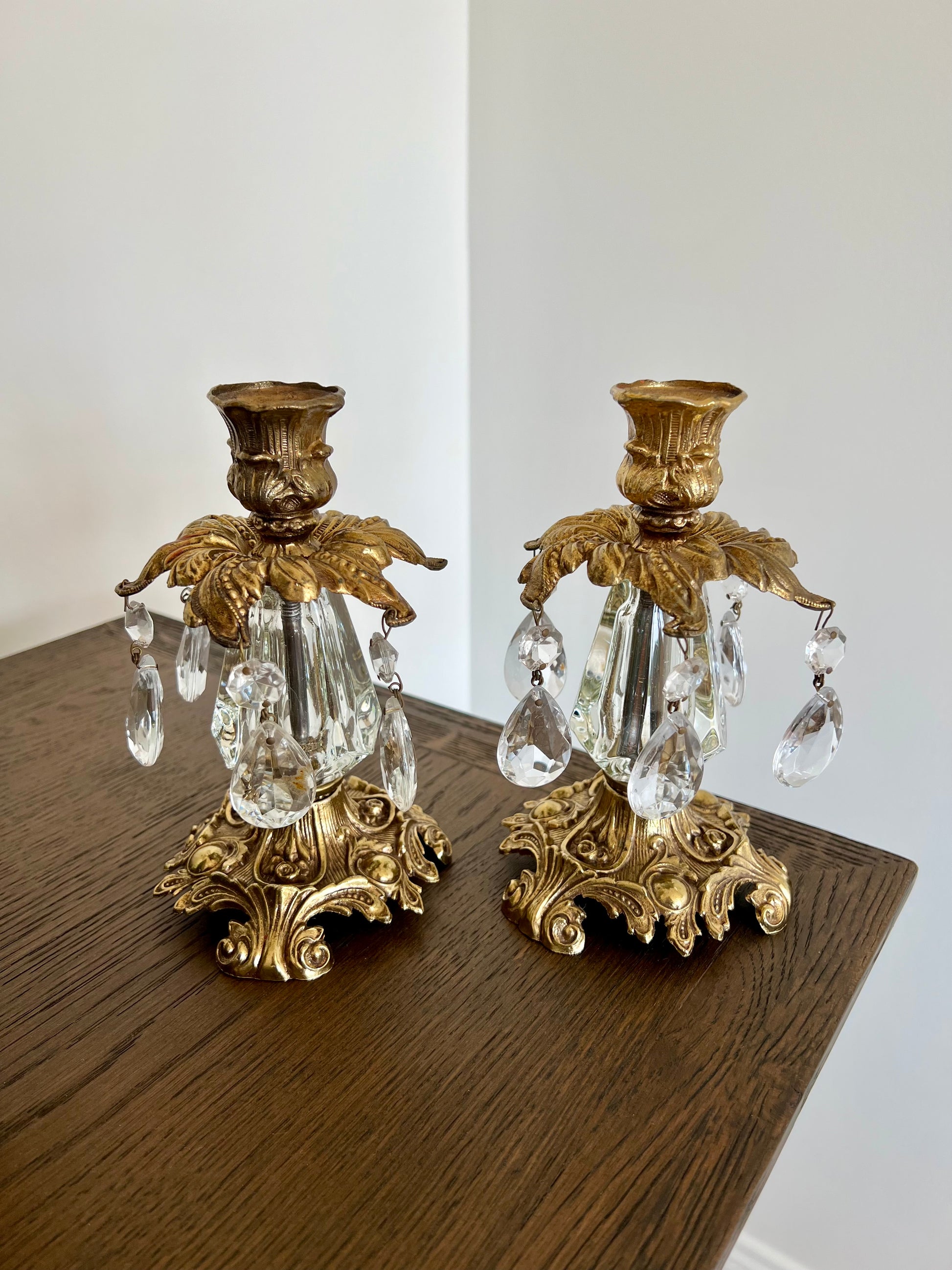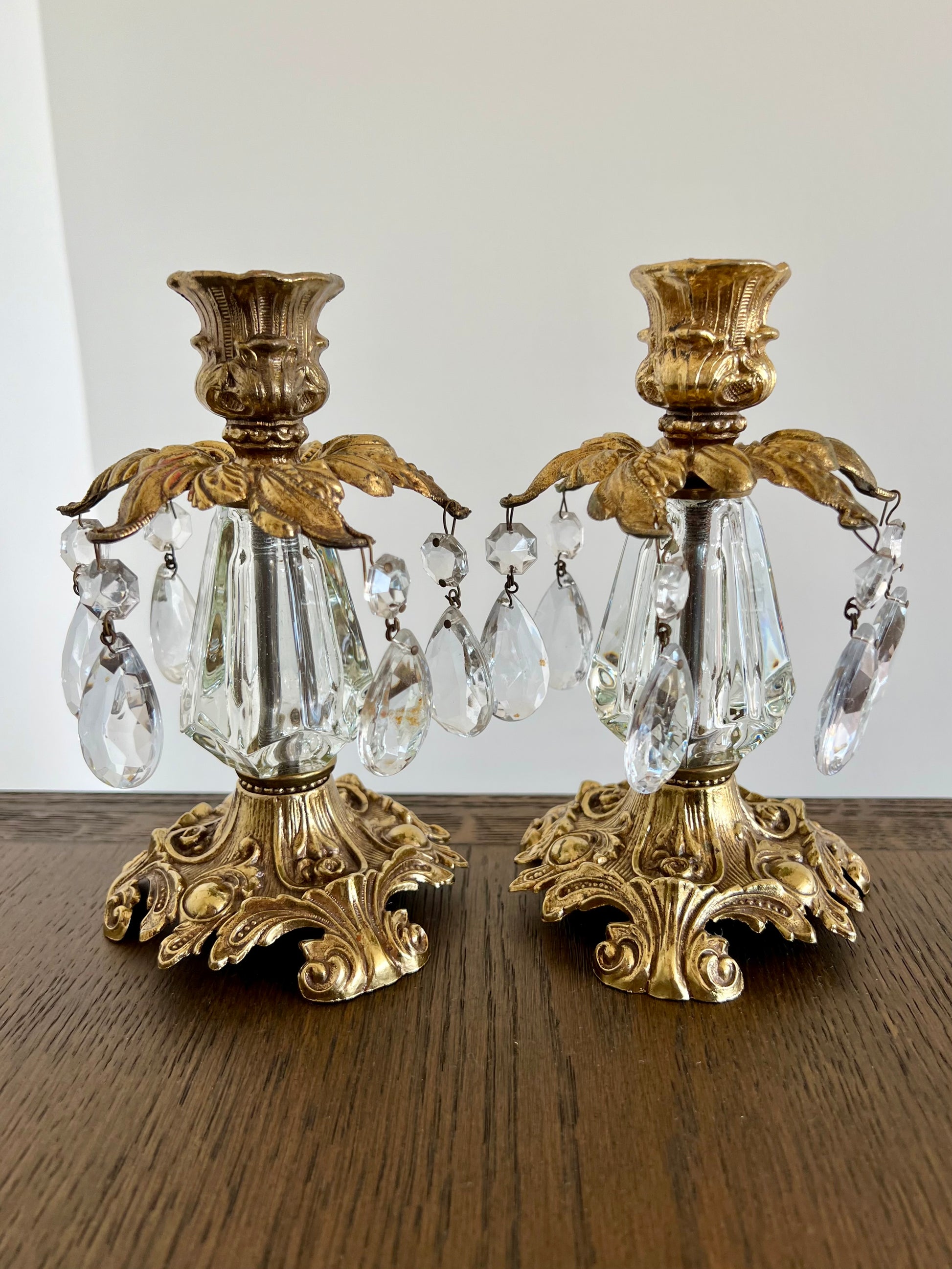 Beautiful vintage baroque style brass candle holders with hanging crystal prisms and ornate golden design. These are in very good condition.