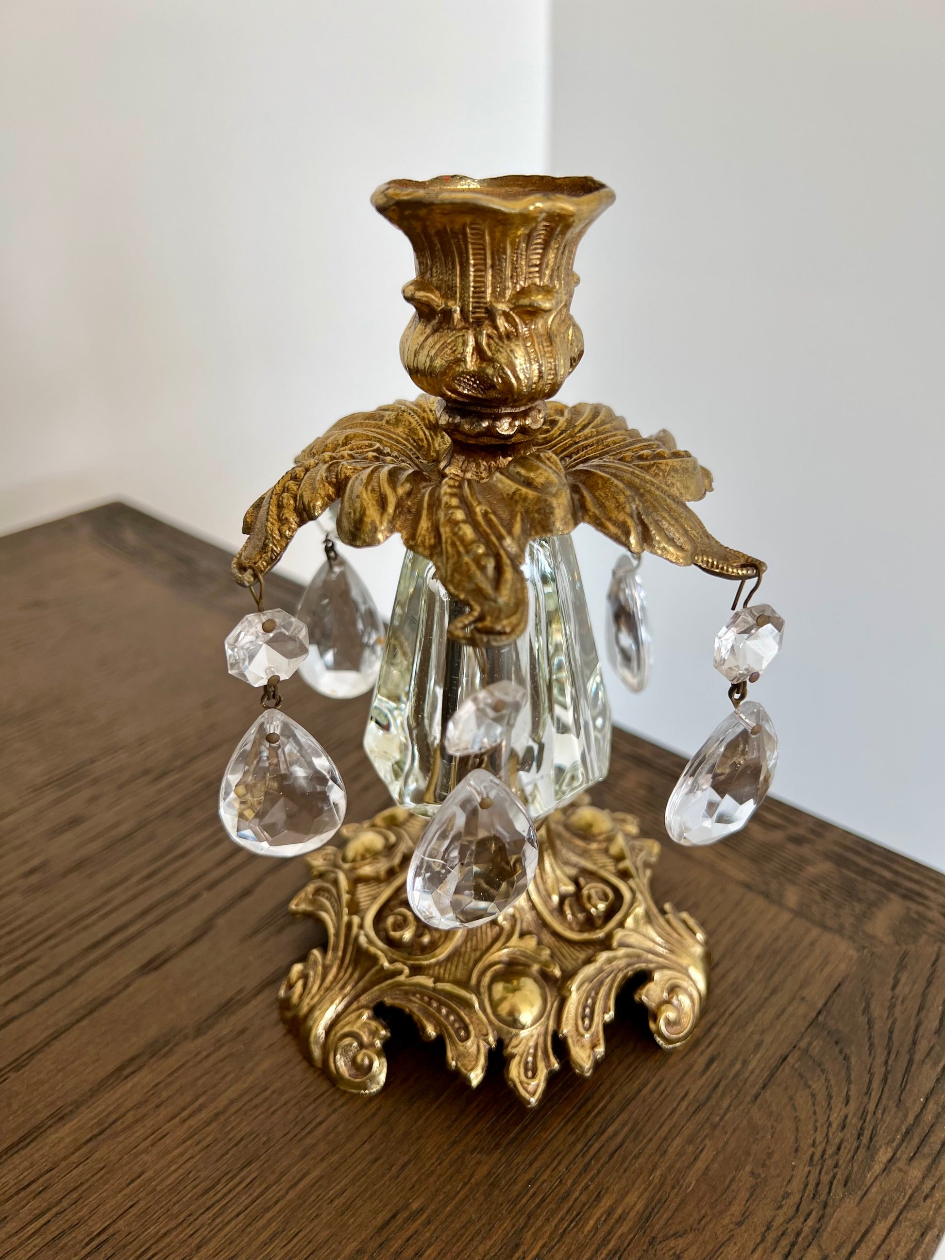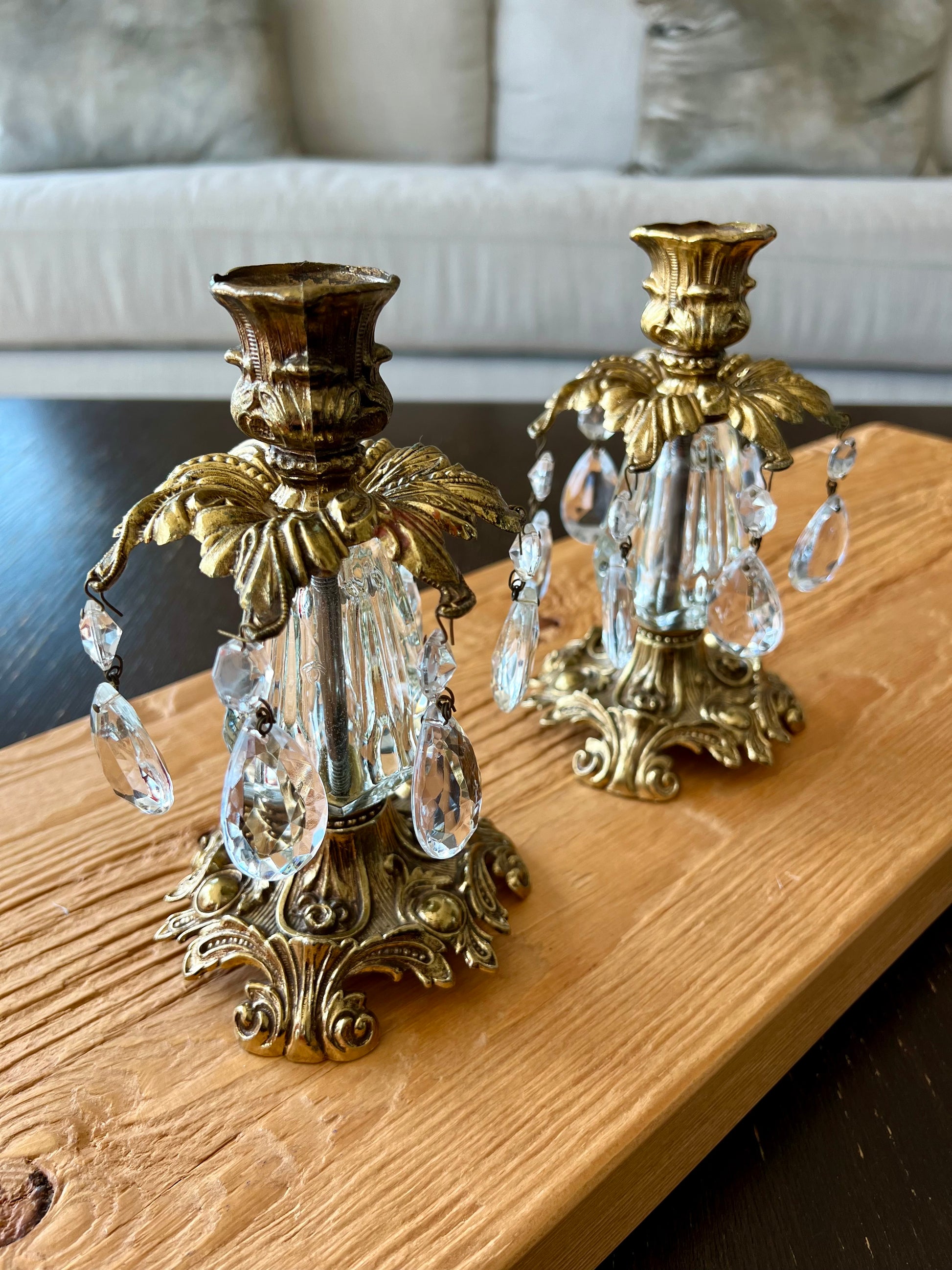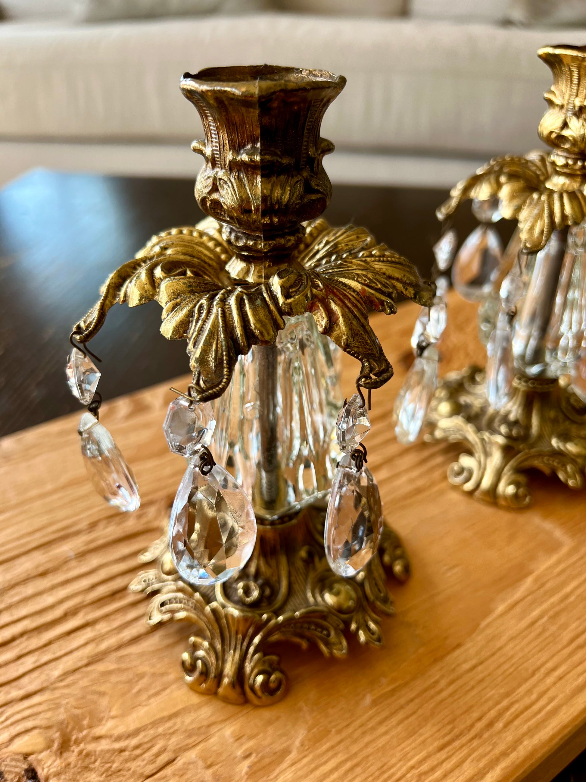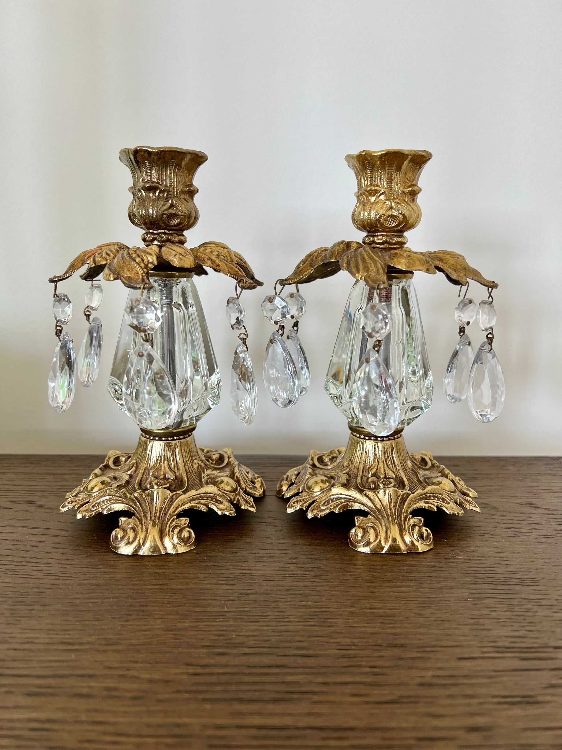 Beautiful vintage baroque style brass candle holders with hanging crystal prisms and ornate golden design. These are in very good condition.