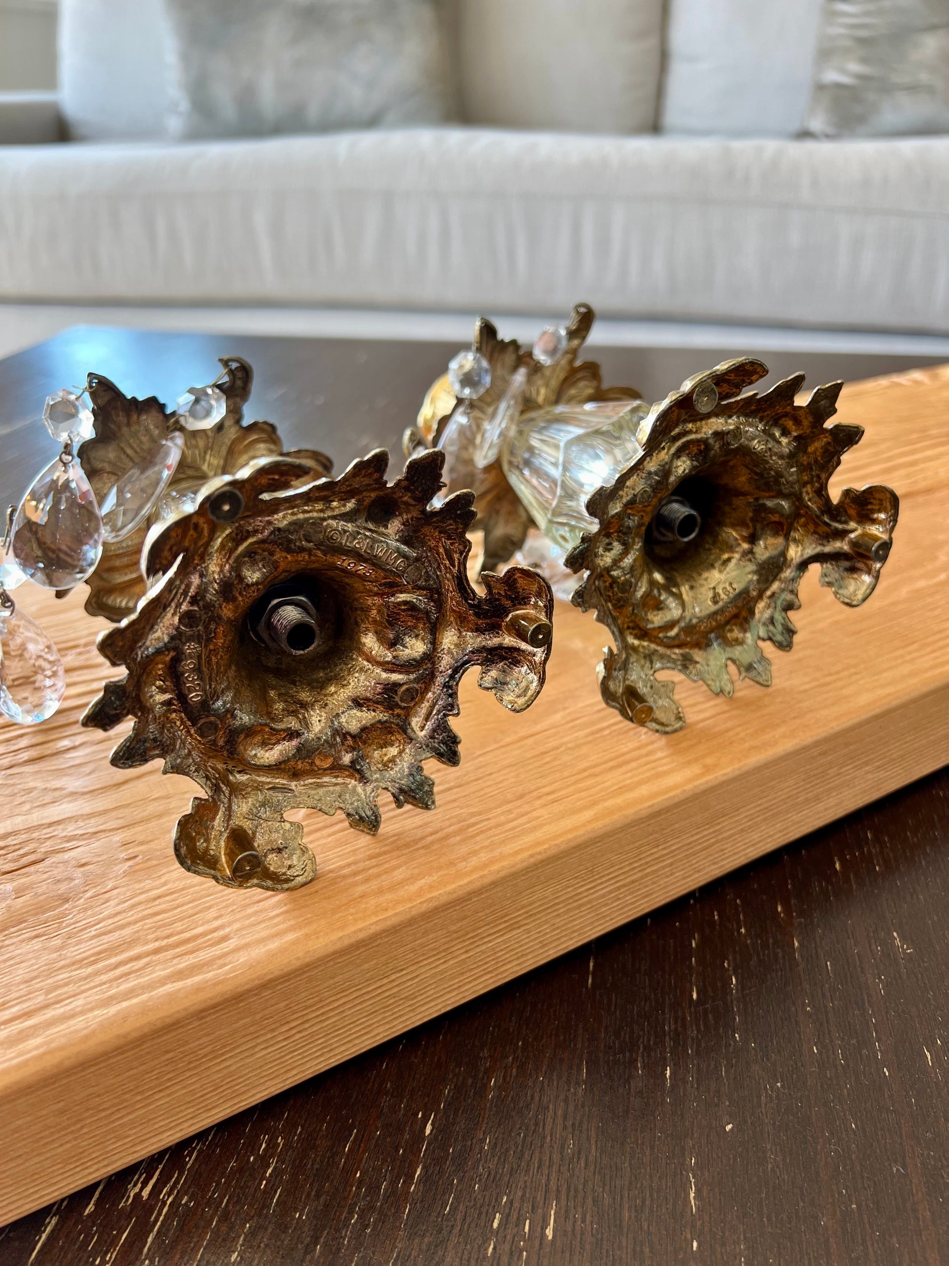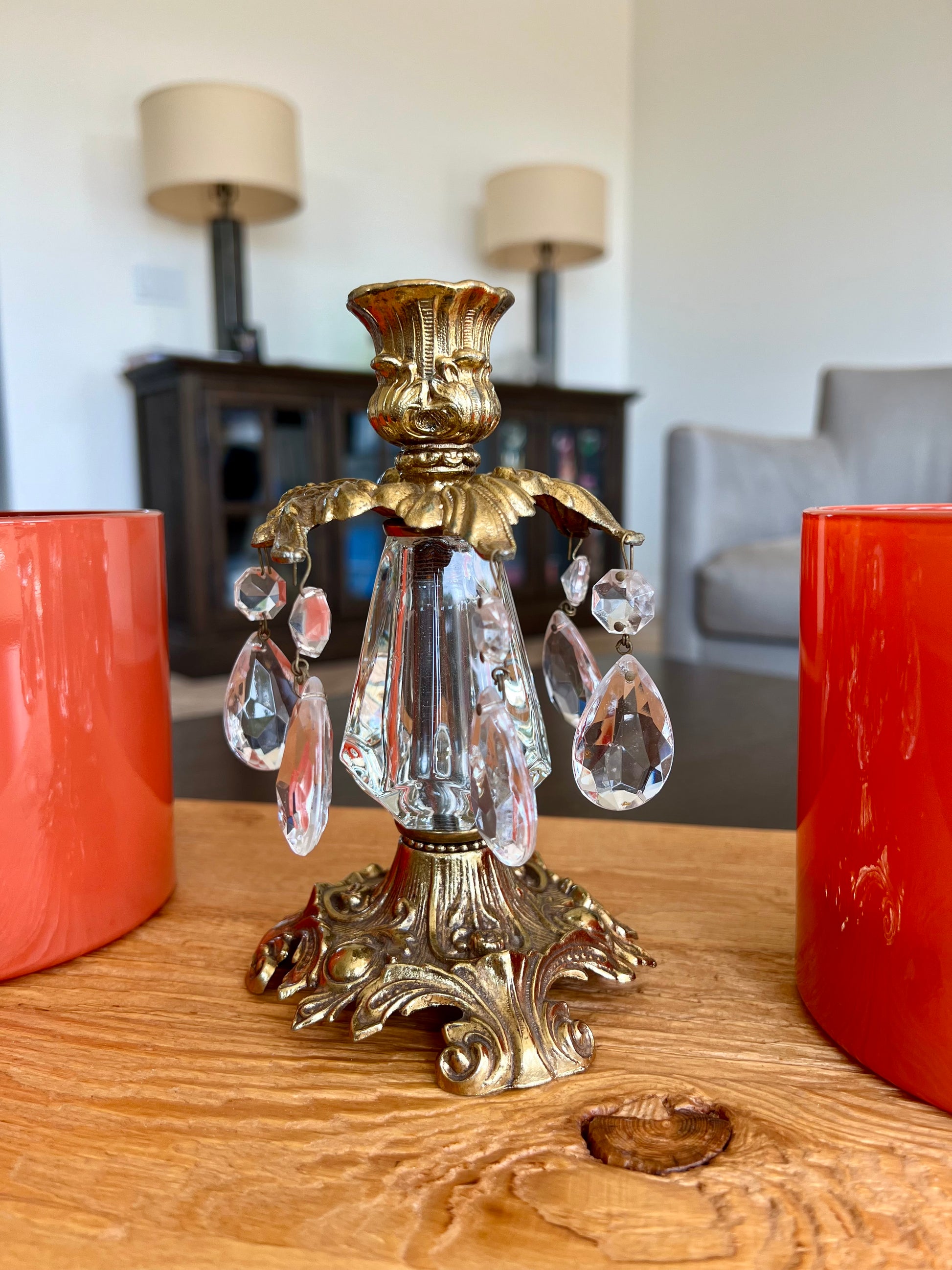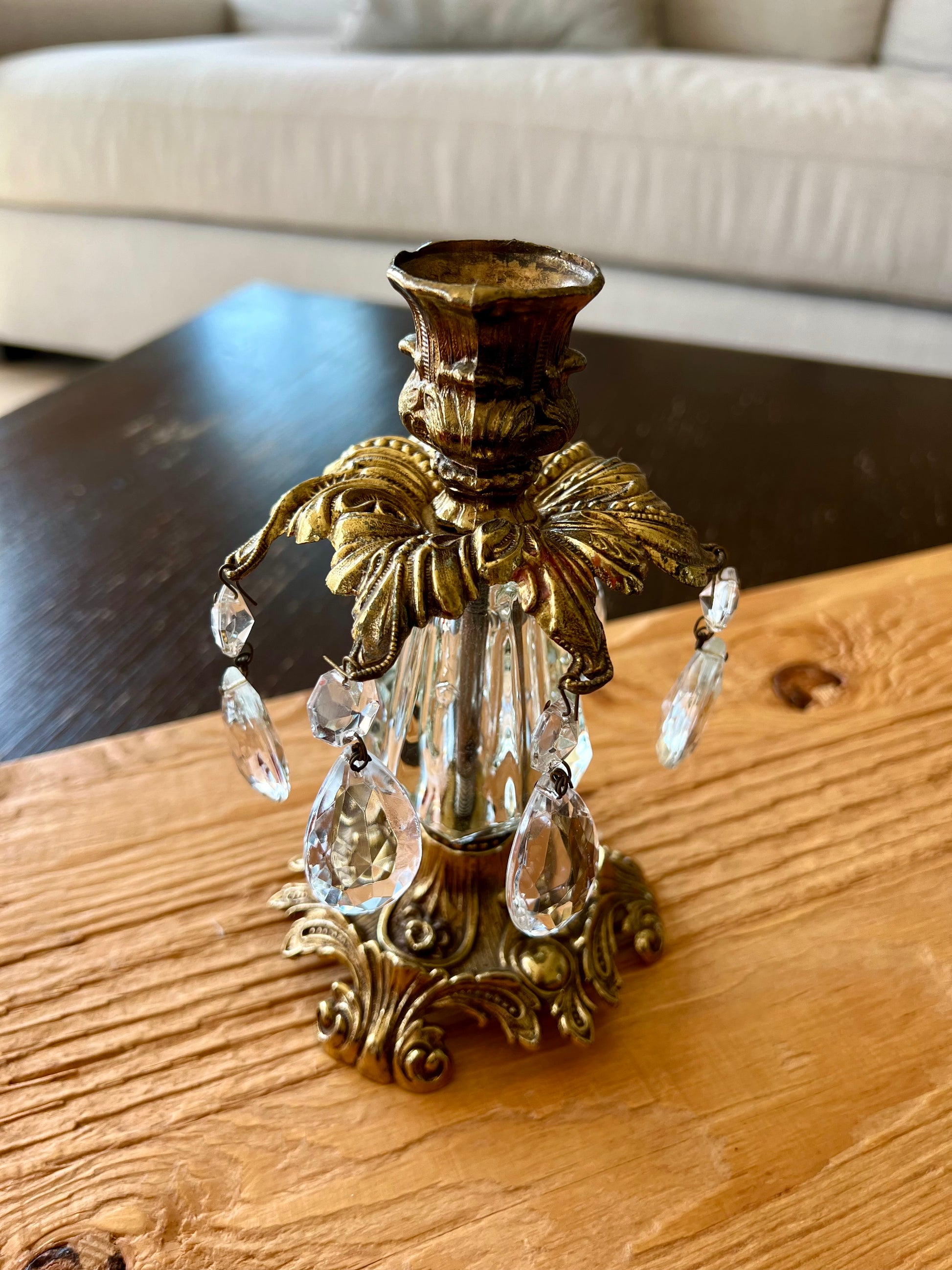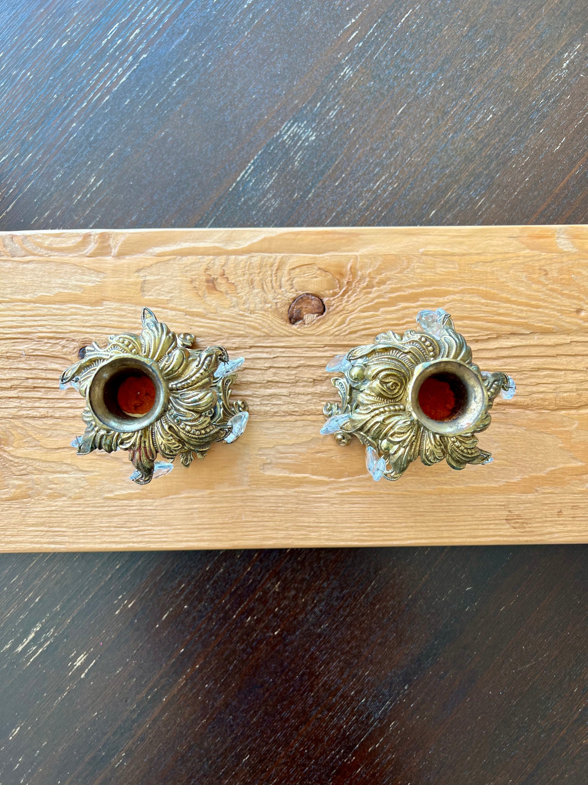 Beautiful vintage baroque style brass candle holders with hanging crystal prisms and ornate golden design. These are in very good condition.