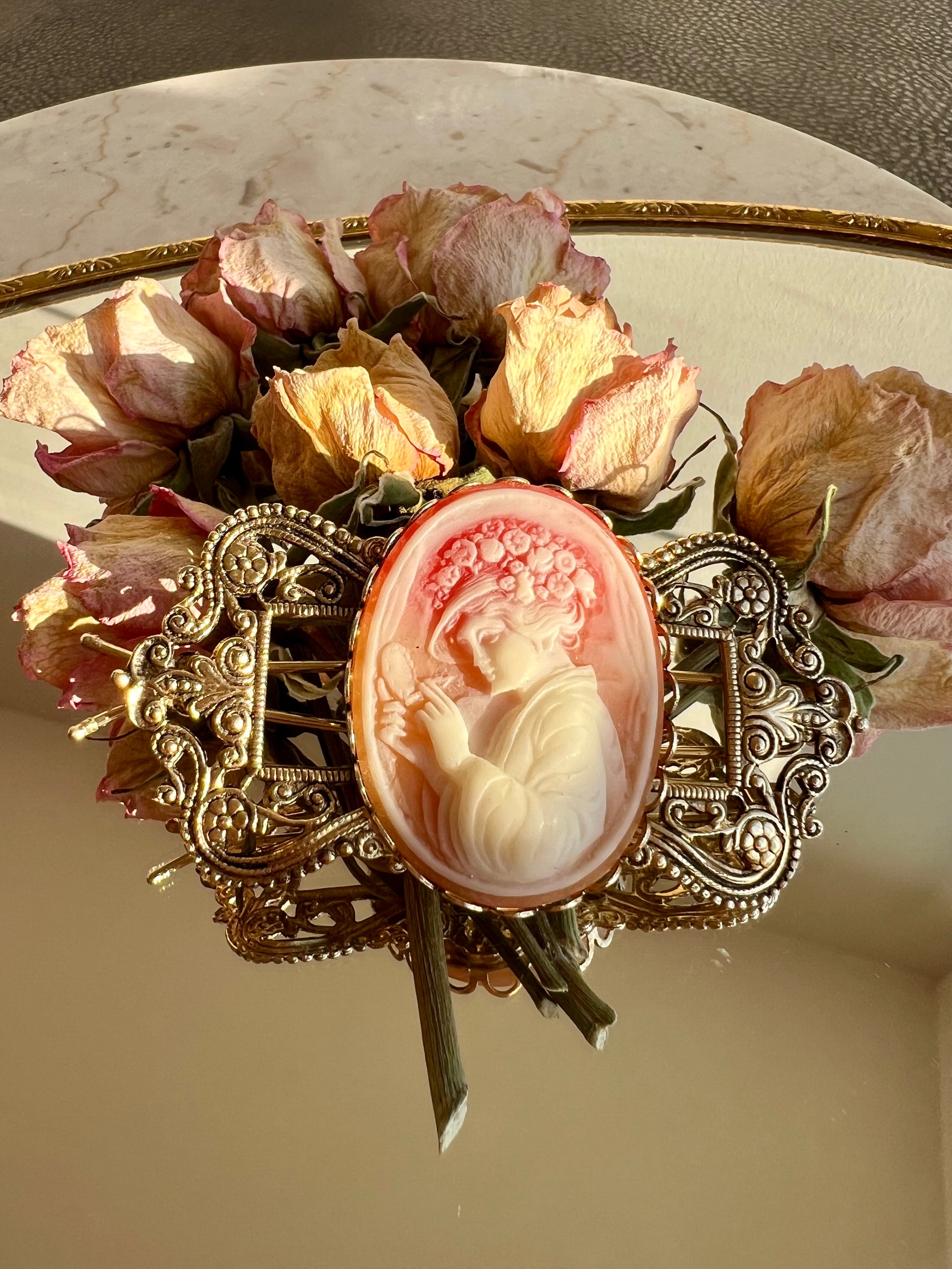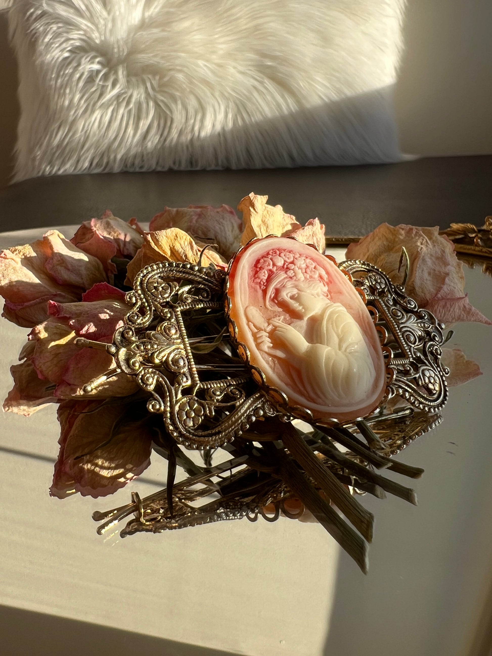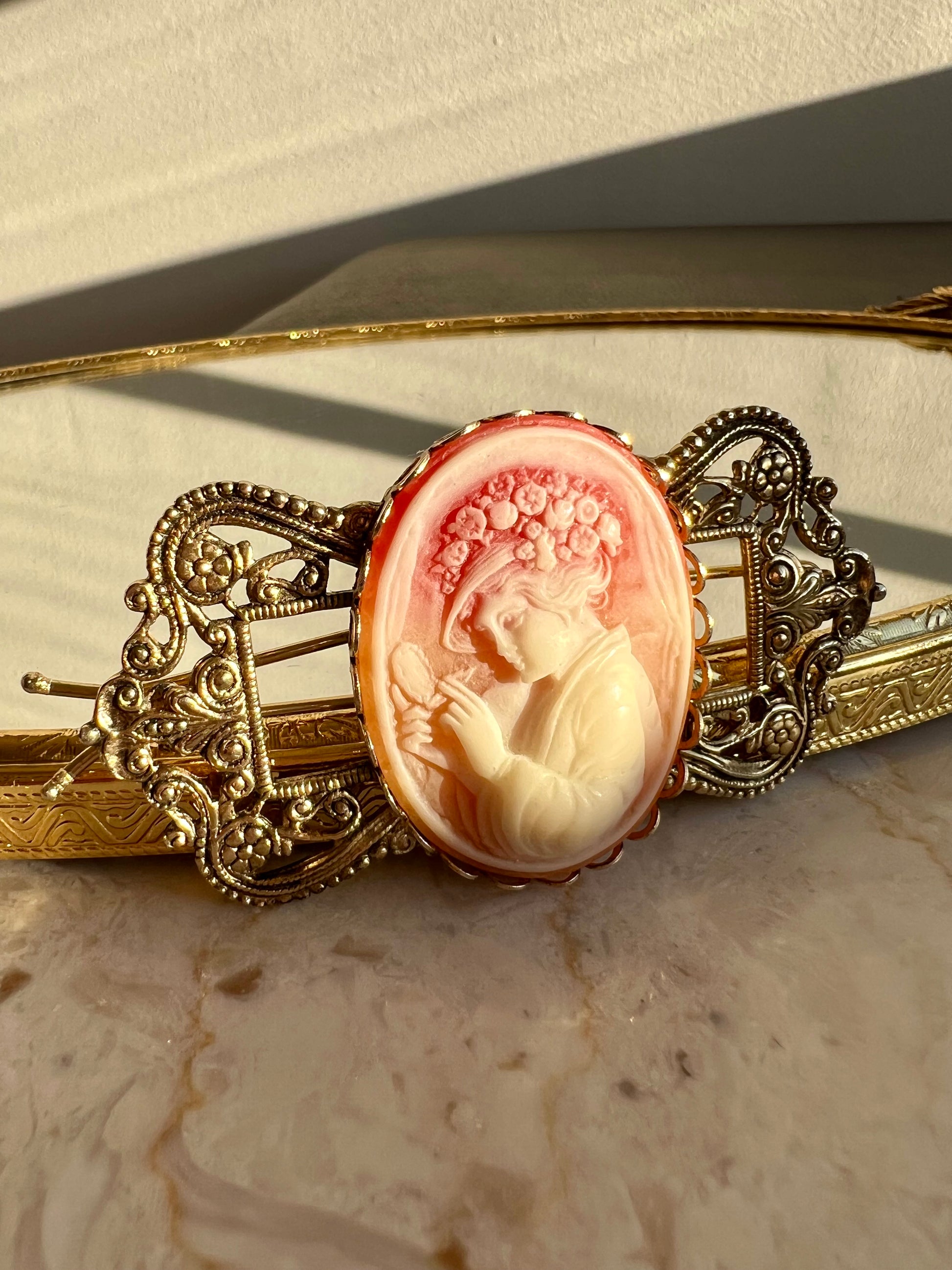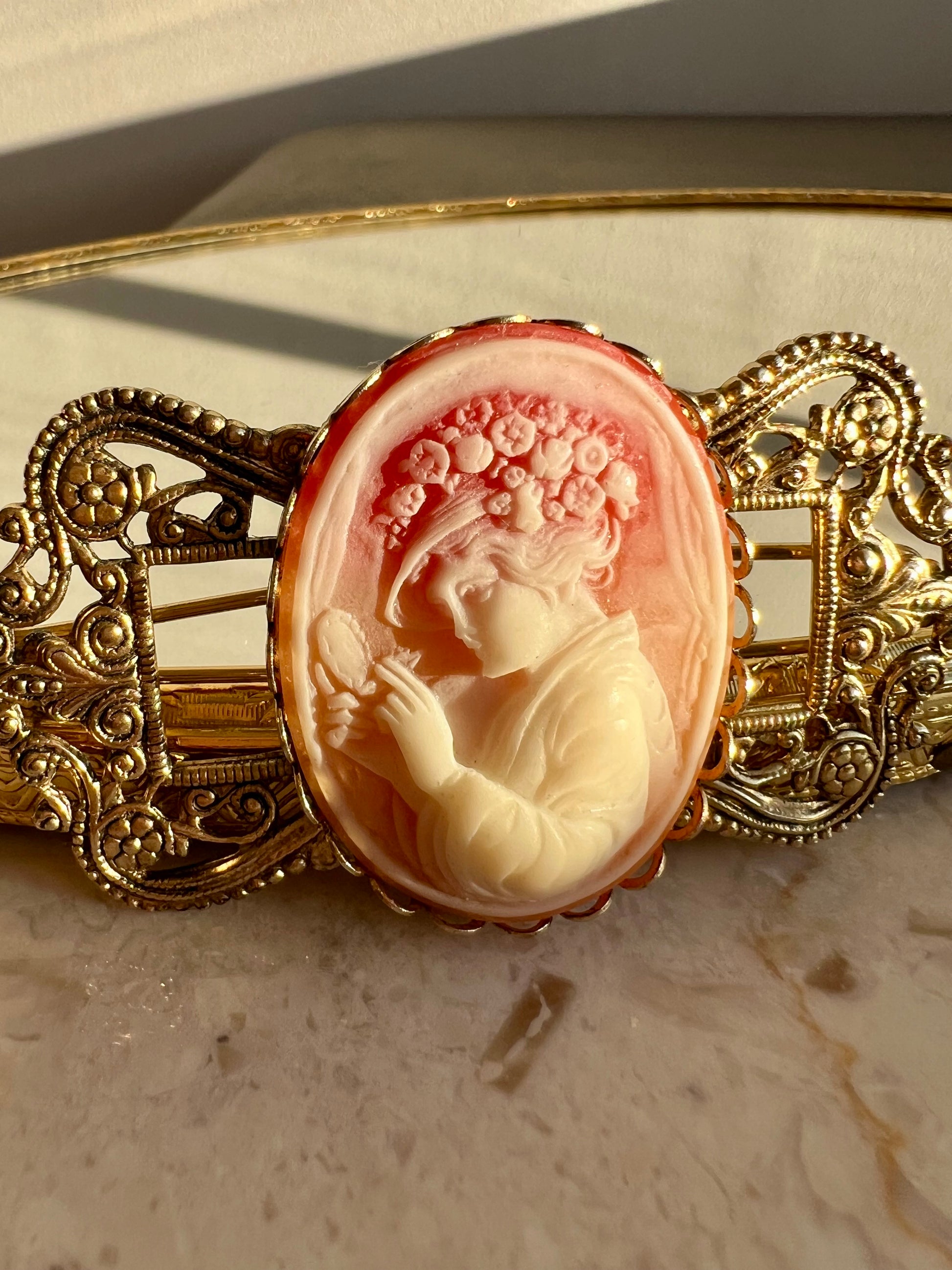 Beautiful vintage cameo lady hair clip. This is made of bronze colored metal. In the center is a fine cameo with a girl in pink and white. It’s in excellent vintage condition.