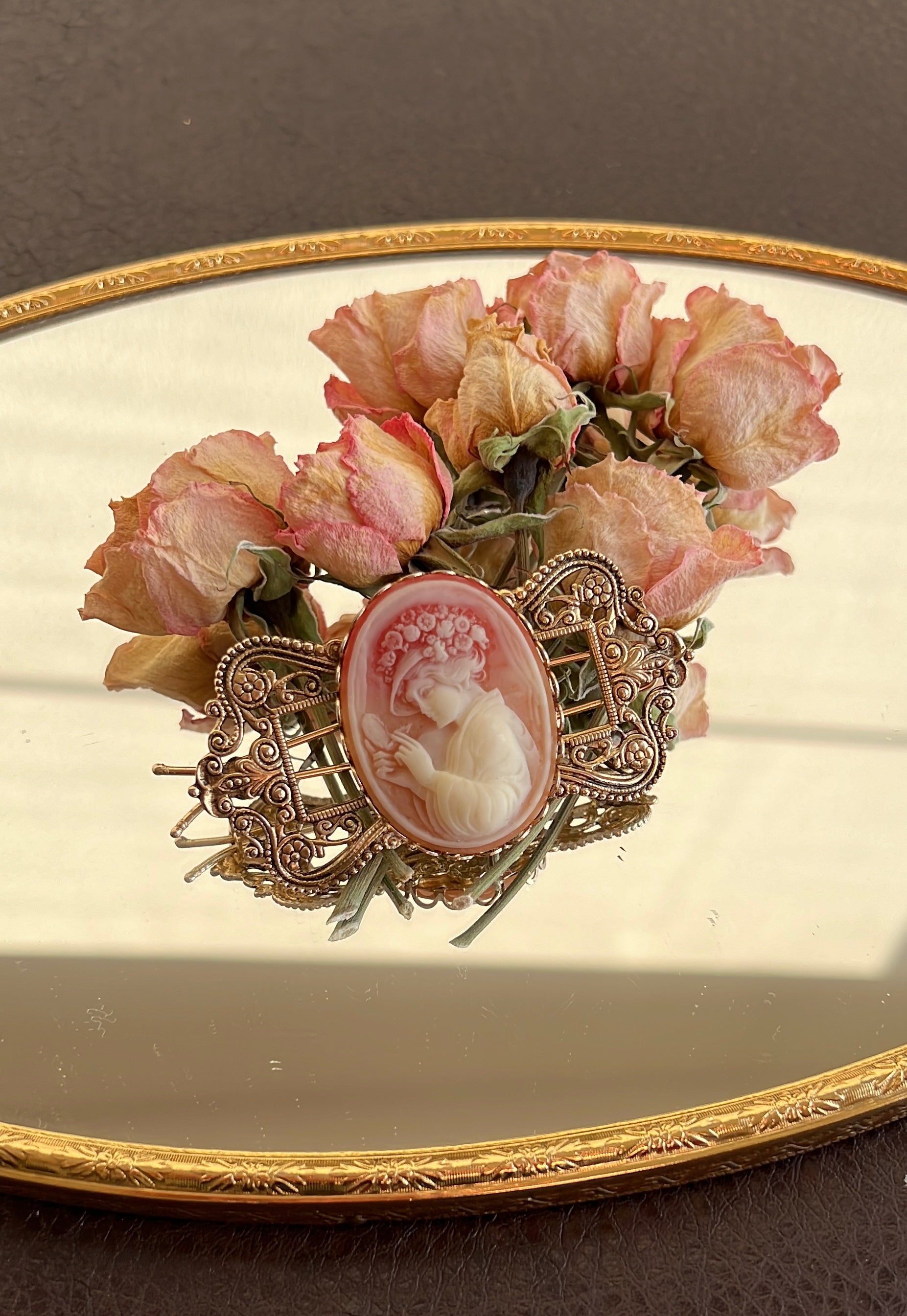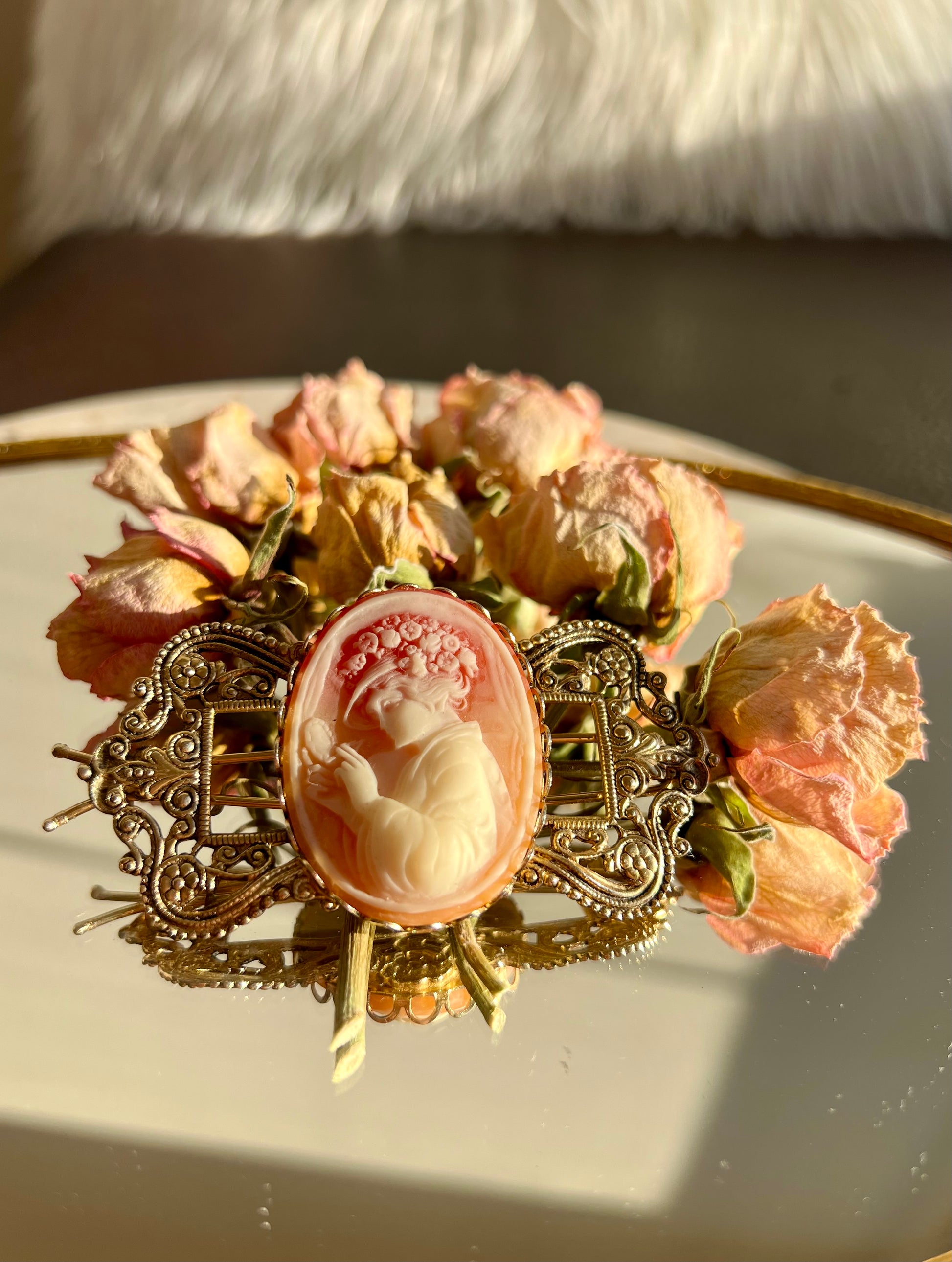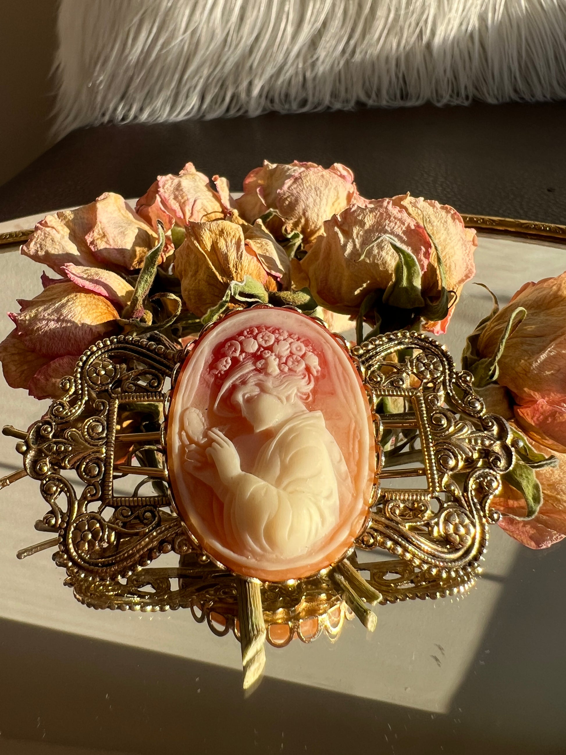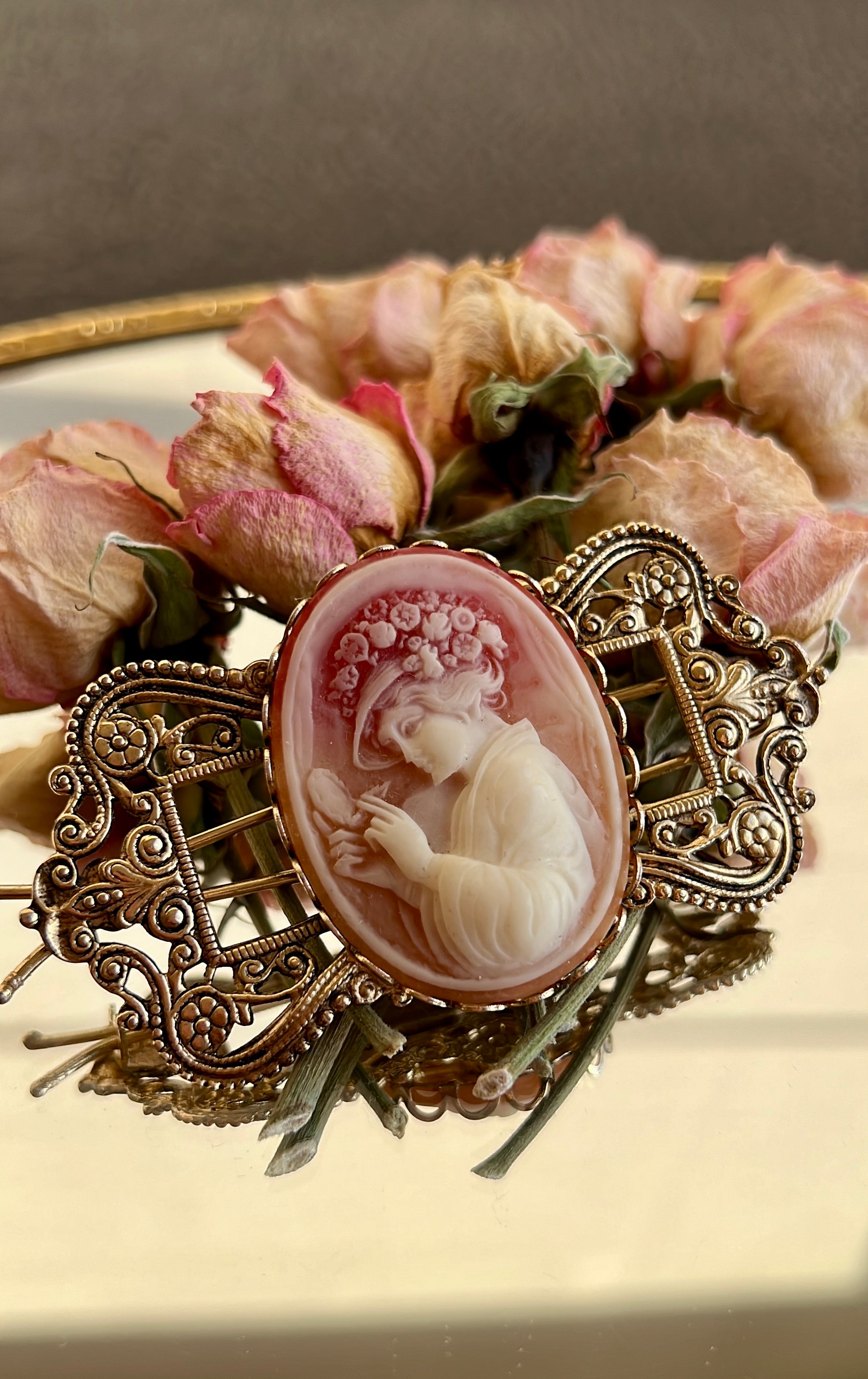 Beautiful vintage cameo lady hair clip. This is made of bronze colored metal. In the center is a fine cameo with a girl in pink and white. It’s in excellent vintage condition.