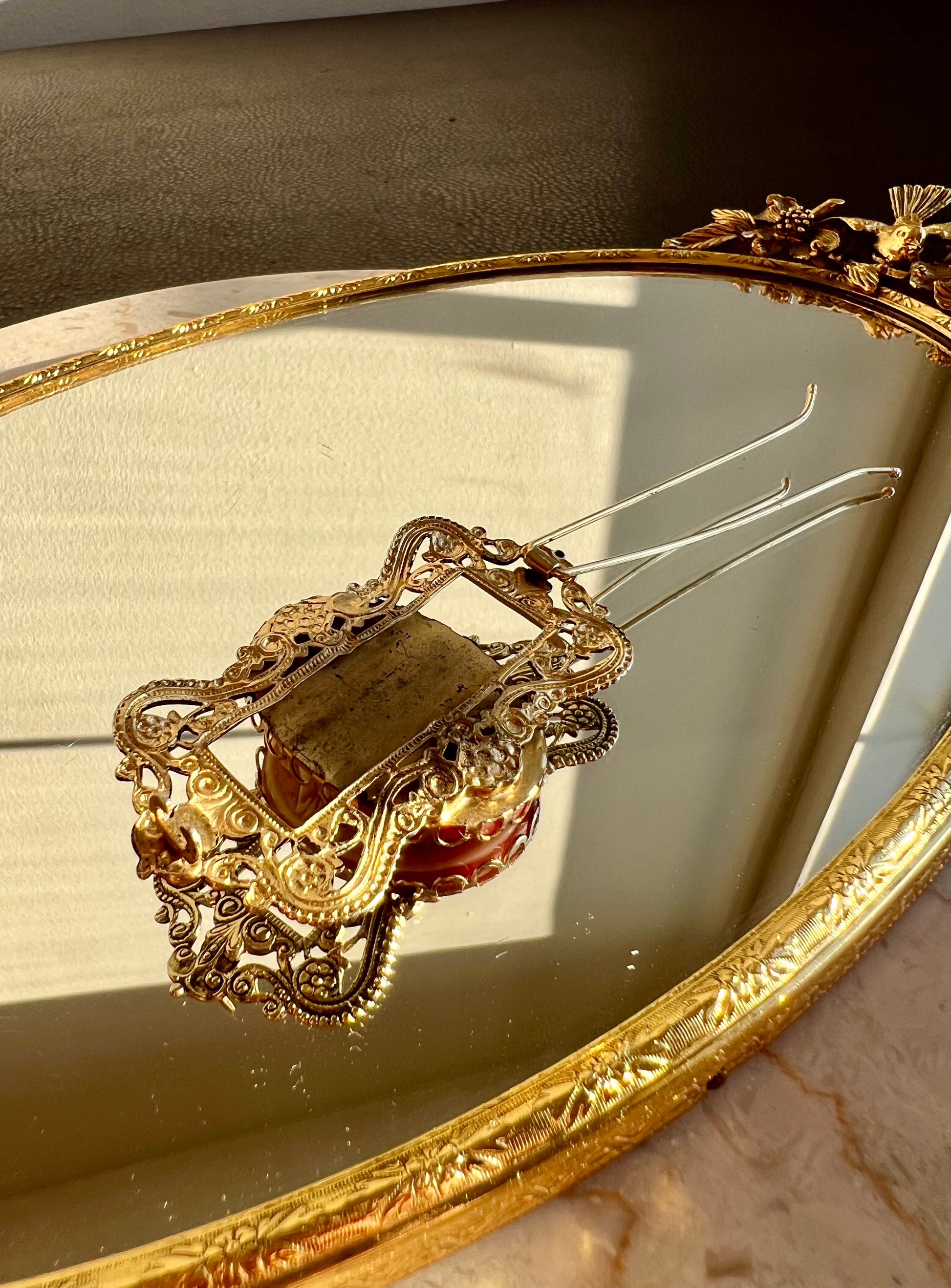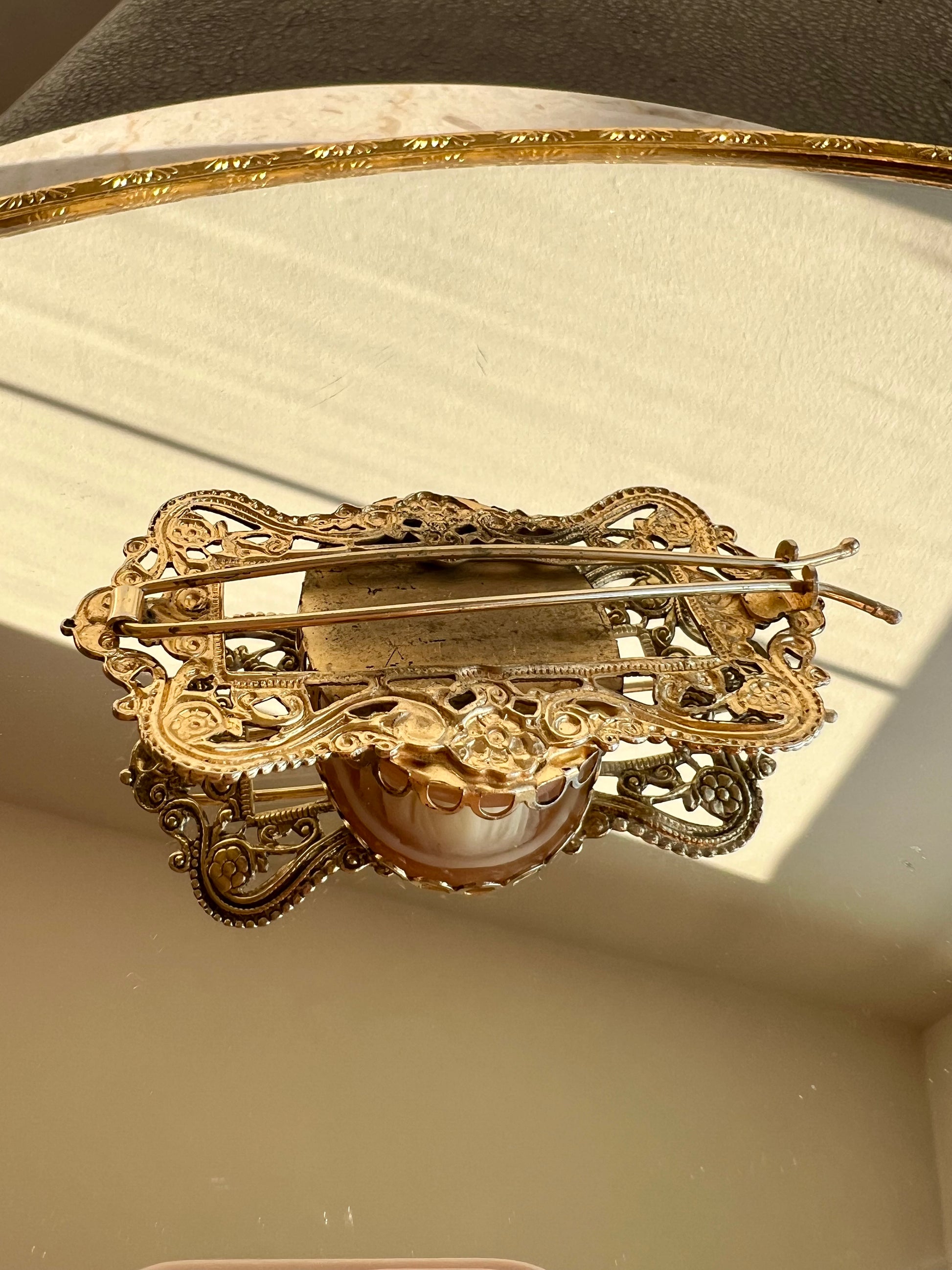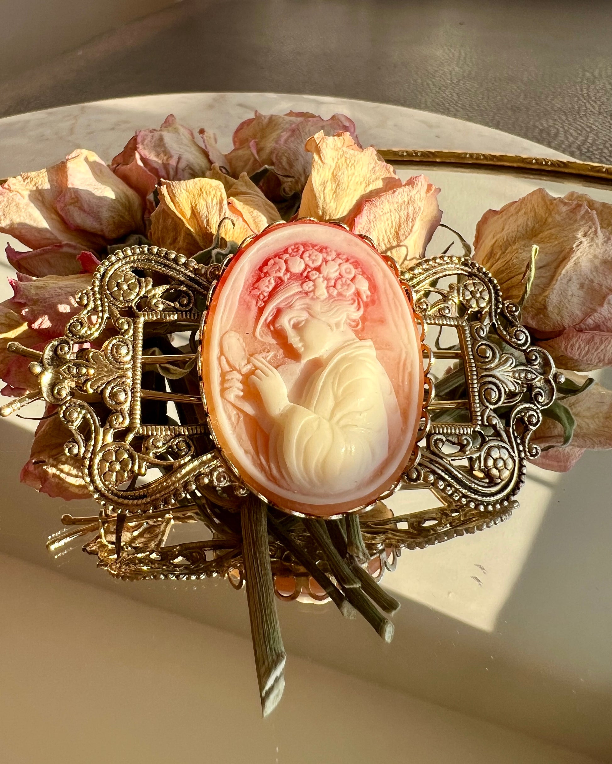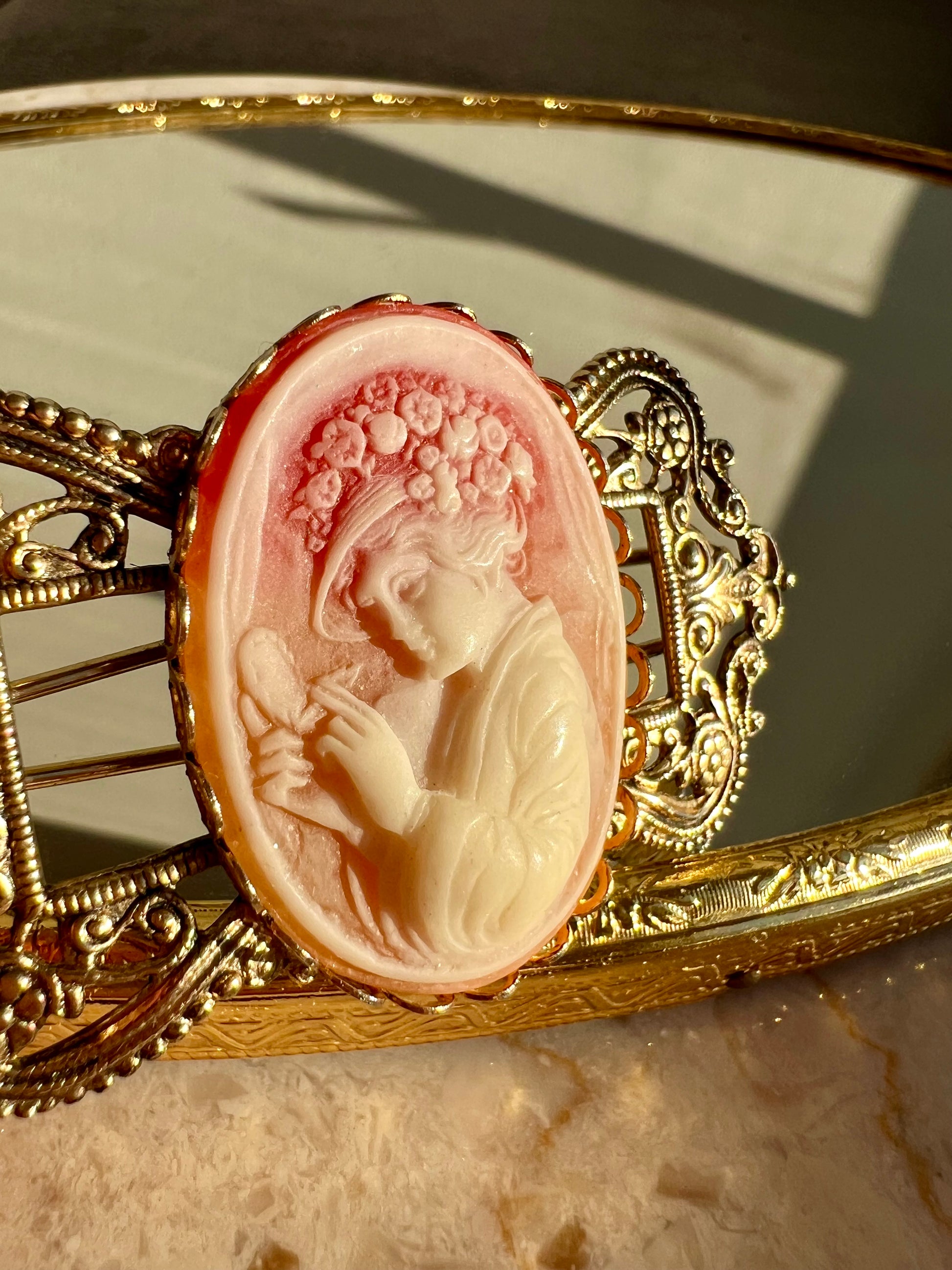 Beautiful vintage cameo lady hair clip. This is made of bronze colored metal. In the center is a fine cameo with a girl in pink and white. It’s in excellent vintage condition.